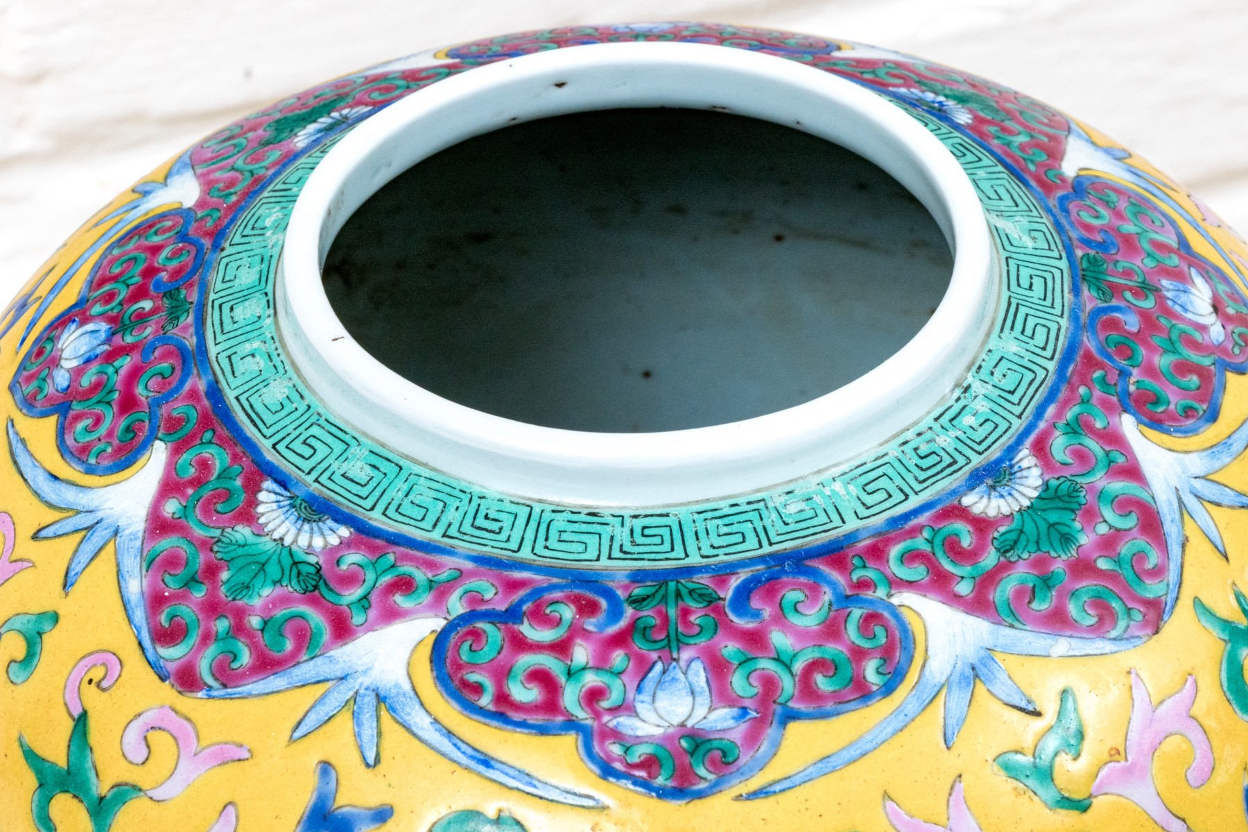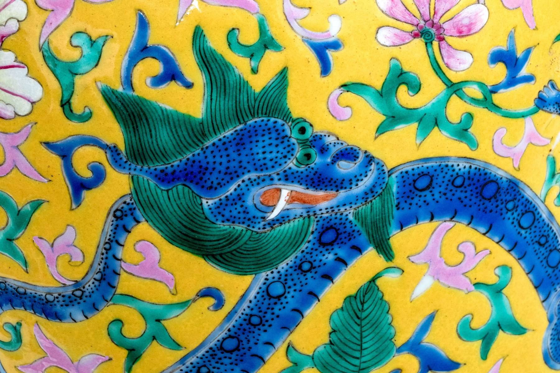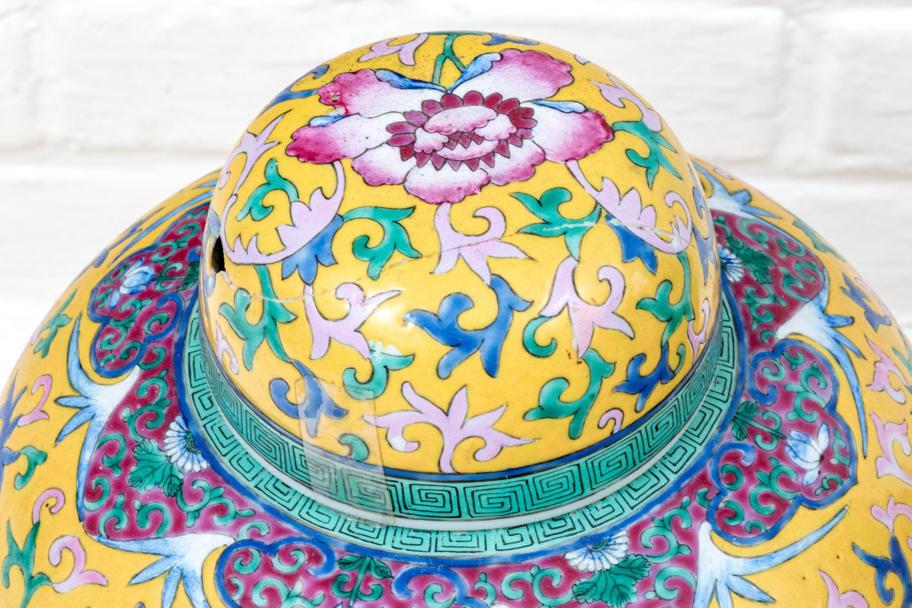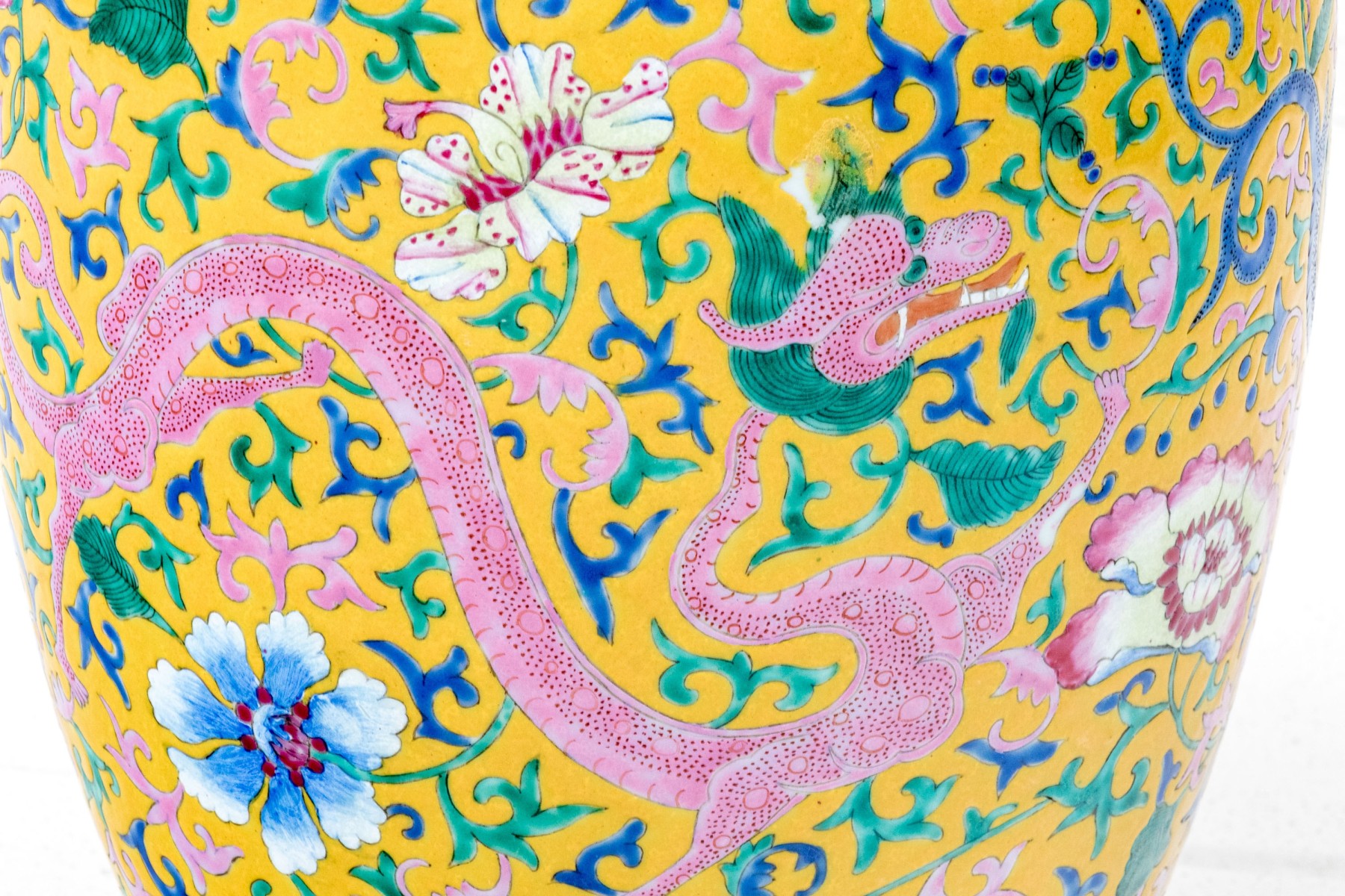 A gorgeous pair of tall Chinese porcelain ginger jars with domed lids over tall, ovoid bodies tapering down the feet. The jars are beautifully decorated with famille rose pink, green, blue, and purple scrolling foliage and flowers around blue long dragons against rich yellow grounds. Finished with lavish teal fret borders and a trim of vibrant scalloped petals at the top, and rectangular medallions at the bottom.