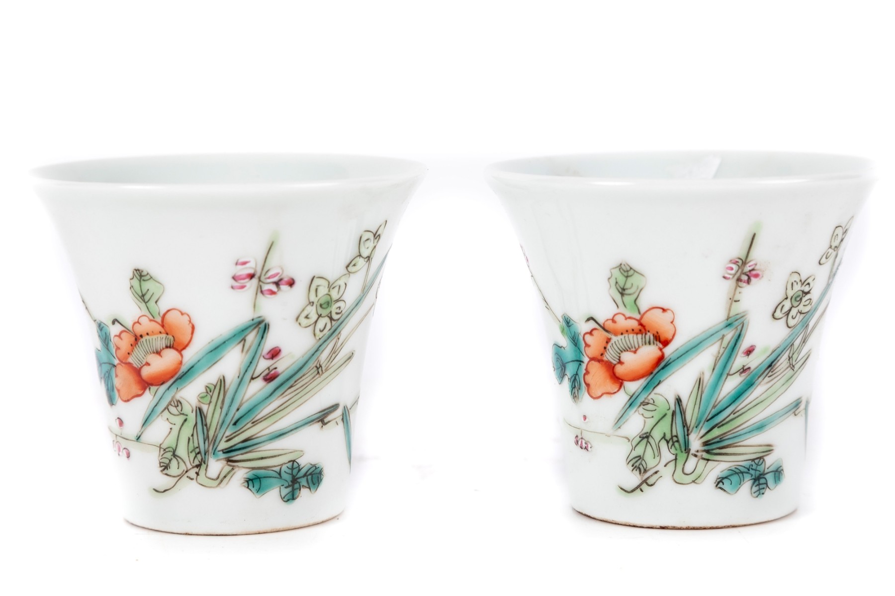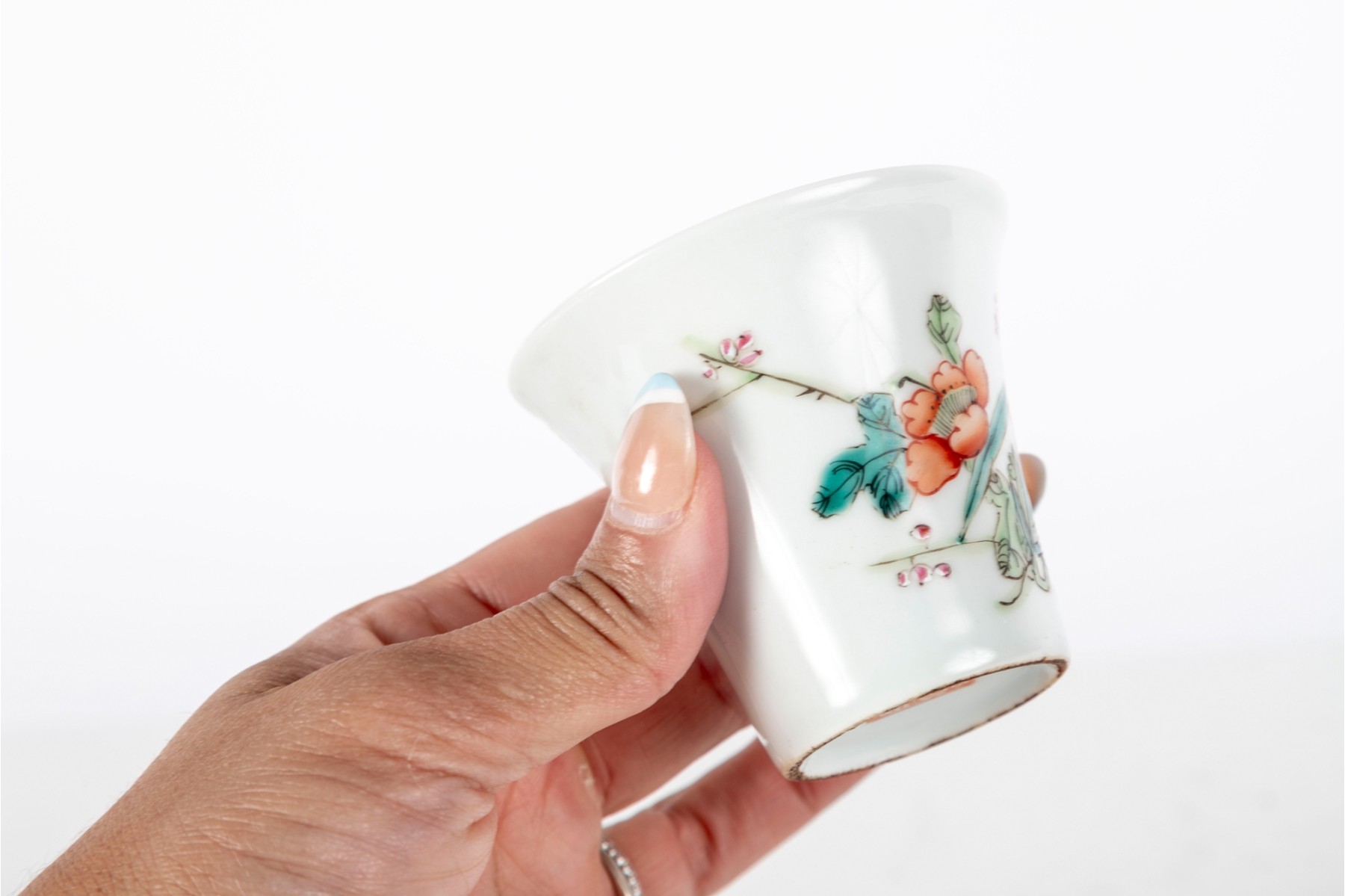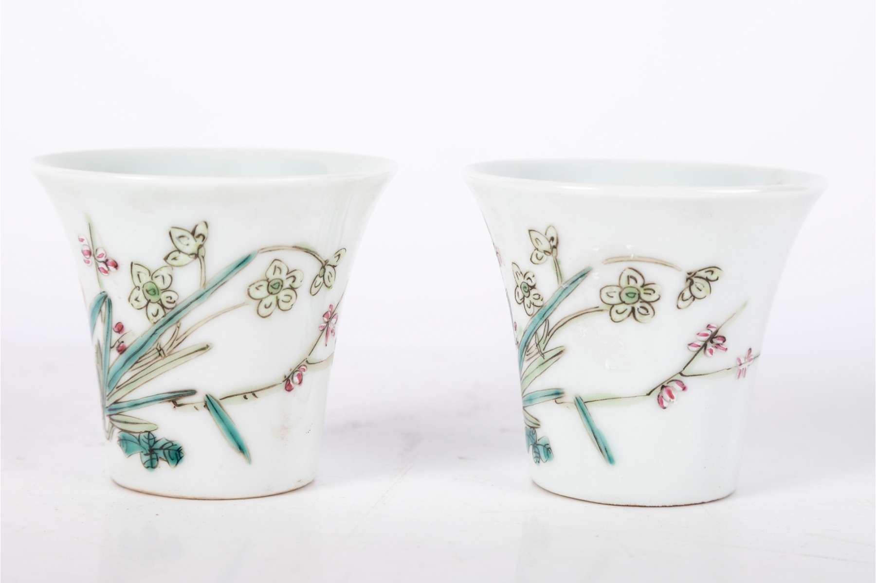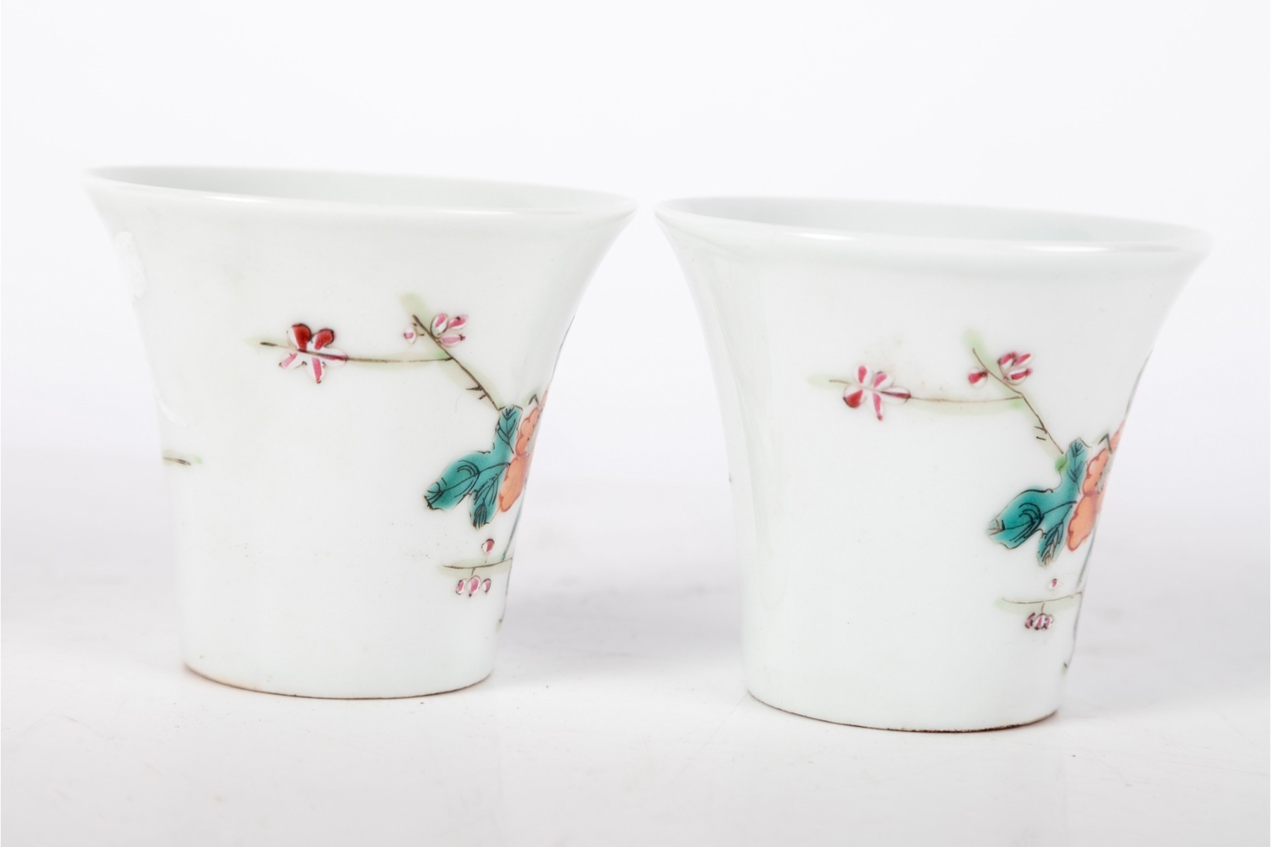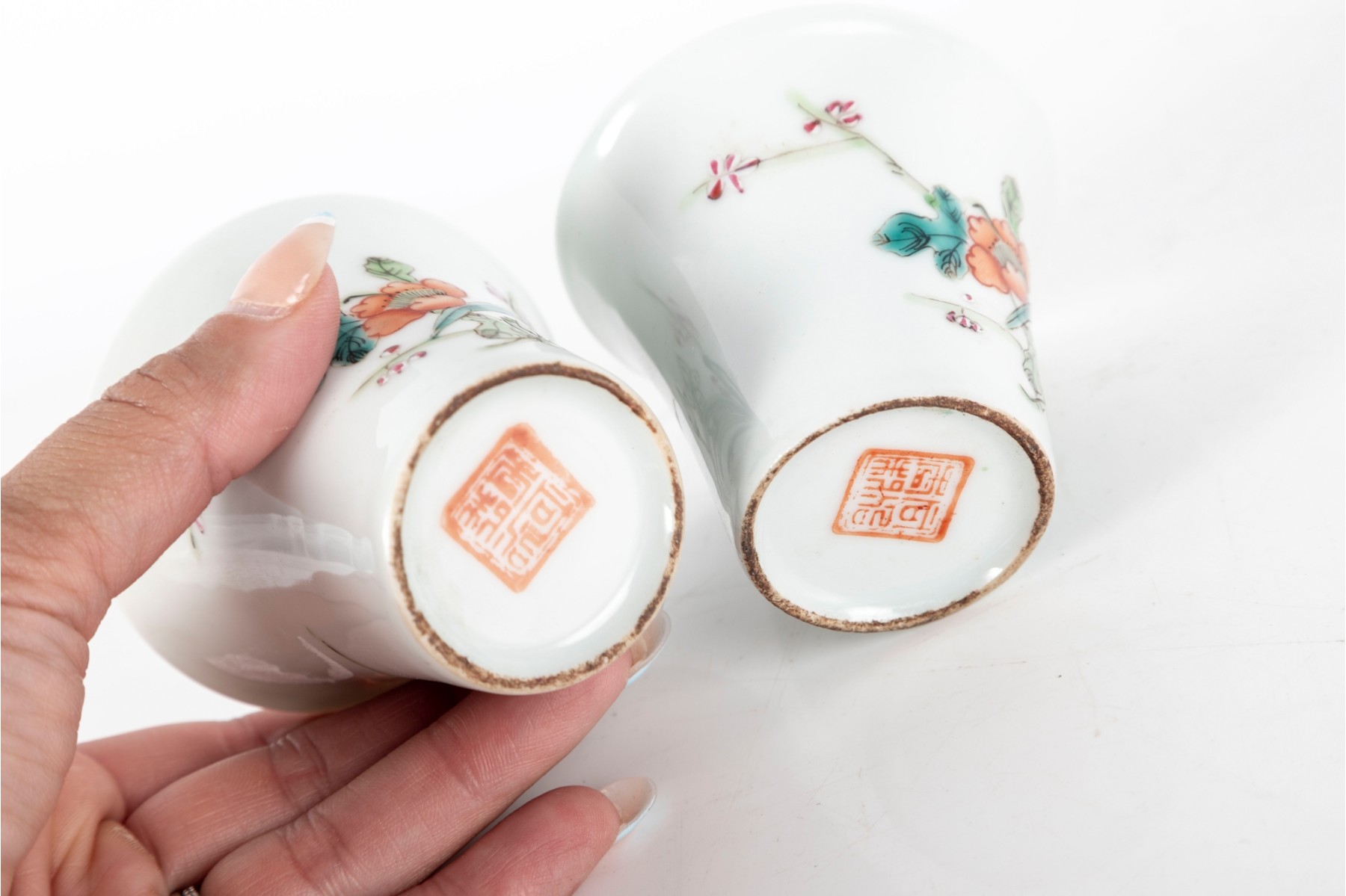 Delicate hand-painted porcelain cups featuring floral motifs in the Famille Rose palette, with soft pinks, greens, and oranges on a white ground. Each cup bears a red stamped mark on the base, likely a stylized Qianlong reign mark.