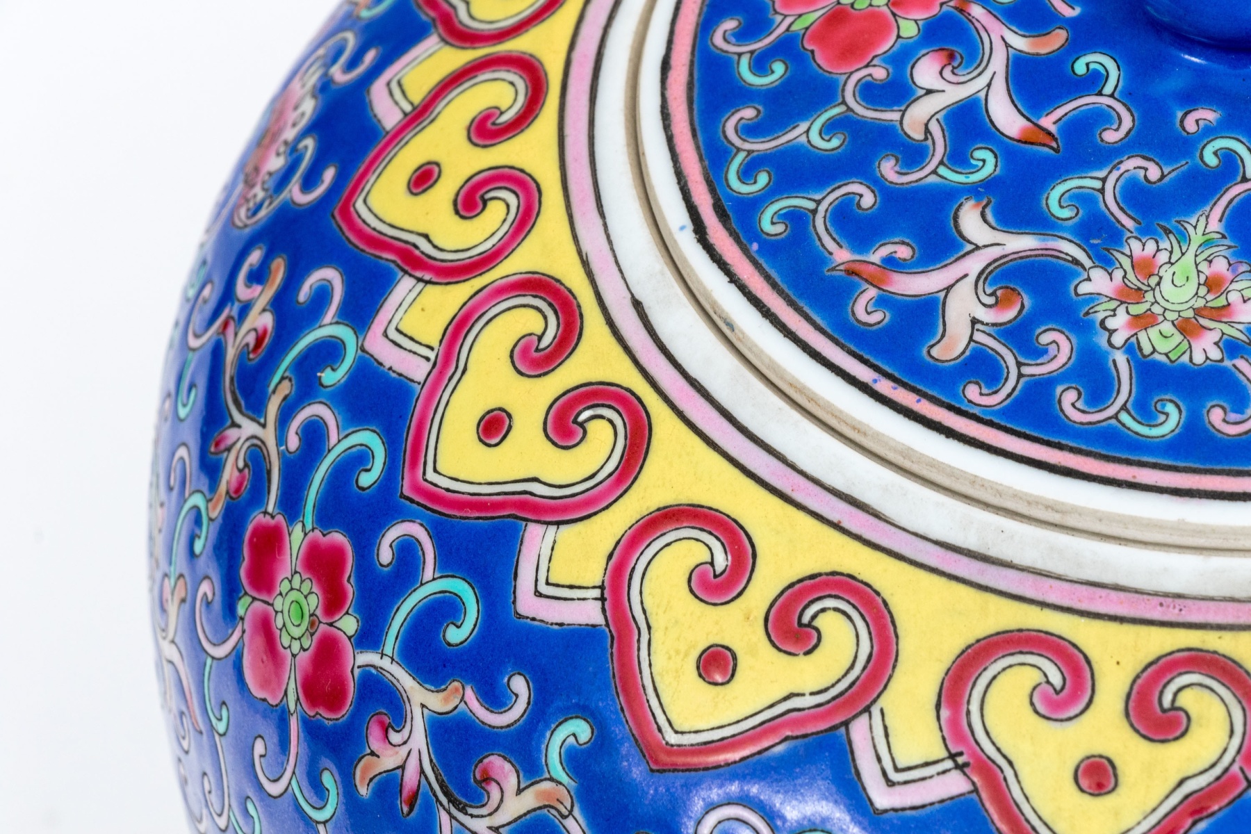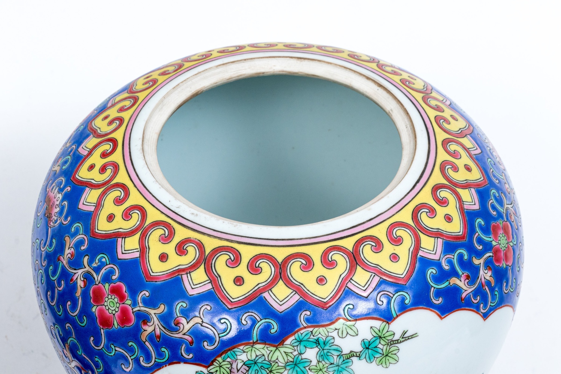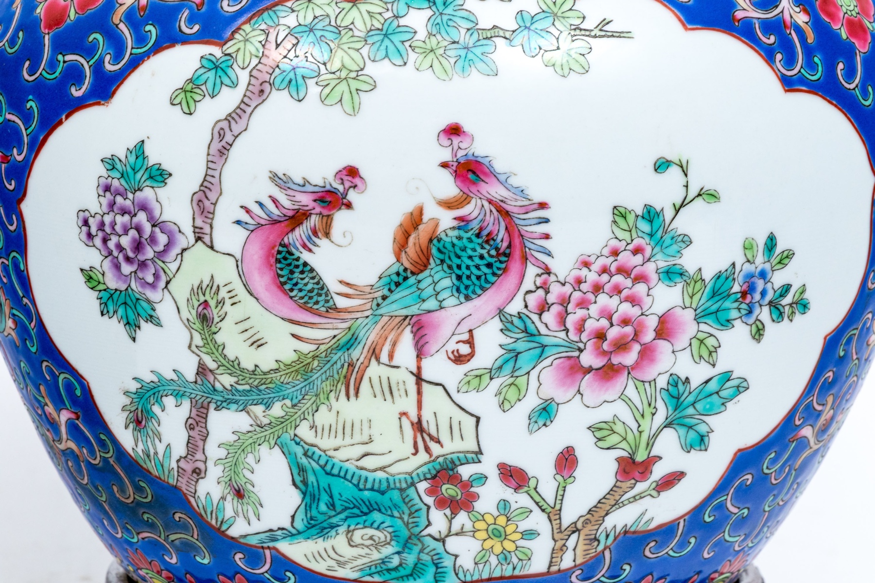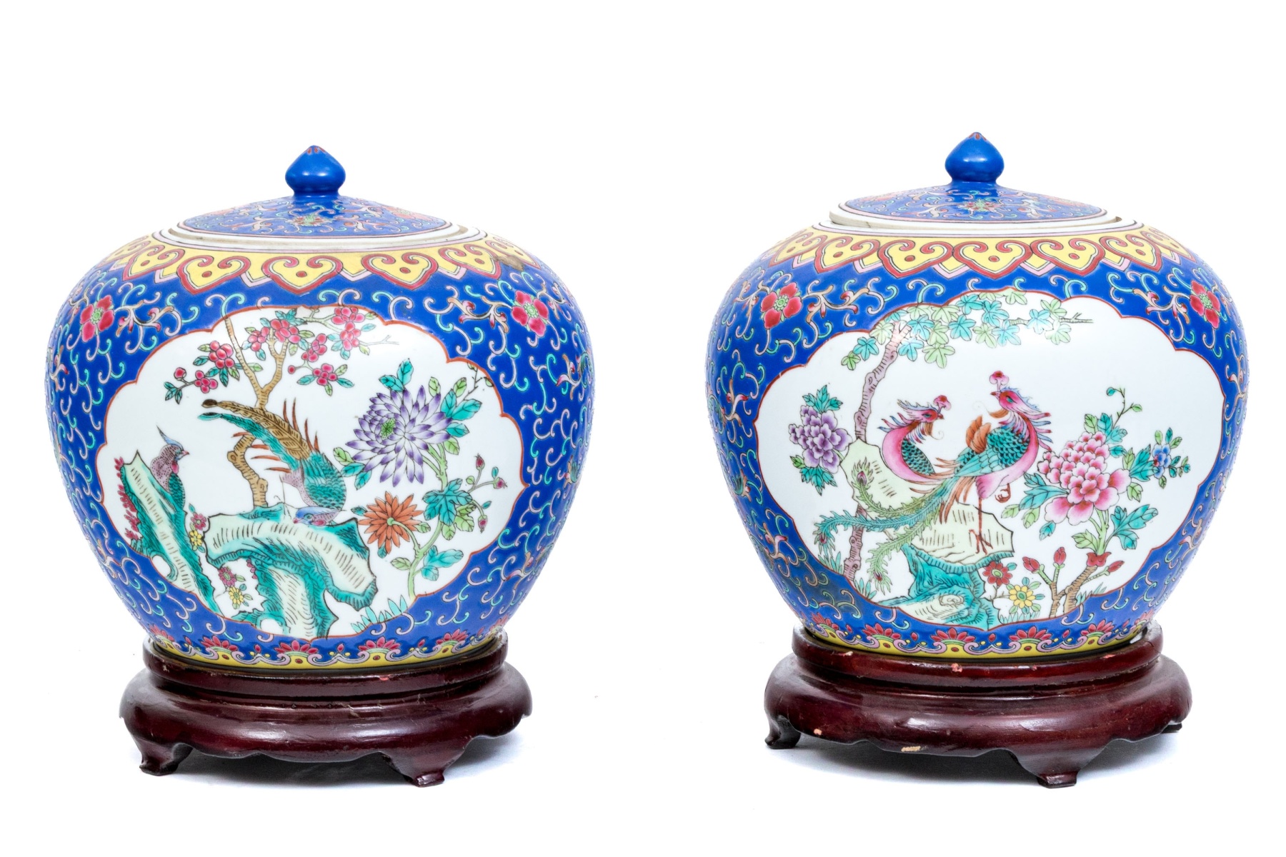 A lovely pair of Chinese famille rose porcelain lidded ginger jars. Each ovoid in form with blue ground and polychrome scrolling motif with reserves depicting phoenix birds in garden with circular lids with spade finials and wood stands.