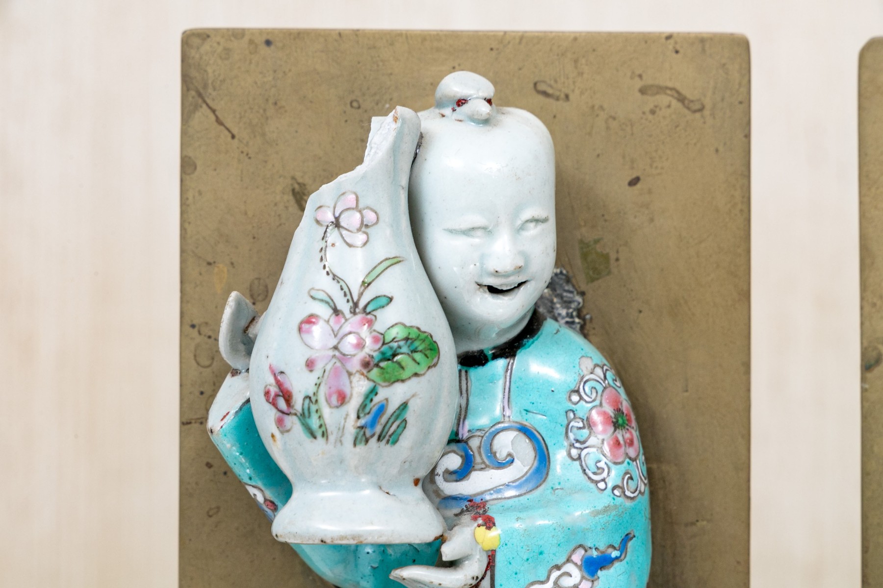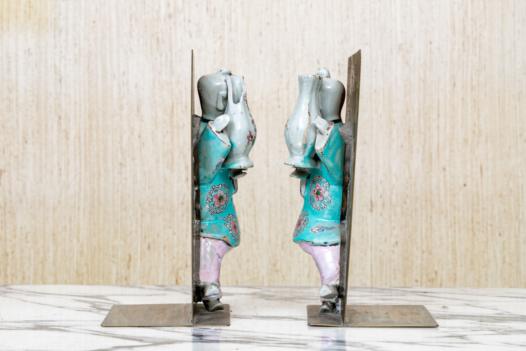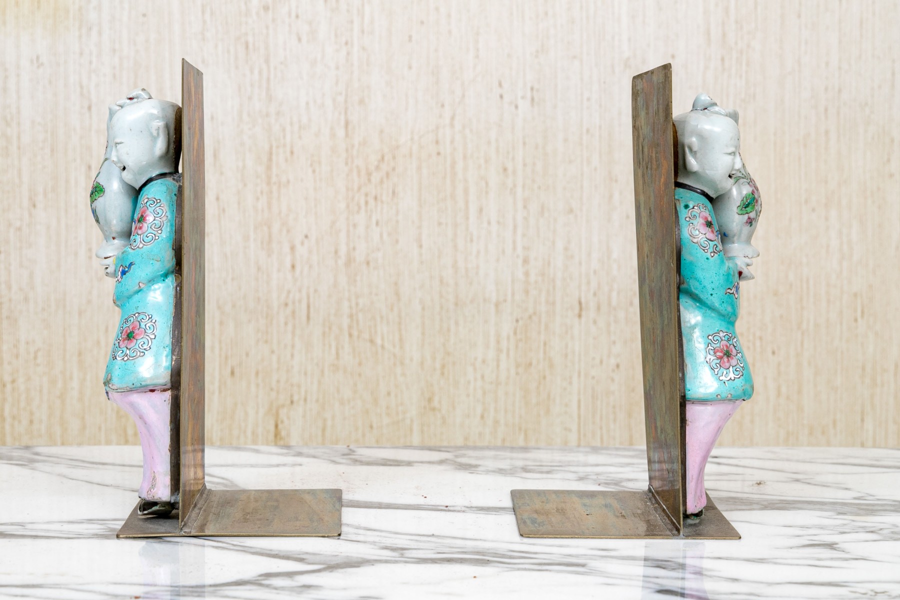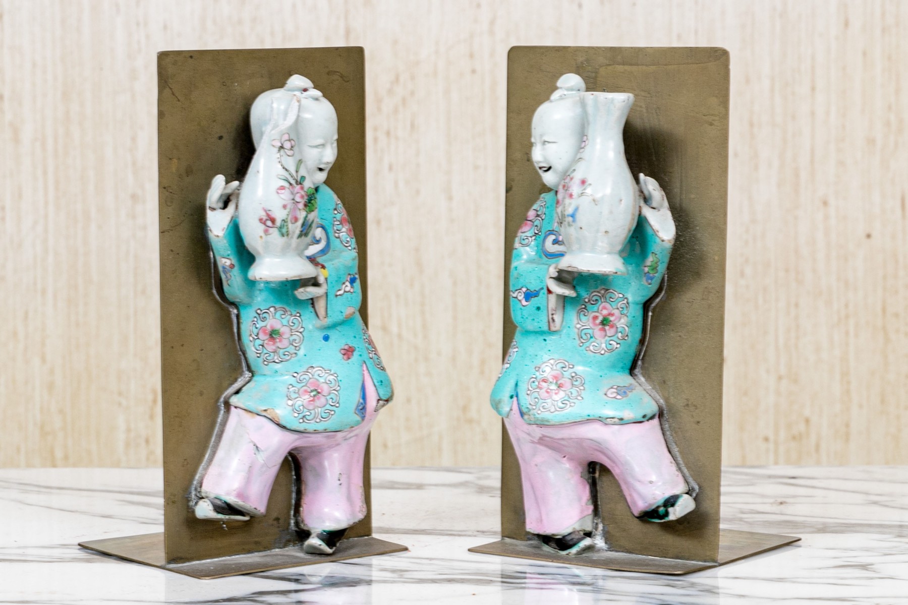 Each of the two bookends are constructed of brass 'L' form brackets with Chinese famille rose enameled porcelain figures Glazed porcelain 1/2 figures.