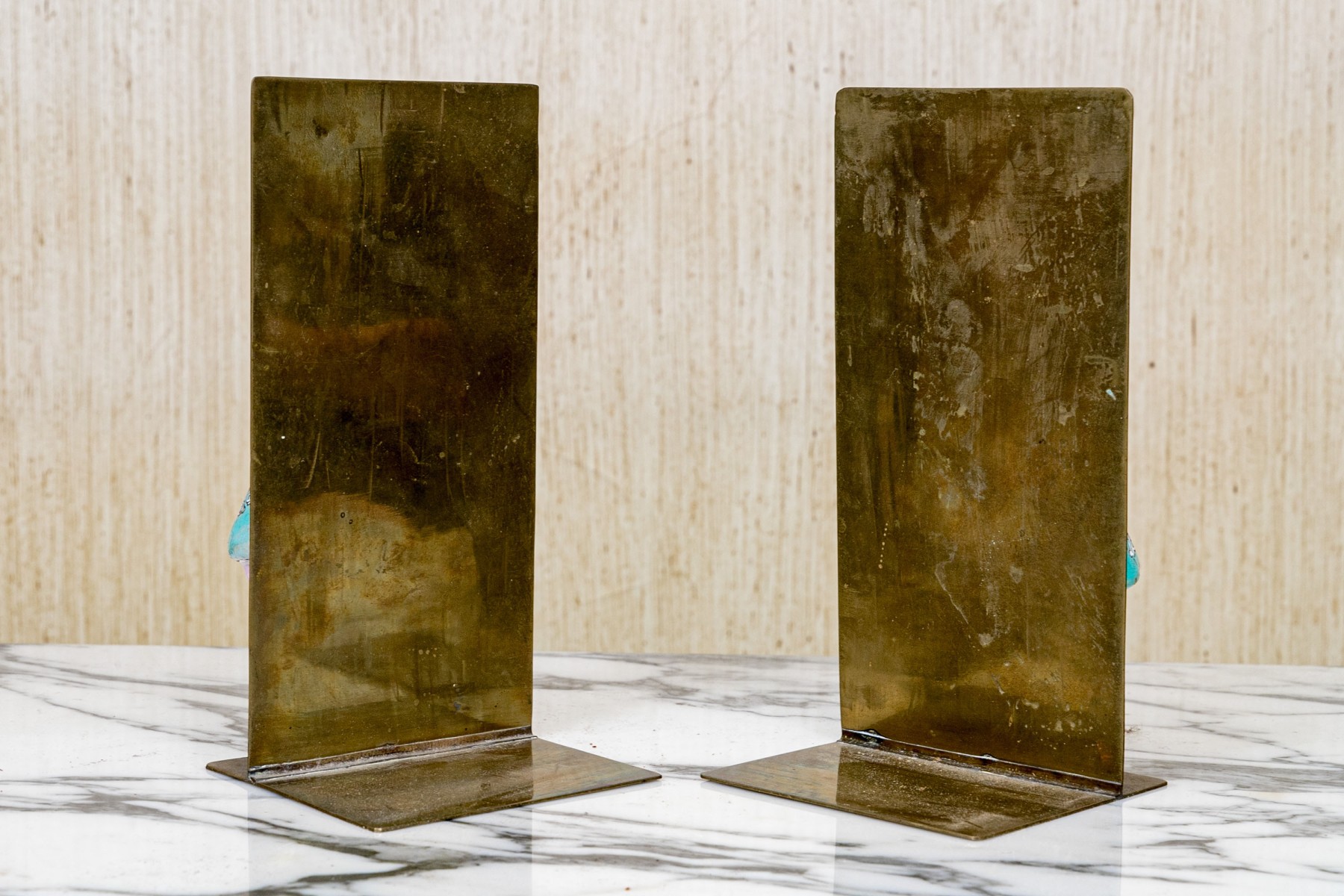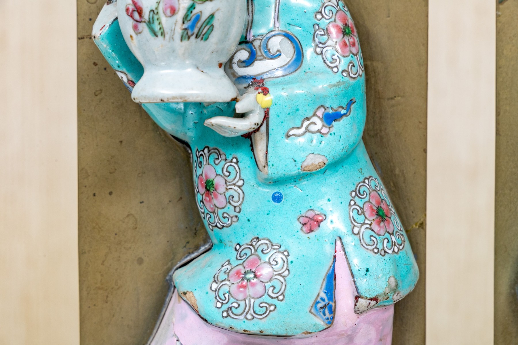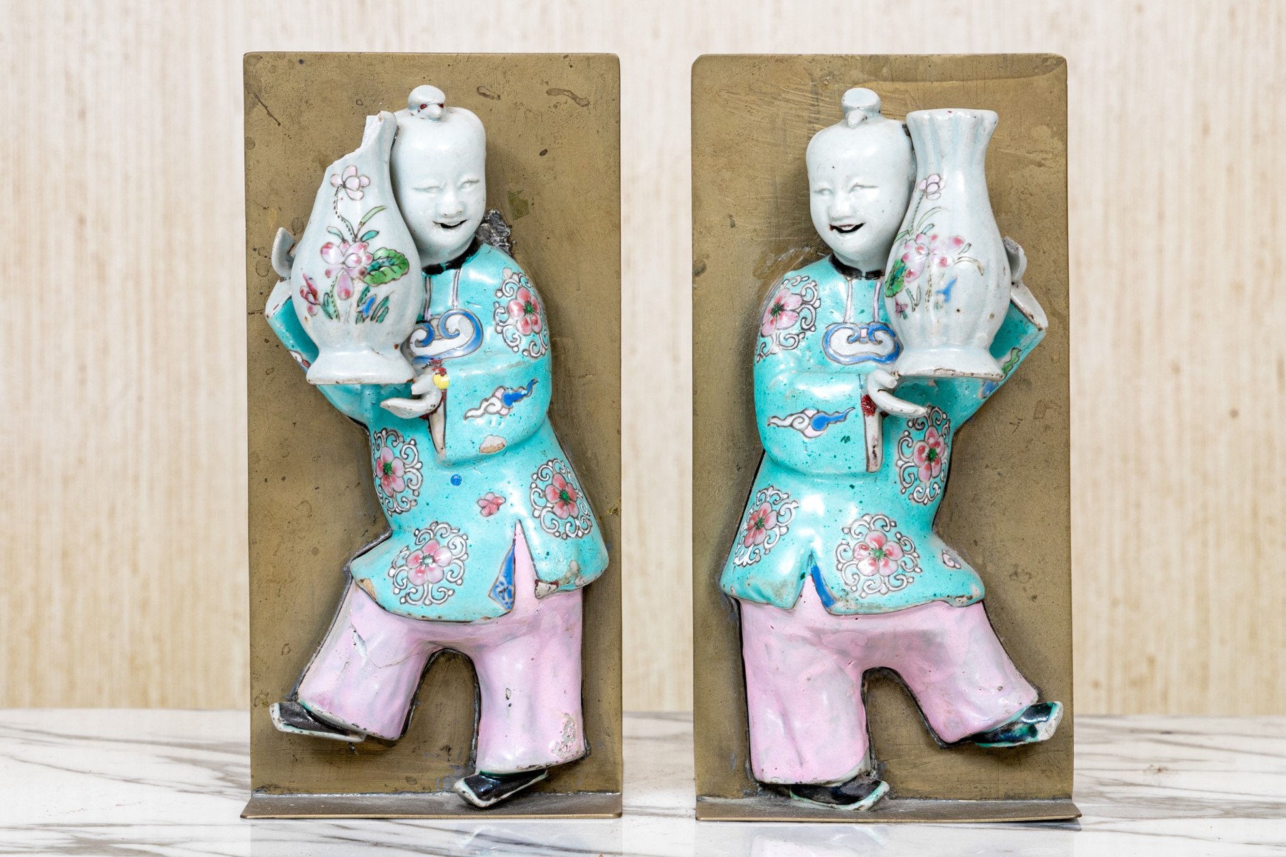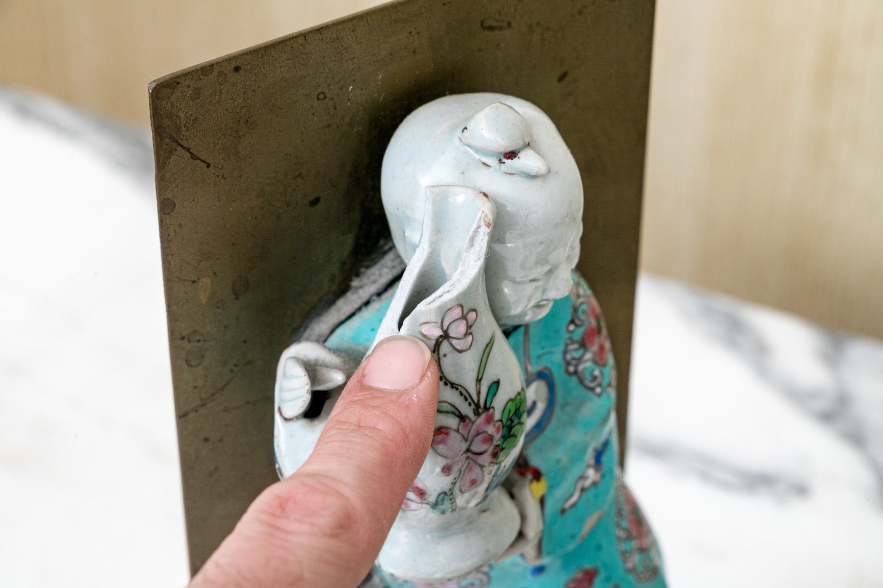 Each of the two bookends are constructed of brass 'L' form brackets with Chinese famille rose enameled porcelain figures Glazed porcelain 1/2 figures.