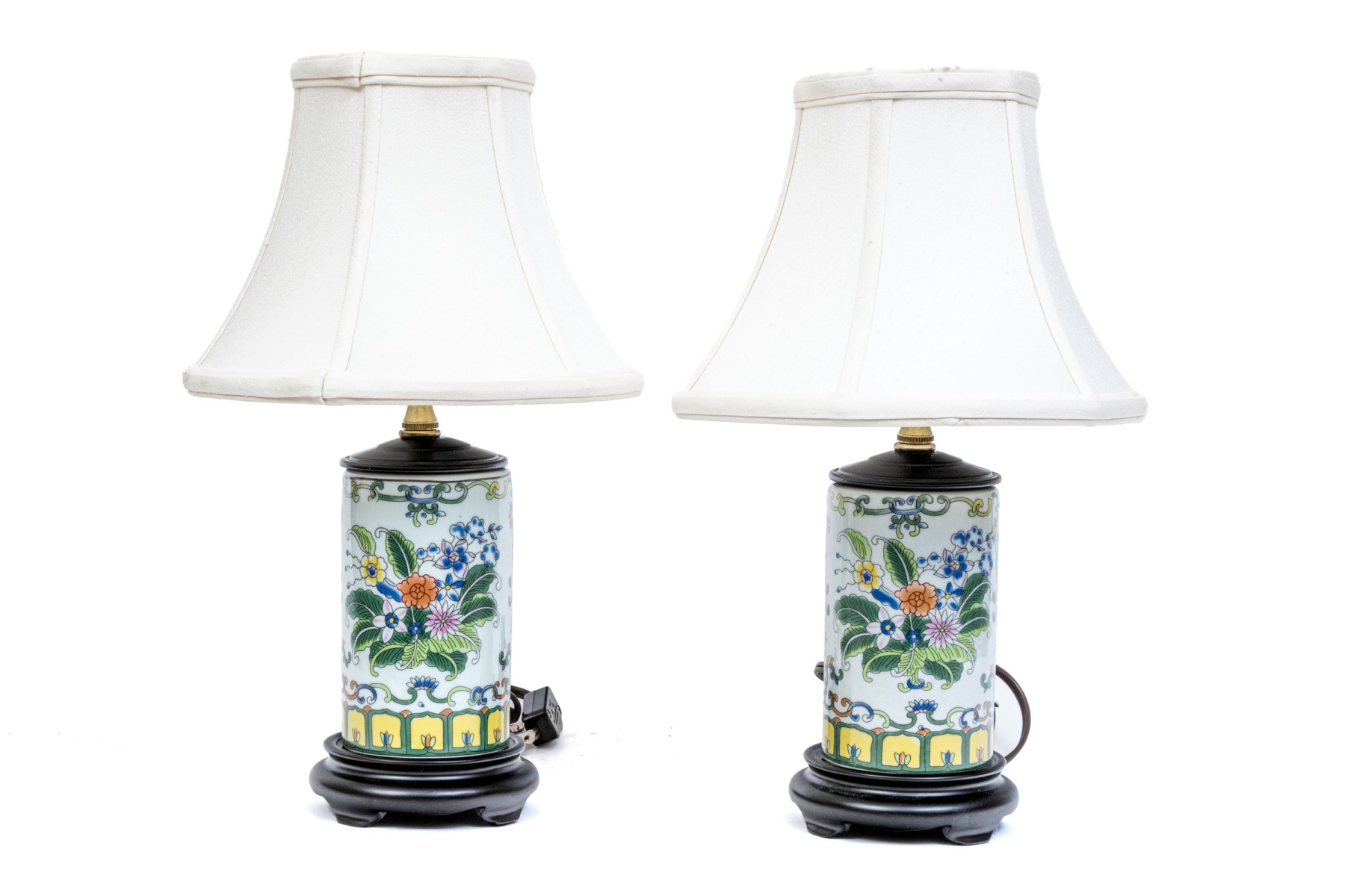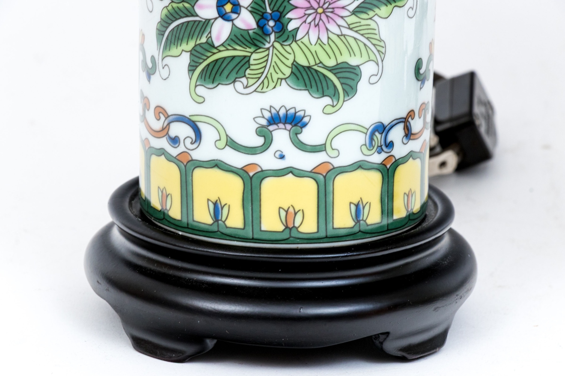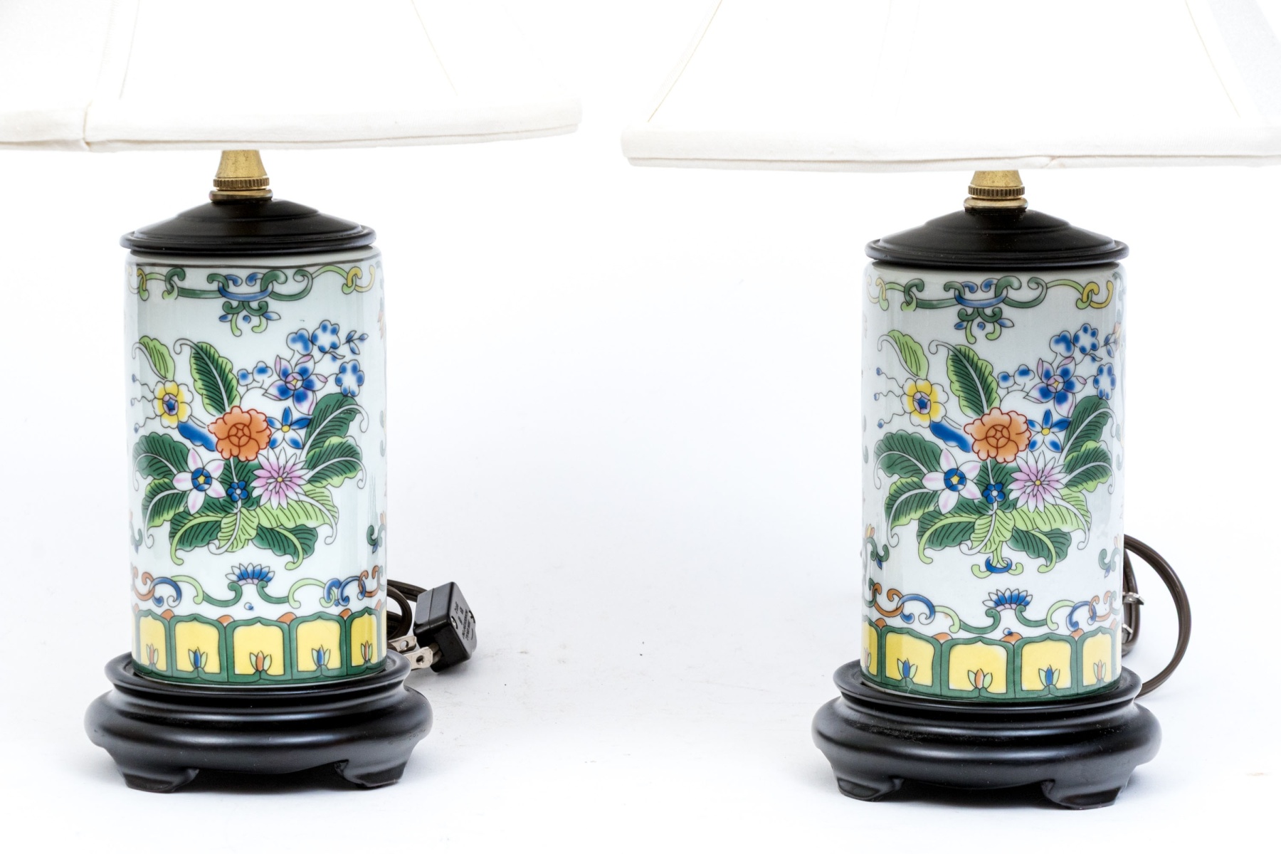 Mounted on wood bases with cylindrical porcelain bodies with famille verte color scheme depicting foliate and floral motifs.