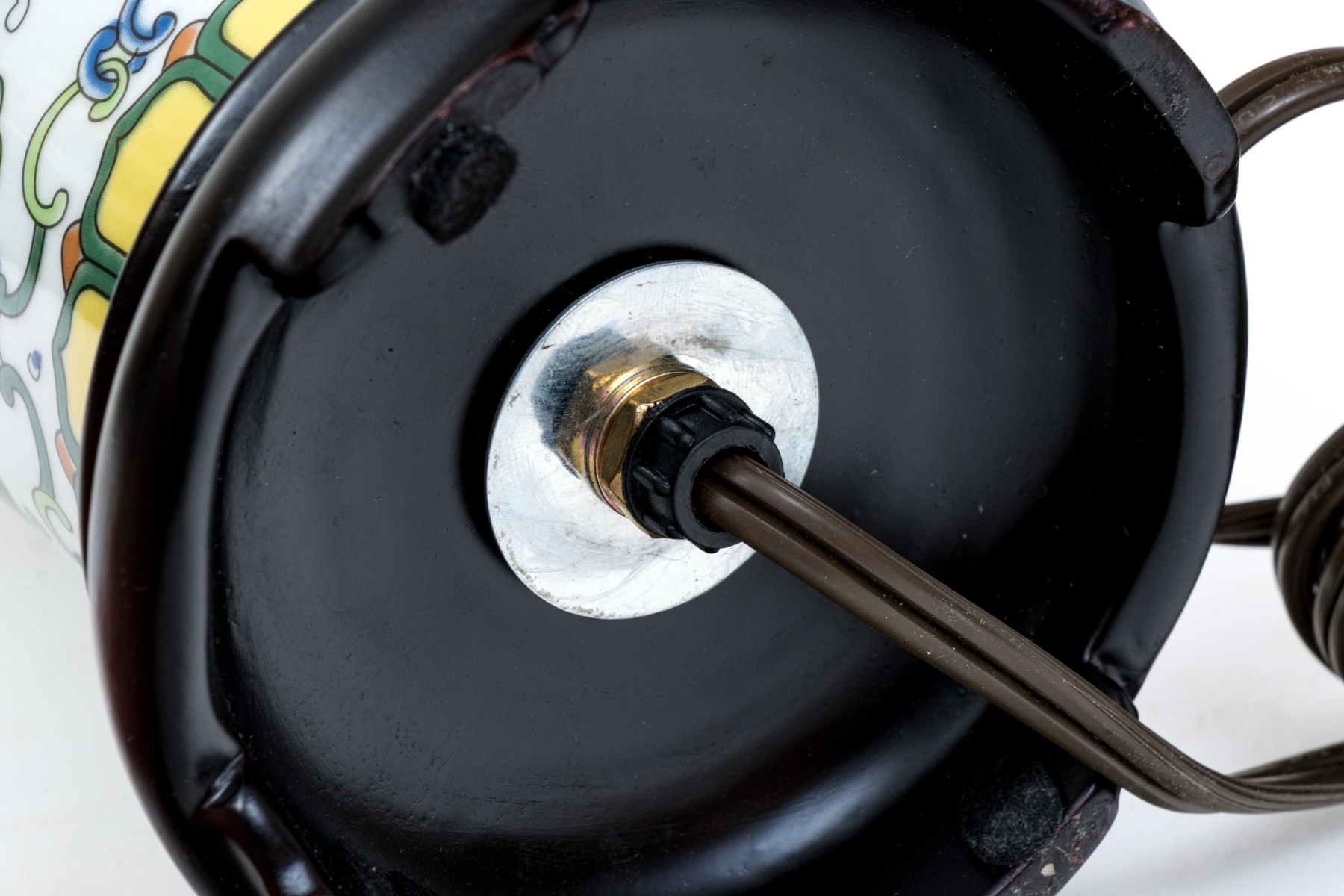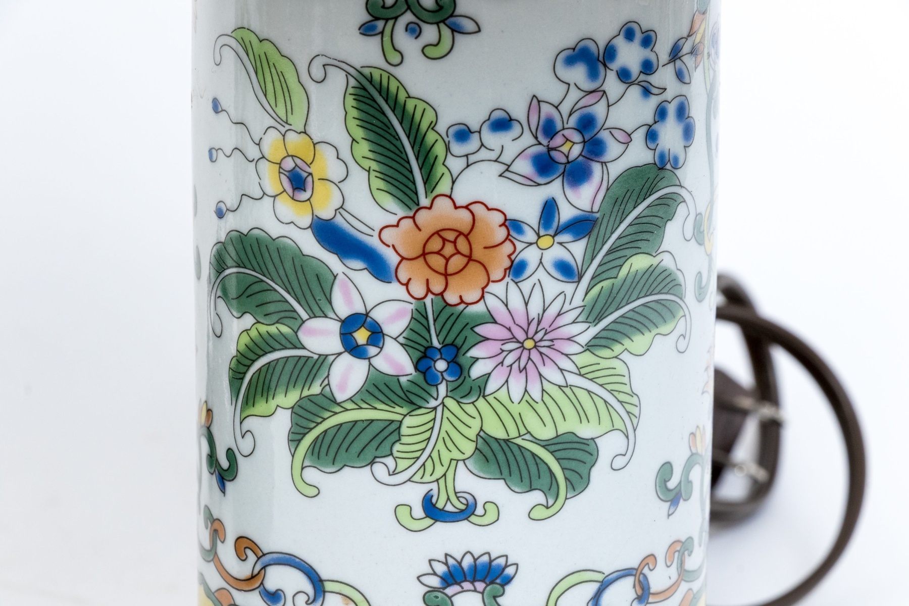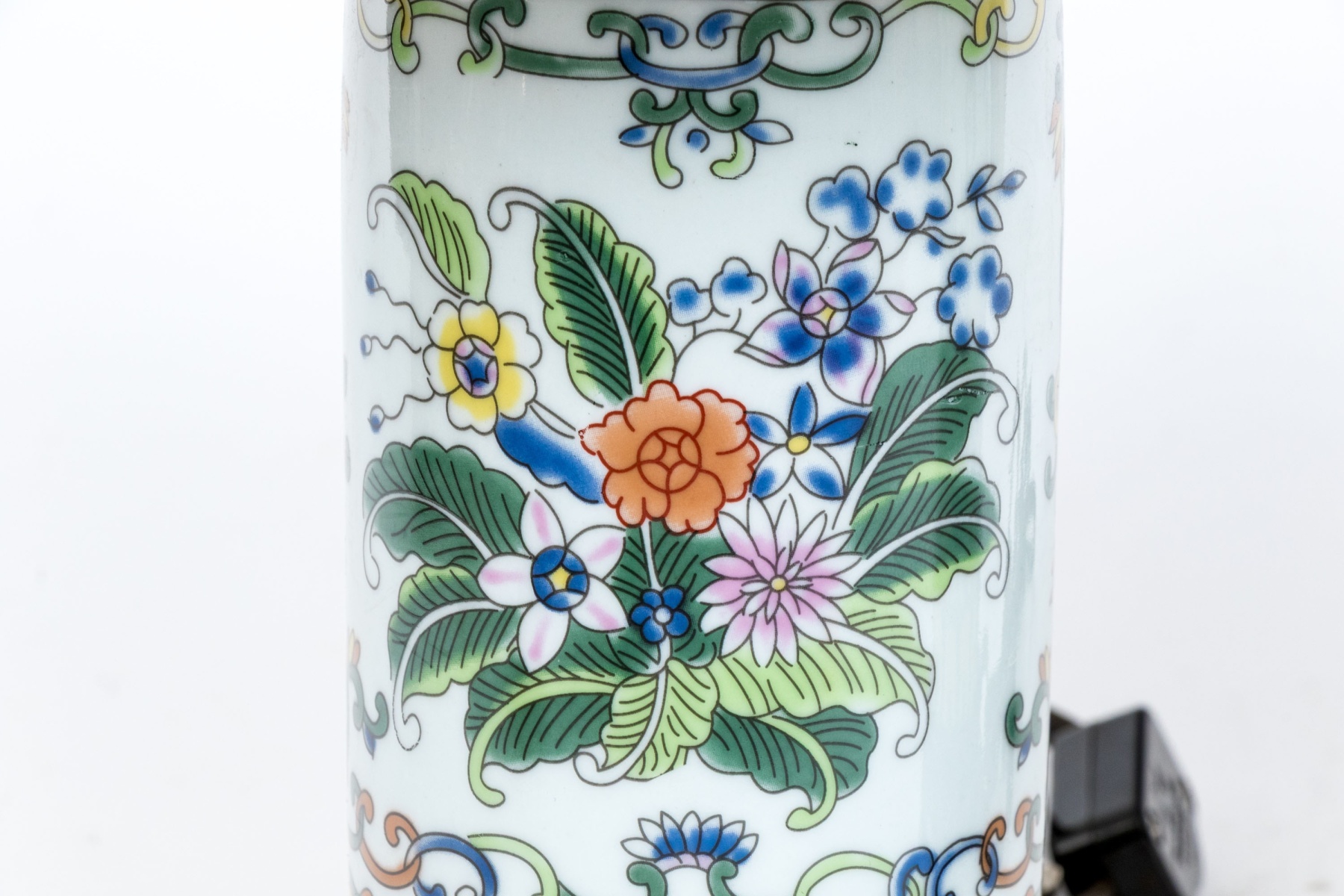 Mounted on wood bases with cylindrical porcelain bodies with famille verte color scheme depicting foliate and floral motifs.