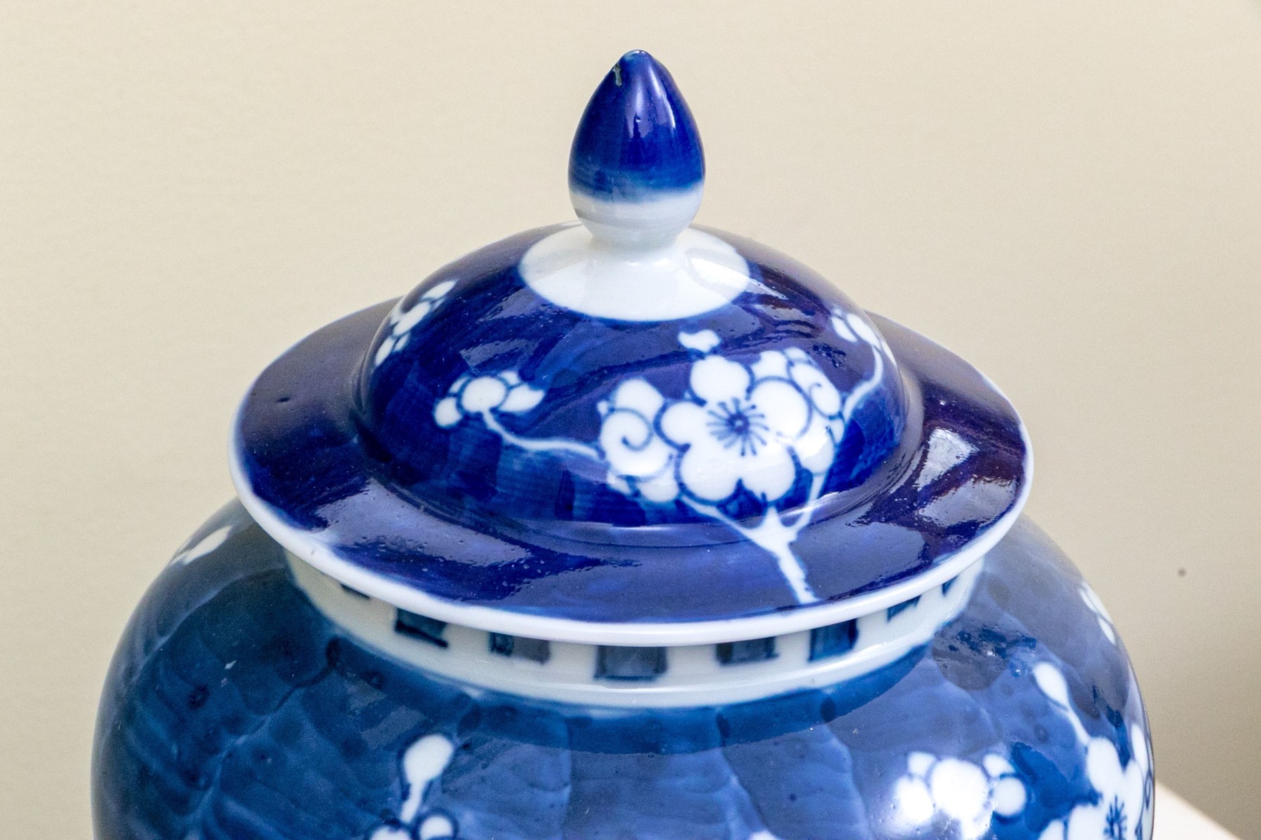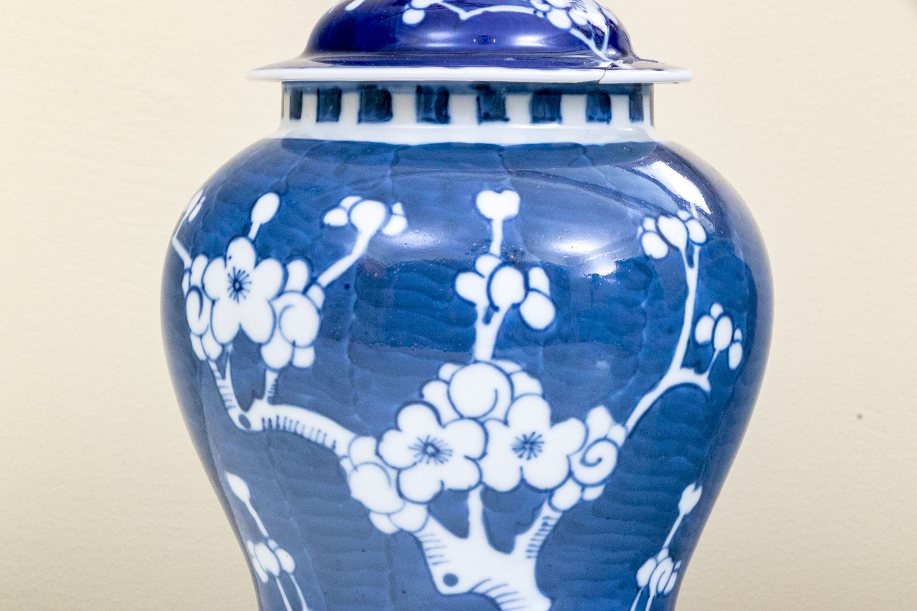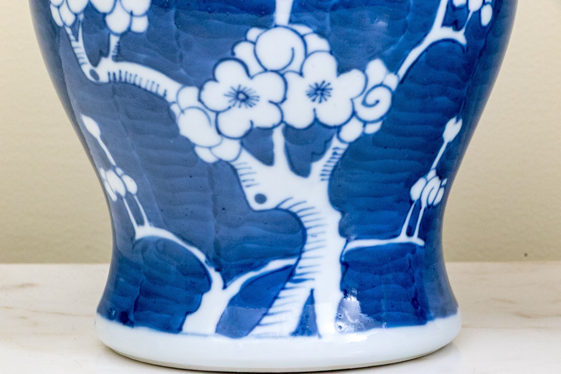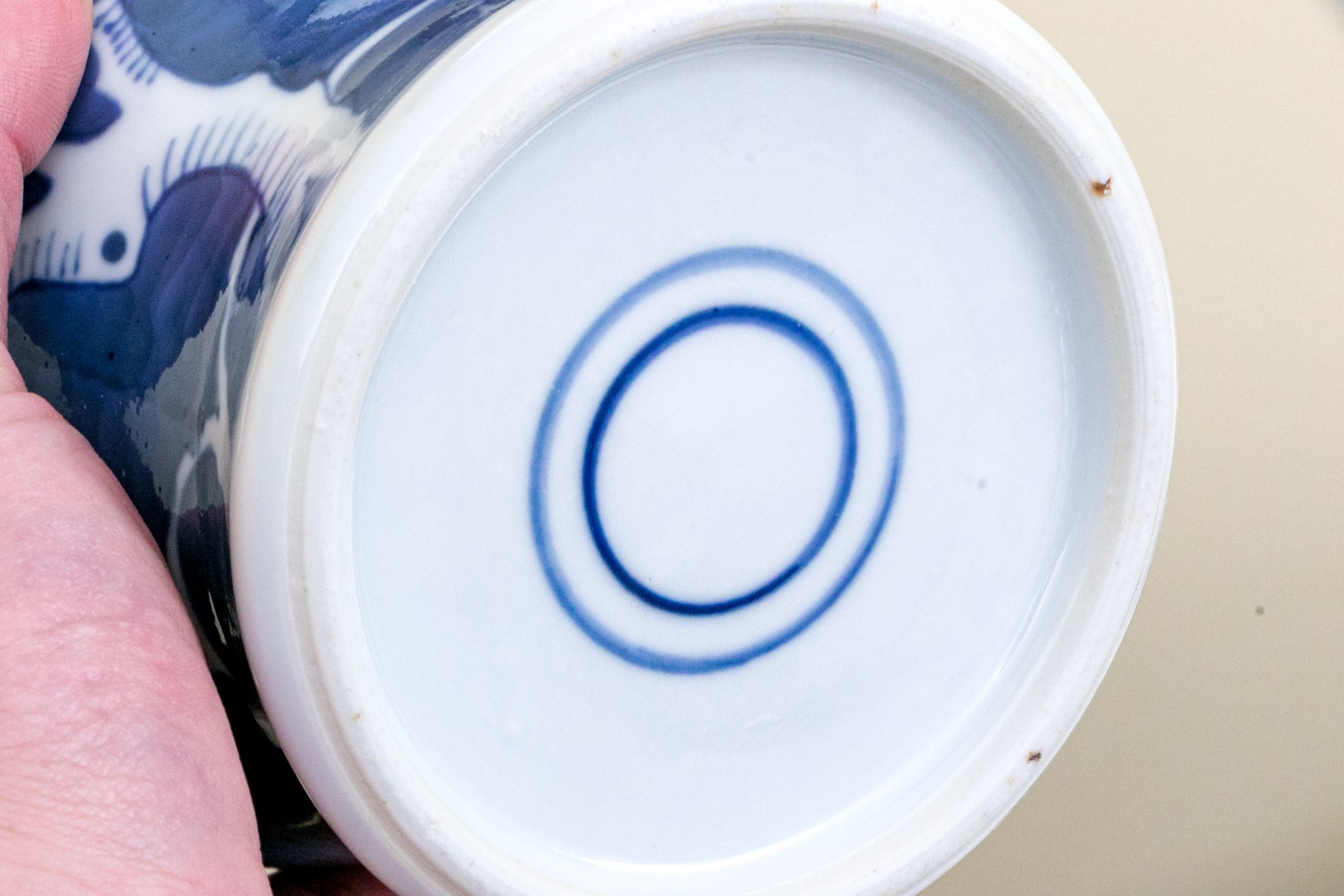 Prunus decoration. Double underglaze blue circles underfoot.