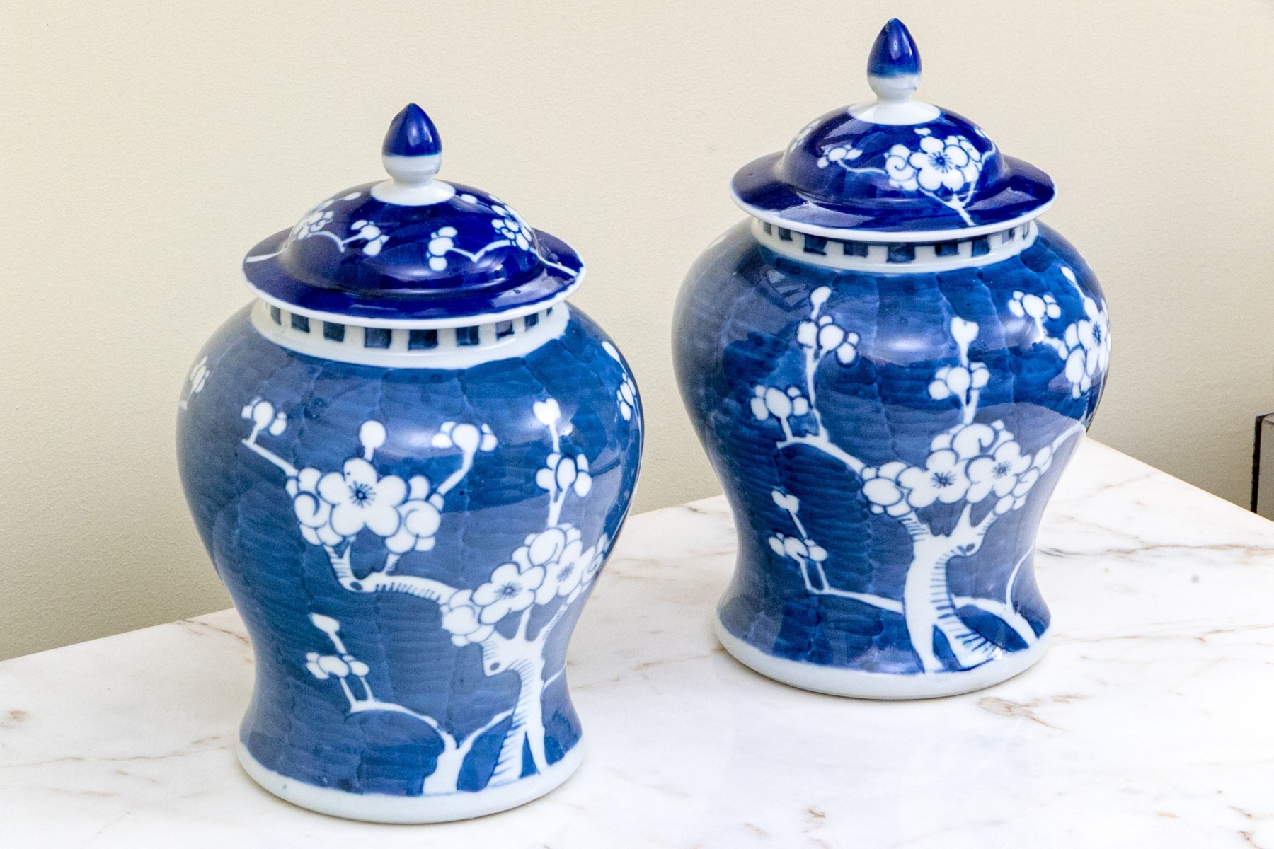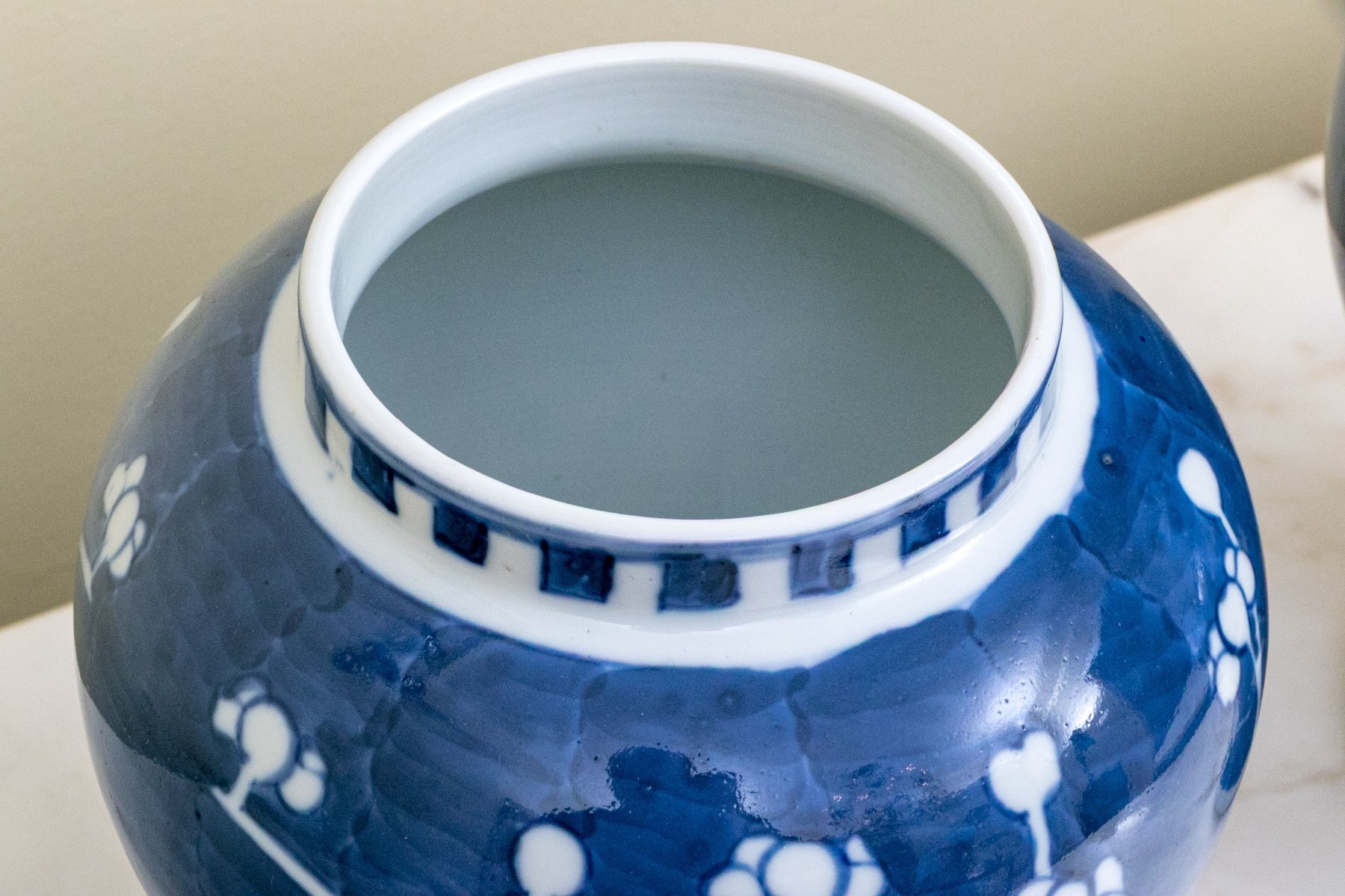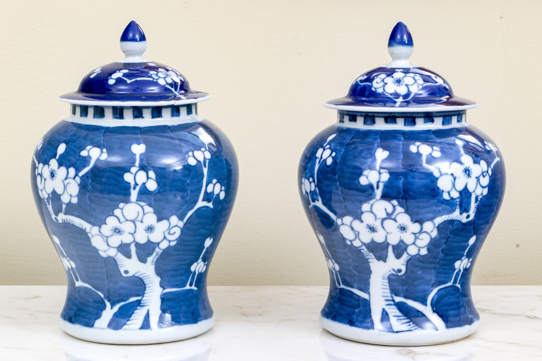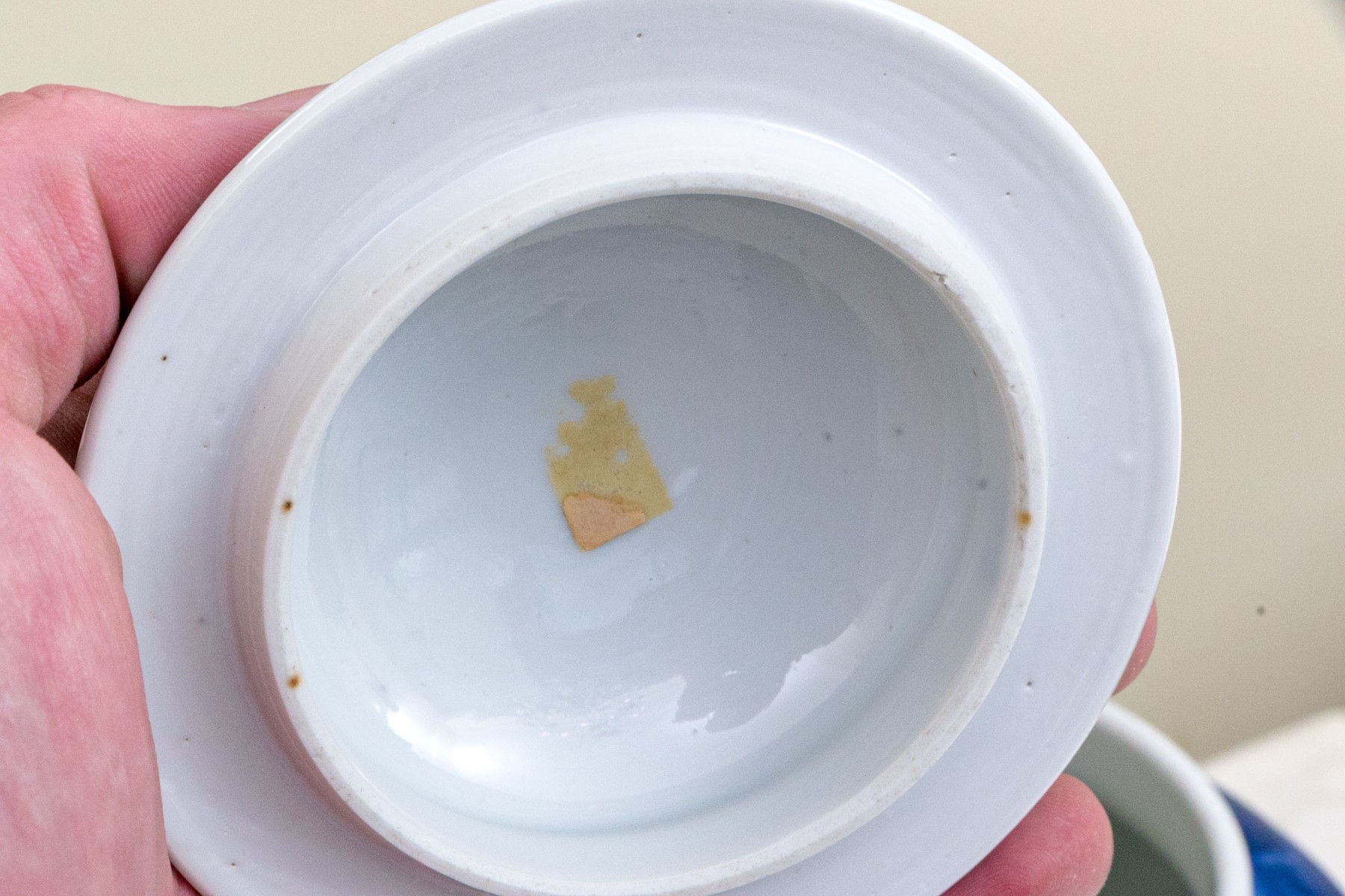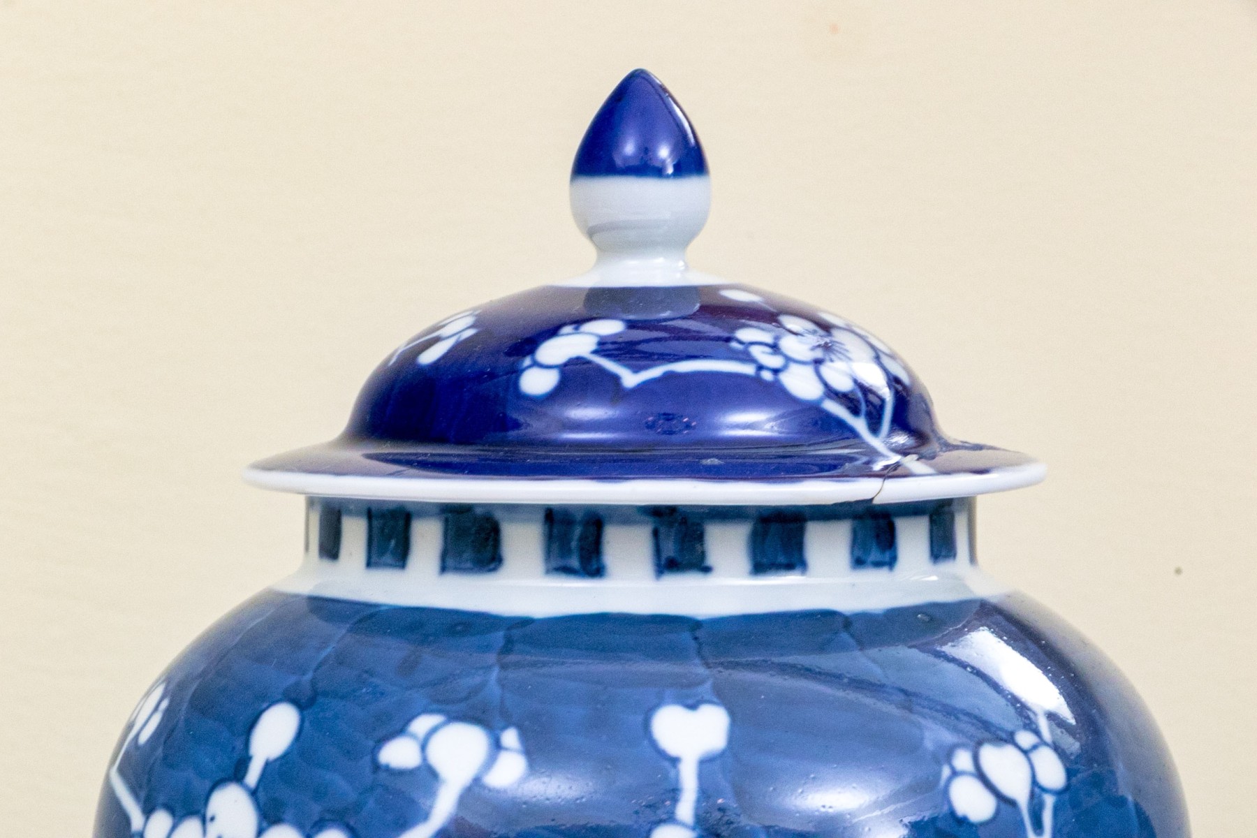 Prunus decoration. Double underglaze blue circles underfoot.