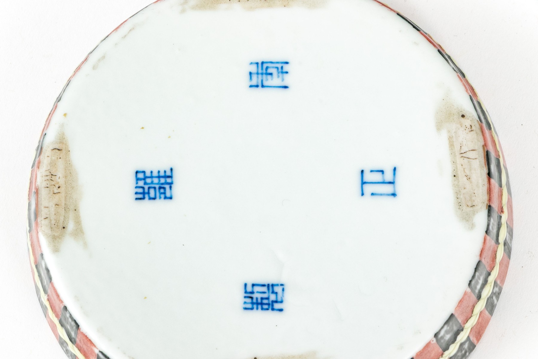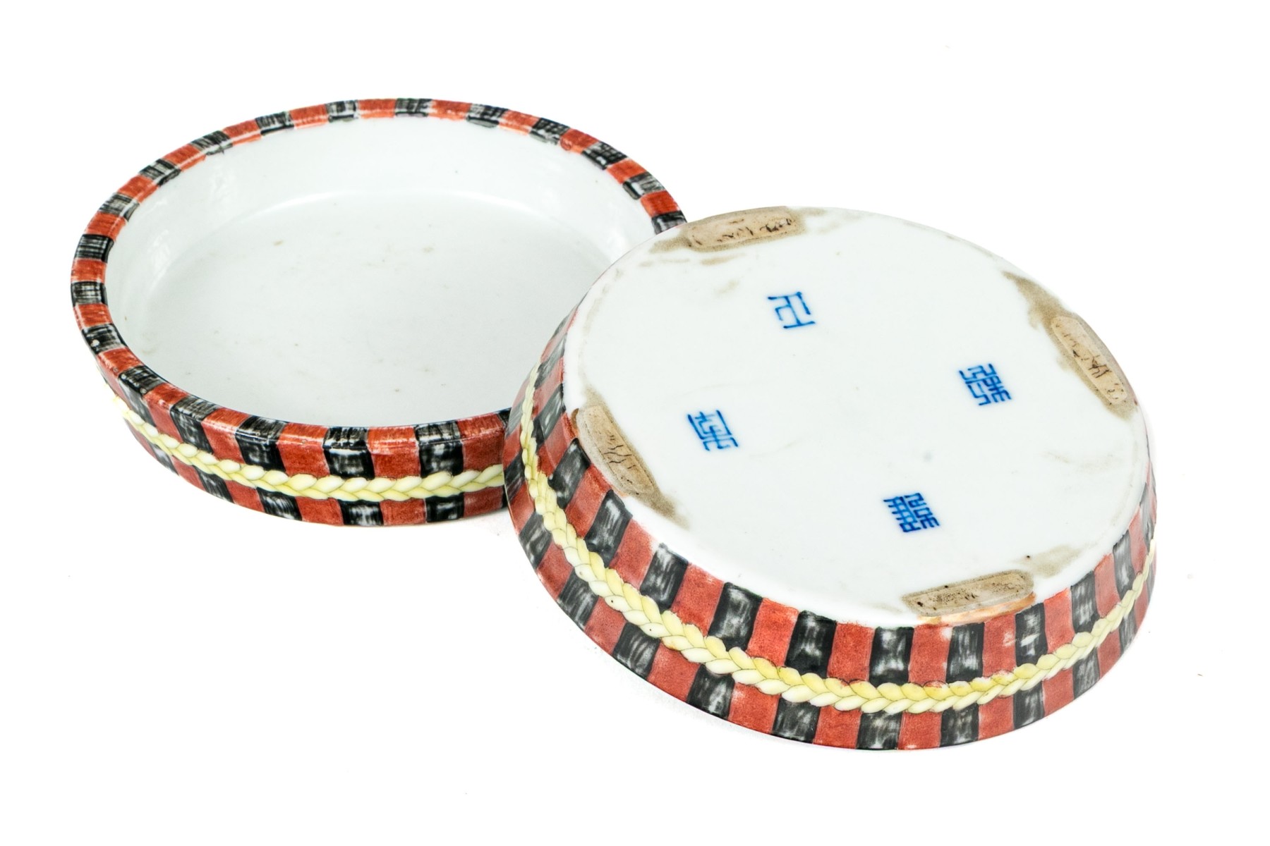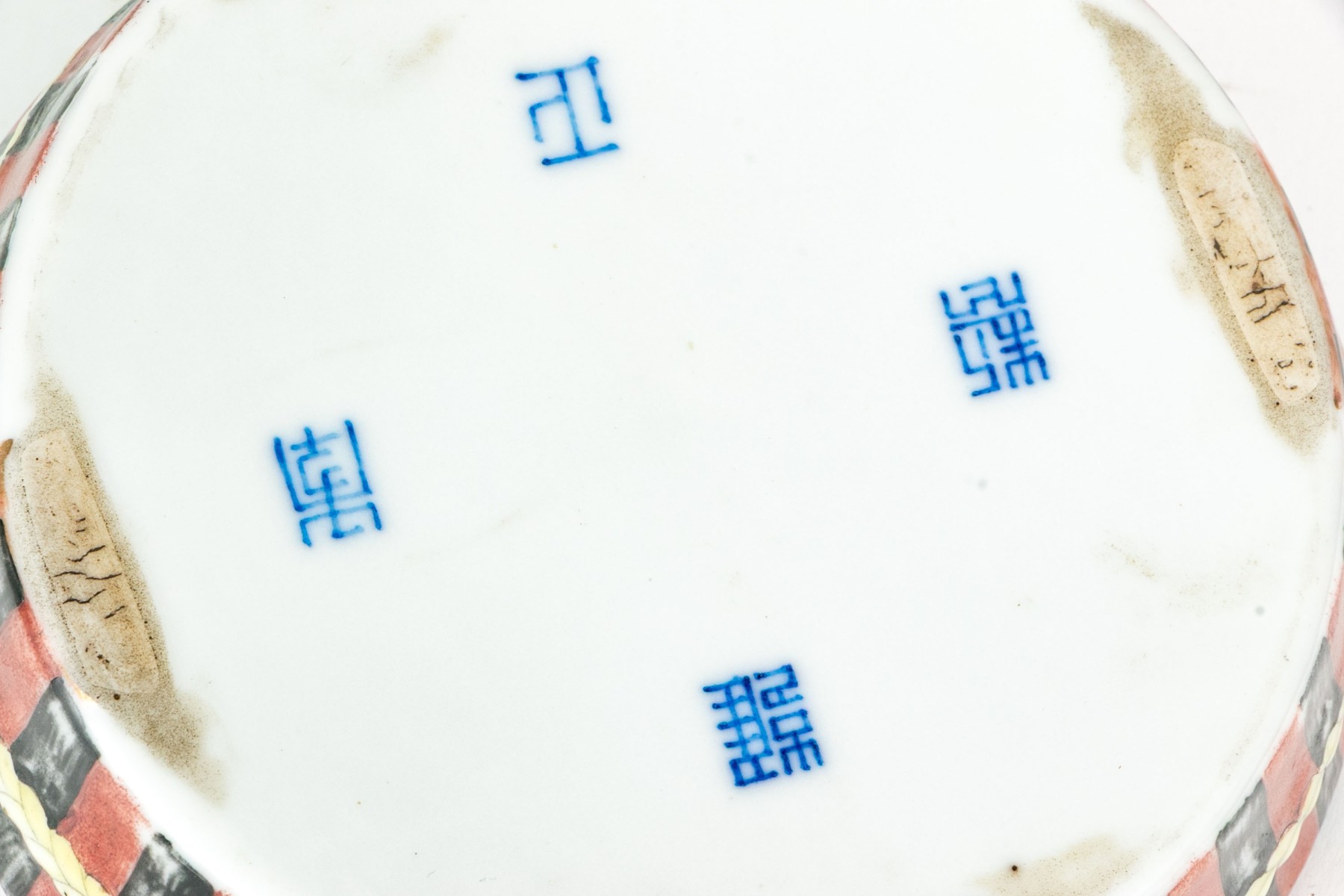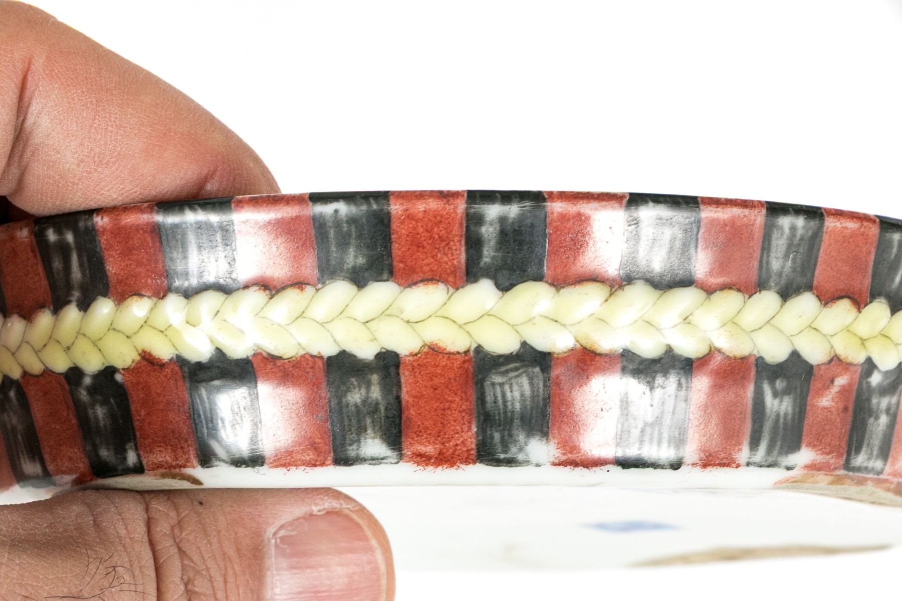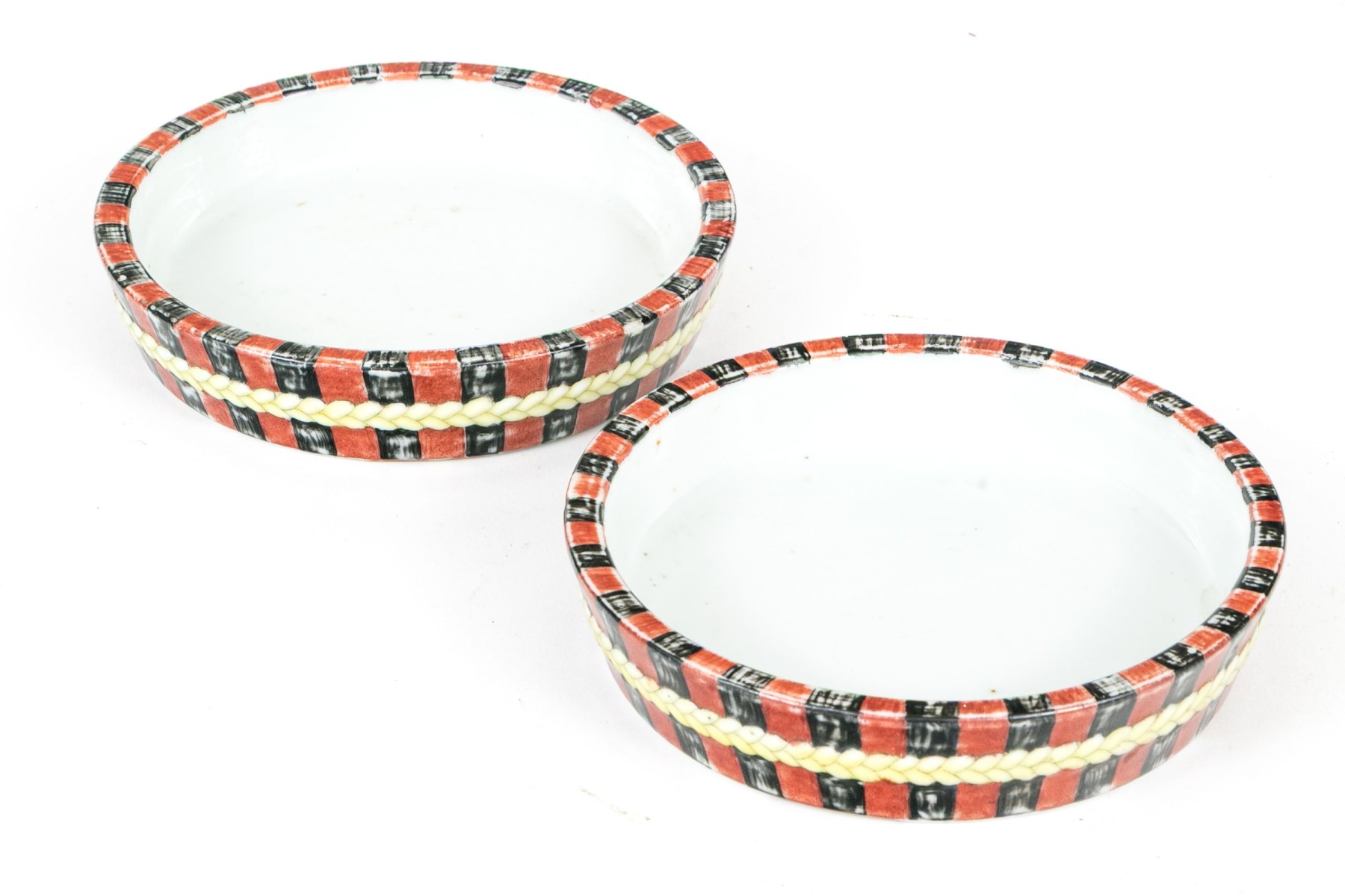 A striking pair of Chinese porcelain bowls showcasing wide forms with angled walls decorated with black and orange-red vertical underglaze stripes overlaid with a yellow braid motif. Marked underfoot.