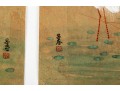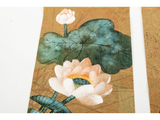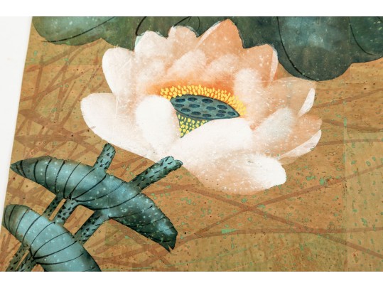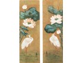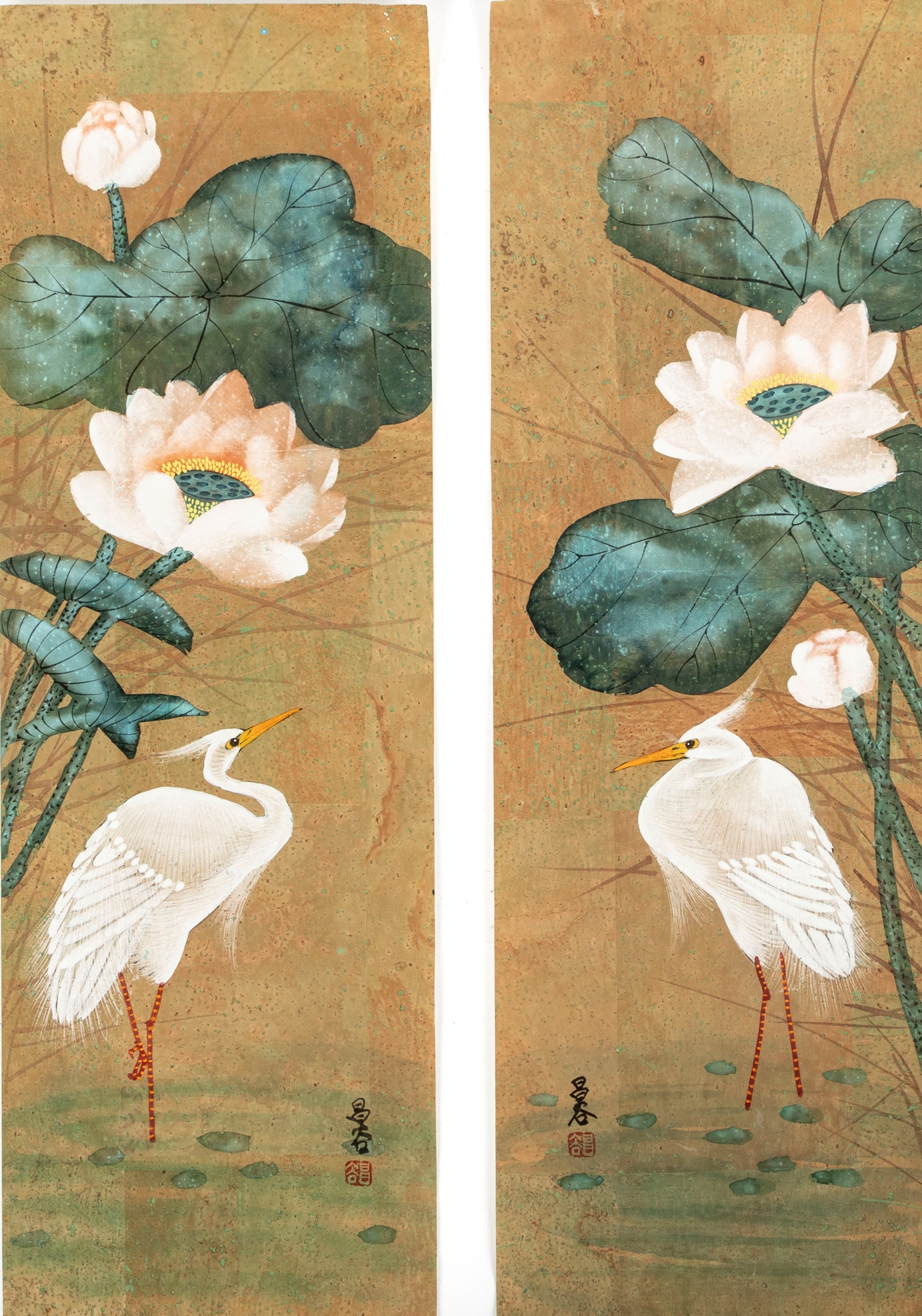 A wonderful pair of Chinese paintings depicting mirrored scenes of white cranes wading in water under large light pink lotuses with lush green foliage. Signed lower right and left. Displayed unframed and unmounted.