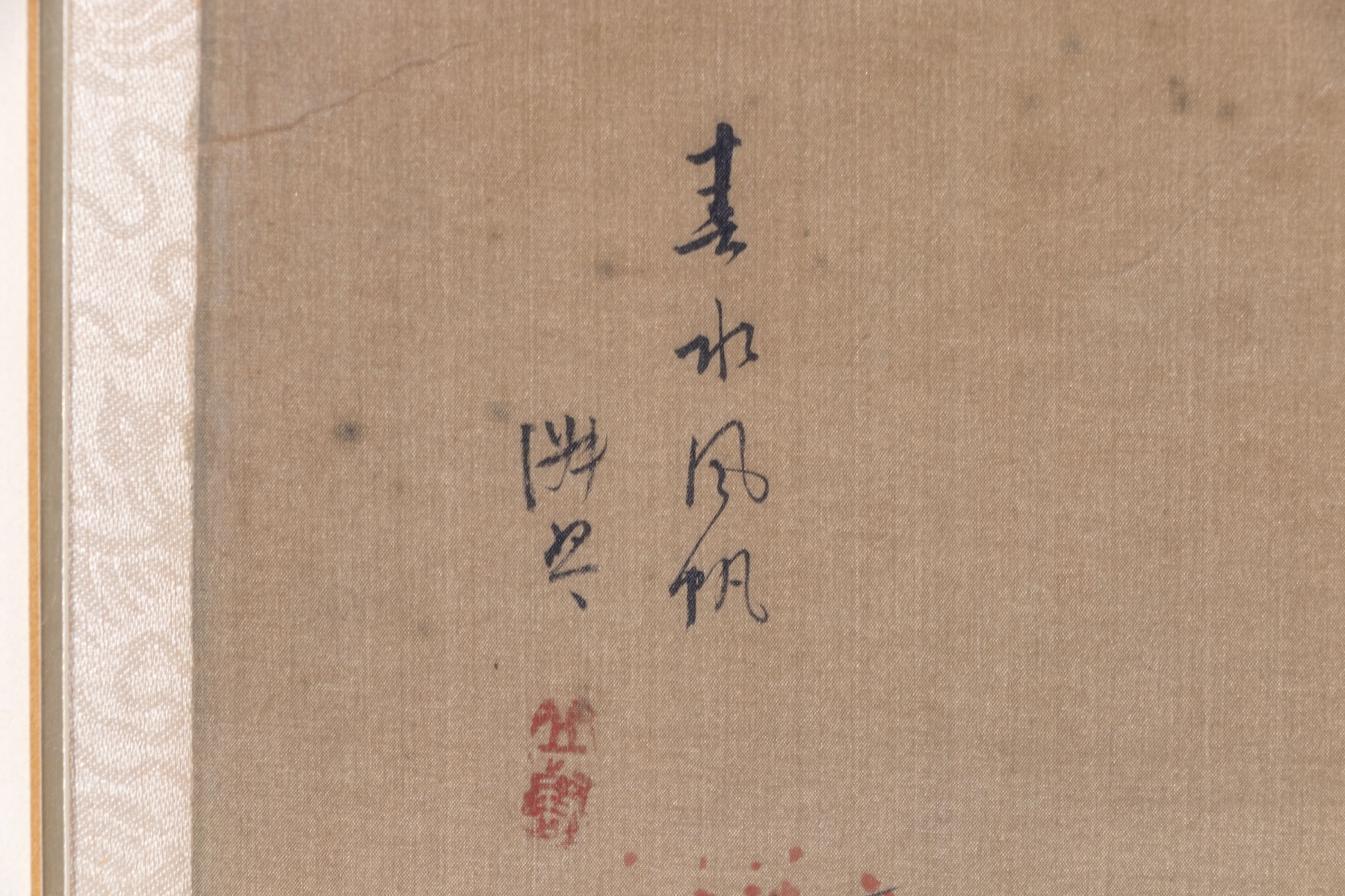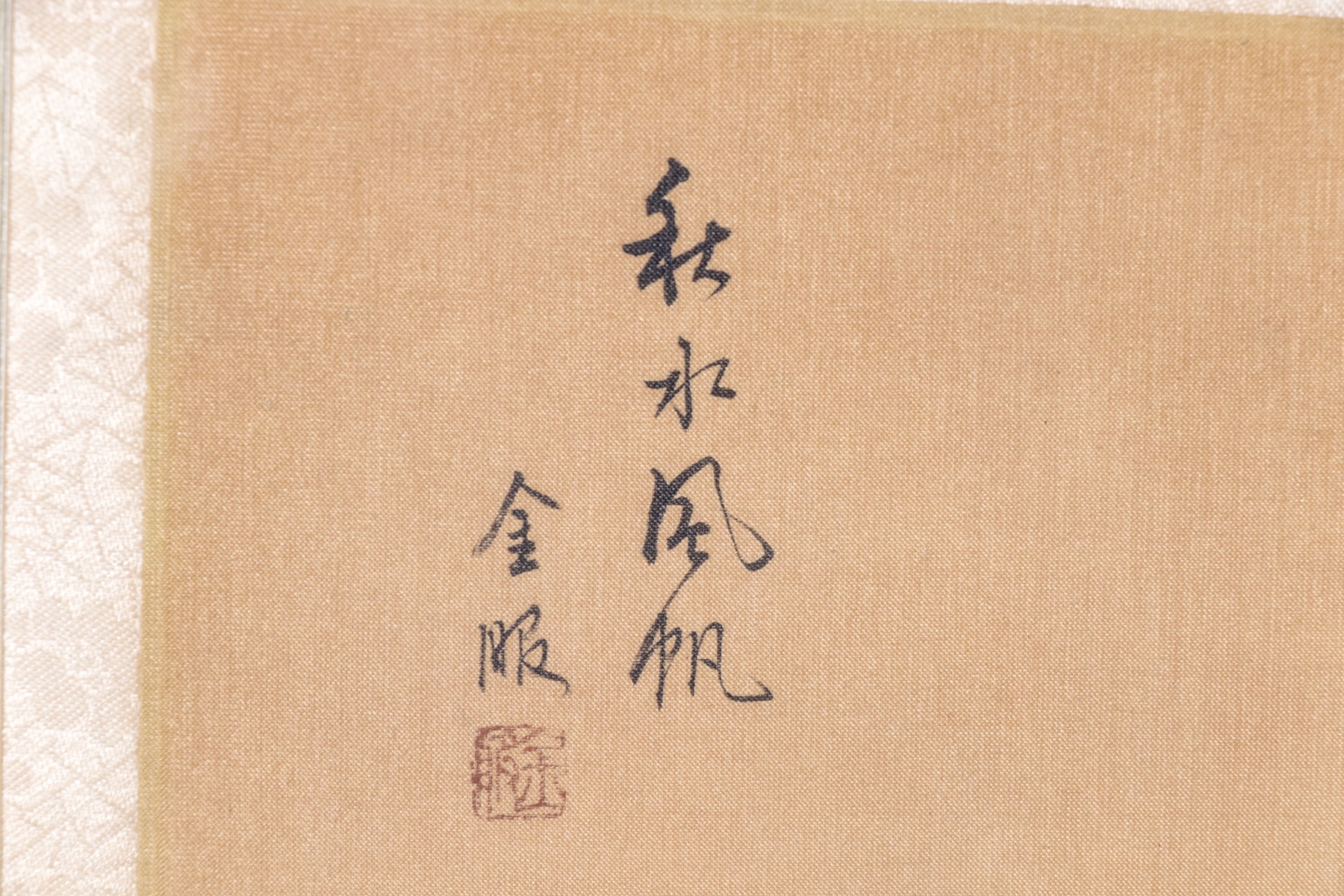A wonderful pair of Chinese paintings on silk depicting traditional architecture in lush, natural landscapes with boats on calm water, tall rocky cliffs, and flowering trees making for calm, classic scenes. Both with inscriptions and red seals upper left.