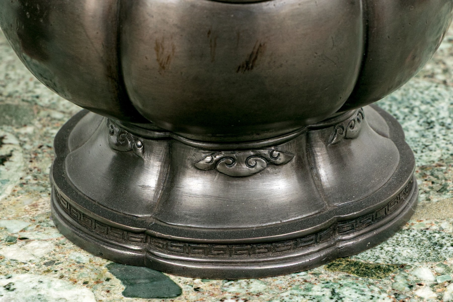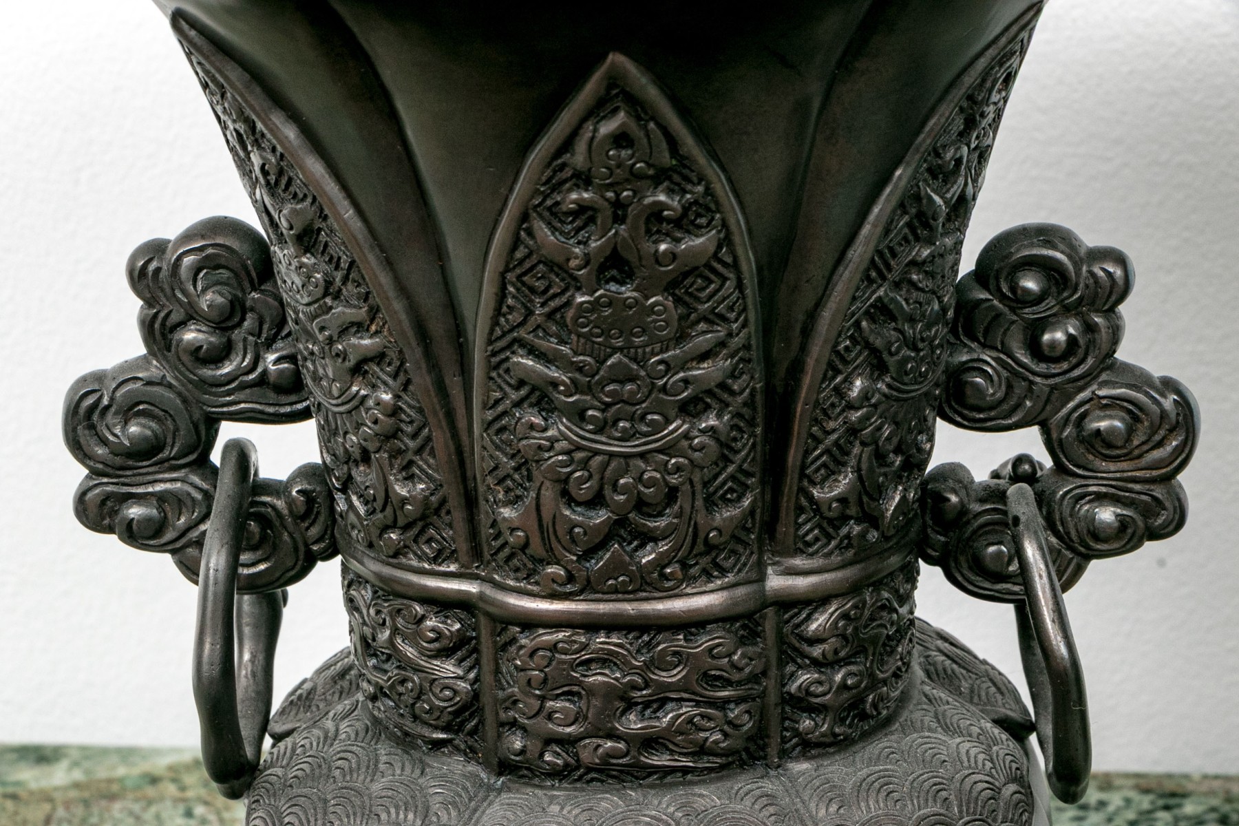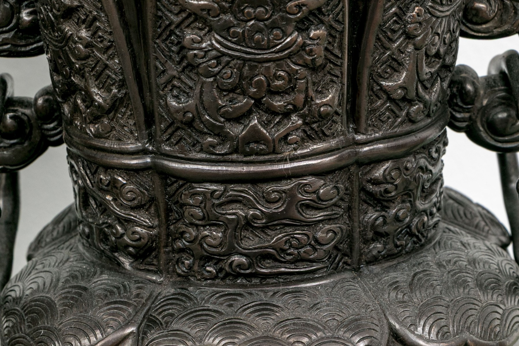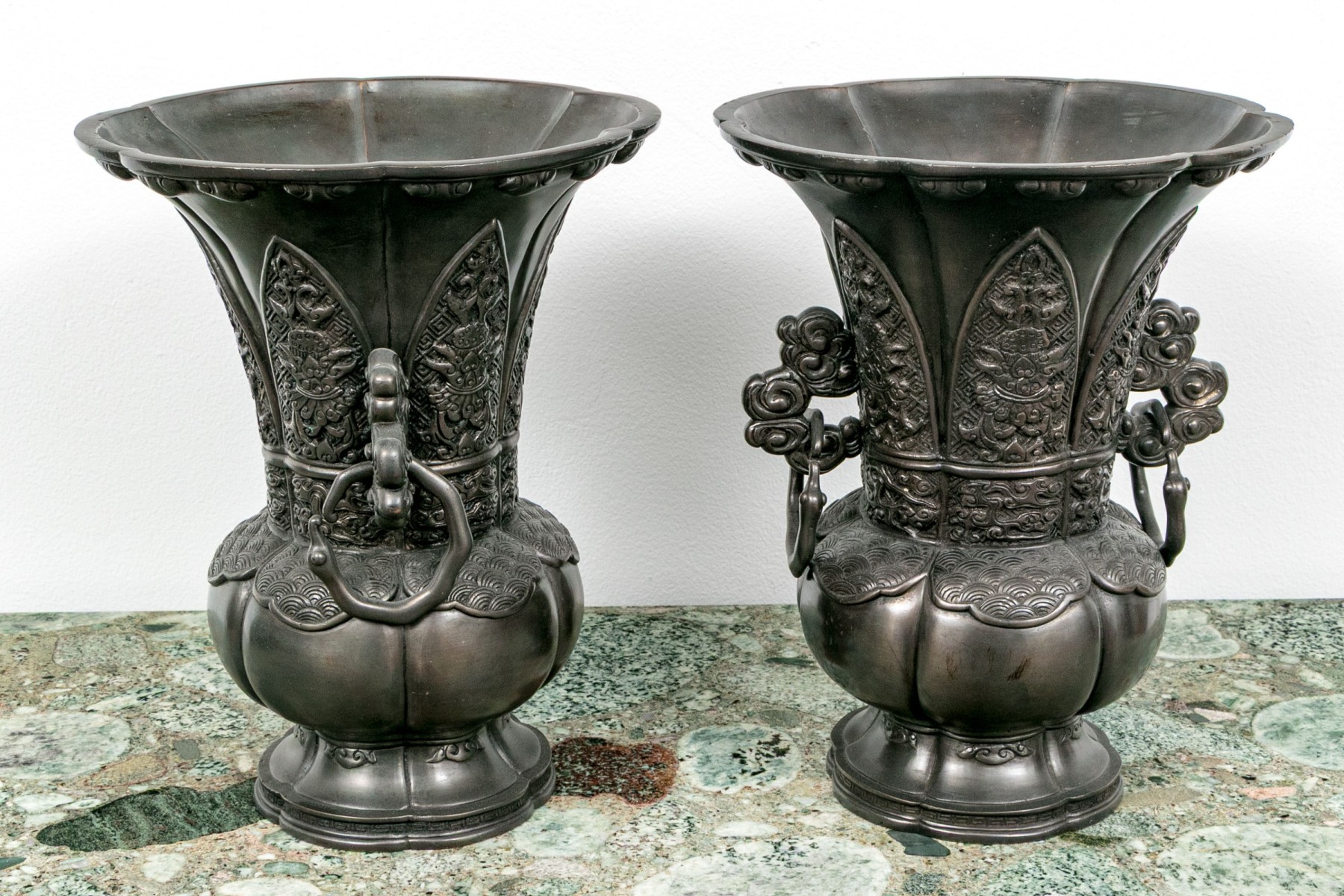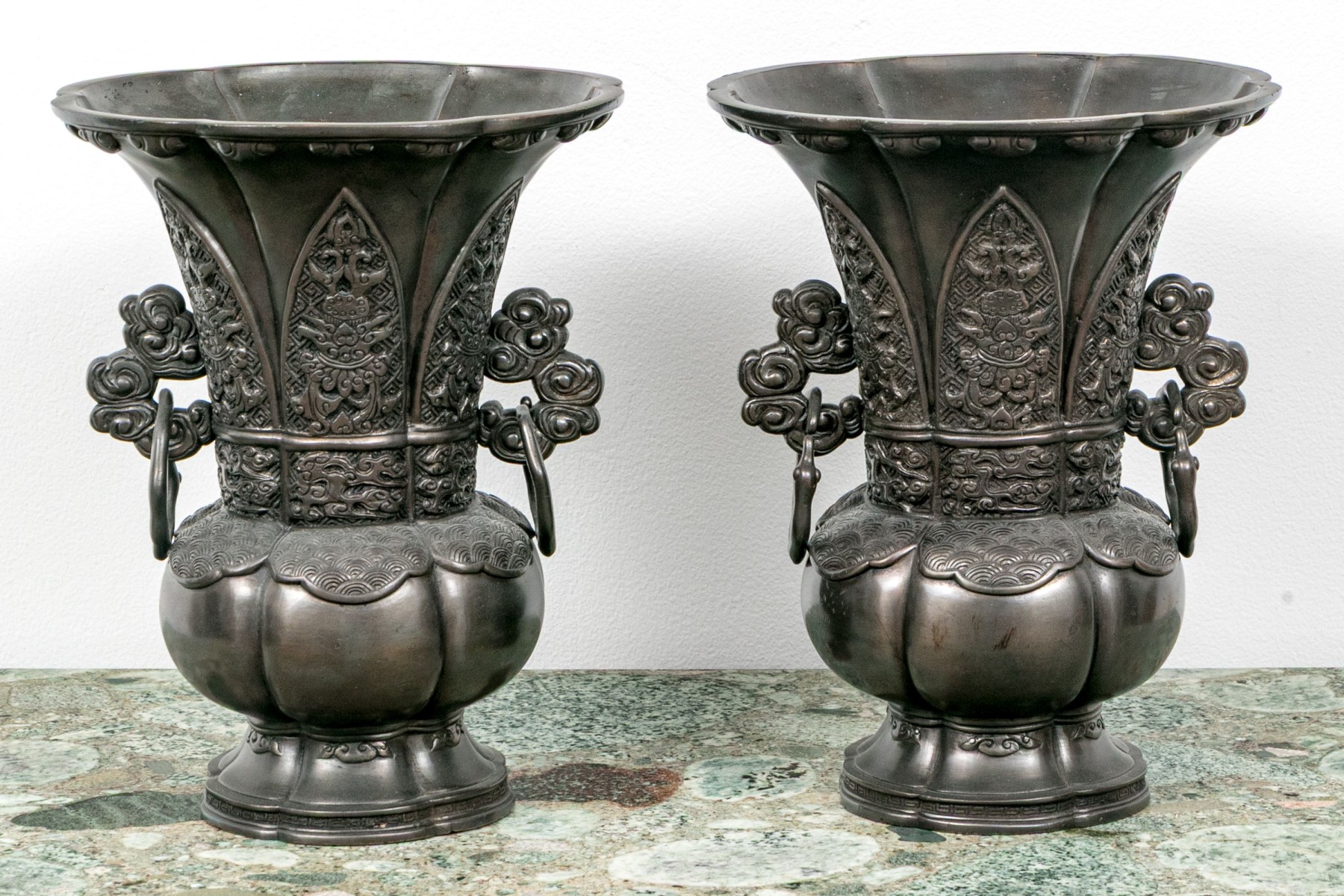 A handsome pair of Chinese pewter patinated bronze Gu form vases on scalloped feet with lobed bodies decorated by twin loose ring handles with archaistic lappet decoration, finished with flared and scalloped mouth rims. Marked underfoot.