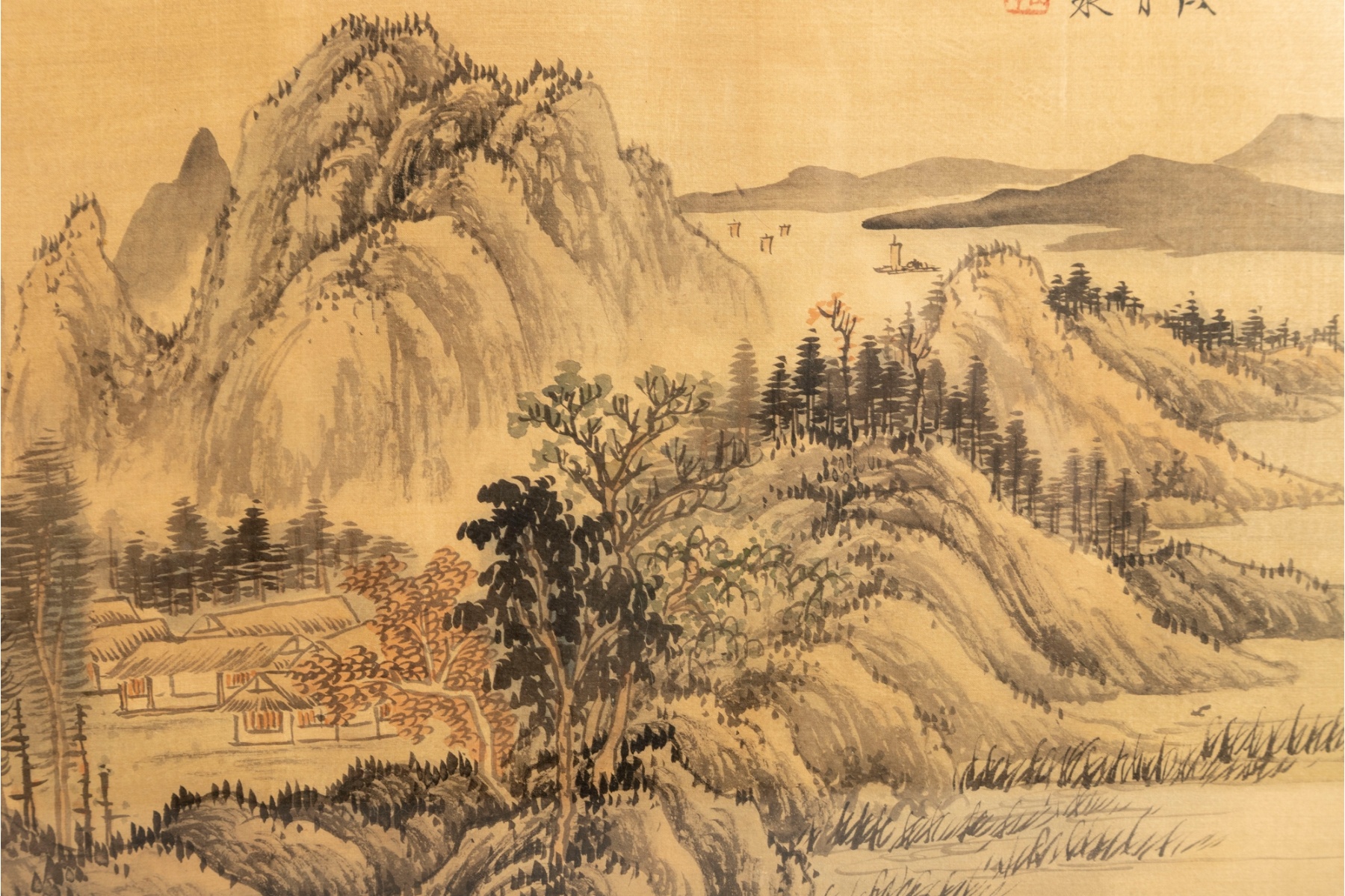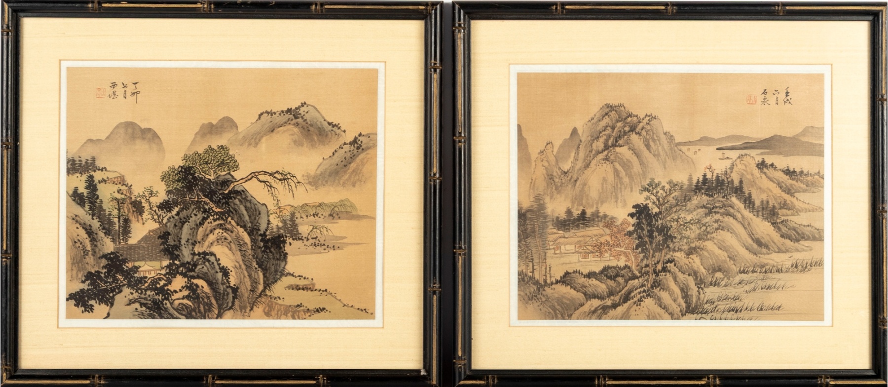 A pair of traditional Chinese landscape paintings executed in the Shan Shui (“mountain-water”) style, each depicting misty mountains, flowing rivers, and distant lands, finely rendered in ink and watercolor on silk.