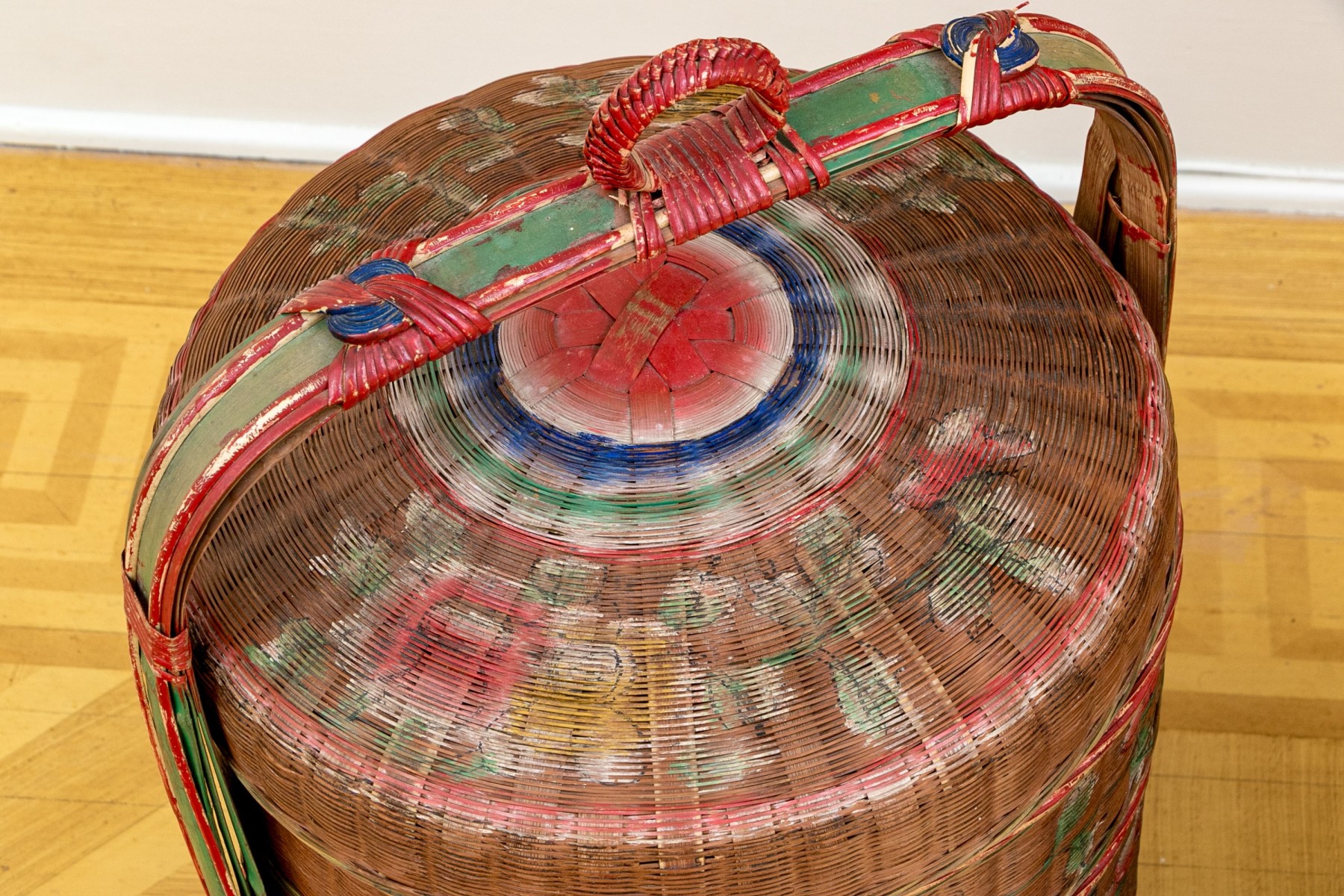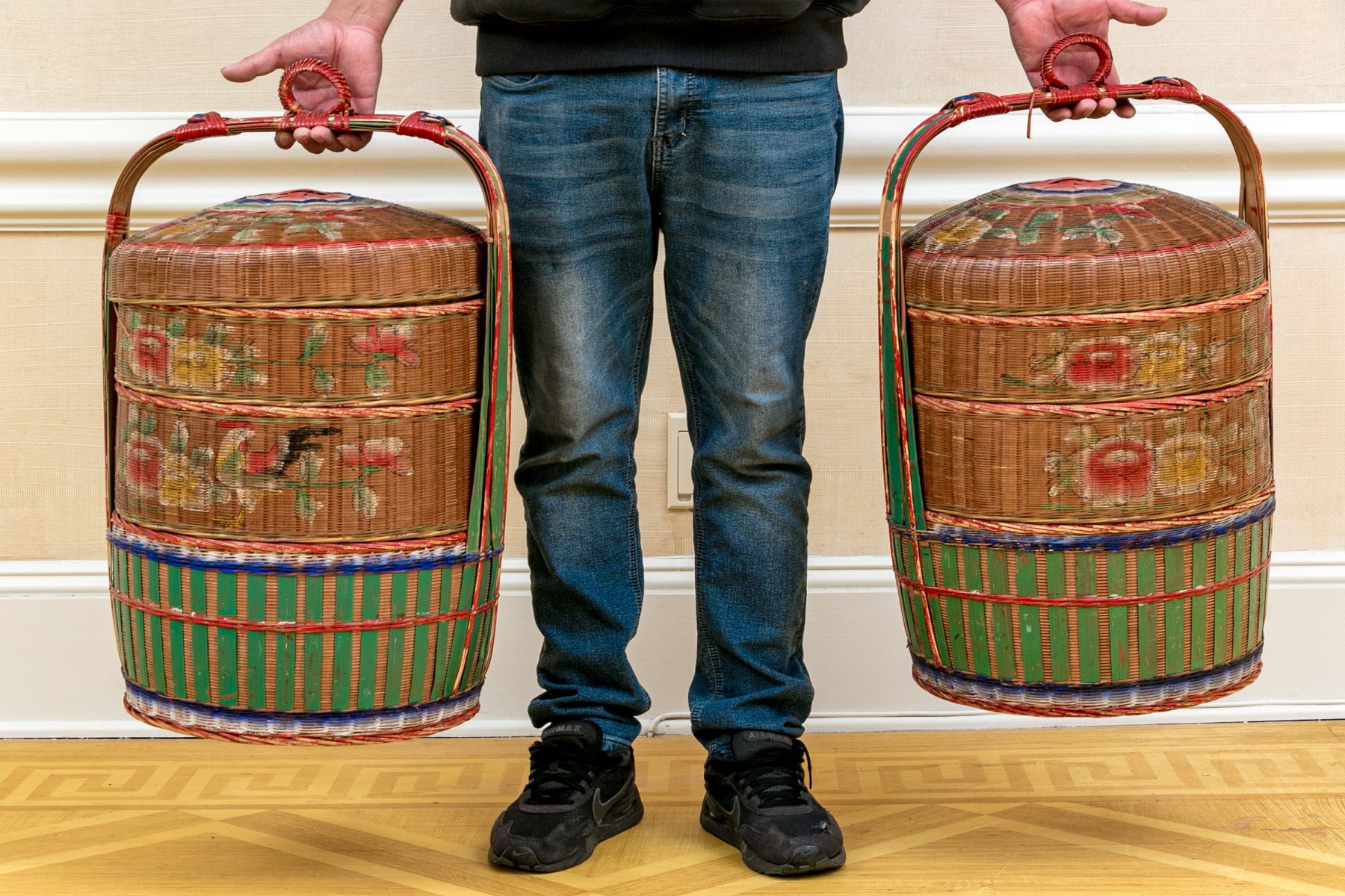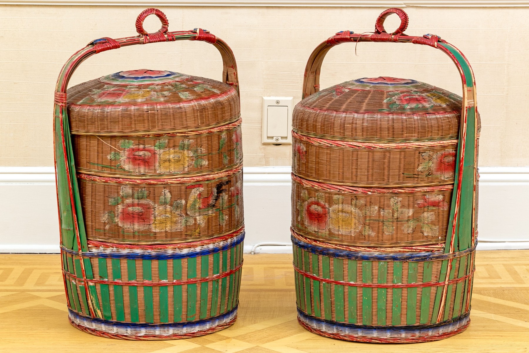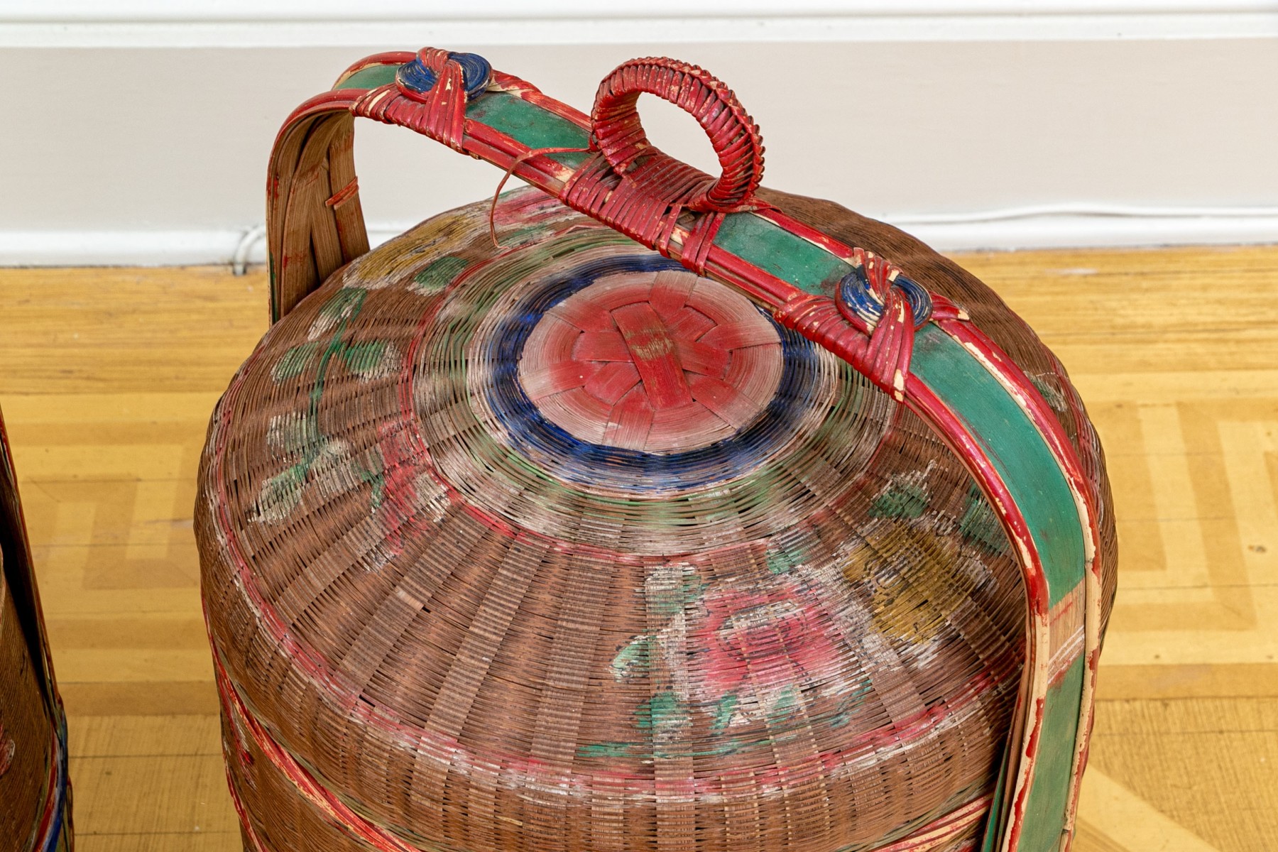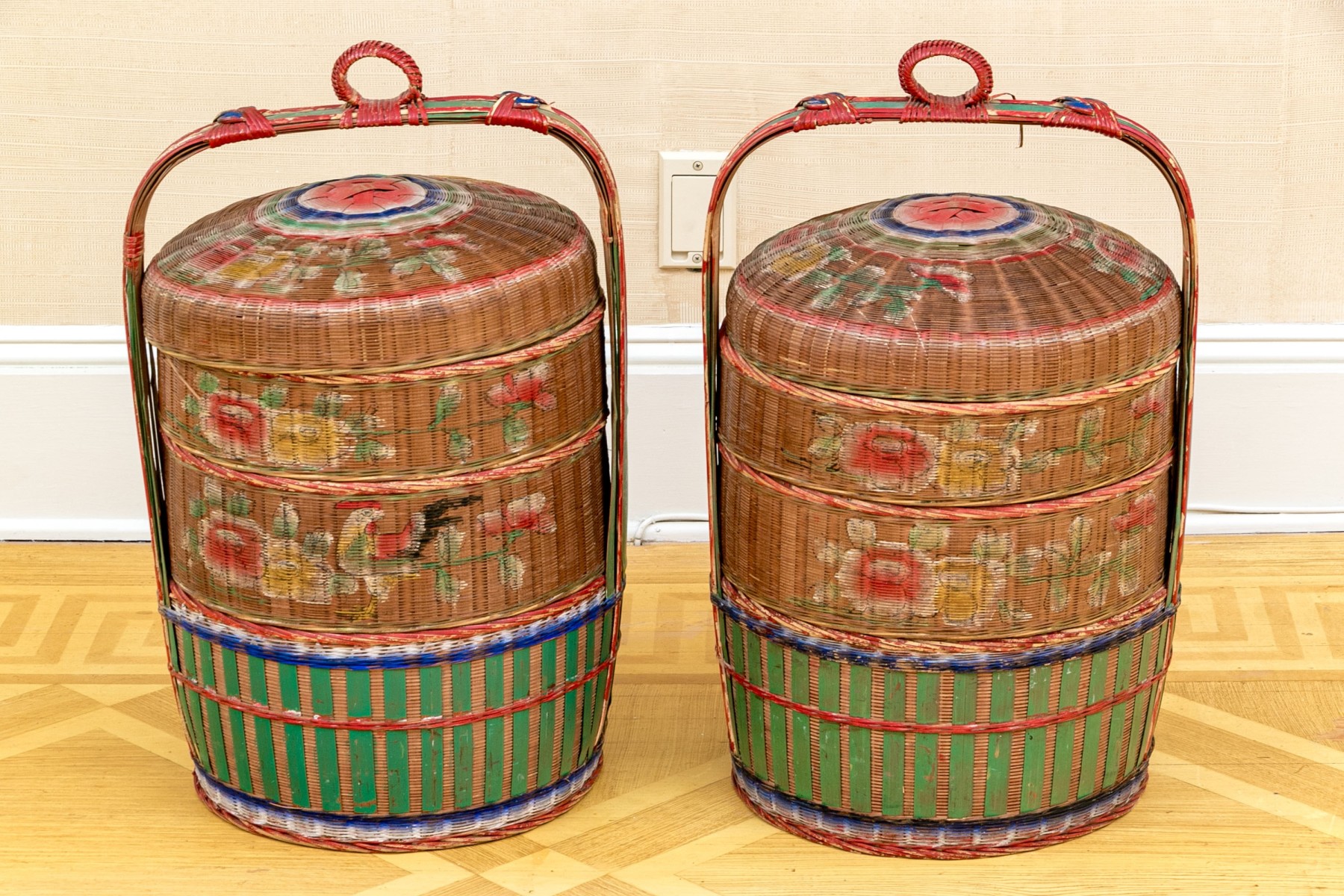 Each one with a tier of three large round baskets paint decorated in colors with flowers and a bird. With painted wooden and reed wrapped handles.