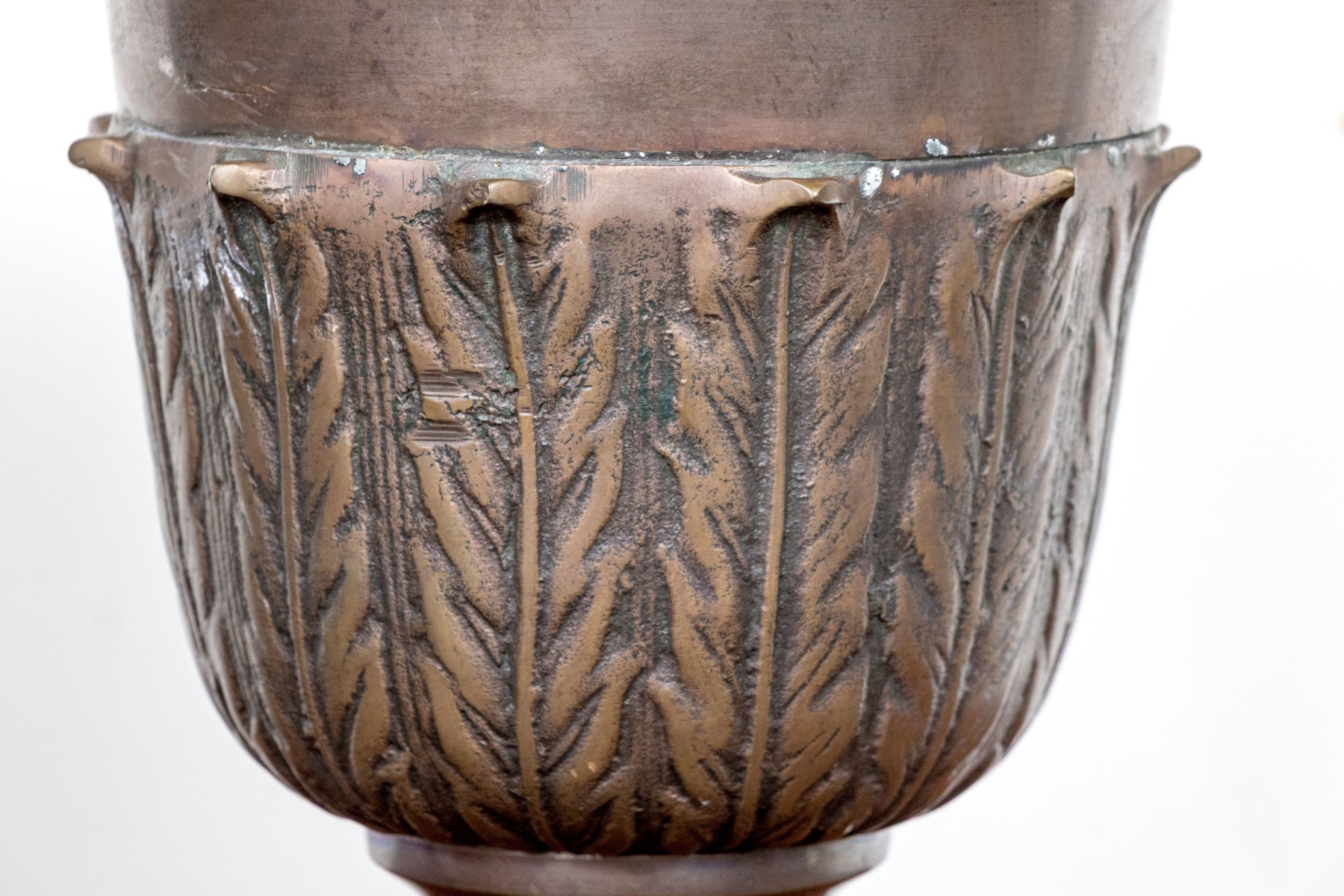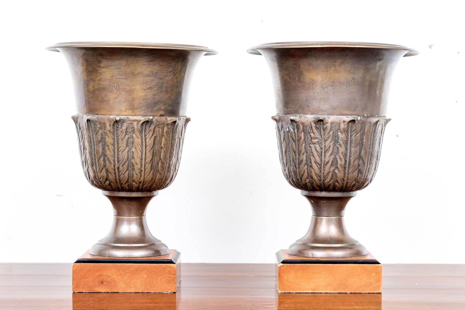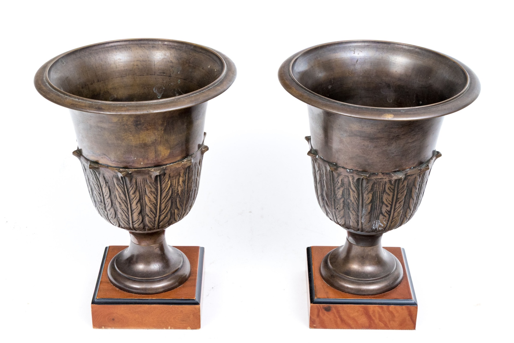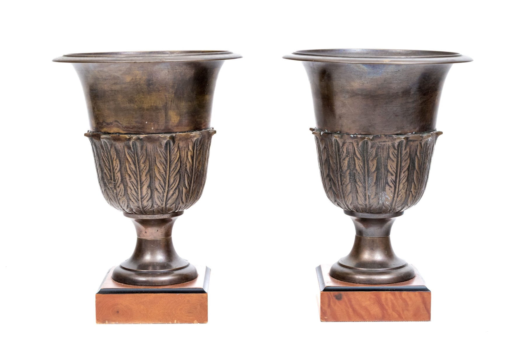 Affixed to square bases the footed urns with applied foliate motifs to the lower body of the urns in low relief.