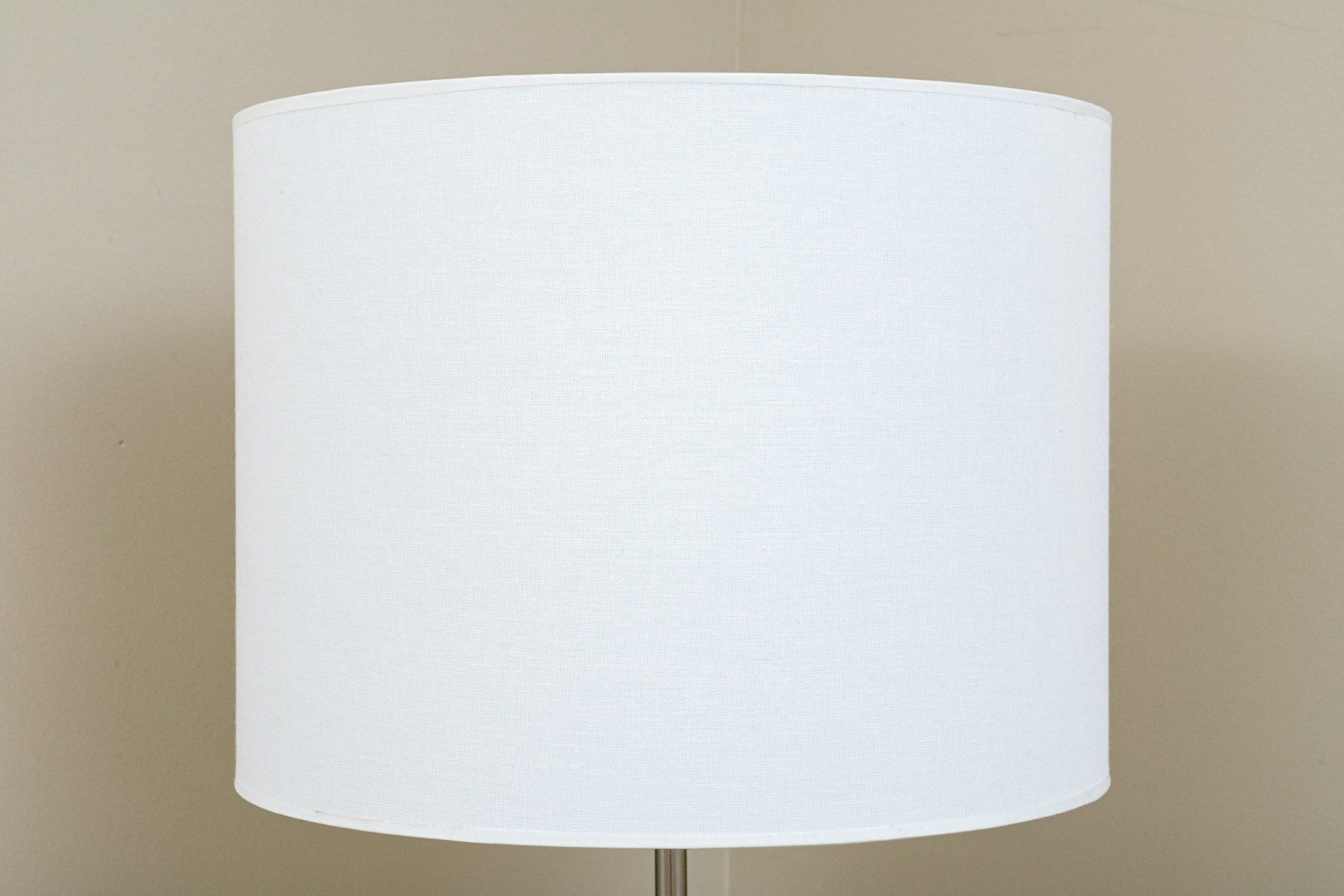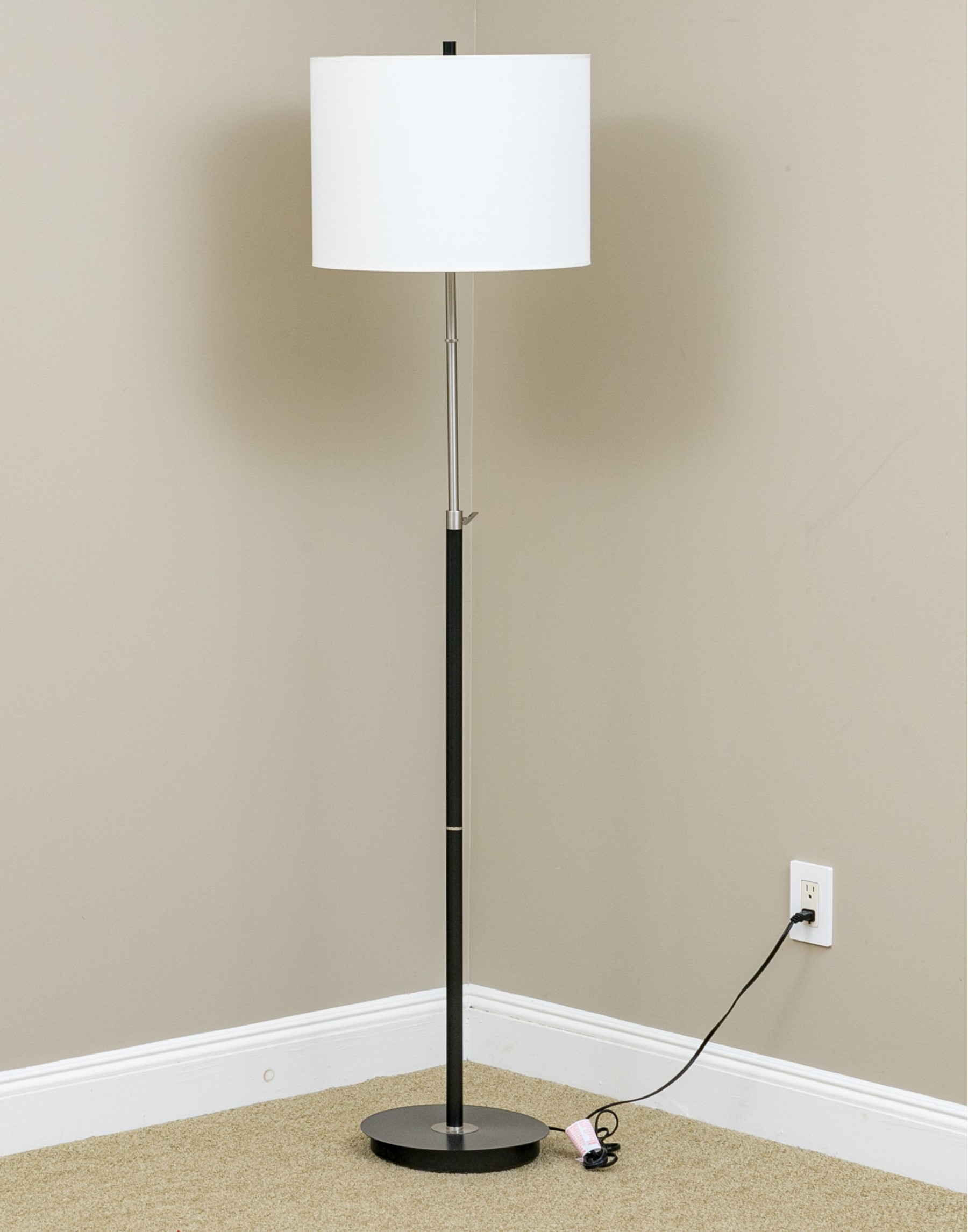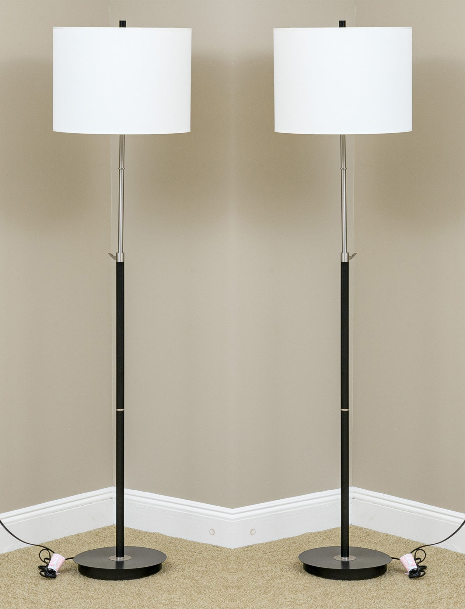 Pair of contemporary black metal and chrome floor lamps with white drum shades. Adjustable height.