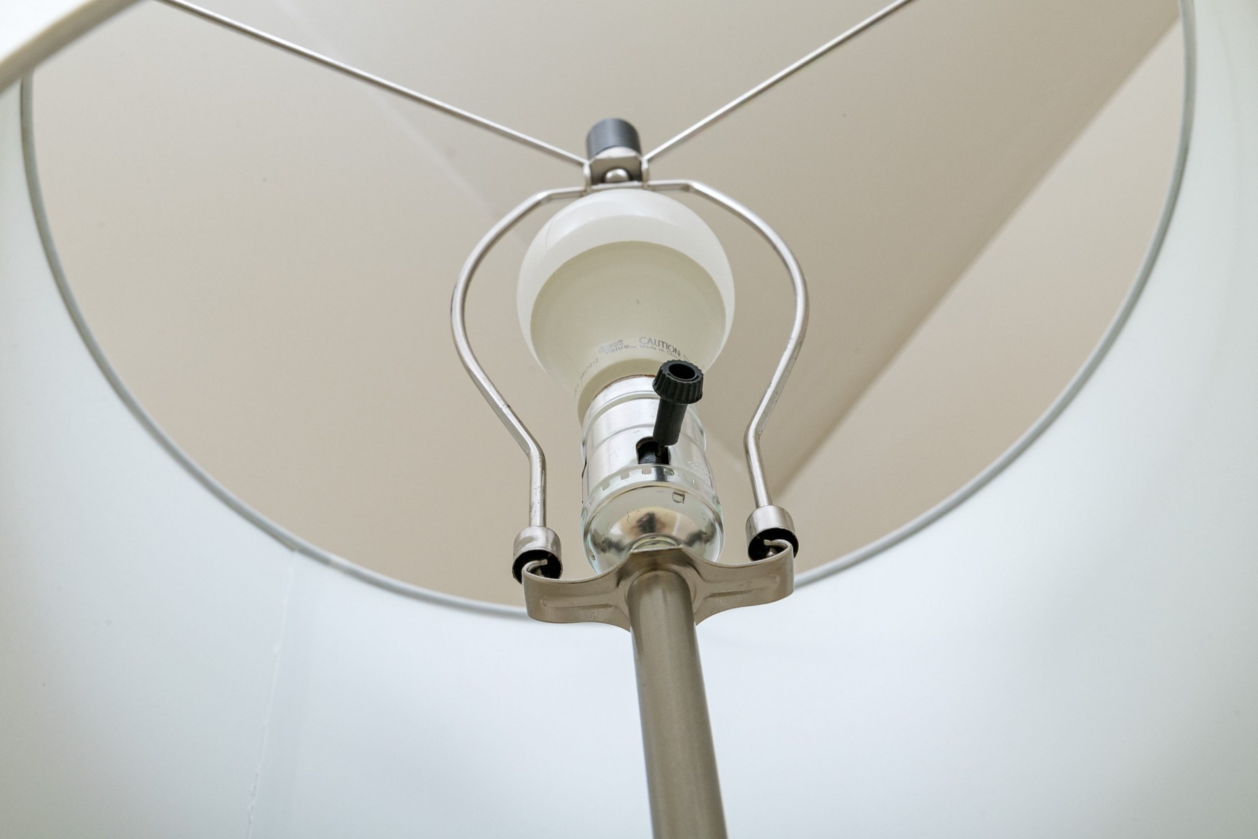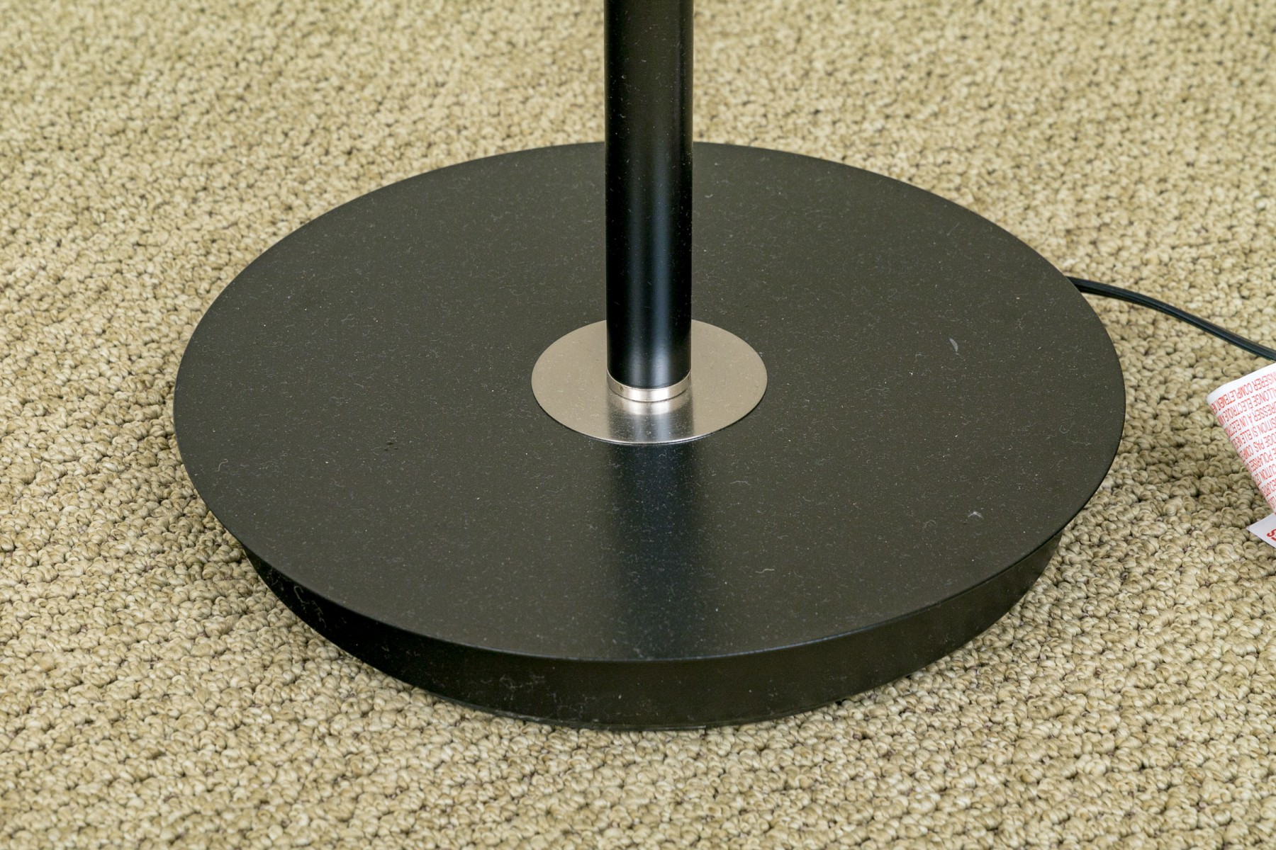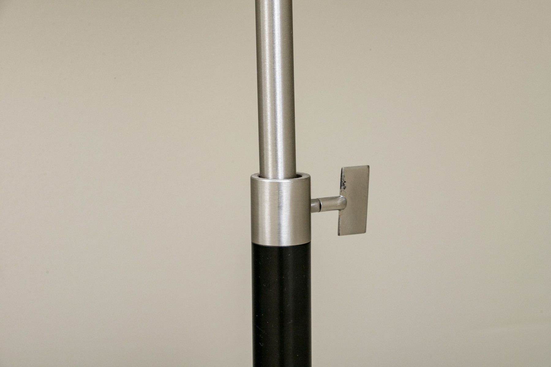 Pair of contemporary black metal and chrome floor lamps with white drum shades. Adjustable height.