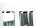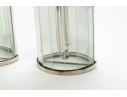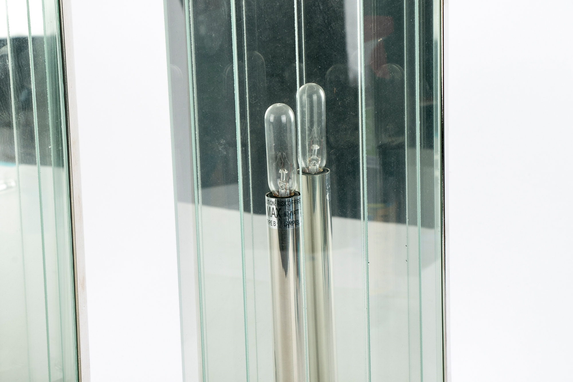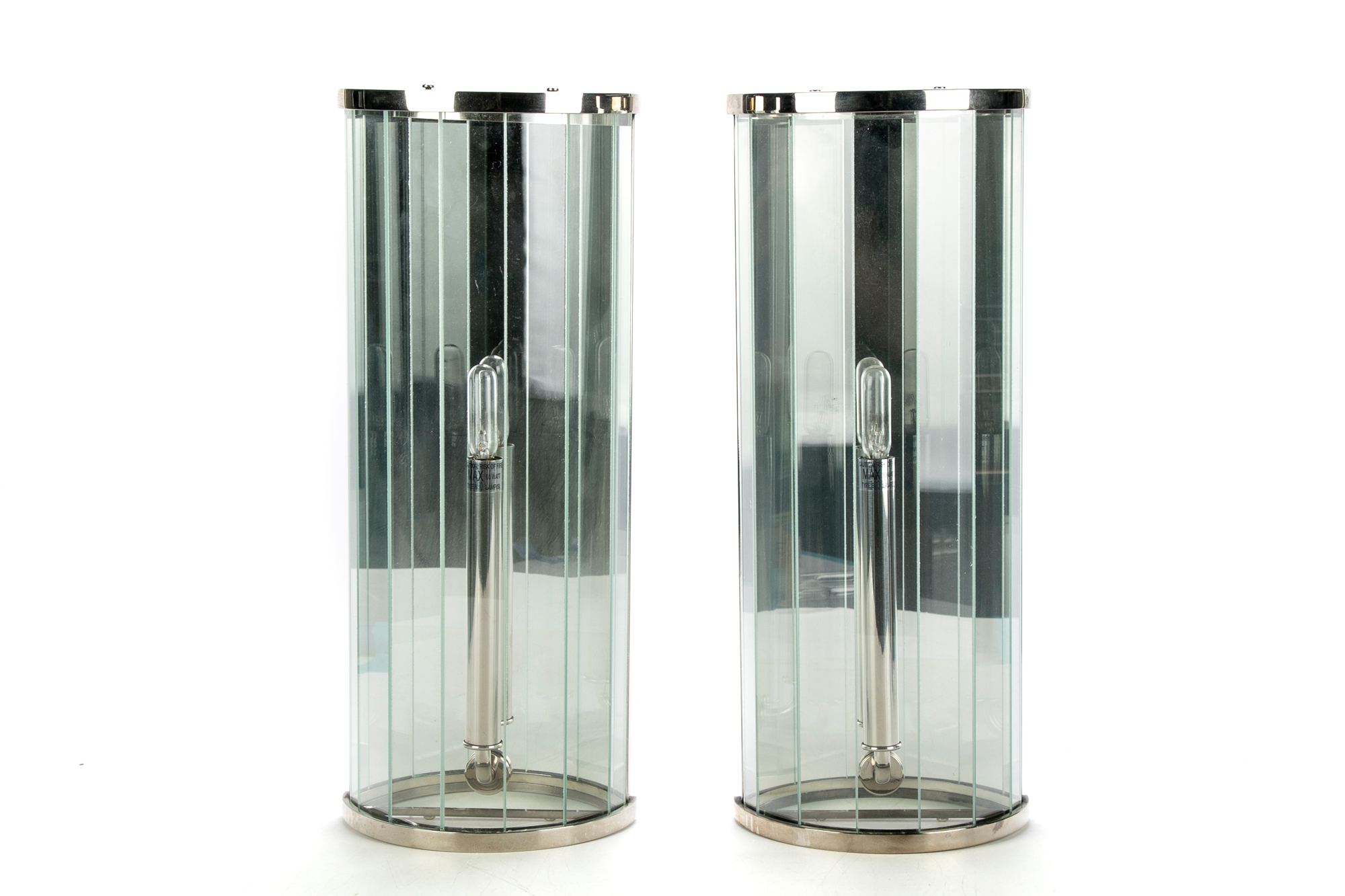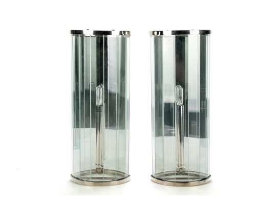 Pair of chrome, glass and mirror wall sconces. The wall sconces with interior faceted mirror, the domed exterior with clear glass strips that present as faceted glass. Each take one light.