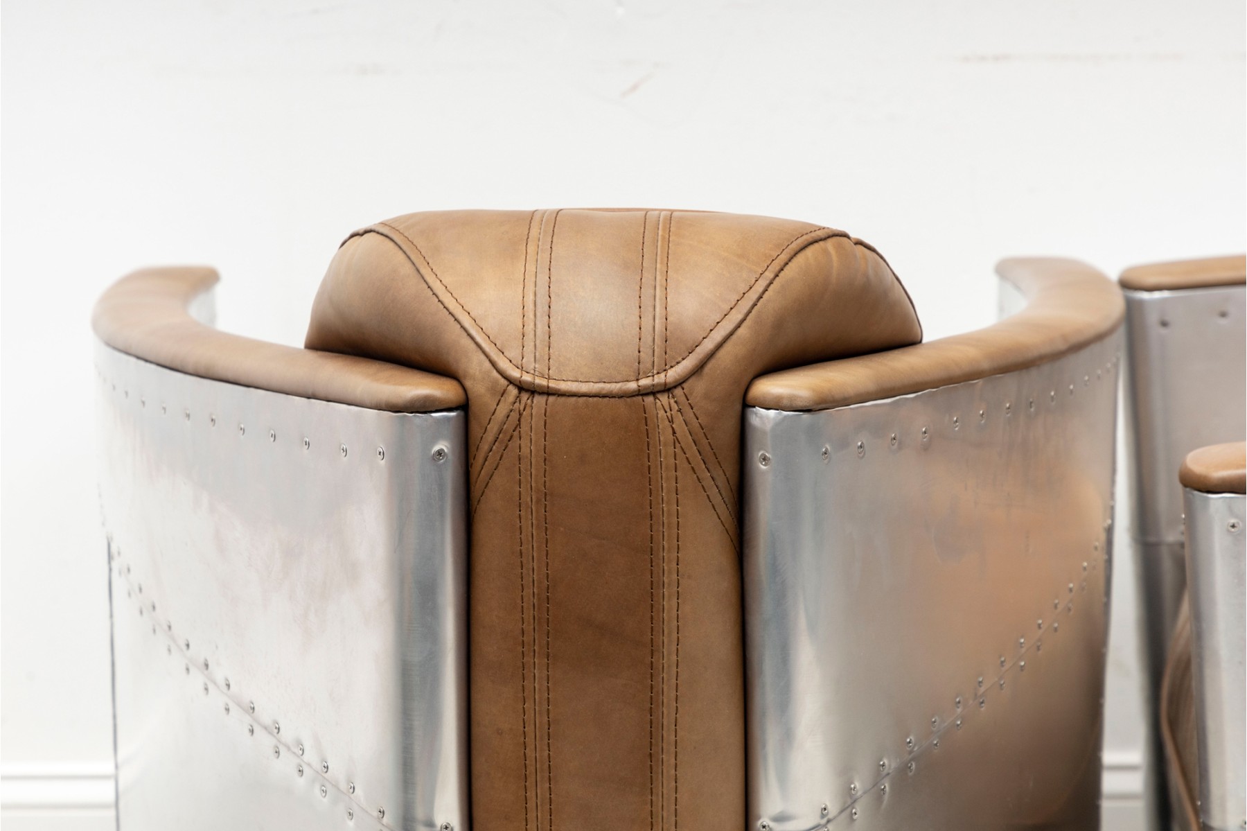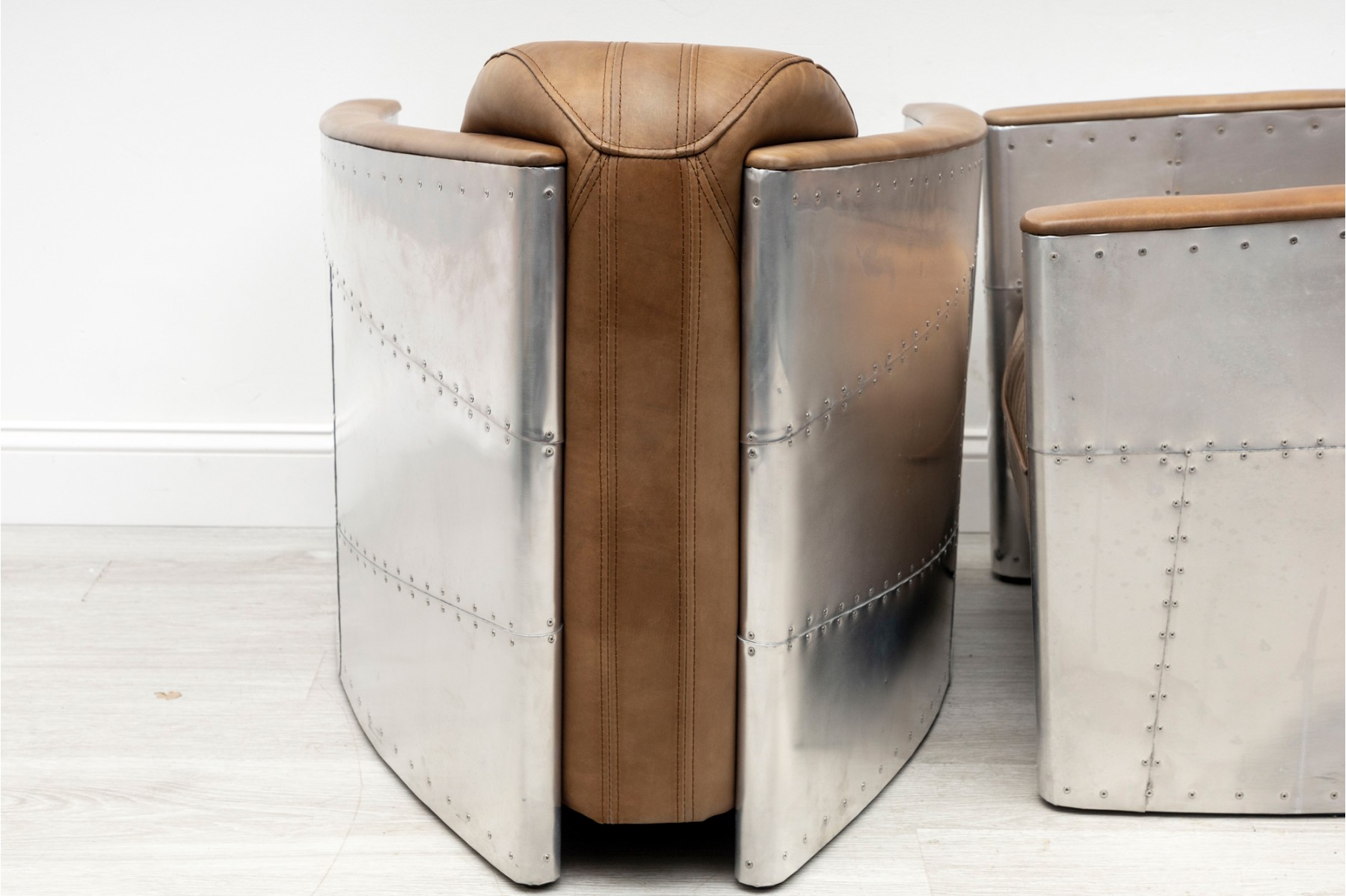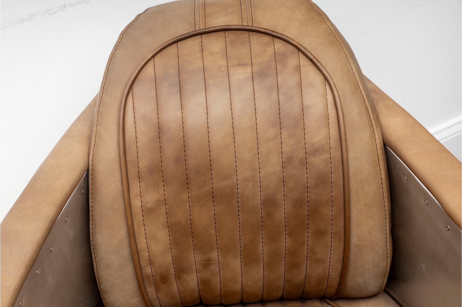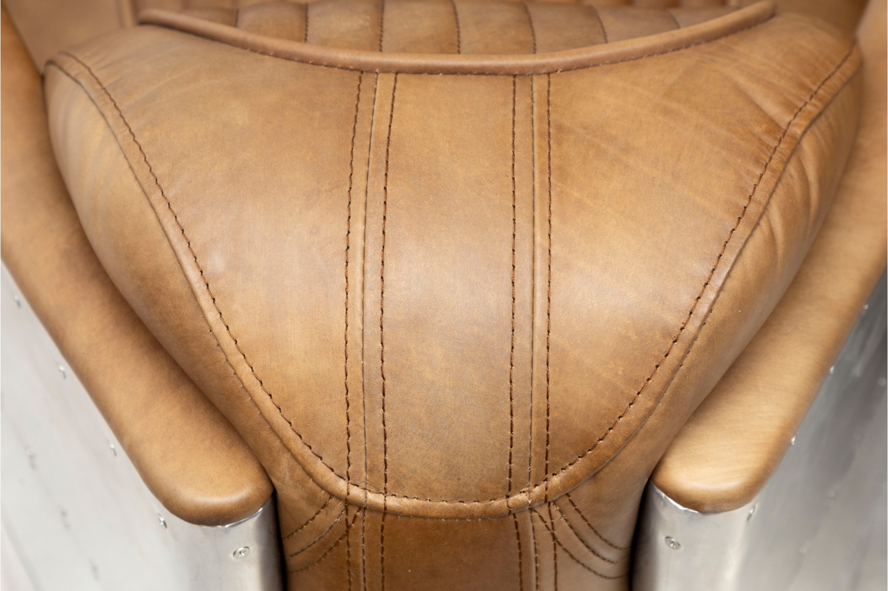 Inspired by World War II fighter planes, our chair's aerodynamic curves are hugged in aluminum accented with exposed steel screws, the seat swathed in leather with the softness of a vintage bomber jacket. A low seat and raked back give it a genuine fighter pilot feel when lounging.