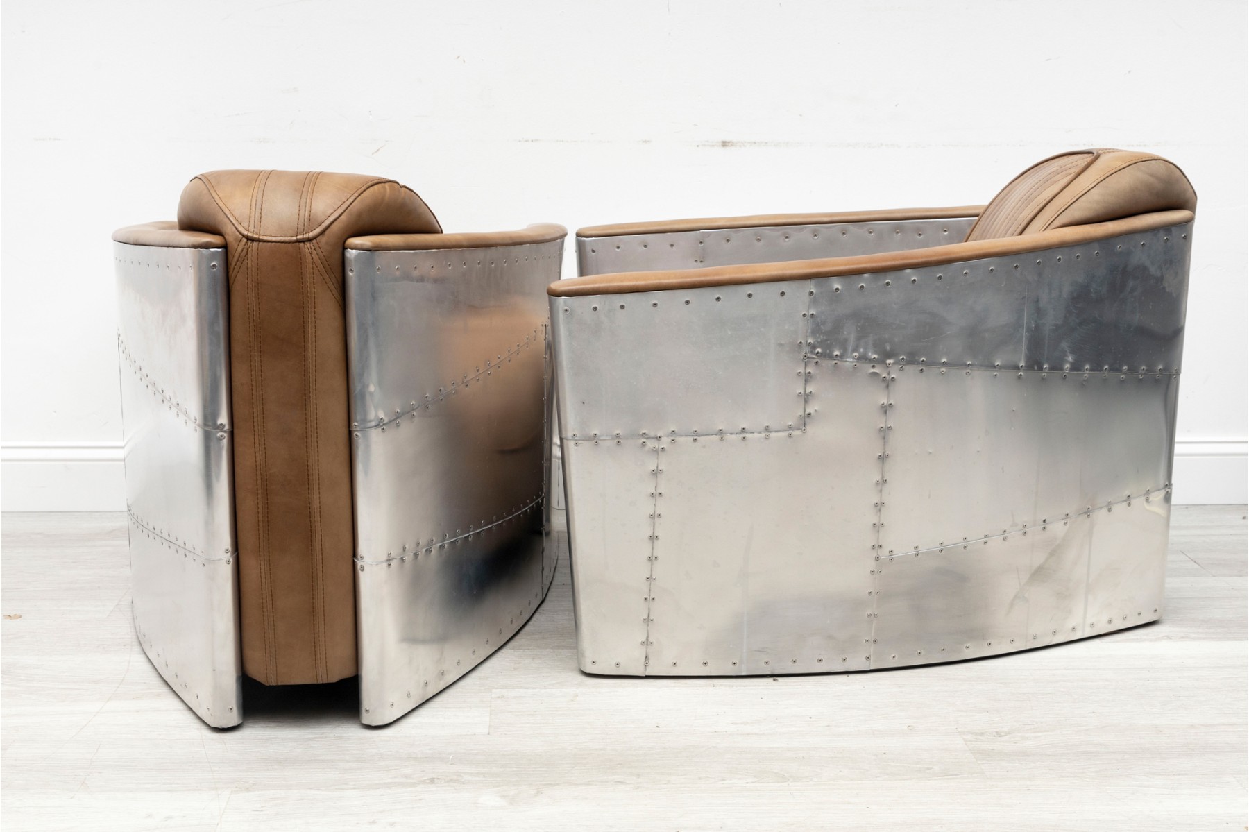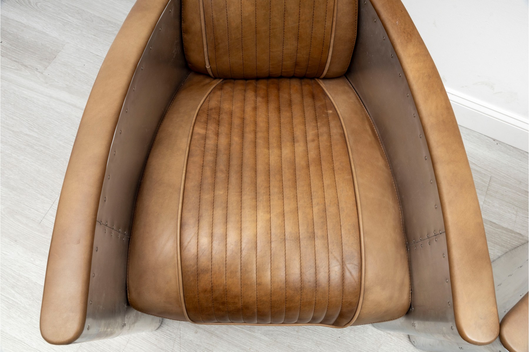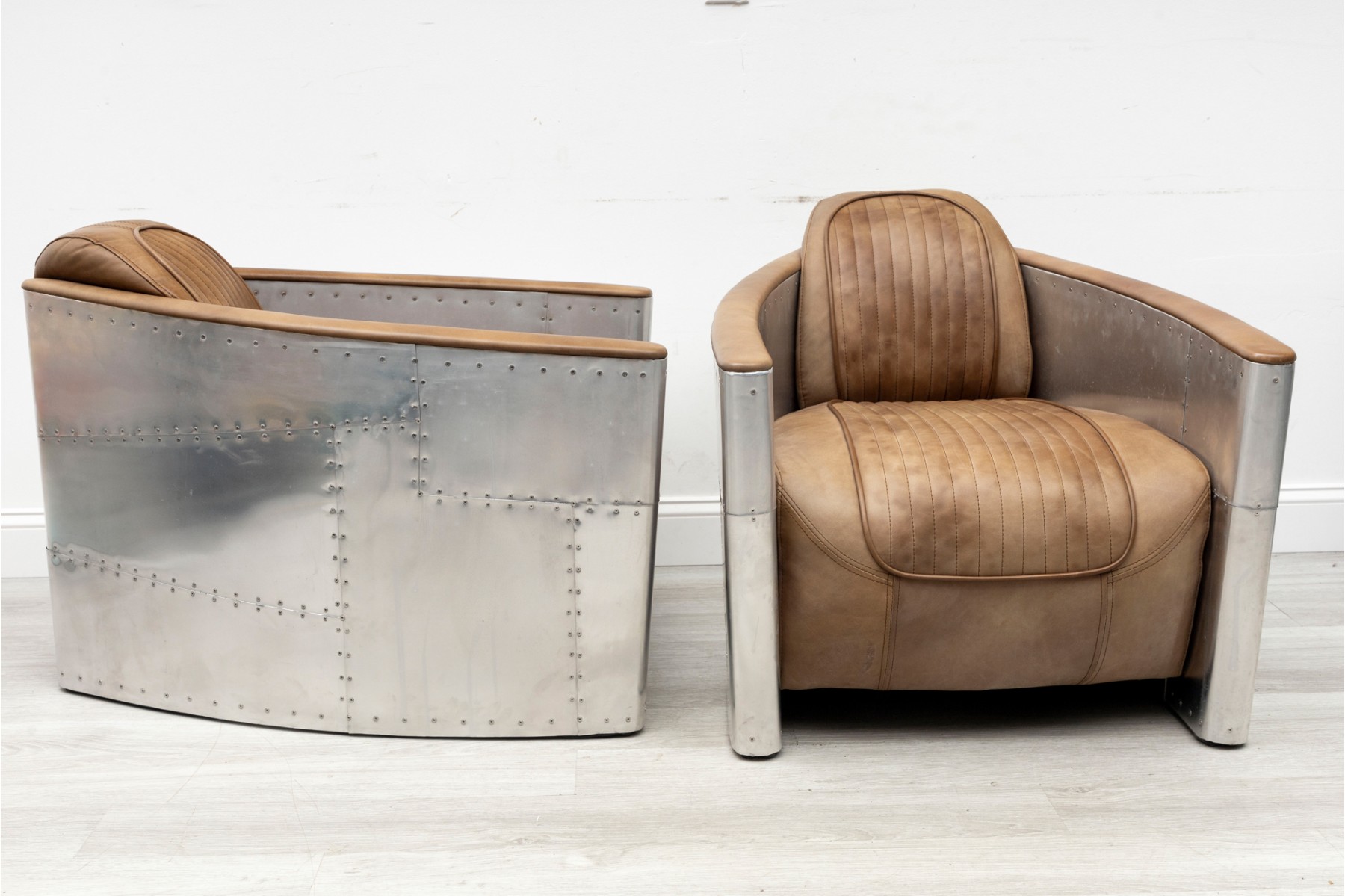 Inspired by World War II fighter planes, our chair's aerodynamic curves are hugged in aluminum accented with exposed steel screws, the seat swathed in leather with the softness of a vintage bomber jacket. A low seat and raked back give it a genuine fighter pilot feel when lounging.