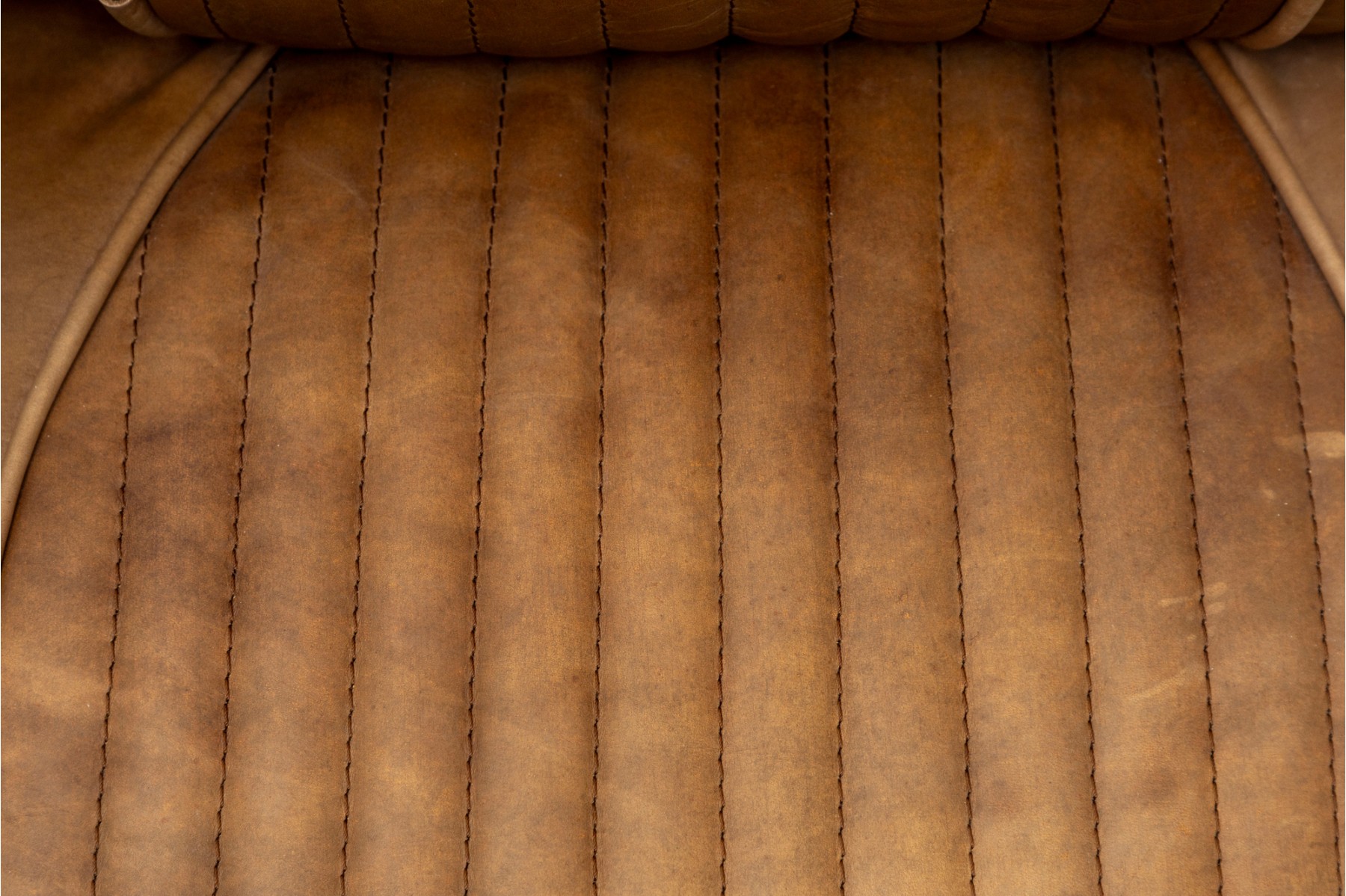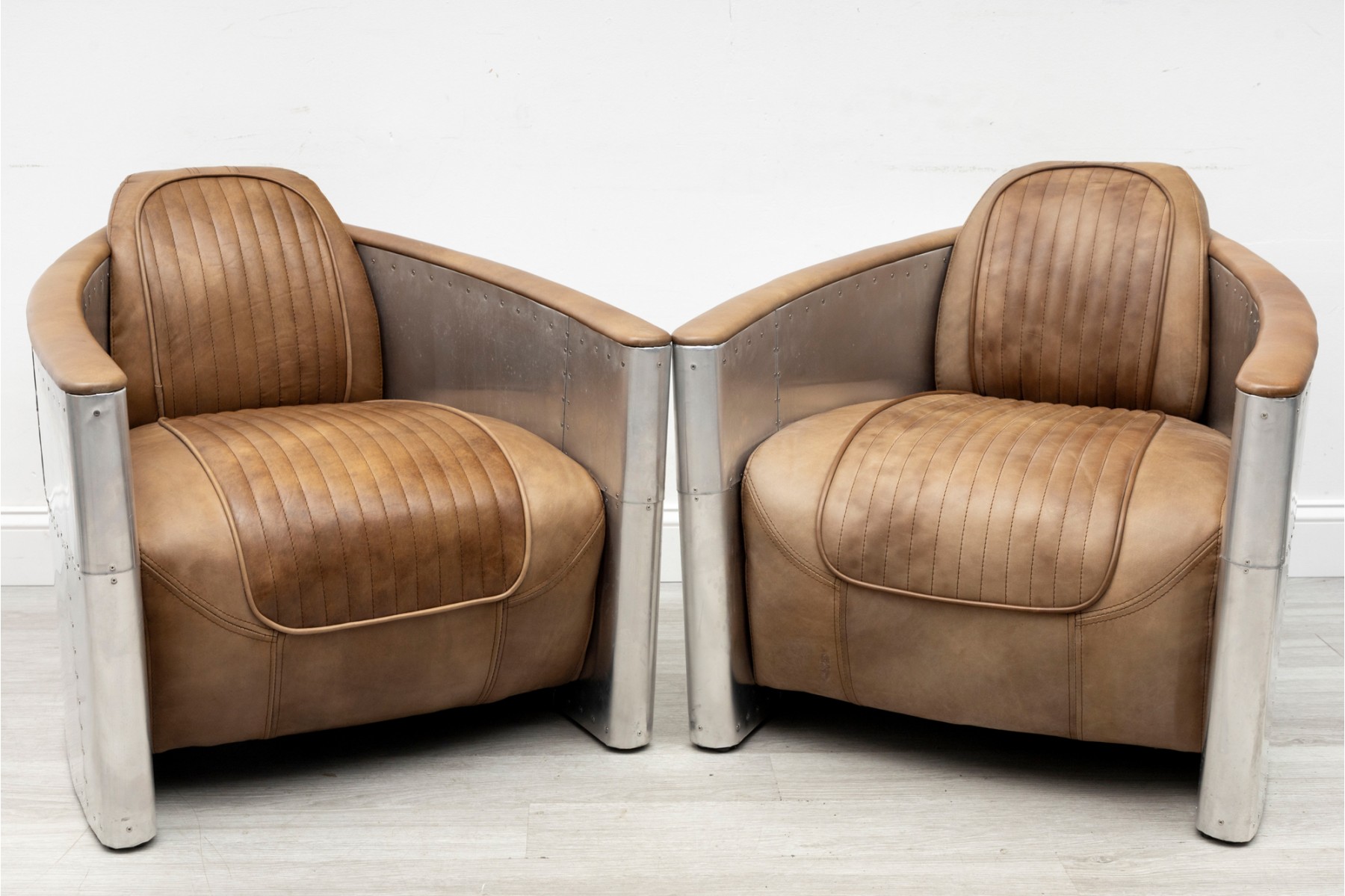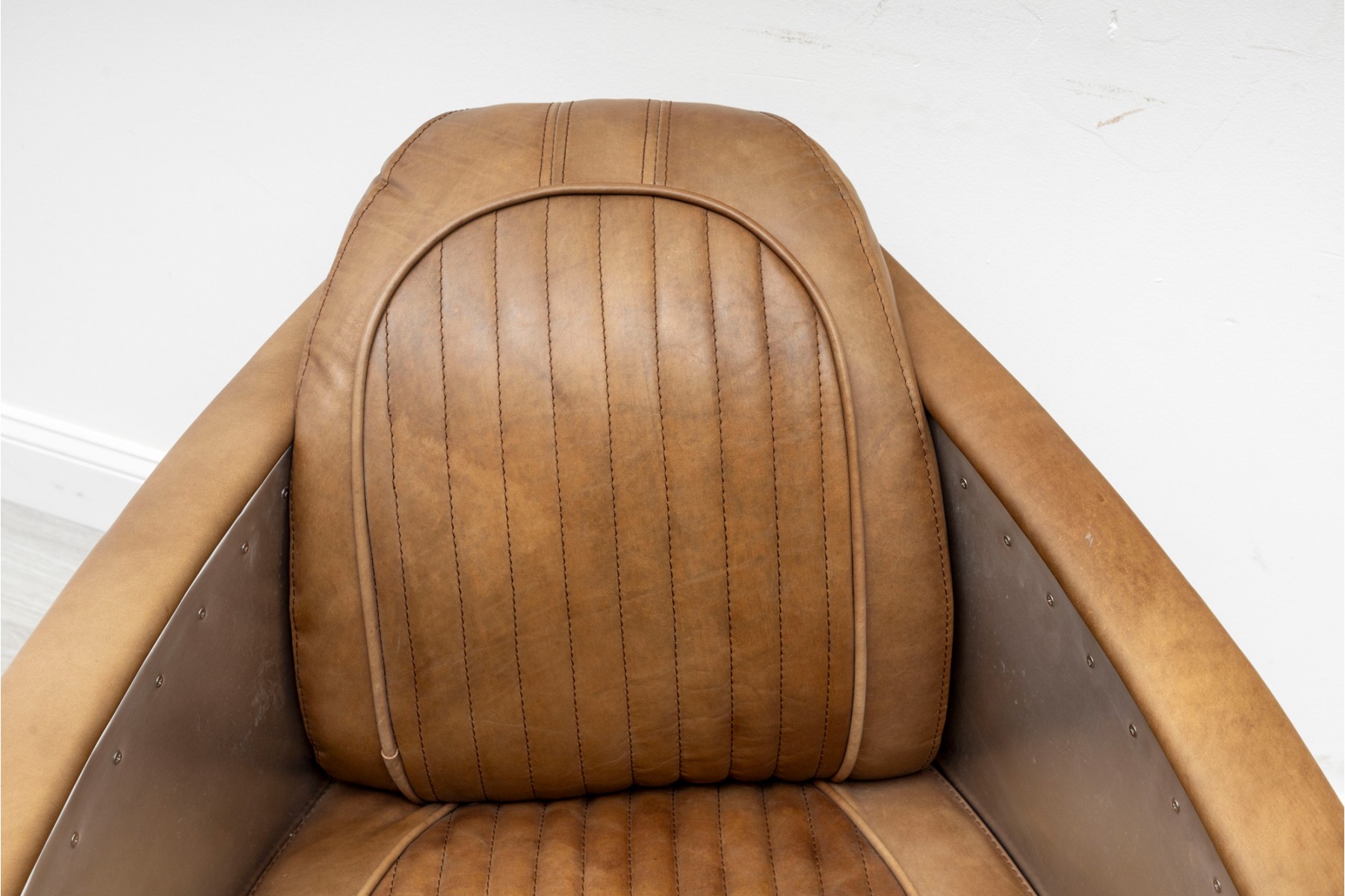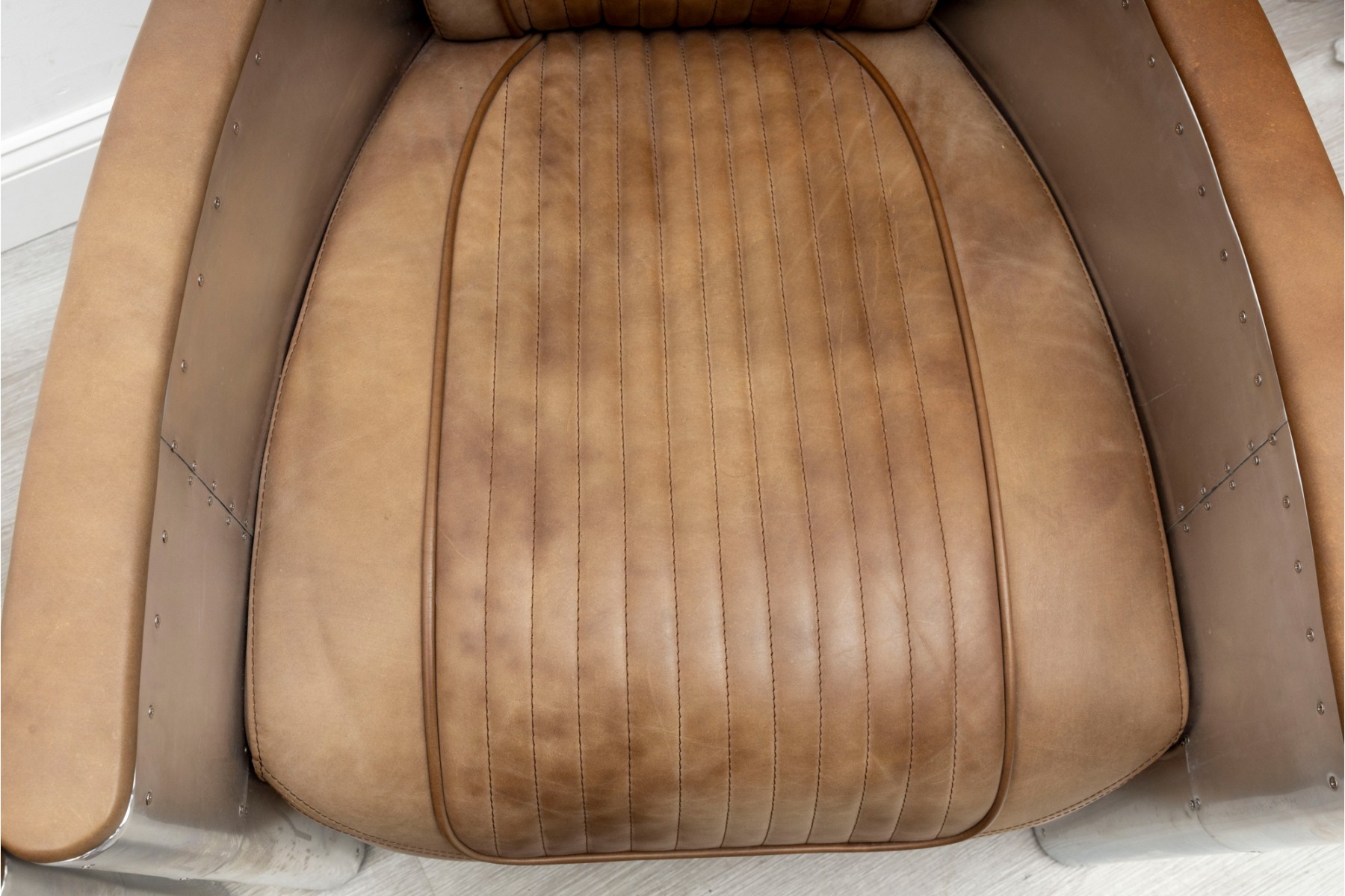 Inspired by World War II fighter planes, our chair's aerodynamic curves are hugged in aluminum accented with exposed steel screws, the seat swathed in leather with the softness of a vintage bomber jacket. A low seat and raked back give it a genuine fighter pilot feel when lounging.