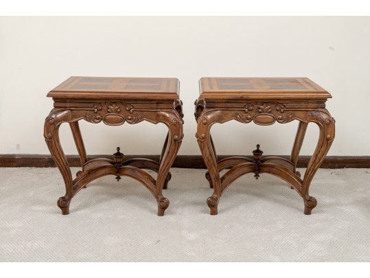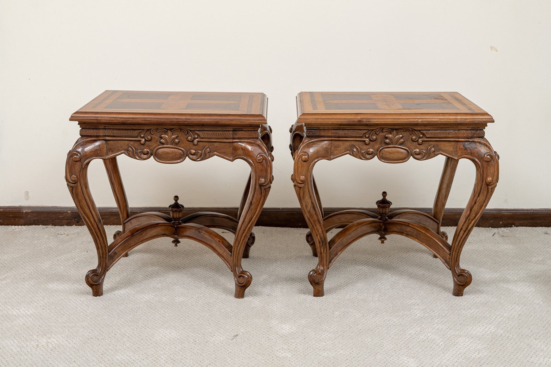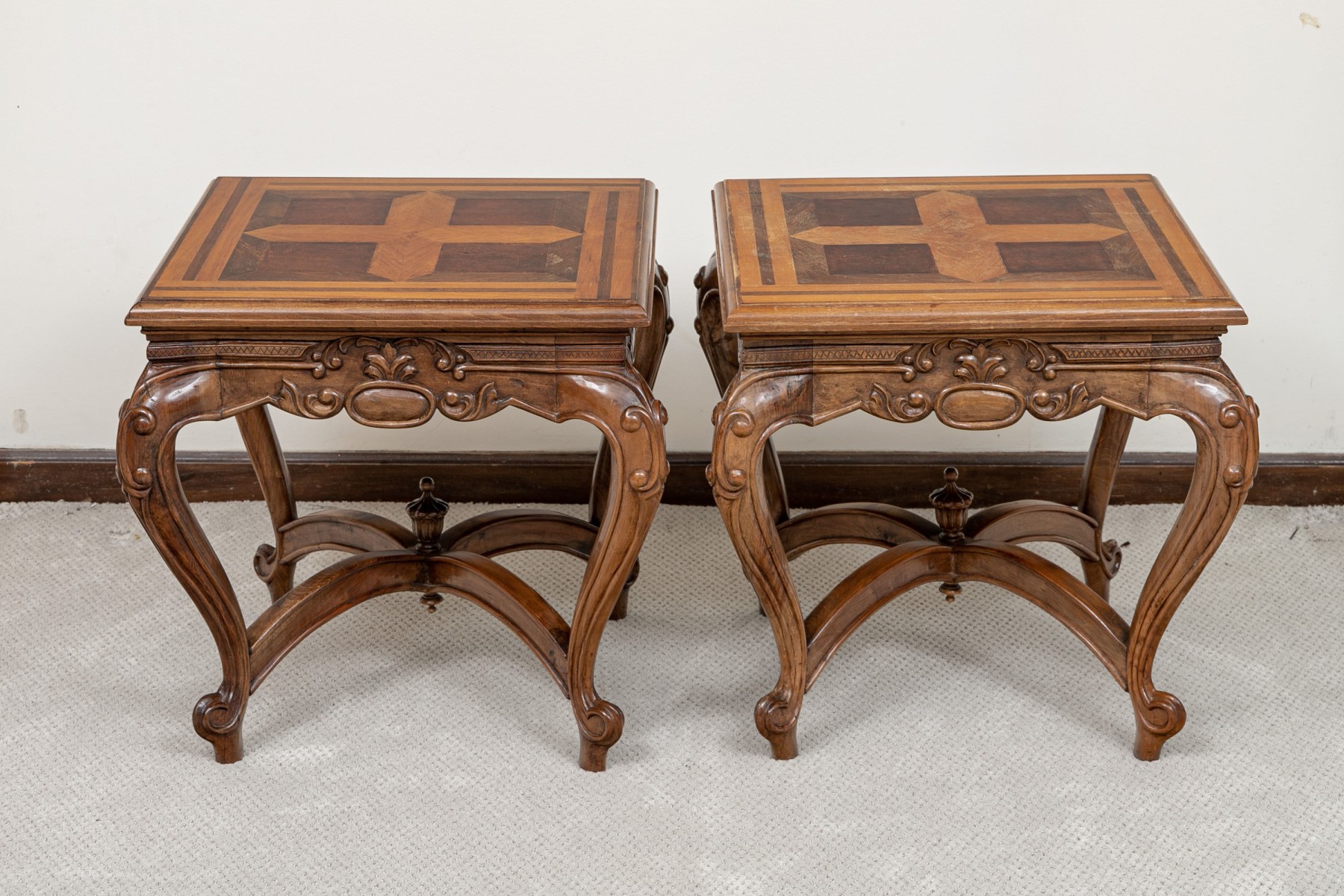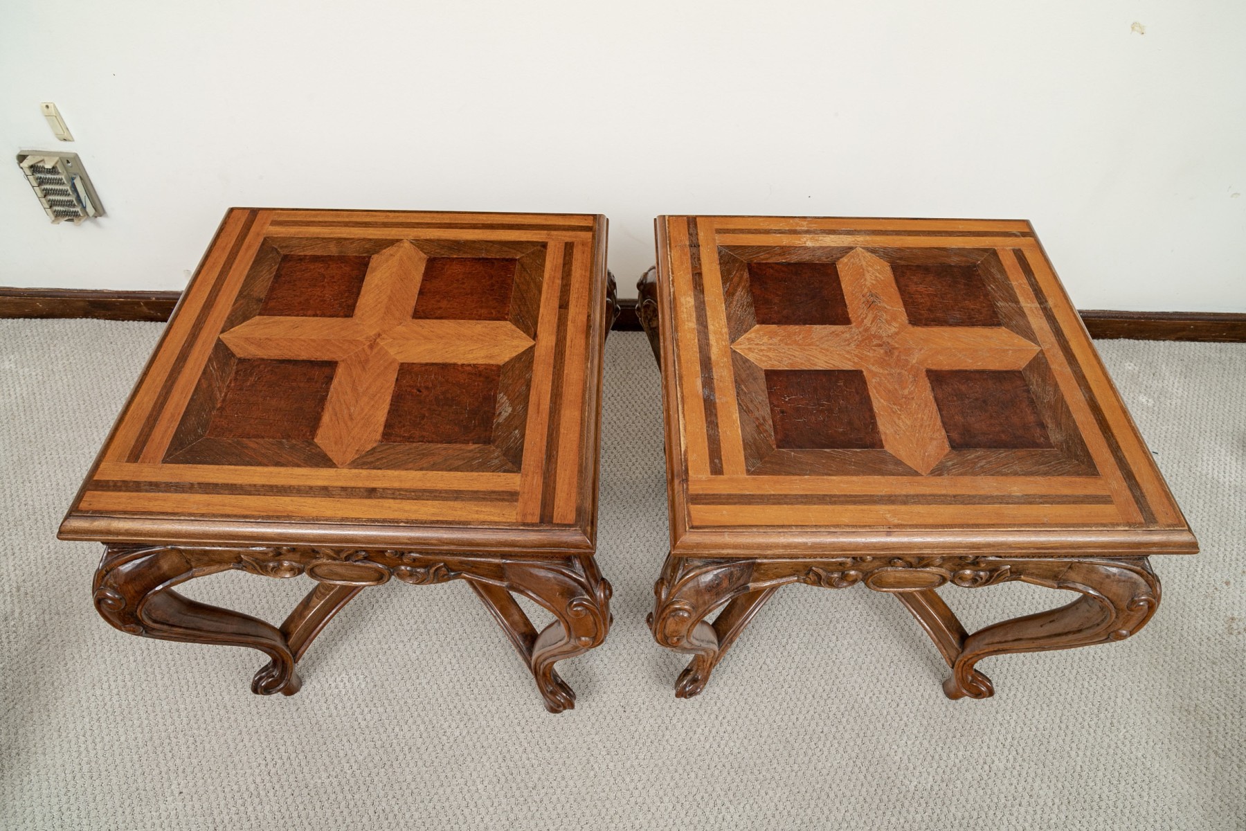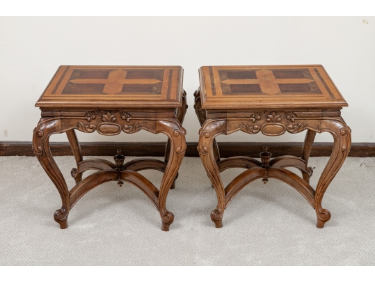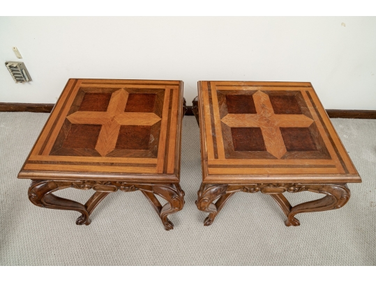 Table pair with inlaid geometric pattern contrasting wood tops. Very well-made with bold carved cabriolet legs, vonvex X form base stretcher with center urn finial and handsome carved aprons.