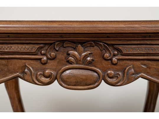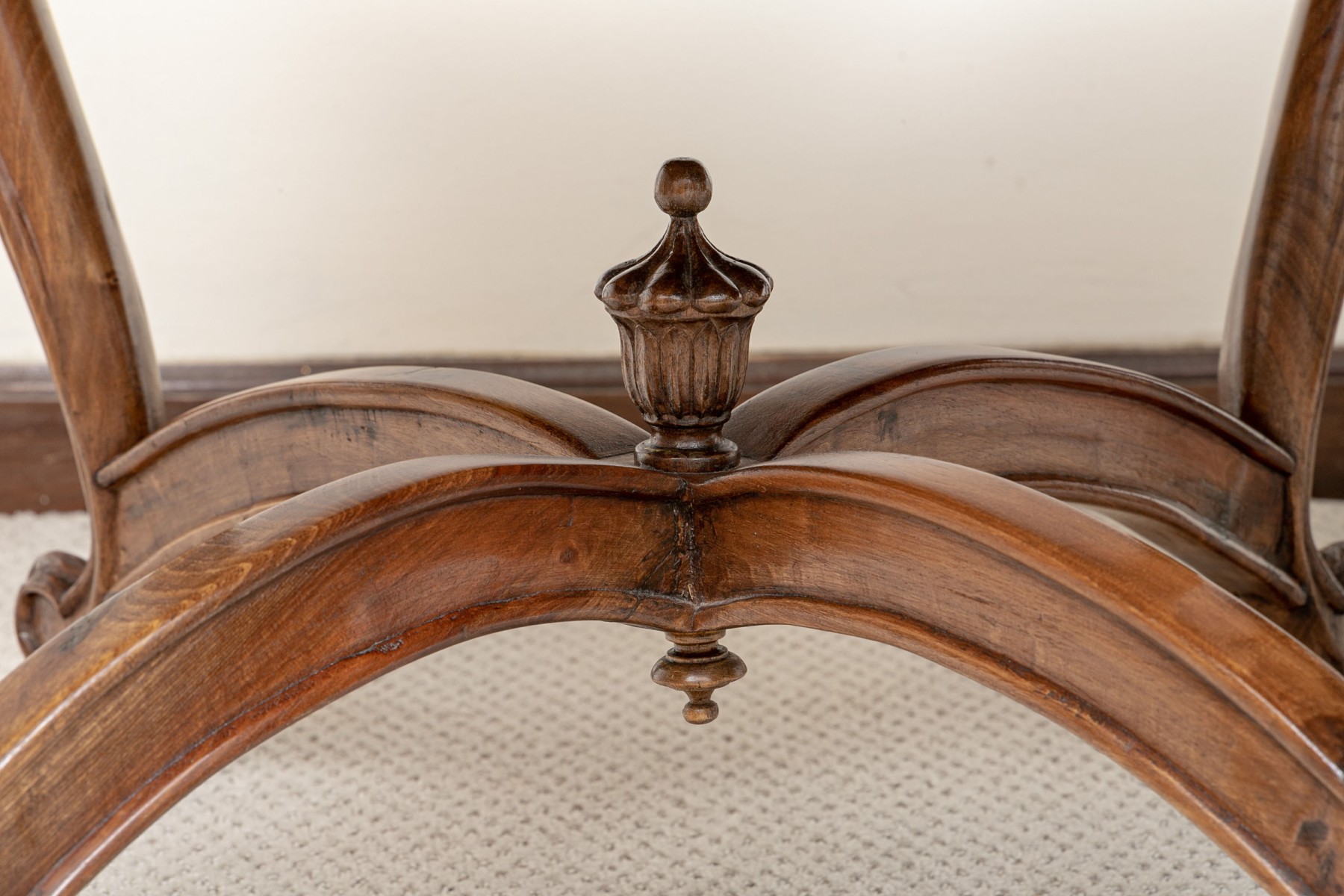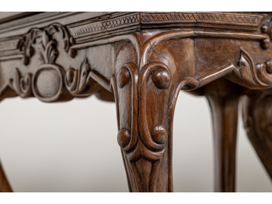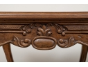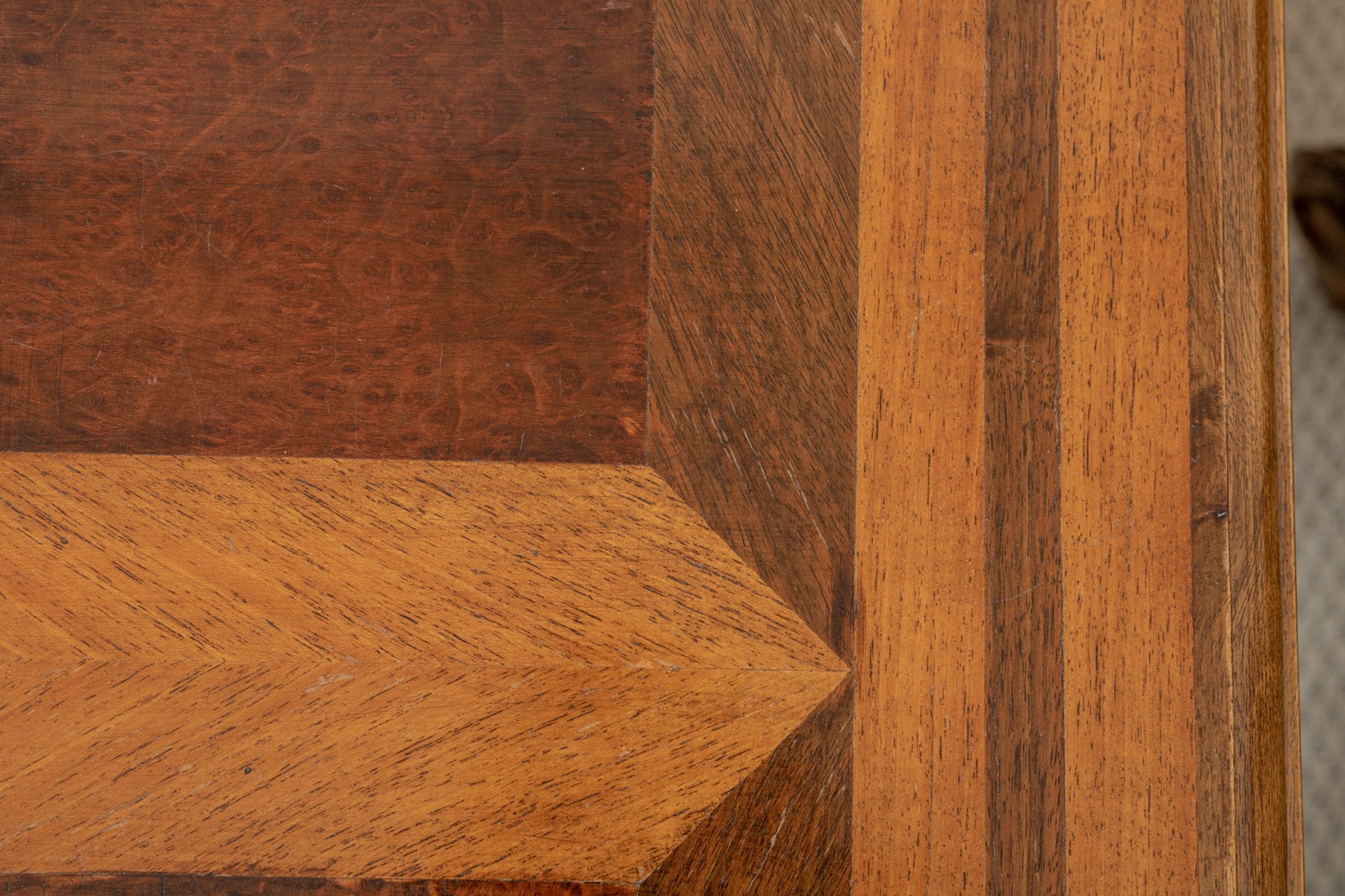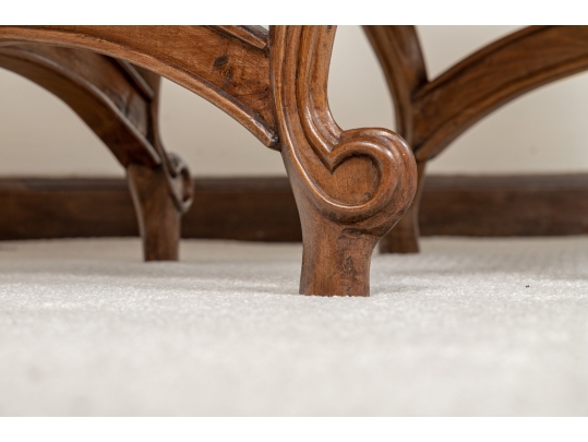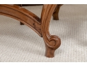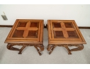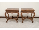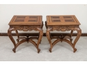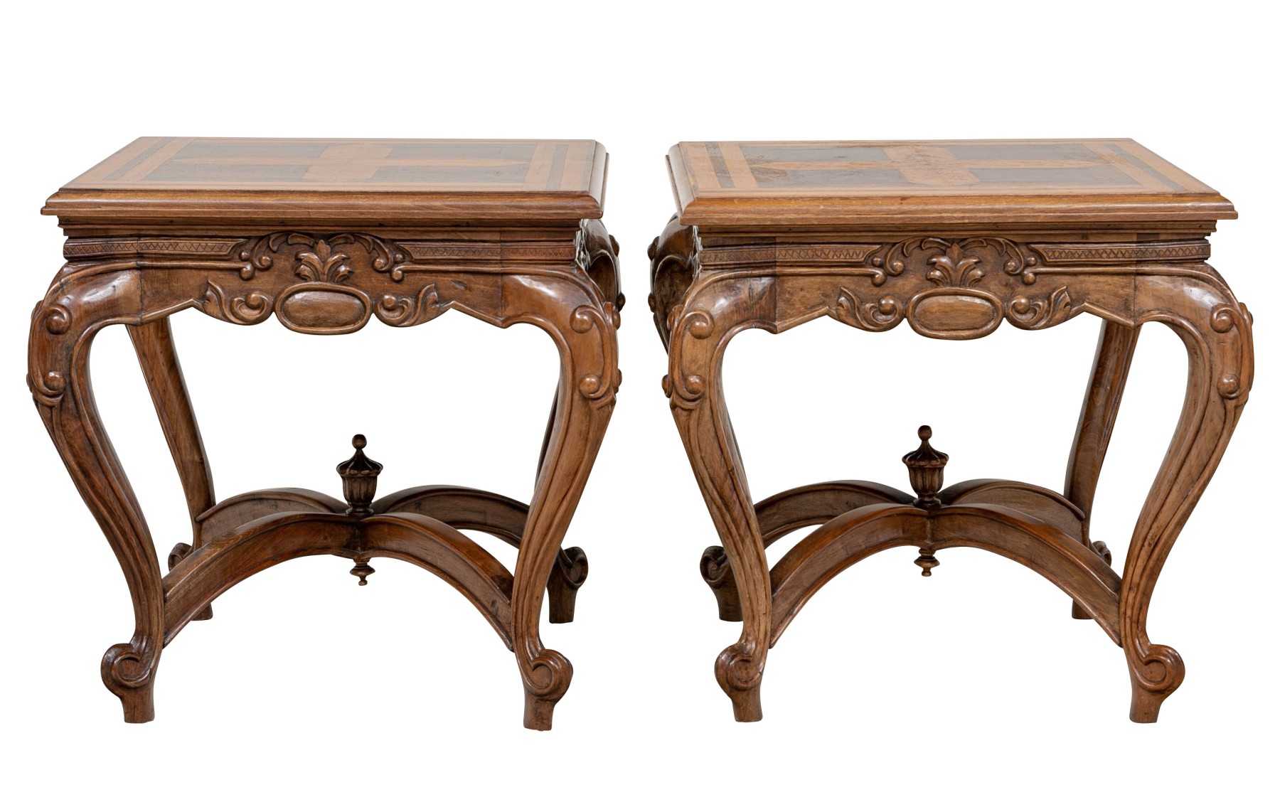 Table pair with inlaid geometric pattern contrasting wood tops. Very well-made with bold carved cabriolet legs, vonvex X form base stretcher with center urn finial and handsome carved aprons.