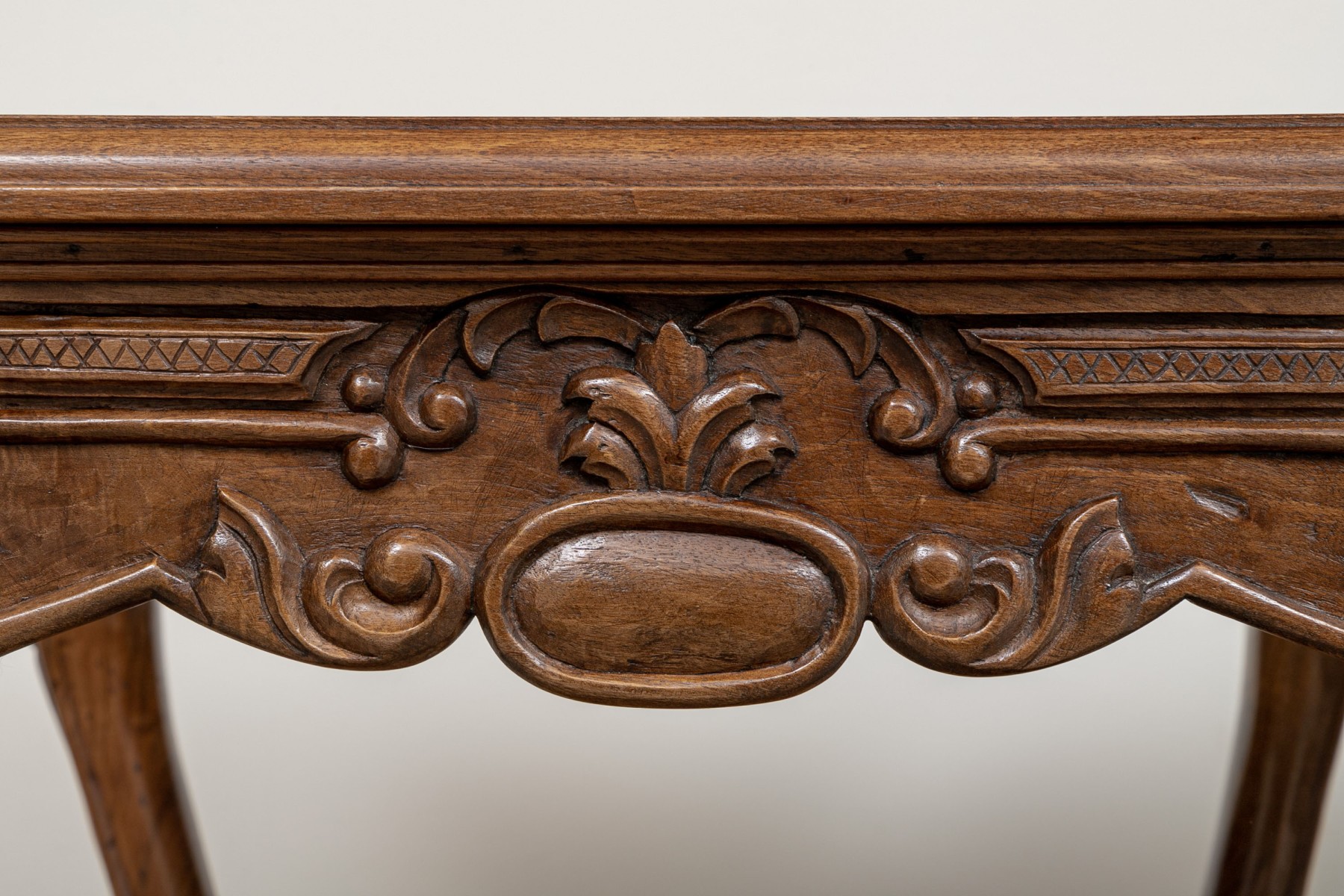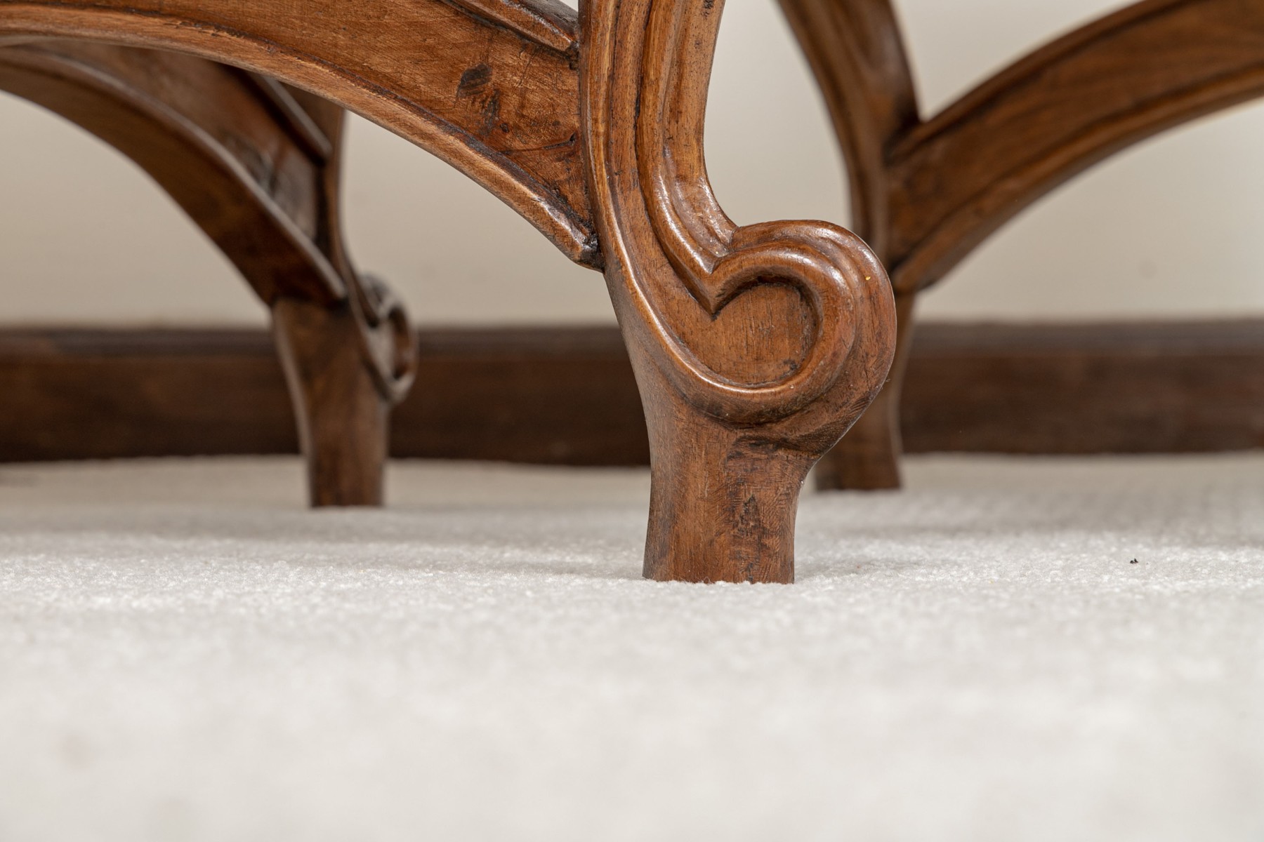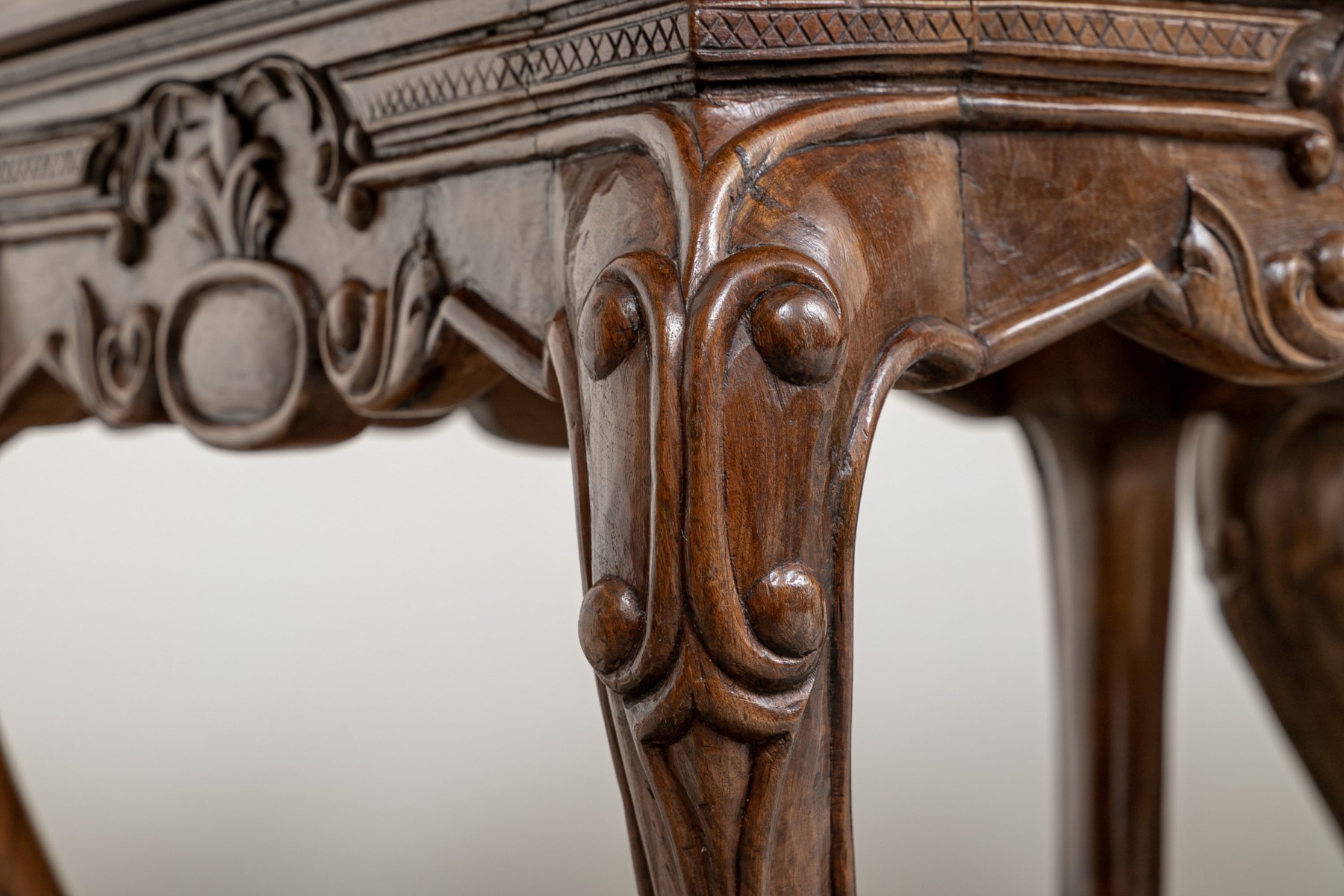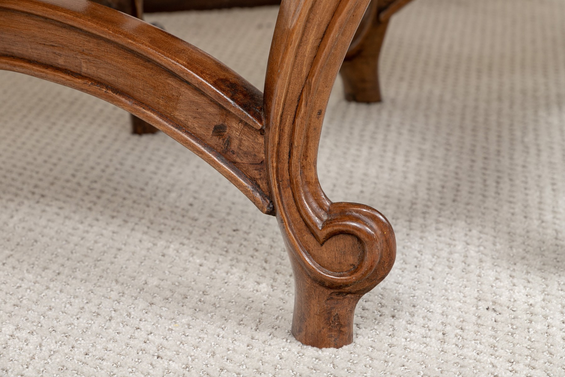 Table pair with inlaid geometric pattern contrasting wood tops. Very well-made with bold carved cabriolet legs, vonvex X form base stretcher with center urn finial and handsome carved aprons.
