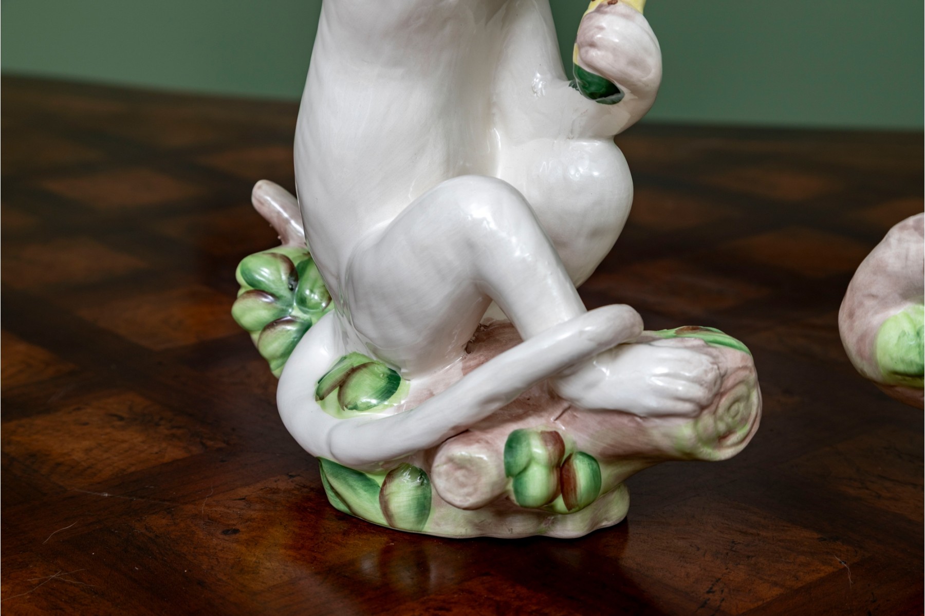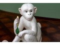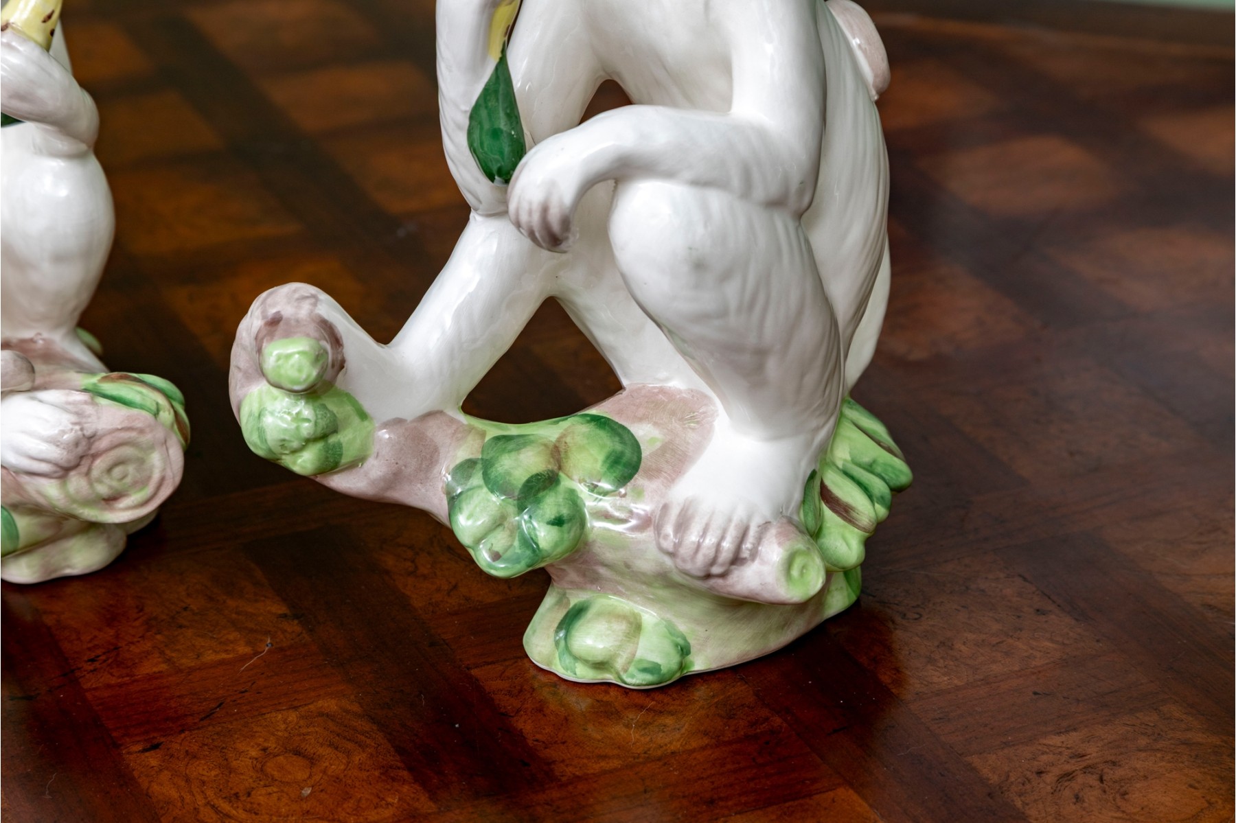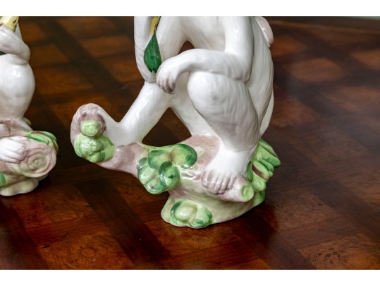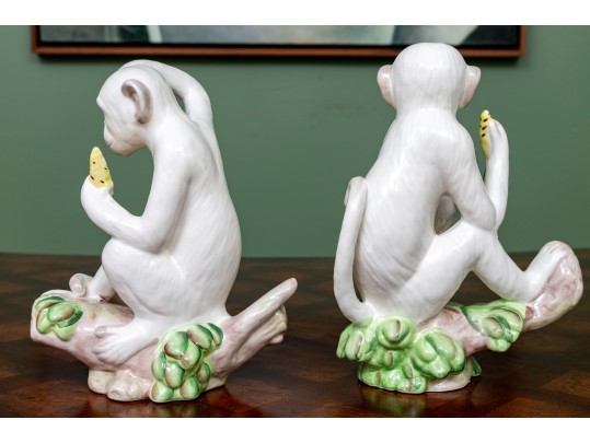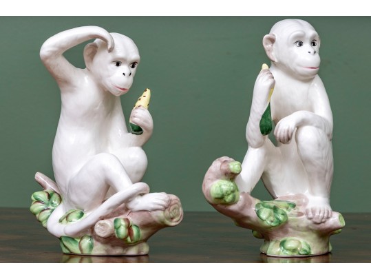 A pair of coordinating Katherine Young Home ceramic albino monkey figures, featuring a sleek white glazed finish with finely sculpted details. These whimsical yet elegant pieces showcase expressive poses and a modern aesthetic, making them a unique decorative accent.