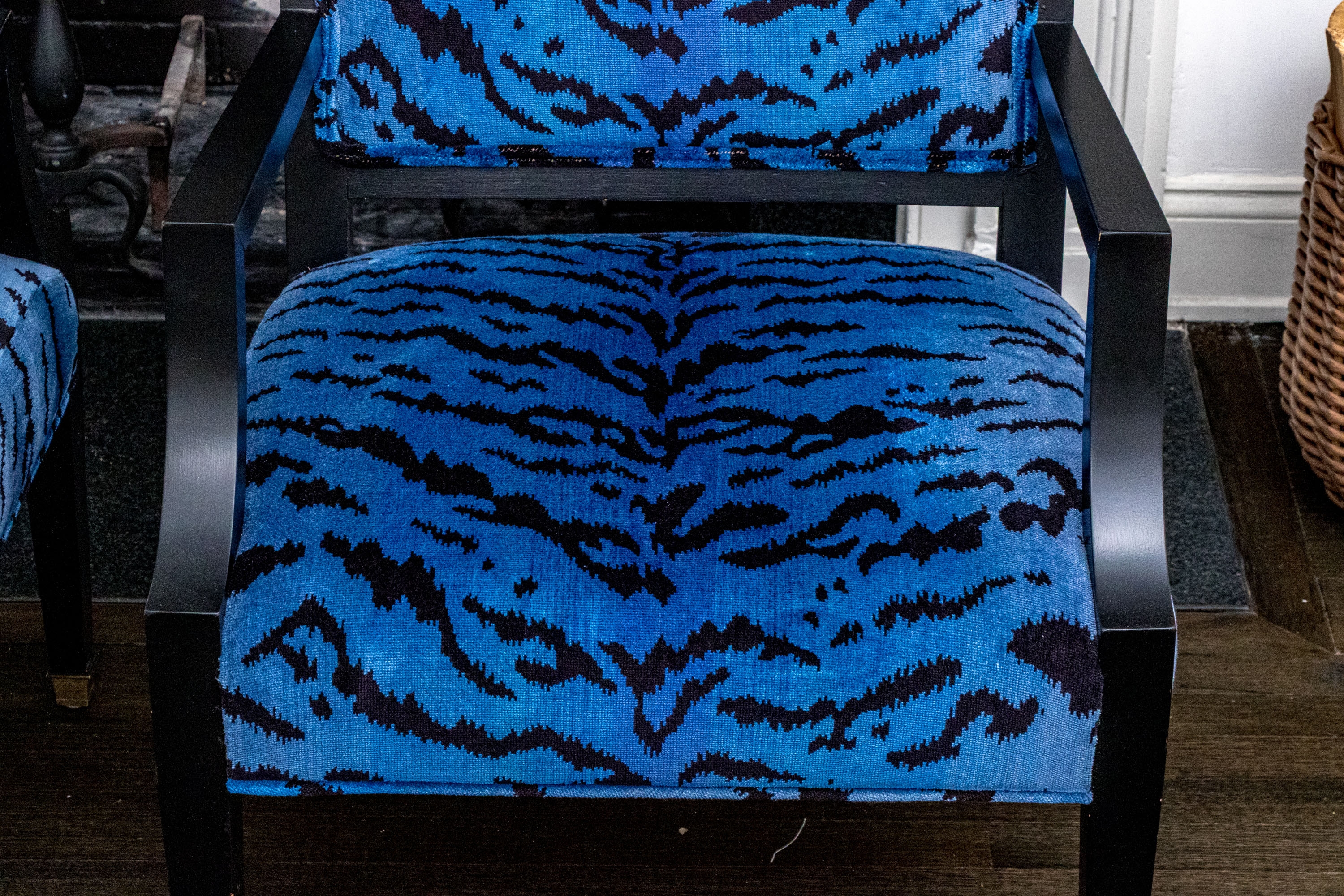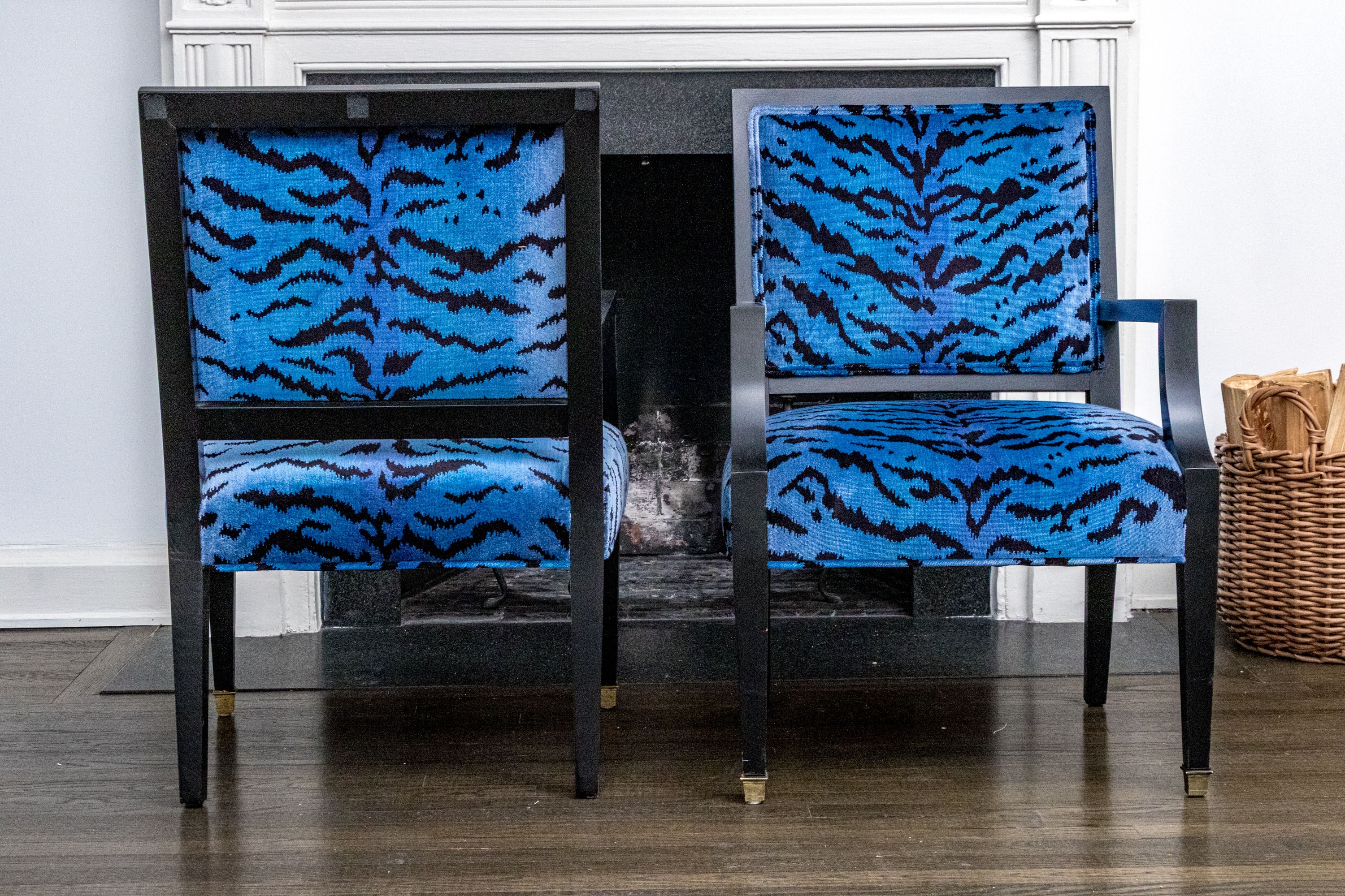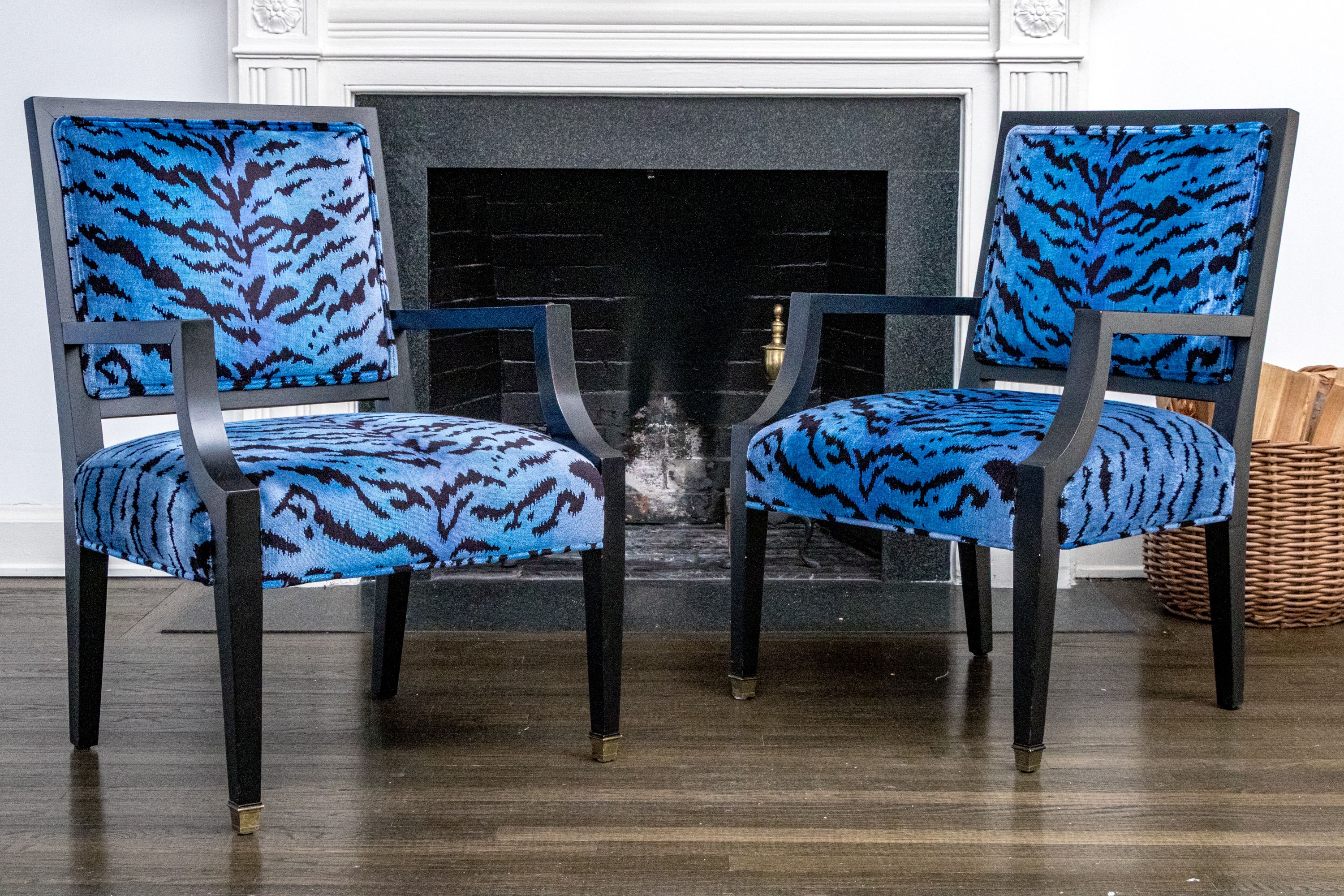 A fabulous pair of Brunschwig & Fils armchairs raised on four square tapered legs with front legs terminating in brass toe caps. Each chair has black frames with custom blue ground tiger striped silk and velvet upholstery detailed with purple streaks down the center seats and backs.