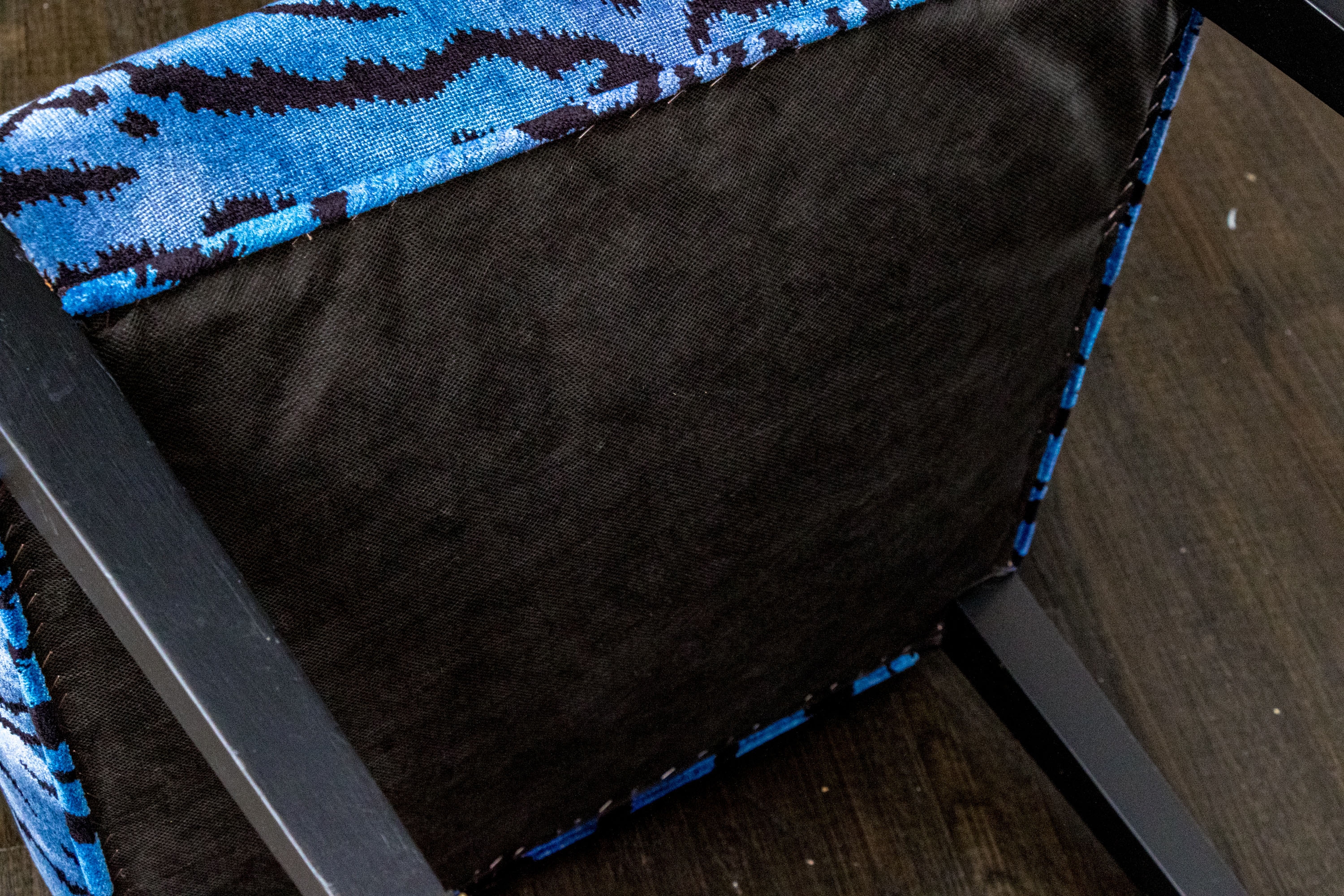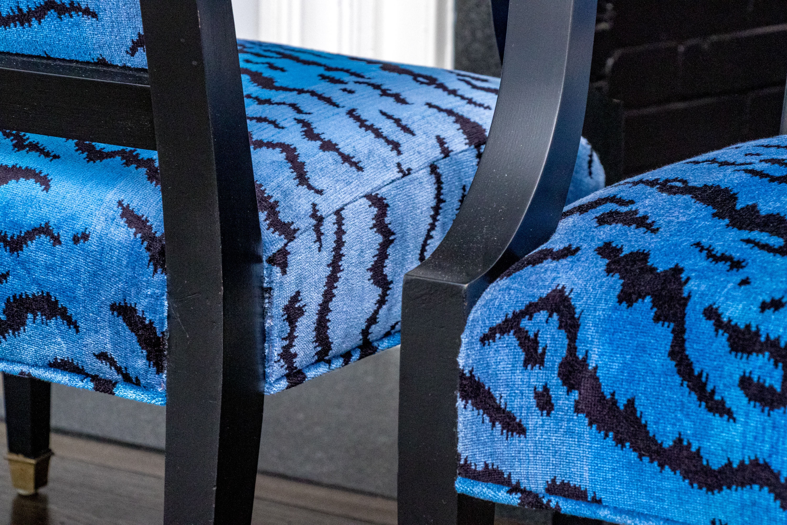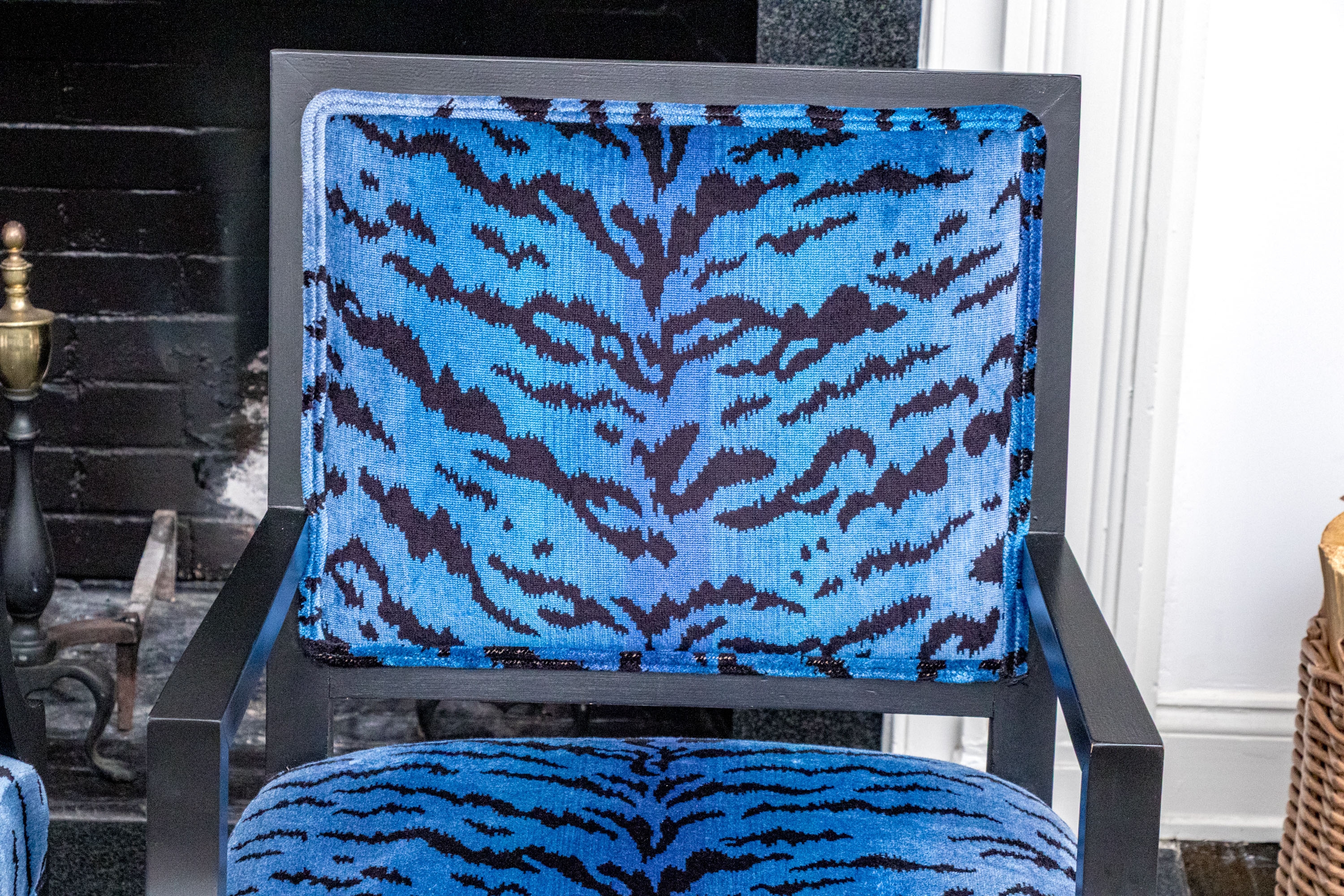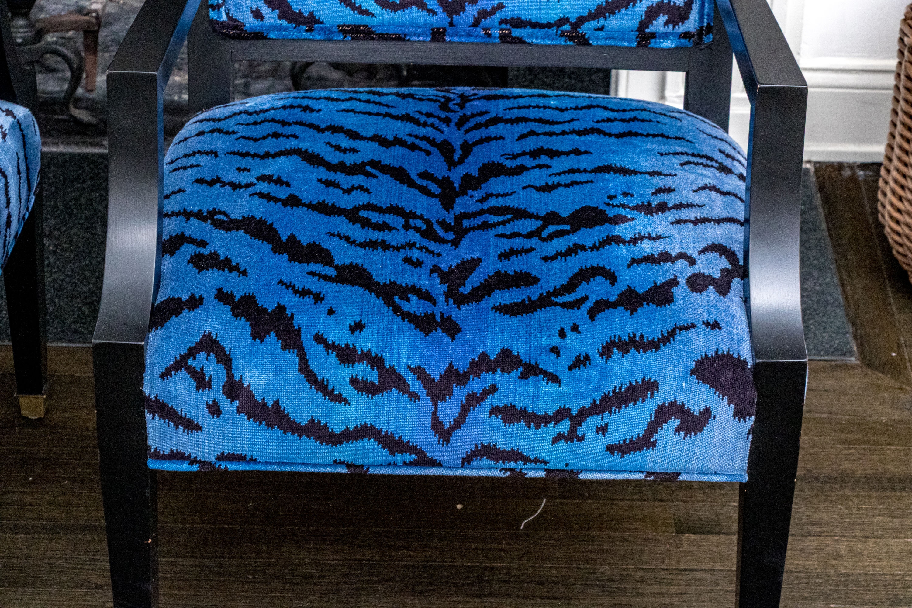 A fabulous pair of Brunschwig & Fils armchairs raised on four square tapered legs with front legs terminating in brass toe caps. Each chair has black frames with custom blue ground tiger striped silk and velvet upholstery detailed with purple streaks down the center seats and backs.