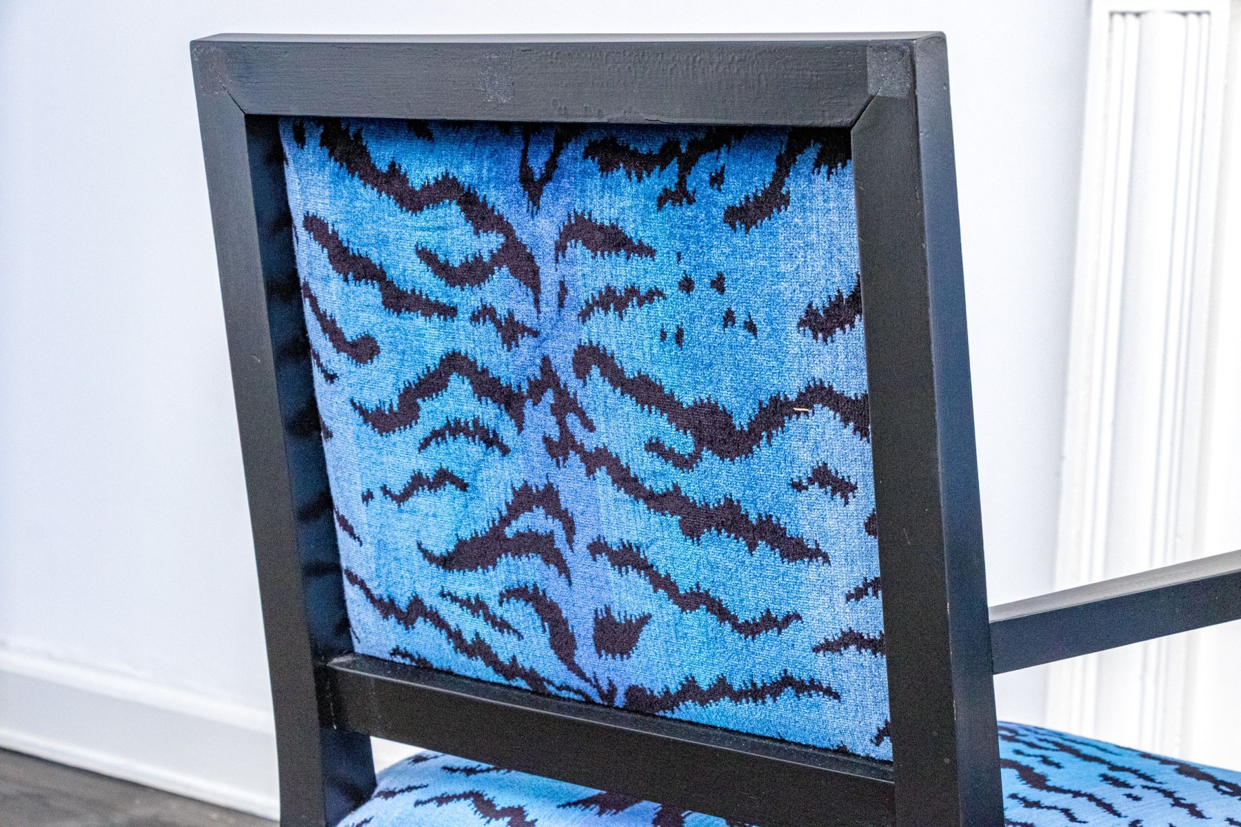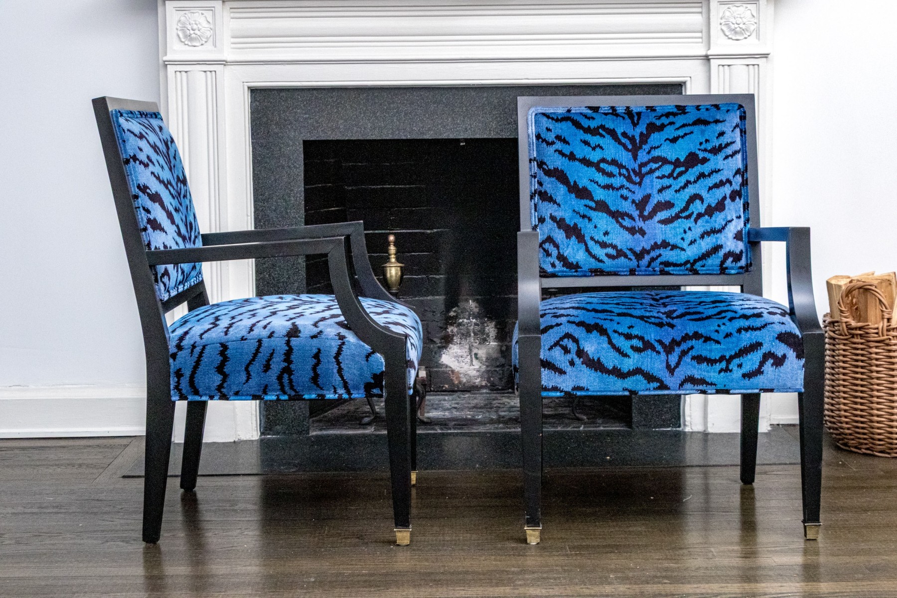 A fabulous pair of Brunschwig & Fils armchairs raised on four square tapered legs with front legs terminating in brass toe caps. Each chair has black frames with custom blue ground tiger striped silk and velvet upholstery detailed with purple streaks down the center seats and backs.
