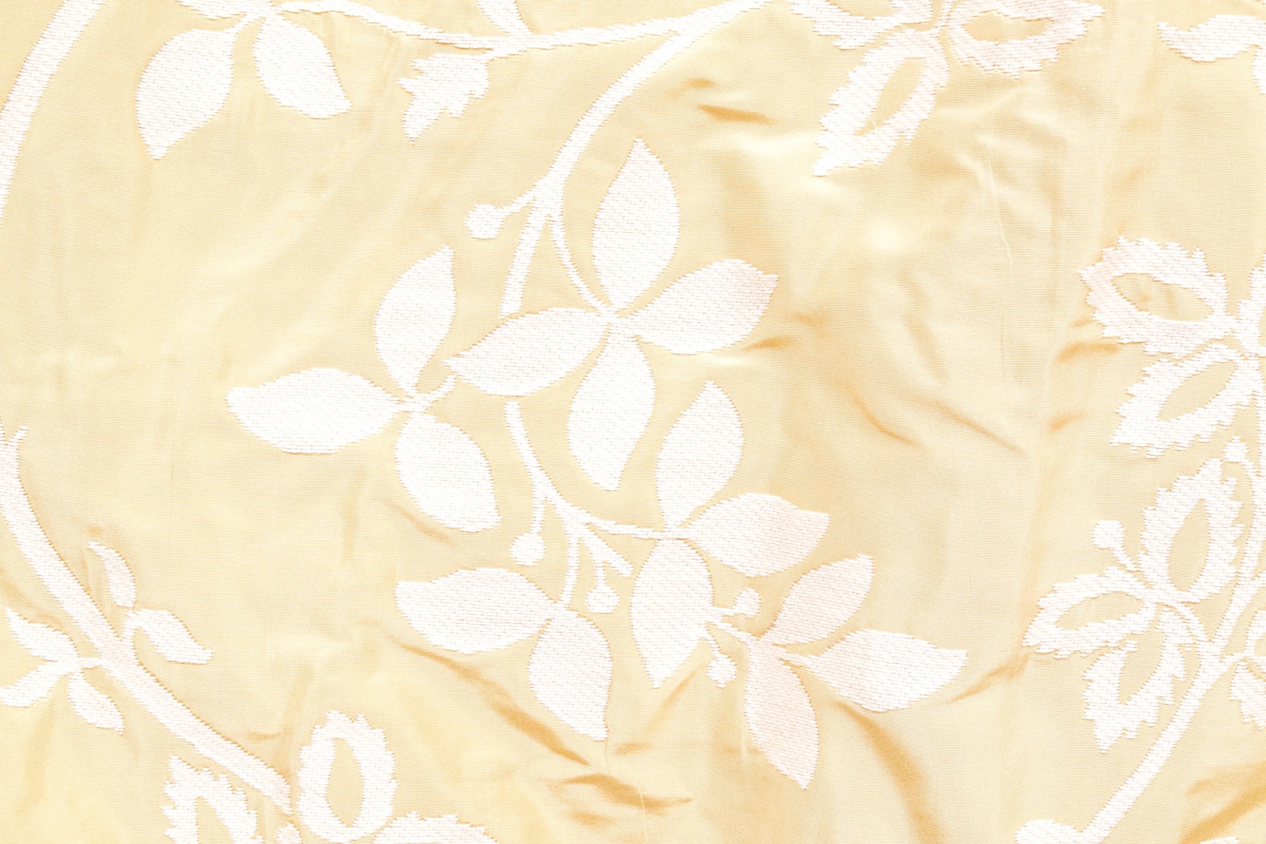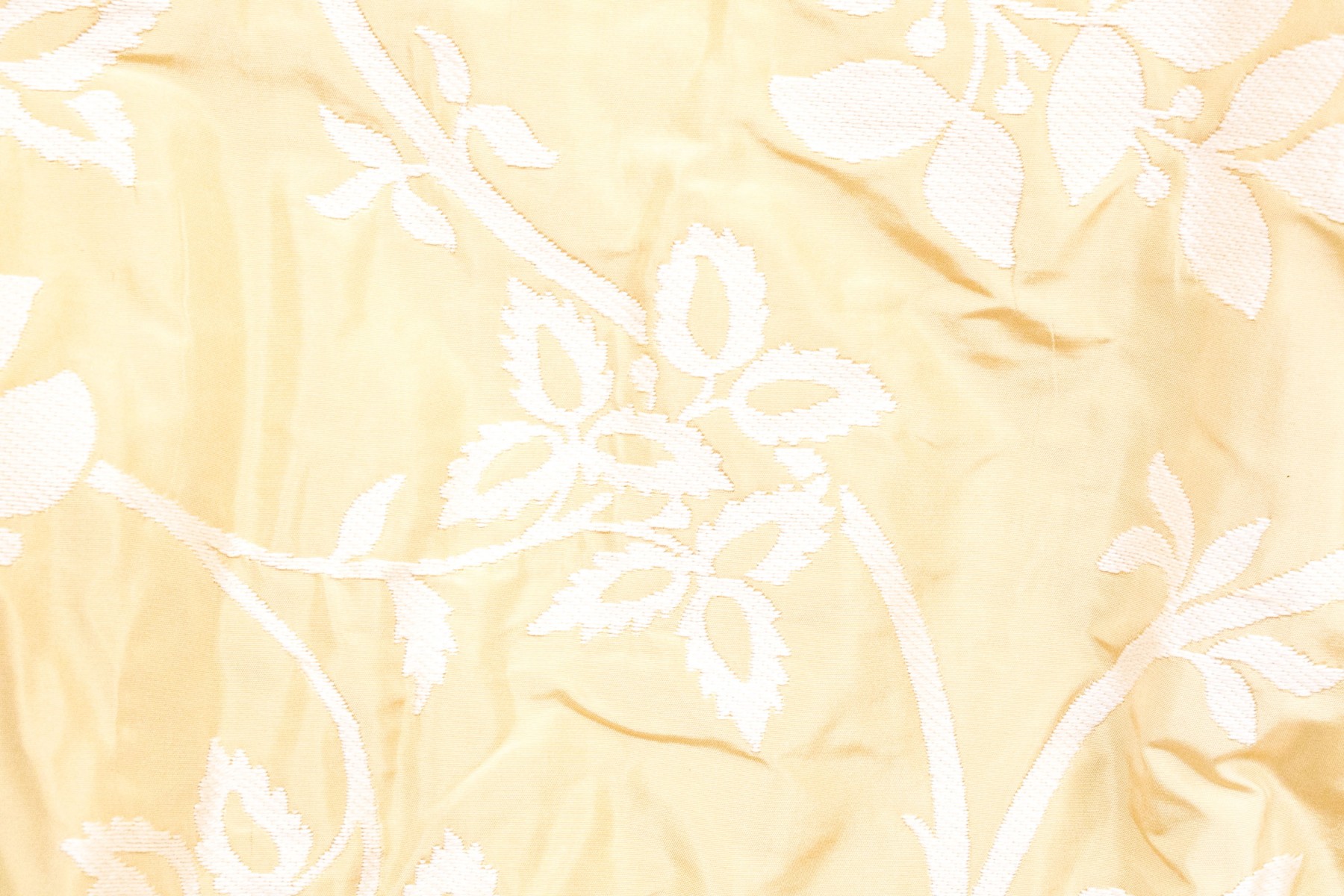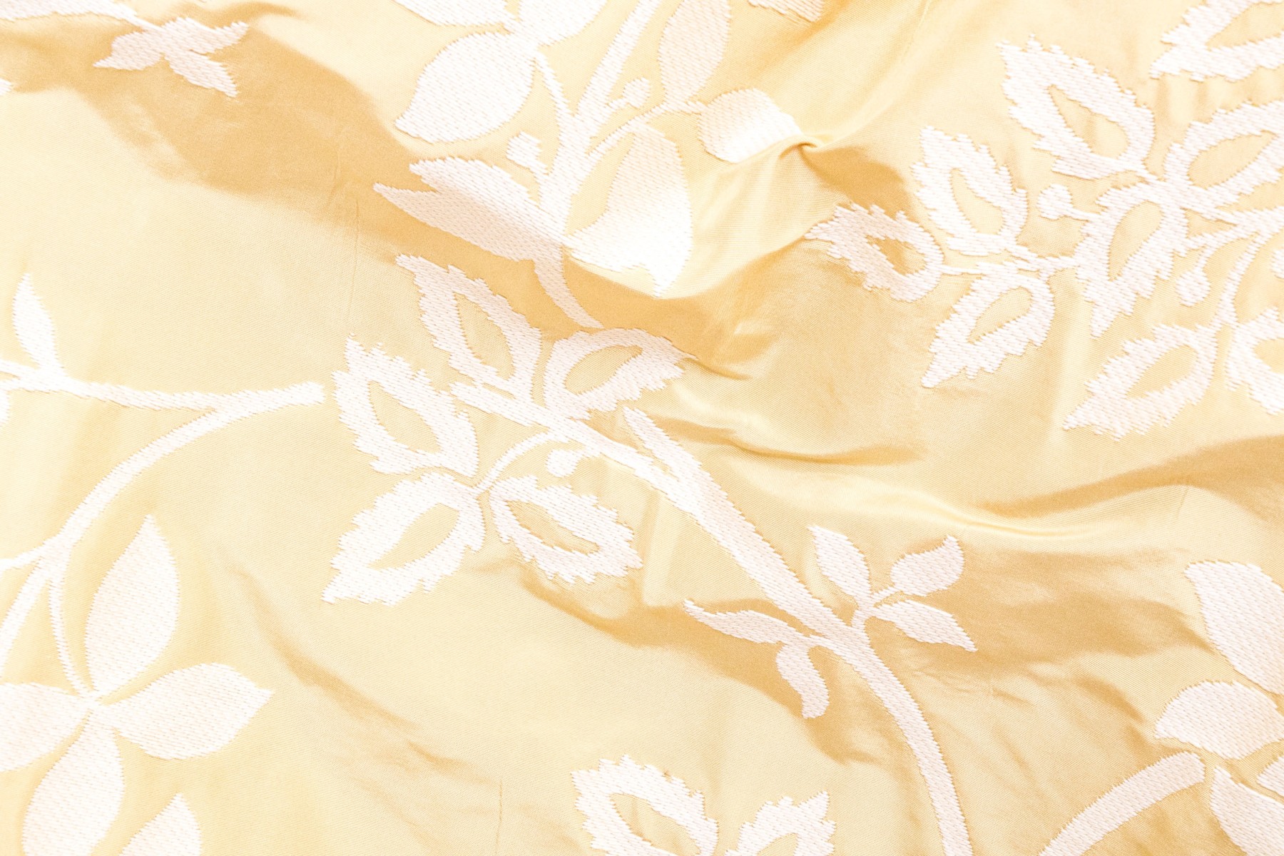 Pair of lavish custom silk drapes in butterscotch color with white embroidery displaying trailing vines and leaves. The drapes with pink pleats still retaining the drapery hooks. The drapes are cotton lined with an additional flannel room darkening layer. They come with a pair of tiebacks with fringed tassels (5 1/2" fringe).