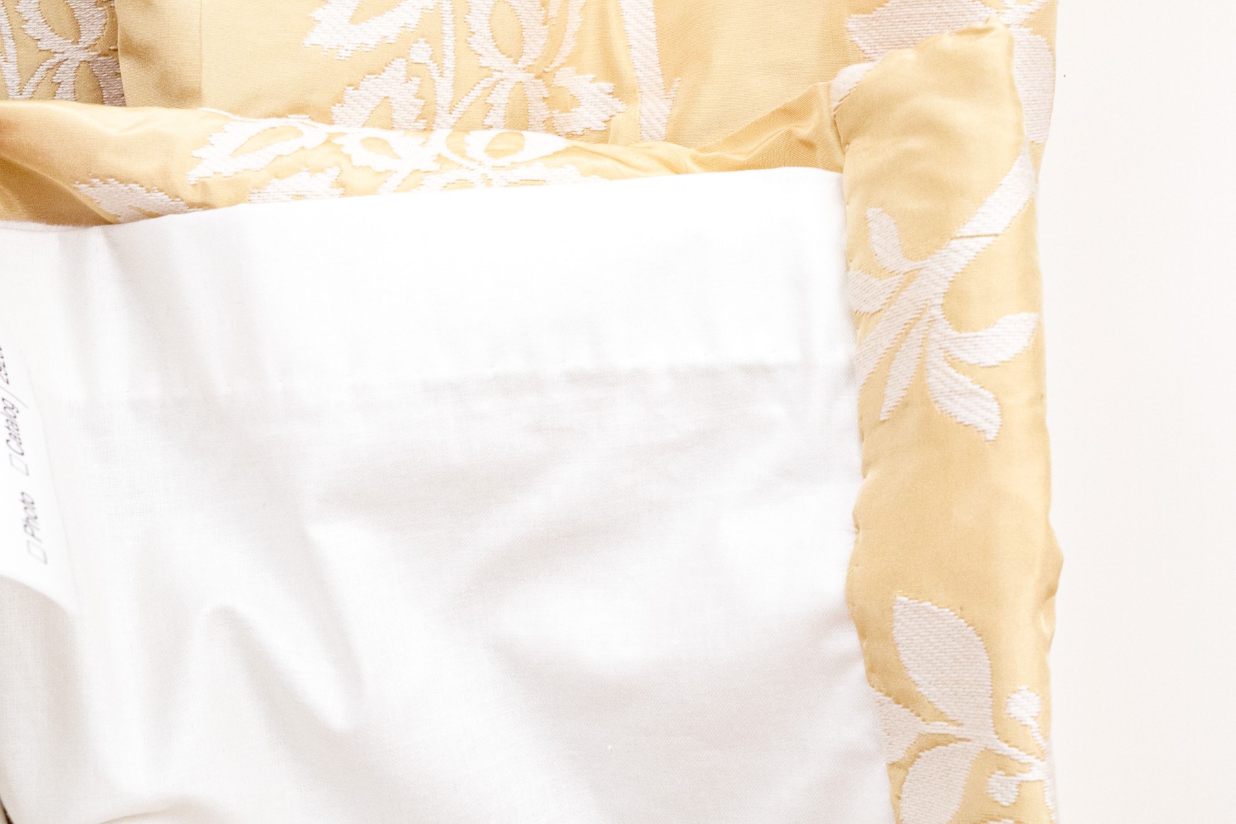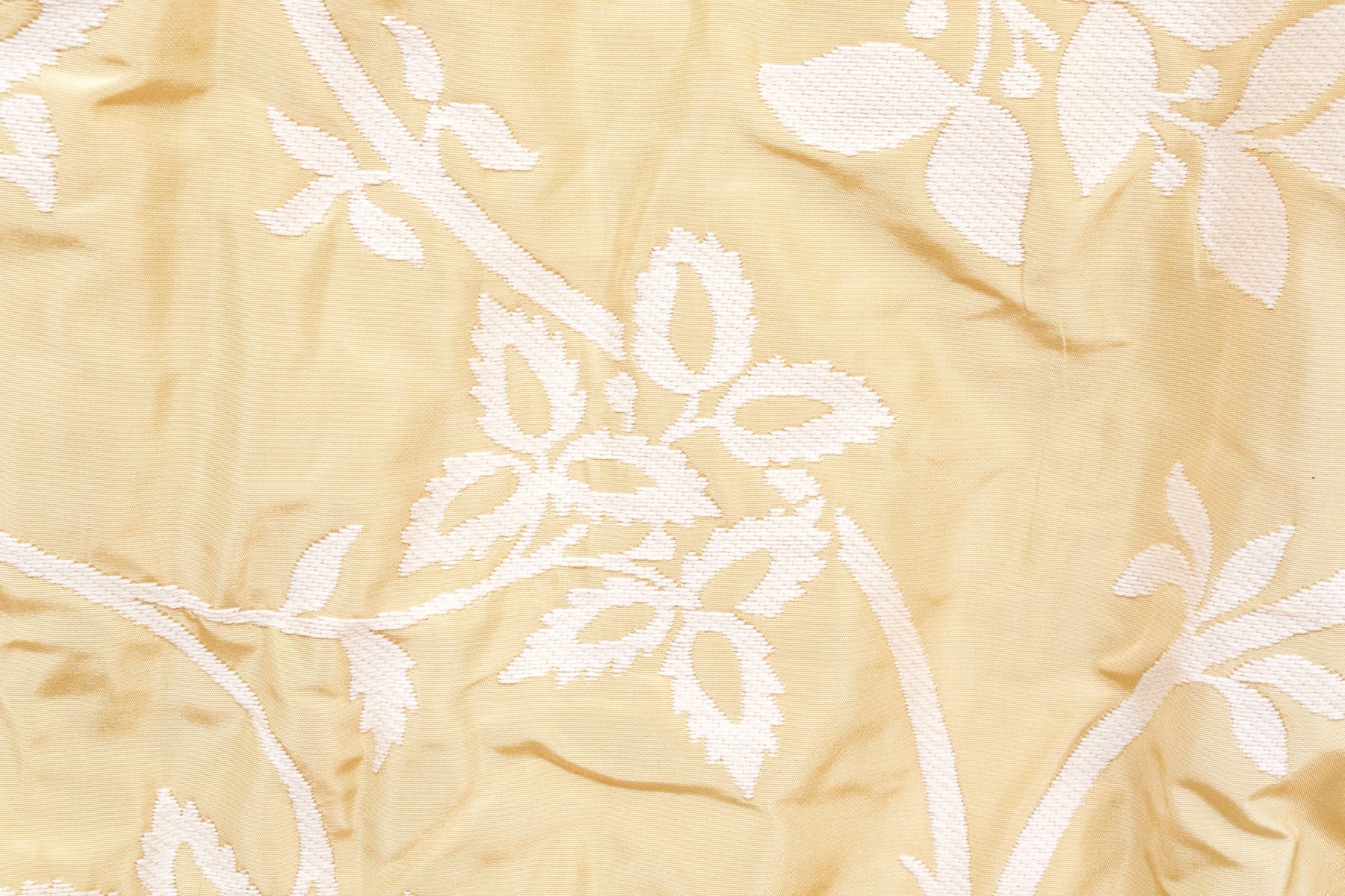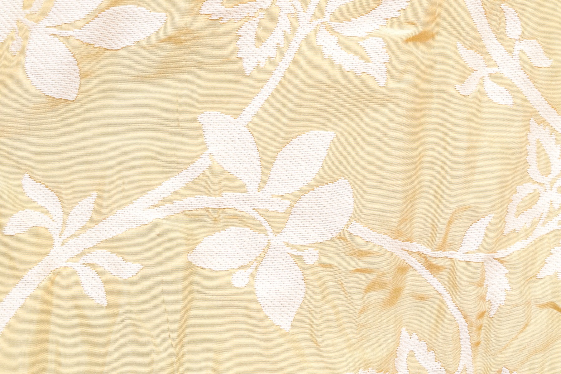 Pair of lavish custom silk drapes in butterscotch color with white embroidery displaying trailing vines and leaves. The drapes with pink pleats still retaining the drapery hooks. The drapes are cotton lined with an additional flannel room darkening layer. They come with a pair of tiebacks with fringed tassels (5 1/2" fringe).