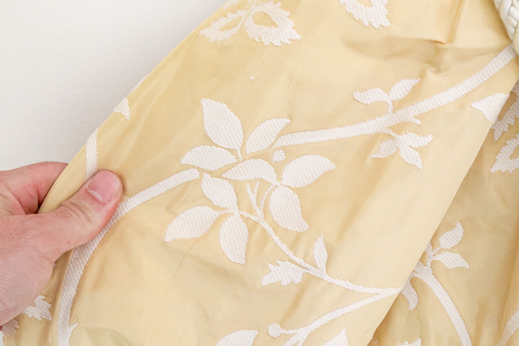 Pair of lavish custom silk drapes in butterscotch color with white embroidery displaying trailing vines and leaves. The drapes with pink pleats still retaining the drapery hooks. The drapes are cotton lined with an additional flannel room darkening layer. They come with a pair of tiebacks with fringed tassels (5 1/2" fringe).
