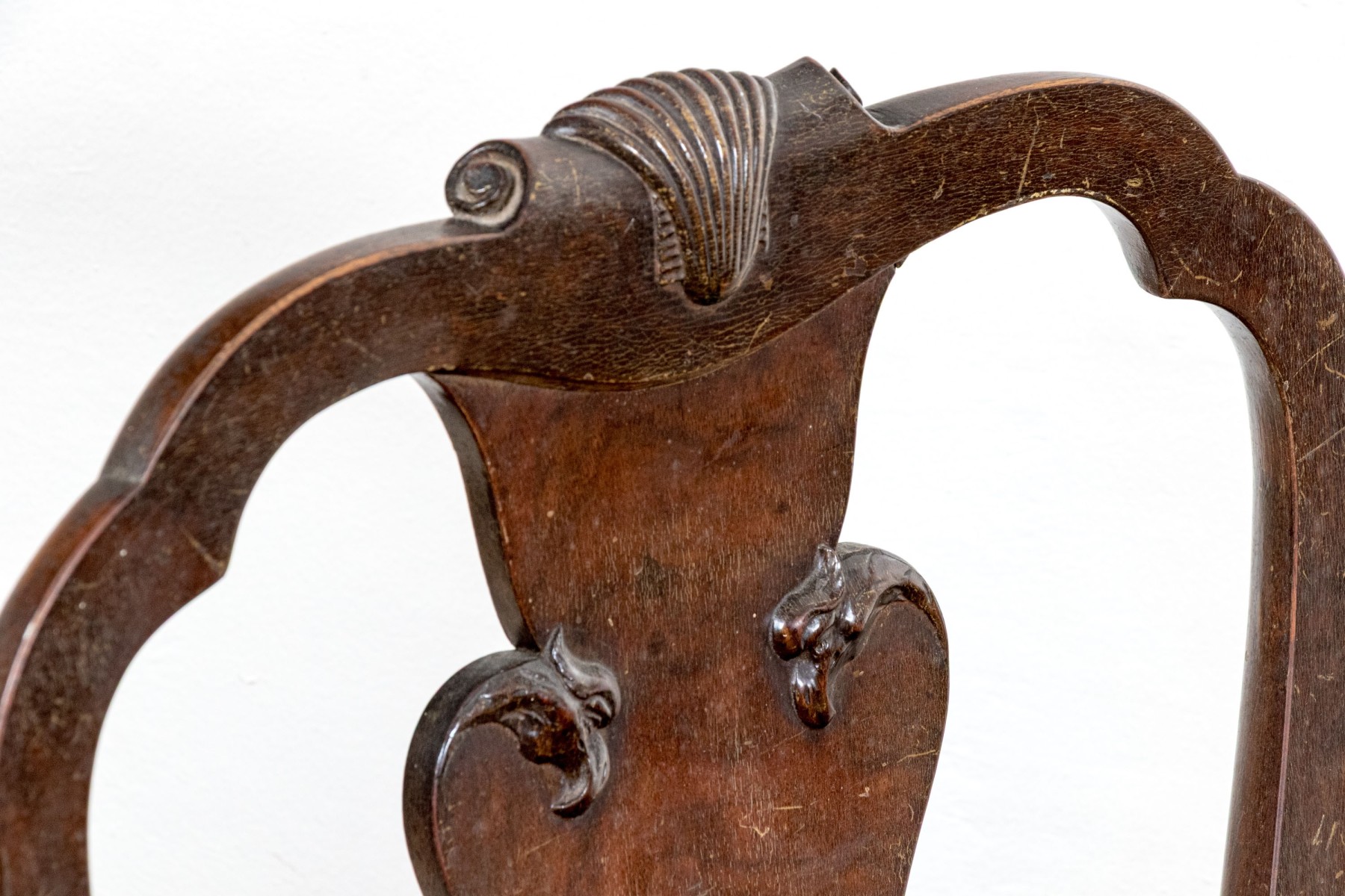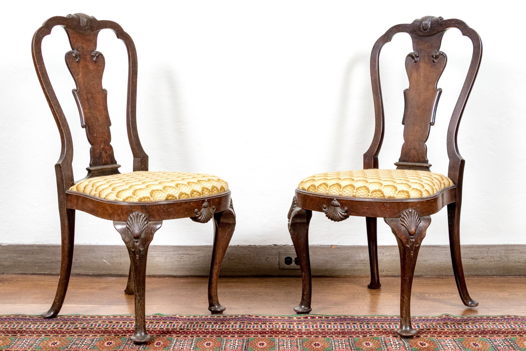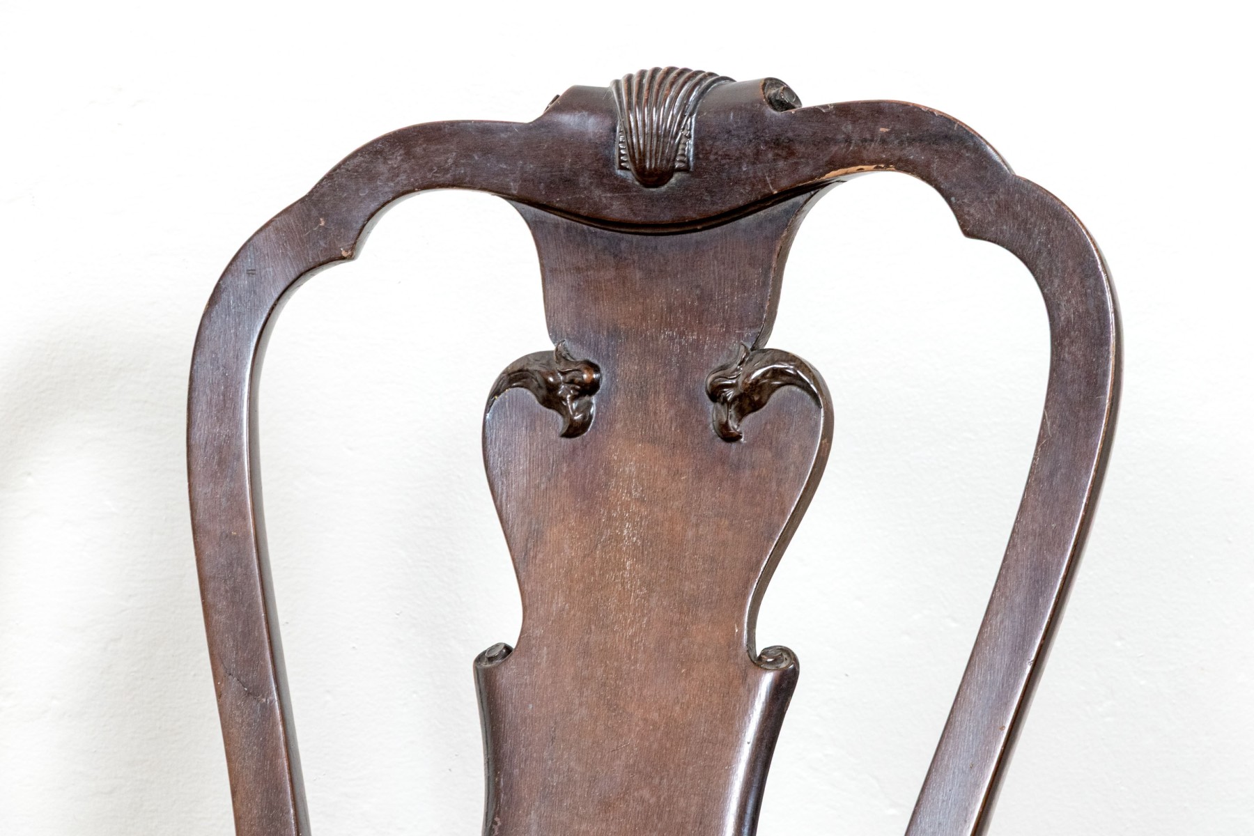 A fabulous pair of 20th century reproduction Philadelphia Chippendale side chairs raised on front cabriolet and pad feet. The chairs are detailed with shell carved motifs to the front legs in relief. Finished with nicely carved back splats and shaped seat back with carved shell and scroll motifs.