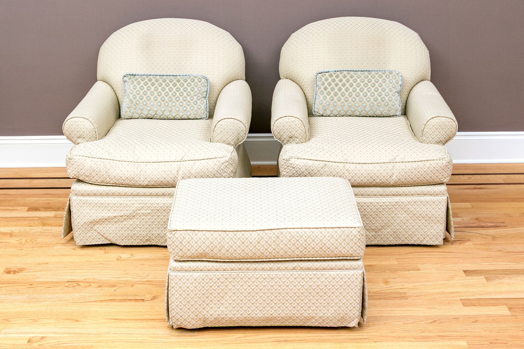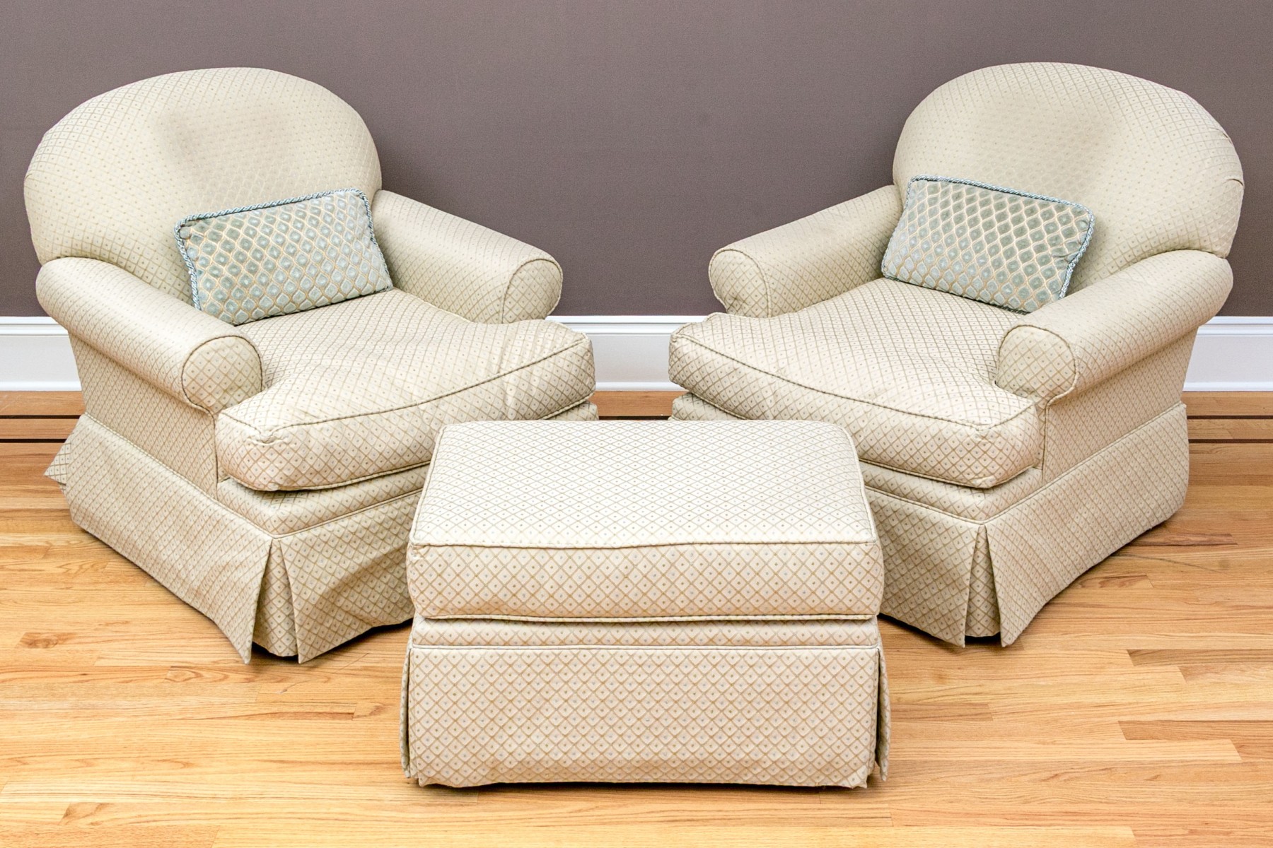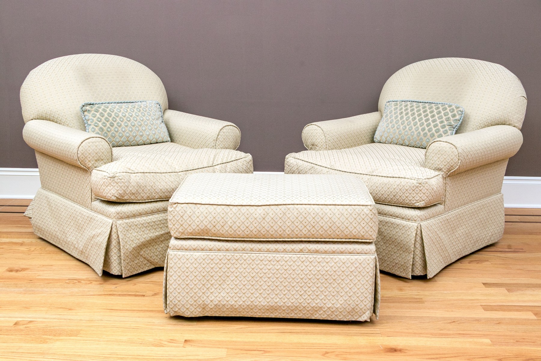 A wonderful pair of classic club chairs with rounded backs, deep set seats, rolled arms, and skirts concealing the legs. Upholstered in appealing pale green with diamond lattice patterns dotted with pops of sage green and sky blue quatrefoil motifs. Accompanied by a matching ottoman.
