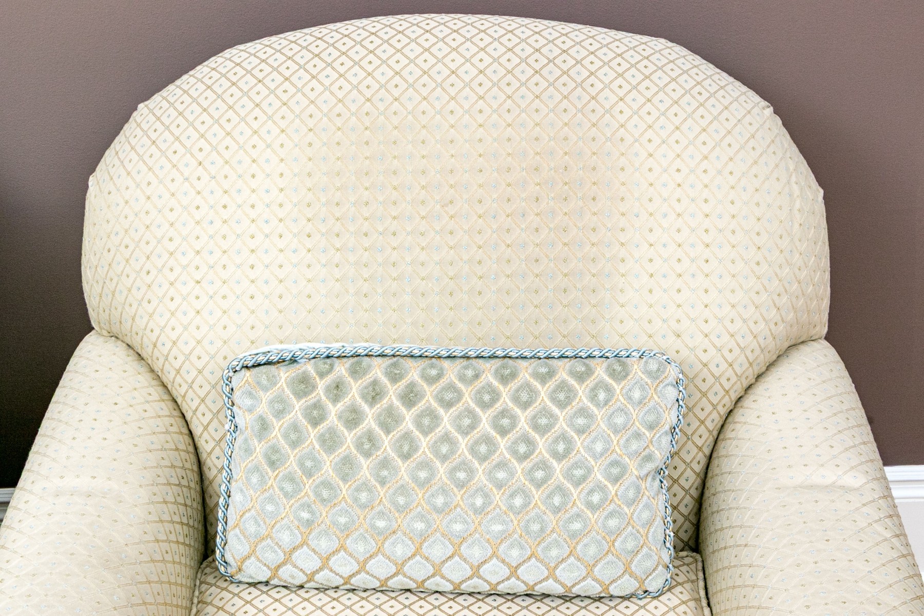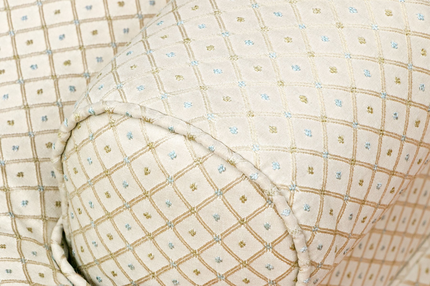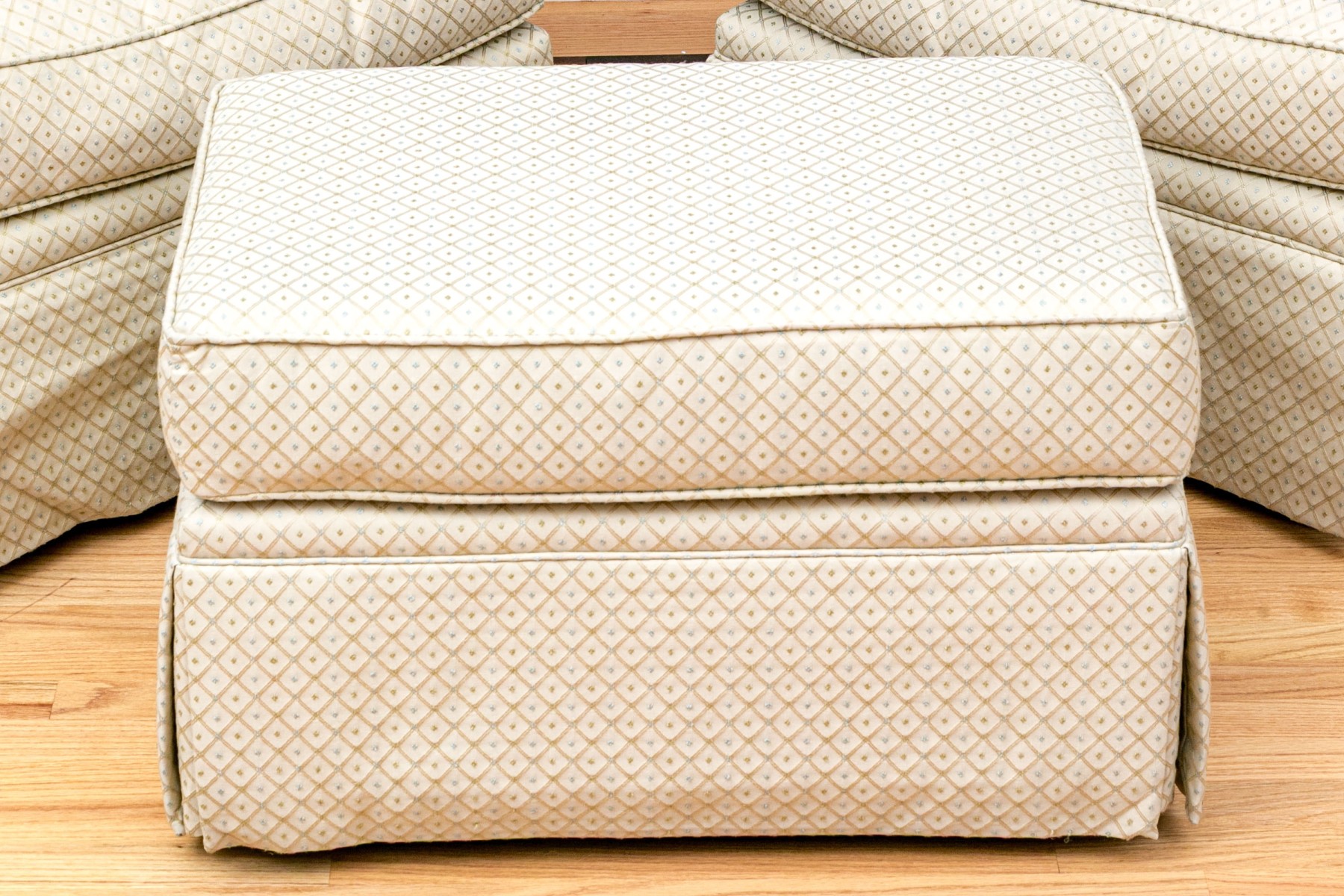 A wonderful pair of classic club chairs with rounded backs, deep set seats, rolled arms, and skirts concealing the legs. Upholstered in appealing pale green with diamond lattice patterns dotted with pops of sage green and sky blue quatrefoil motifs. Accompanied by a matching ottoman.