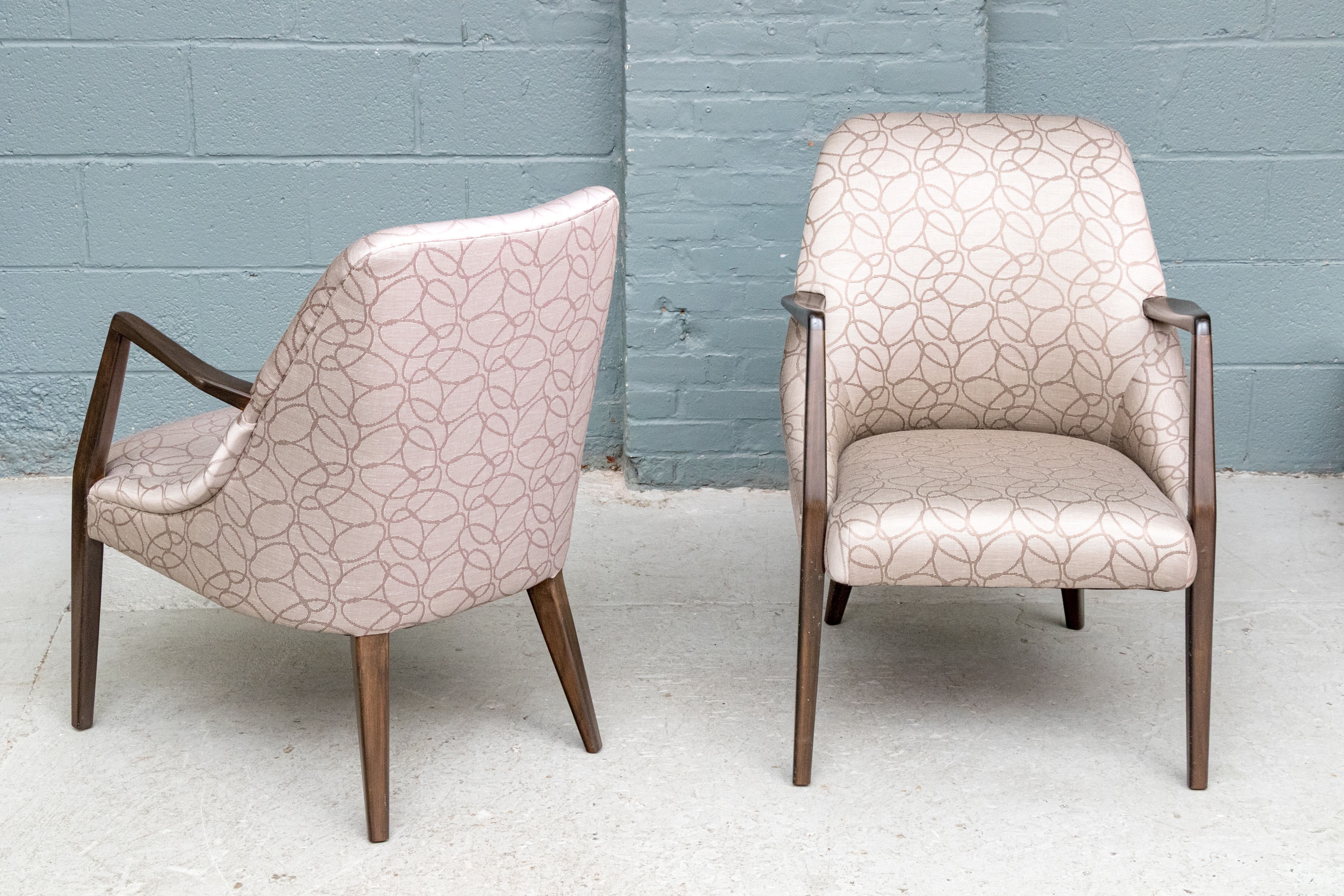 Pair of fine quality mid century modern style dark stained walnut frames with square tapered legs, angular arms and good weight. Each with tight geometric upholstered seats and backs. Attributed to Bertha Schaefer.