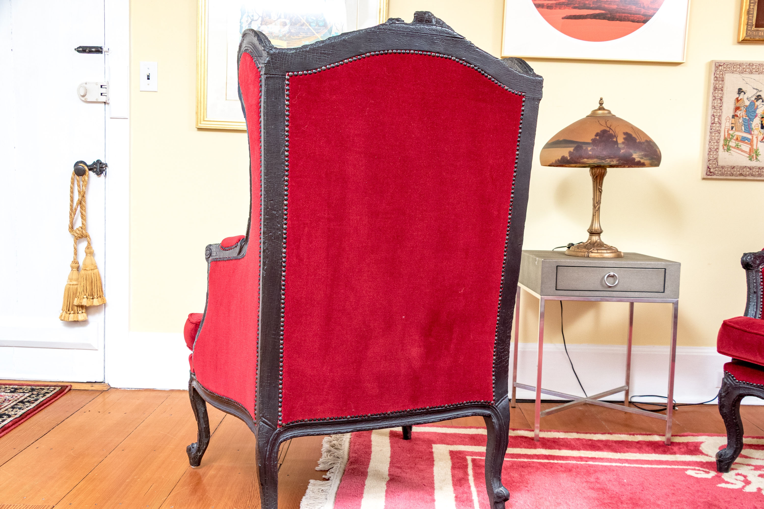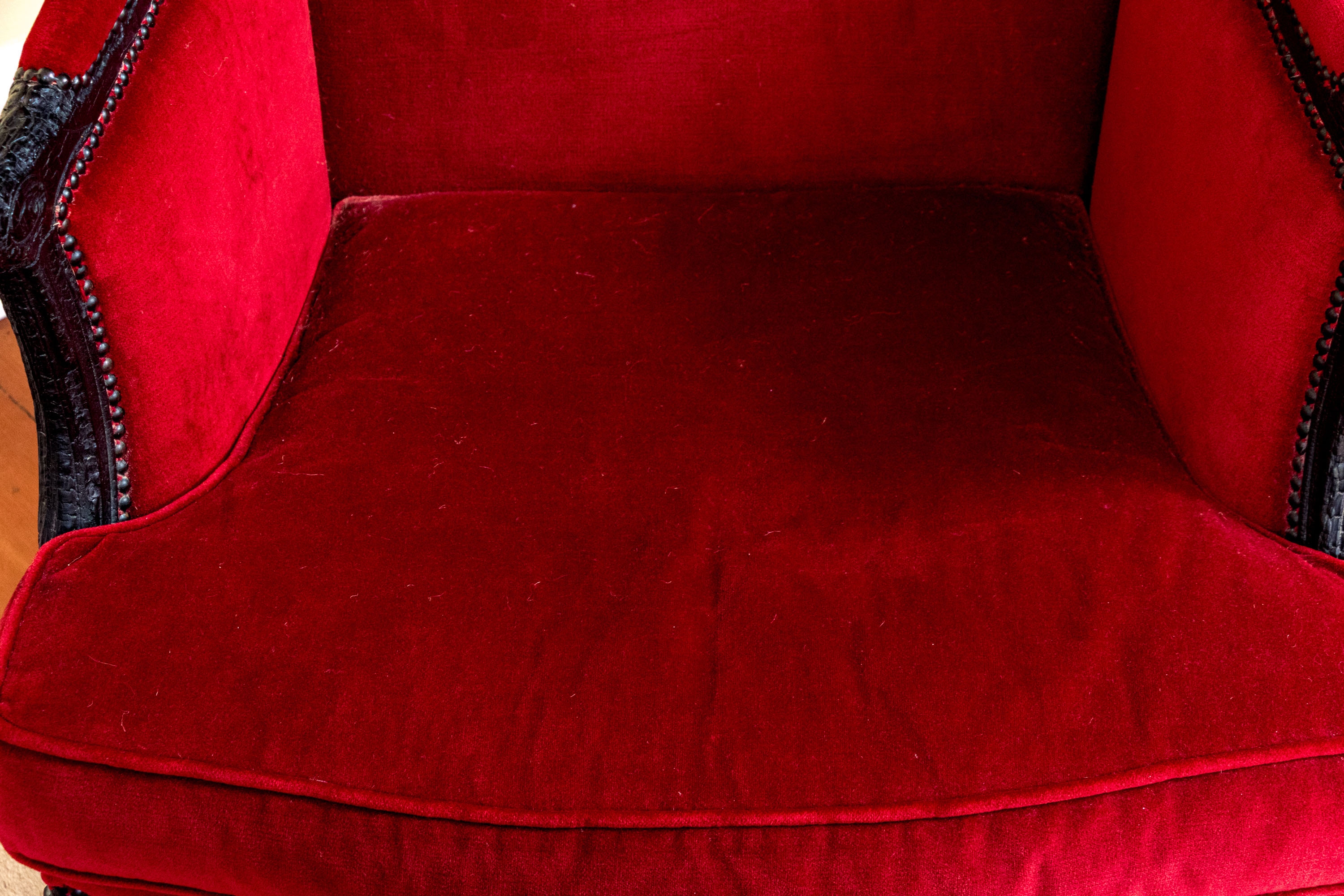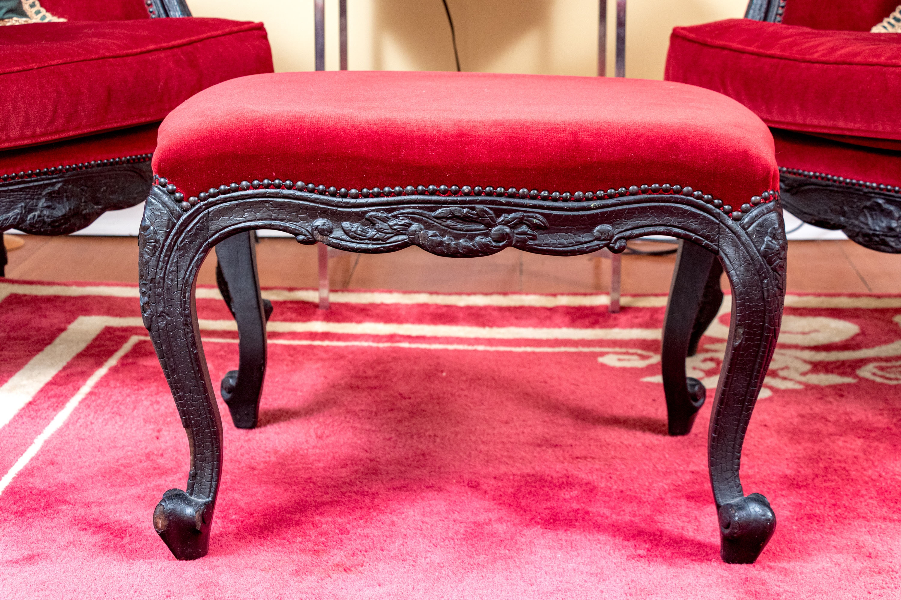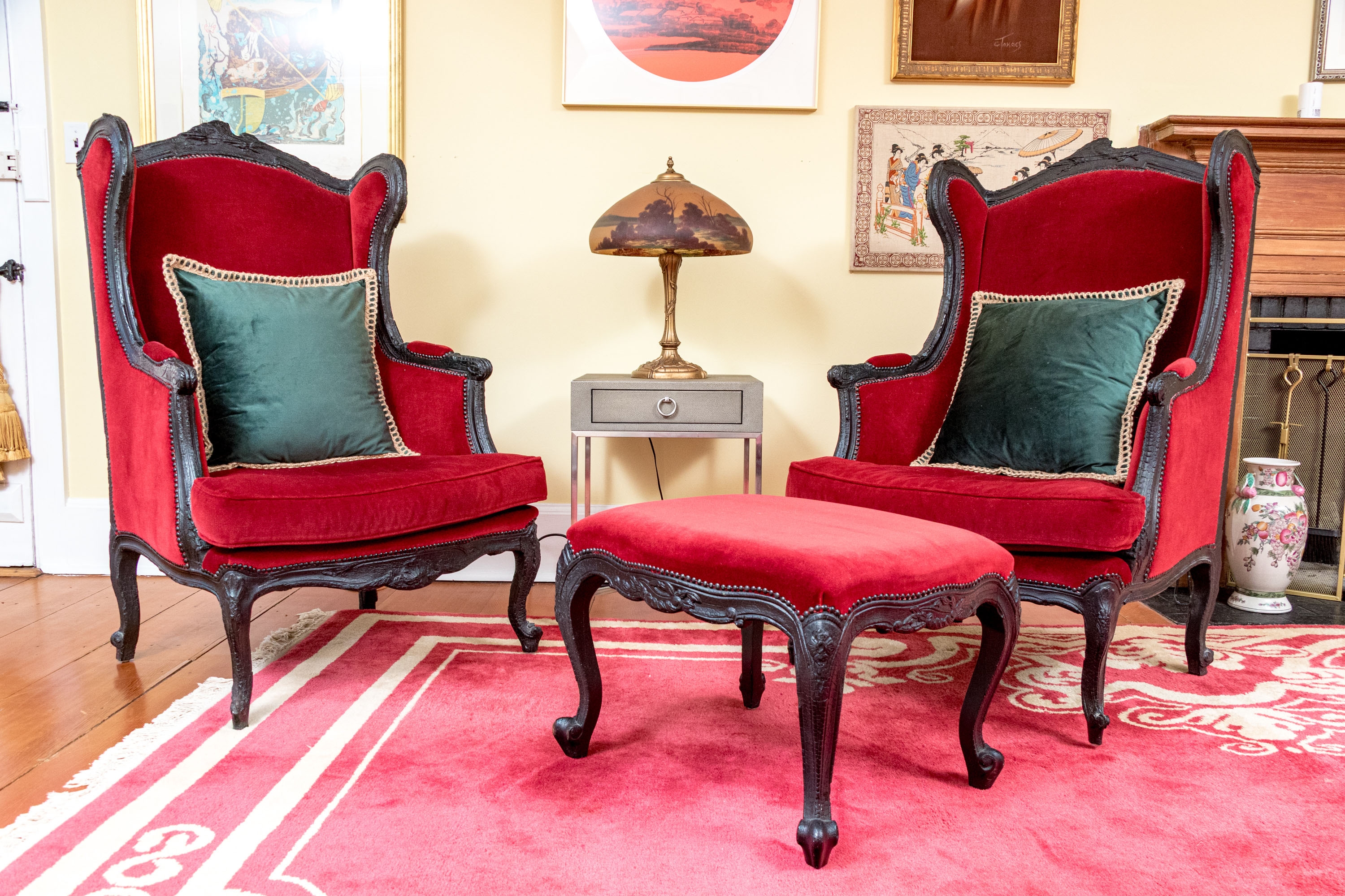 Comprised of a pair of fabulous custom upholstered carve and finished wing chairs with one ottoman thats associated with the set. Rich red upholstery with loose upholstered seat cushion with piped trims and upholstered seat backs and exteriors on the sides. Together with a pair of quality green upholstered accent pillows with fringe. Provenance: Purchased at the auction for Gramercy Hotel. Dimensions: Ottoman: 23 3/4" W x 19 1/4" D x 16 1/2" SH