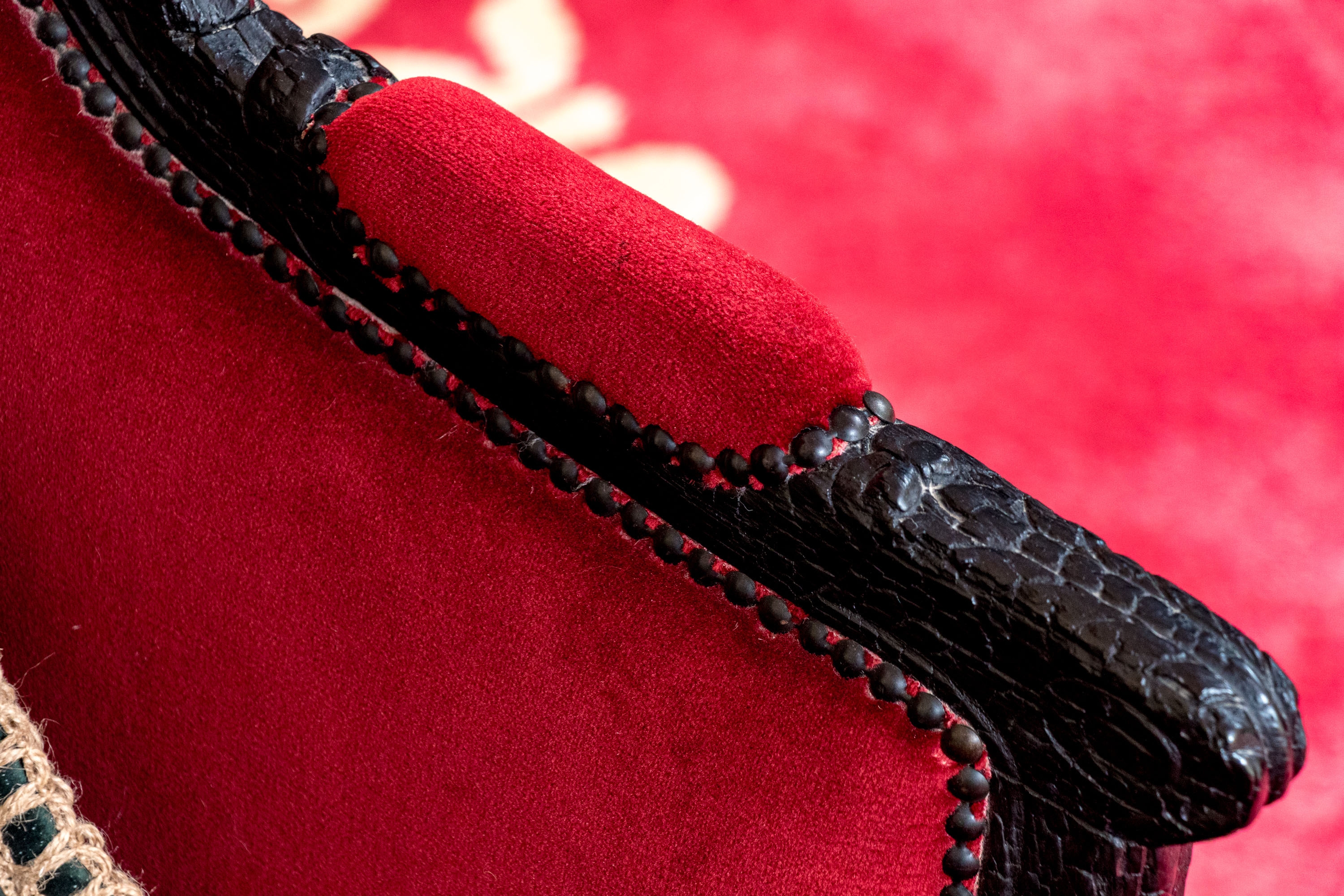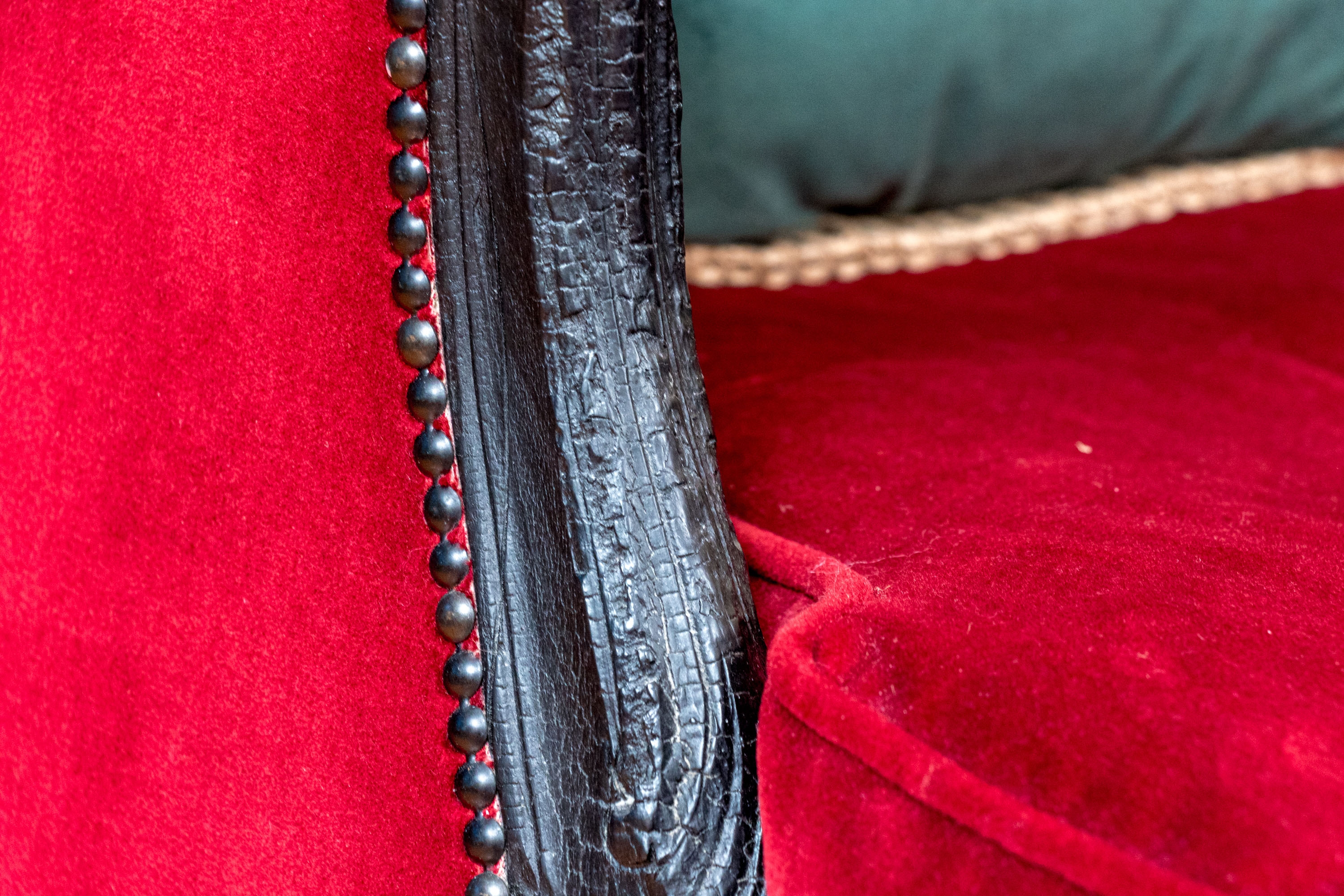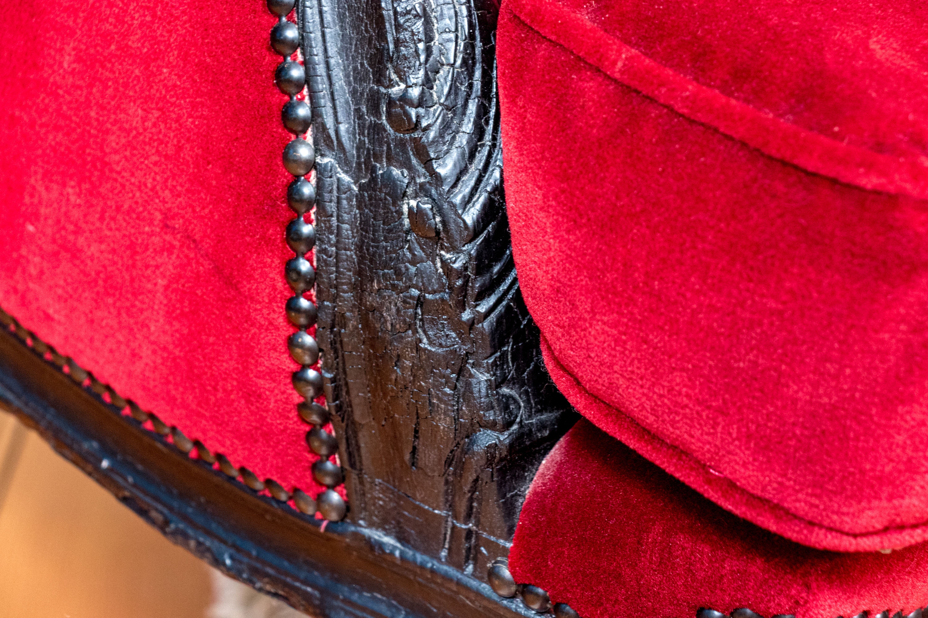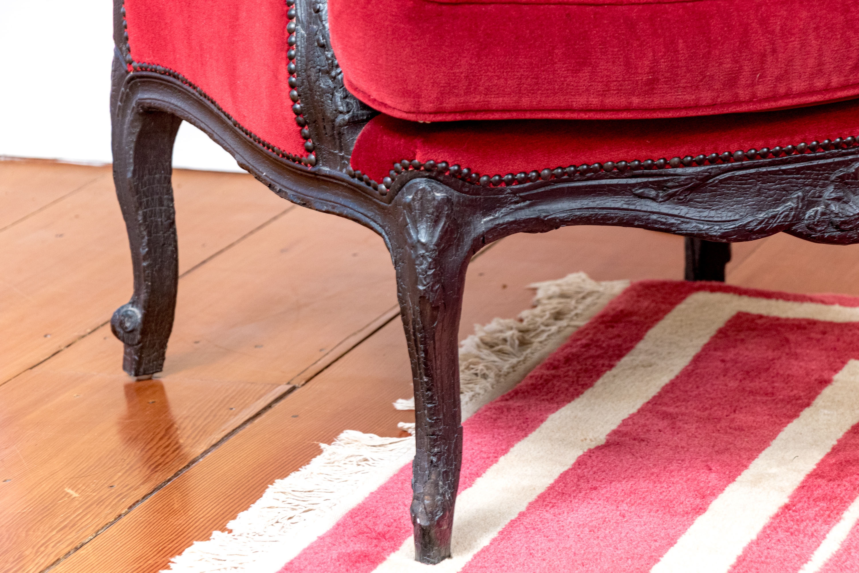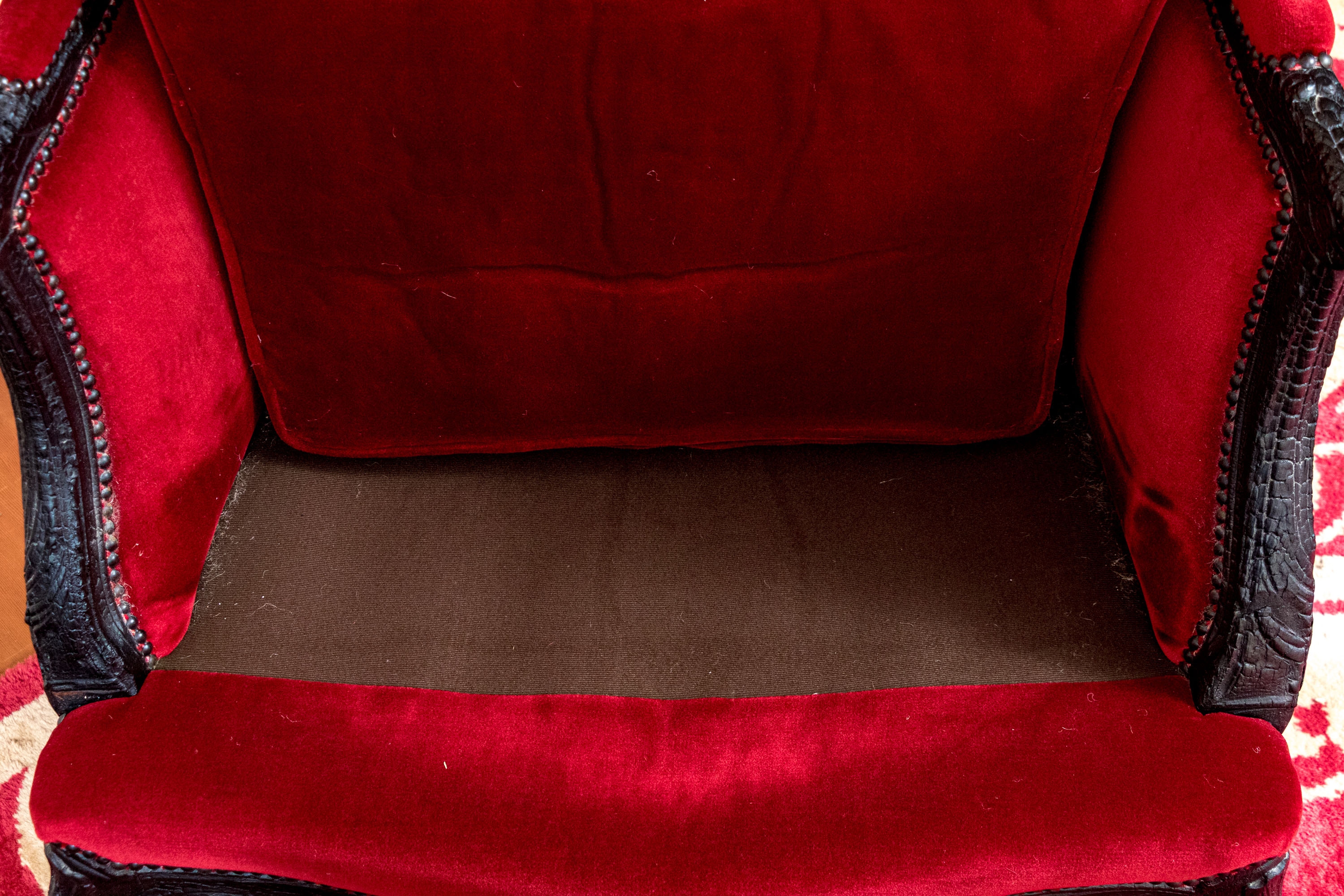 Comprised of a pair of fabulous custom upholstered carve and finished wing chairs with one ottoman thats associated with the set. Rich red upholstery with loose upholstered seat cushion with piped trims and upholstered seat backs and exteriors on the sides. Together with a pair of quality green upholstered accent pillows with fringe. Provenance: Purchased at the auction for Gramercy Hotel. Dimensions: Ottoman: 23 3/4" W x 19 1/4" D x 16 1/2" SH