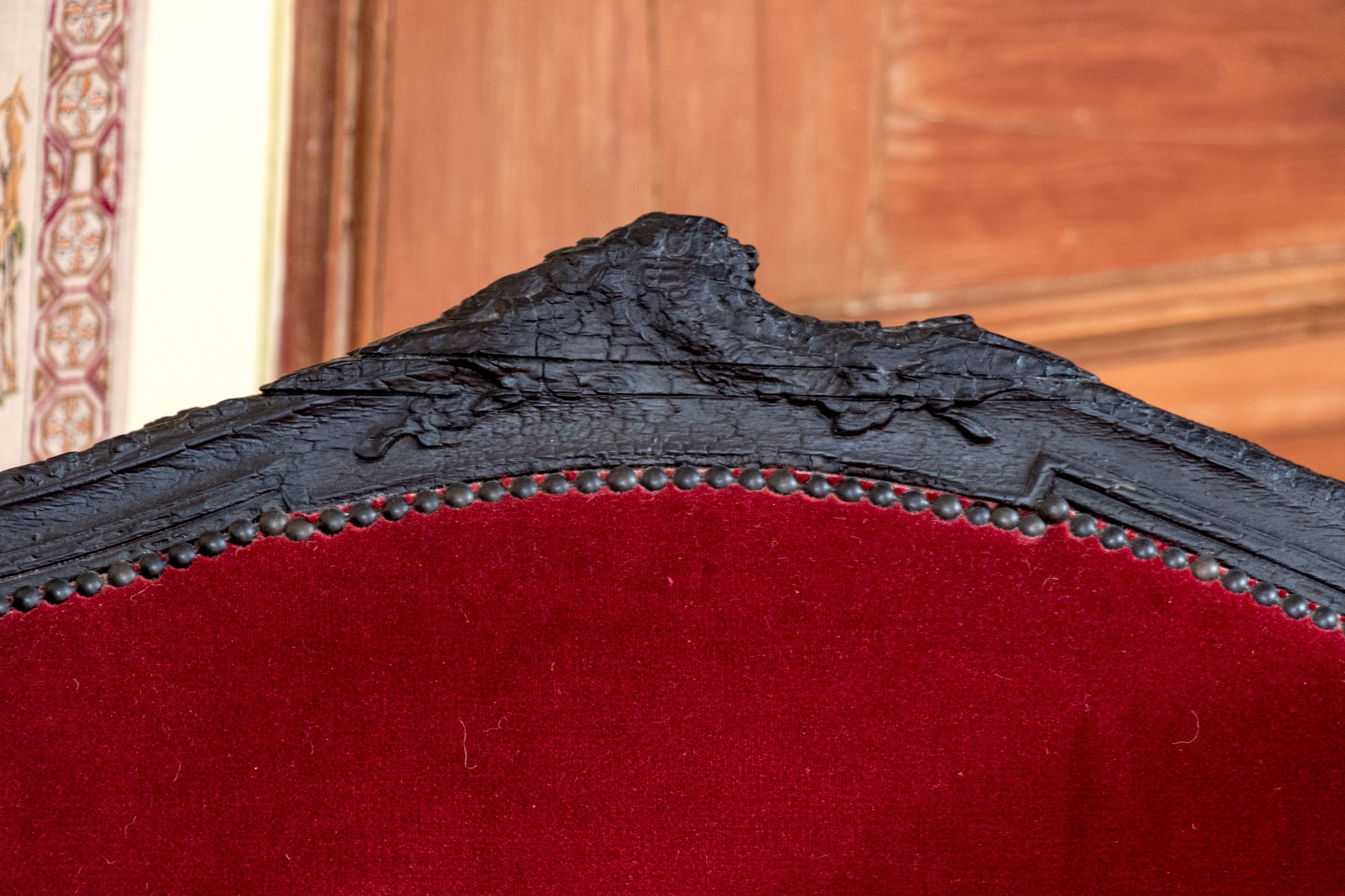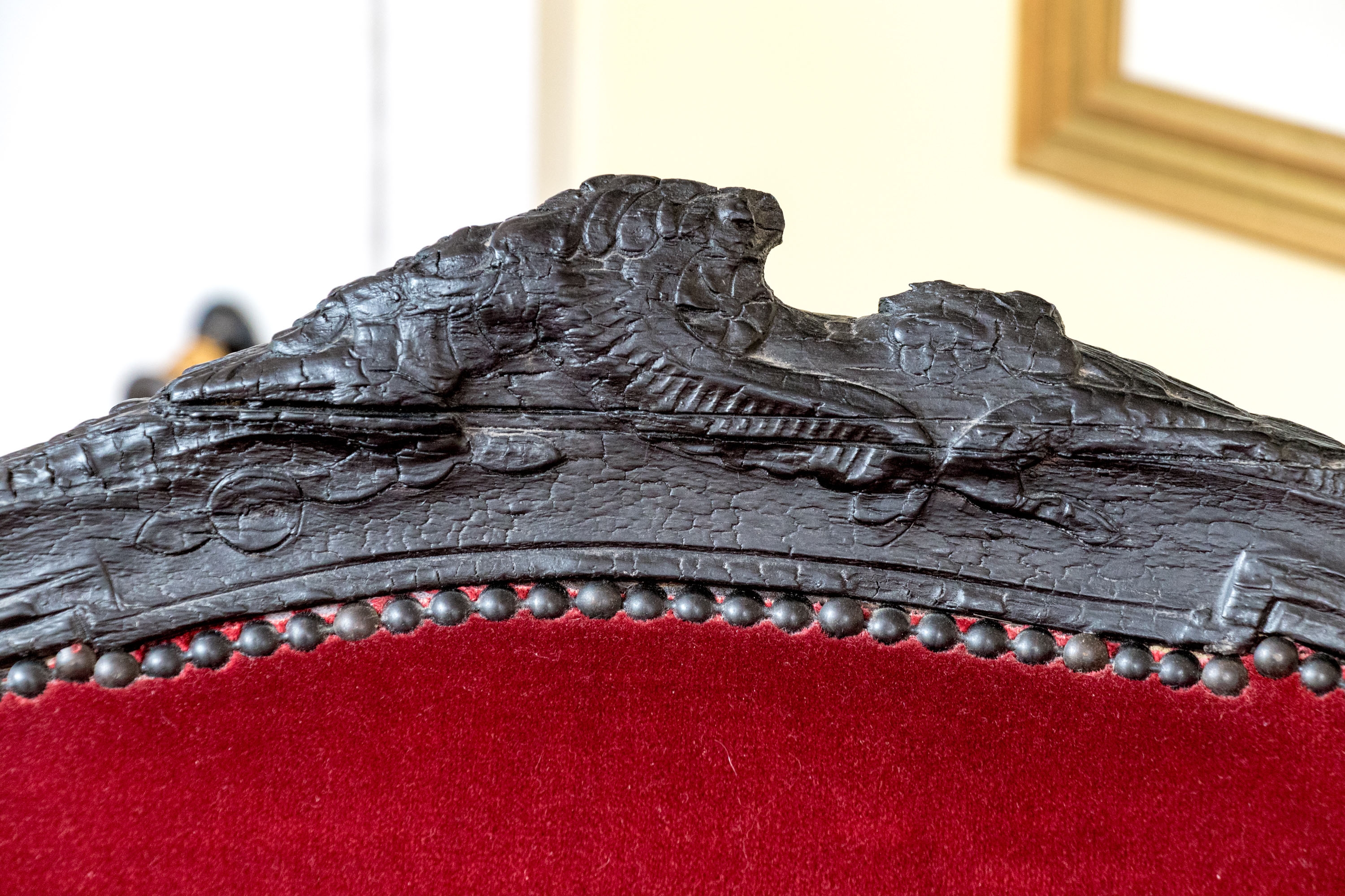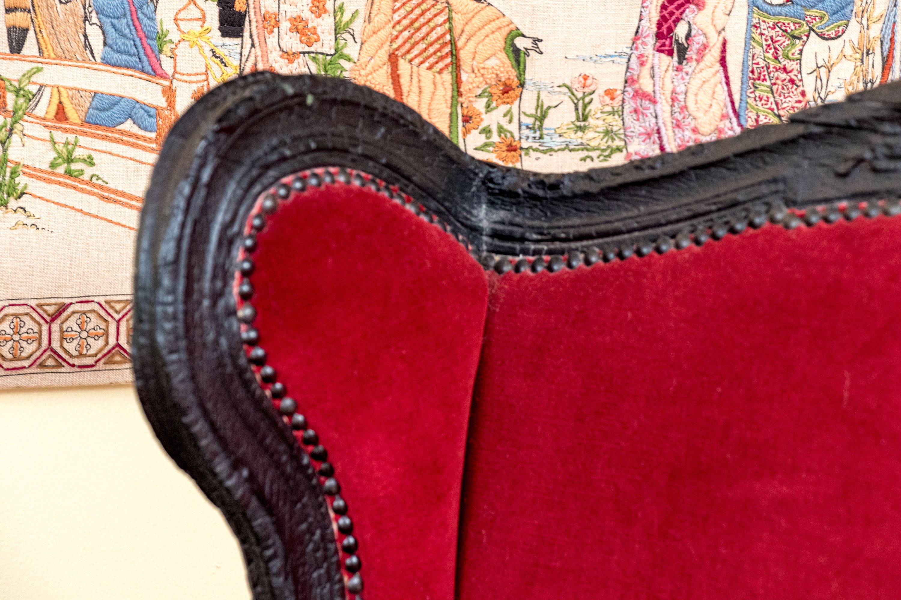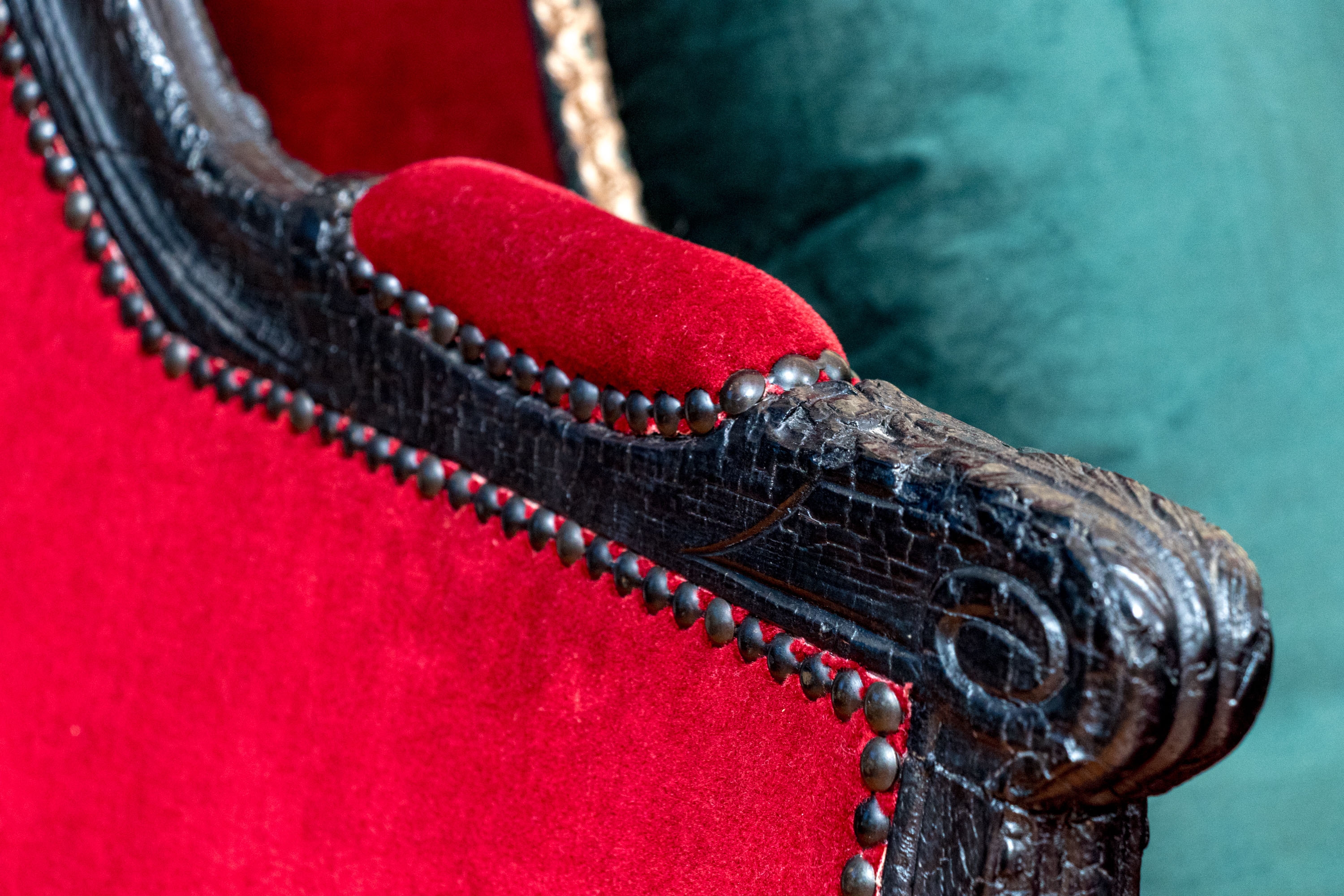 Comprised of a pair of fabulous custom upholstered carve and finished wing chairs with one ottoman thats associated with the set. Rich red upholstery with loose upholstered seat cushion with piped trims and upholstered seat backs and exteriors on the sides. Together with a pair of quality green upholstered accent pillows with fringe. Provenance: Purchased at the auction for Gramercy Hotel. Dimensions: Ottoman: 23 3/4" W x 19 1/4" D x 16 1/2" SH