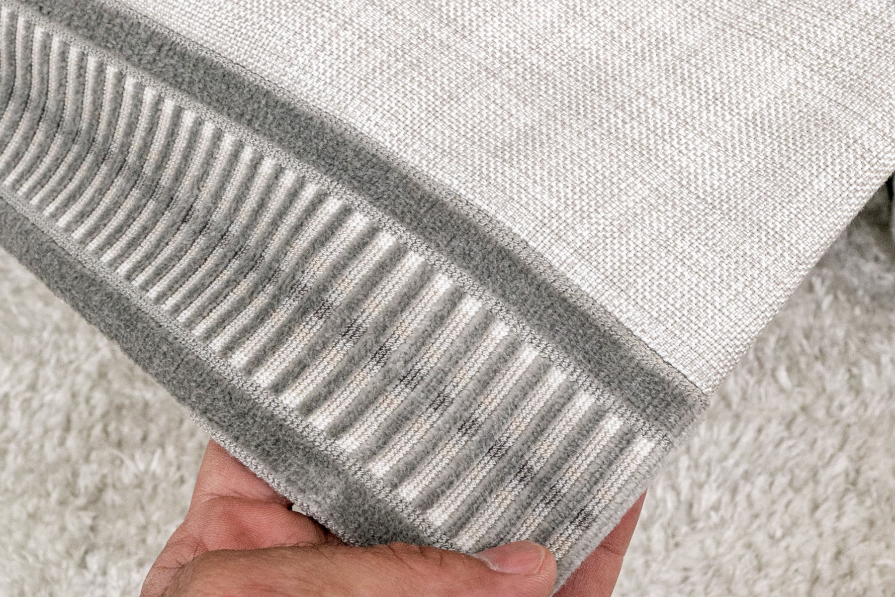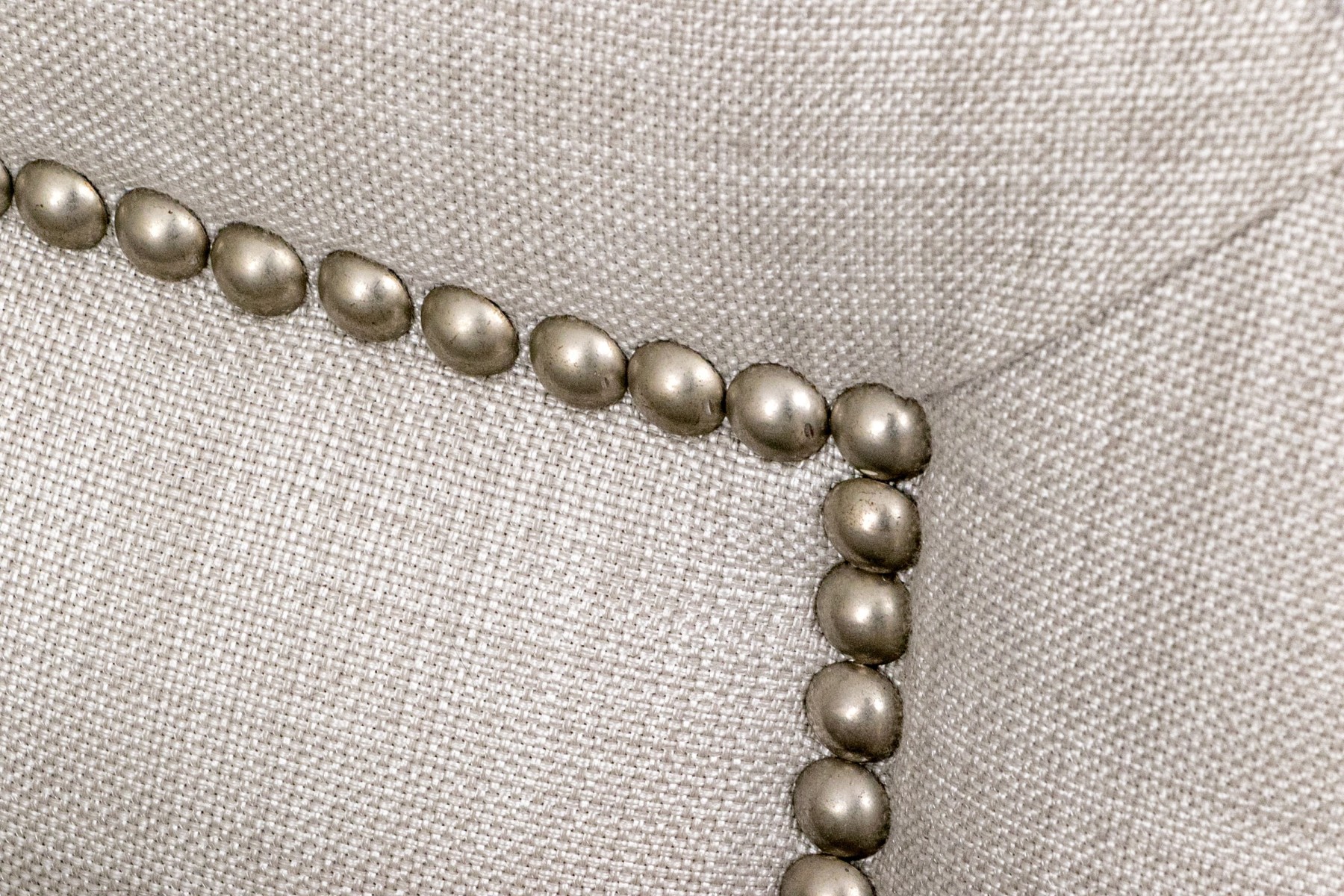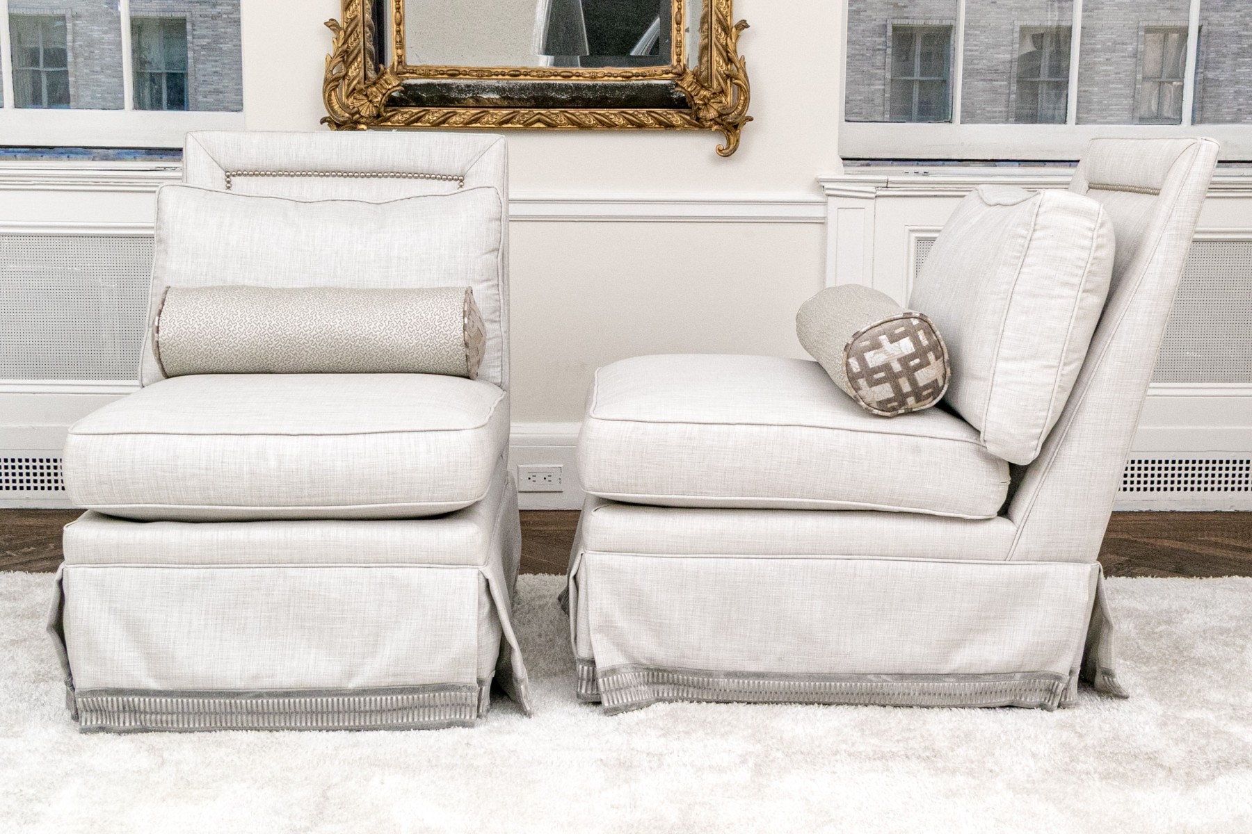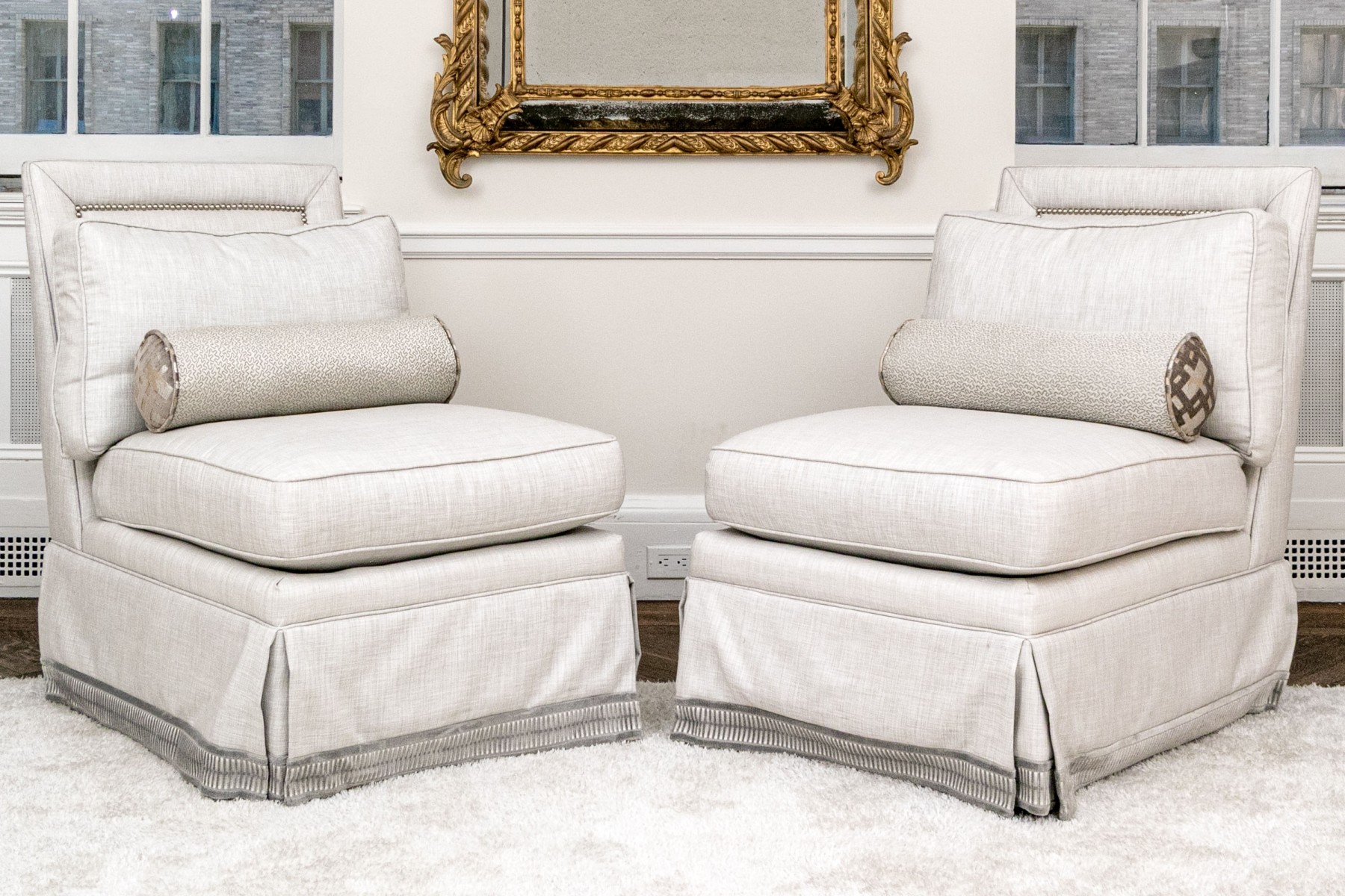 A chic pair of slipper chairs upholstered in a grey fabric with skirts to conceal the underneath four lets. Each slipper chair has loose upholstered seat back cushion and seat cushion with piped trims. Finished with nailhead trims and stylish upholstered bolster pillows to match.