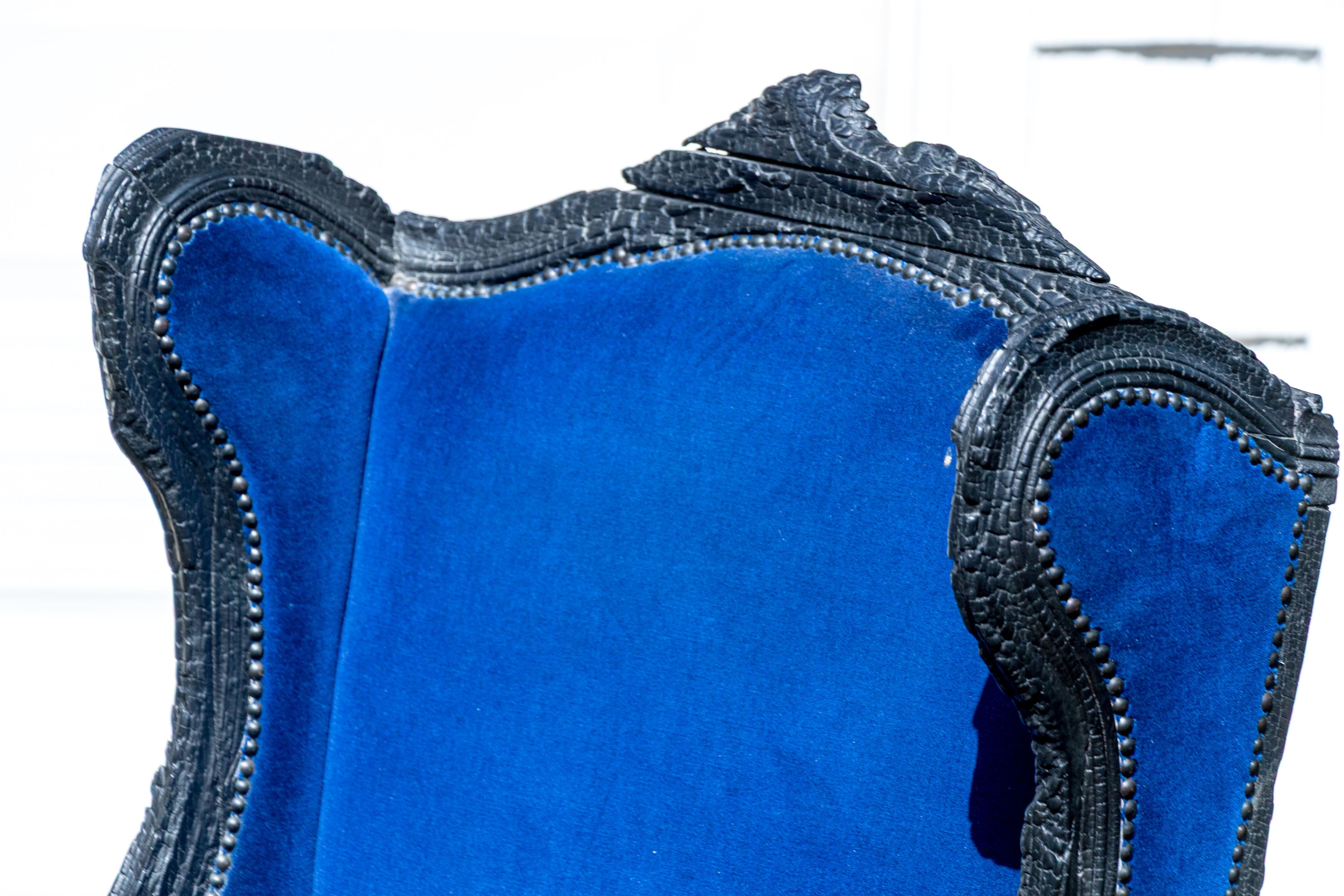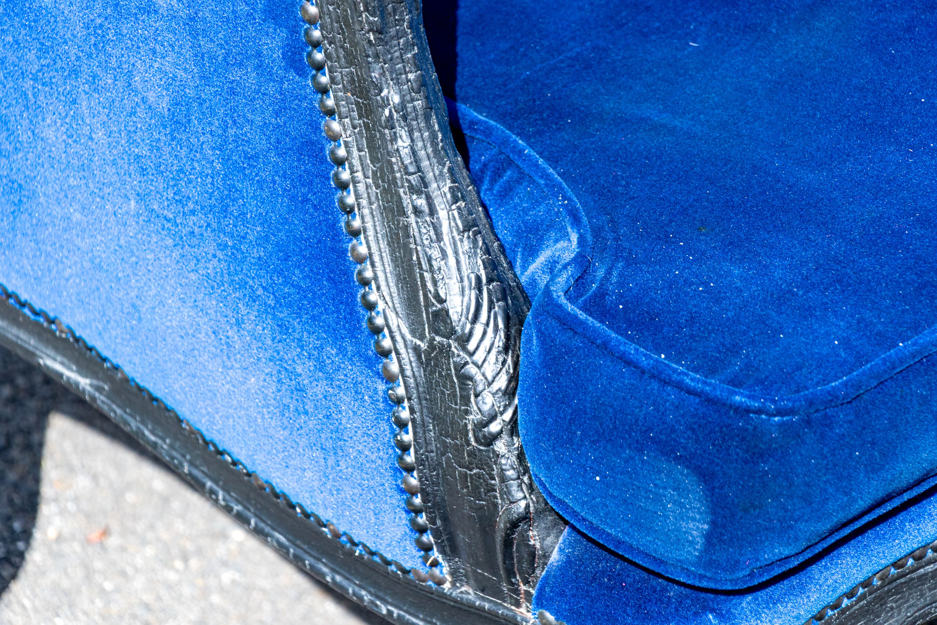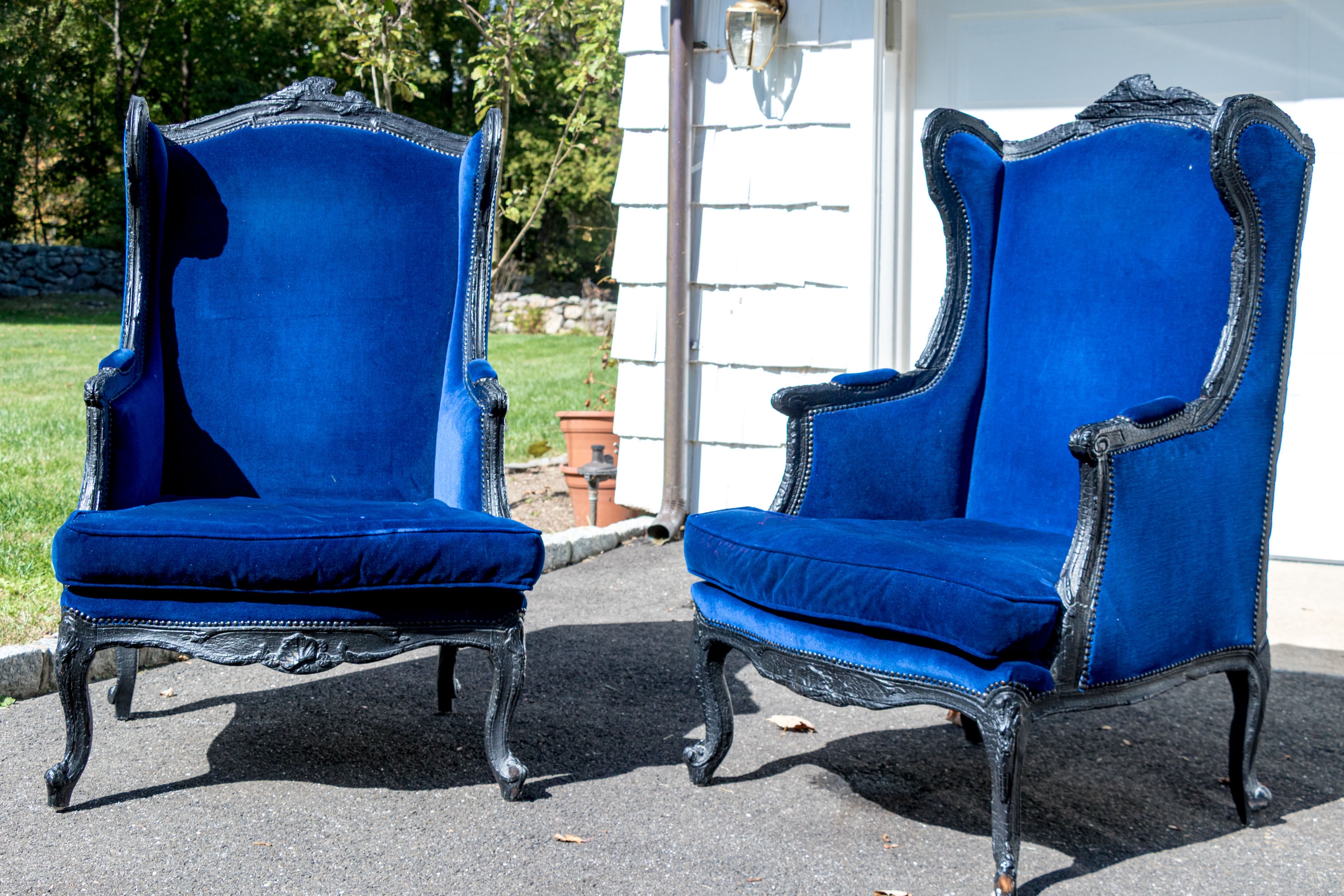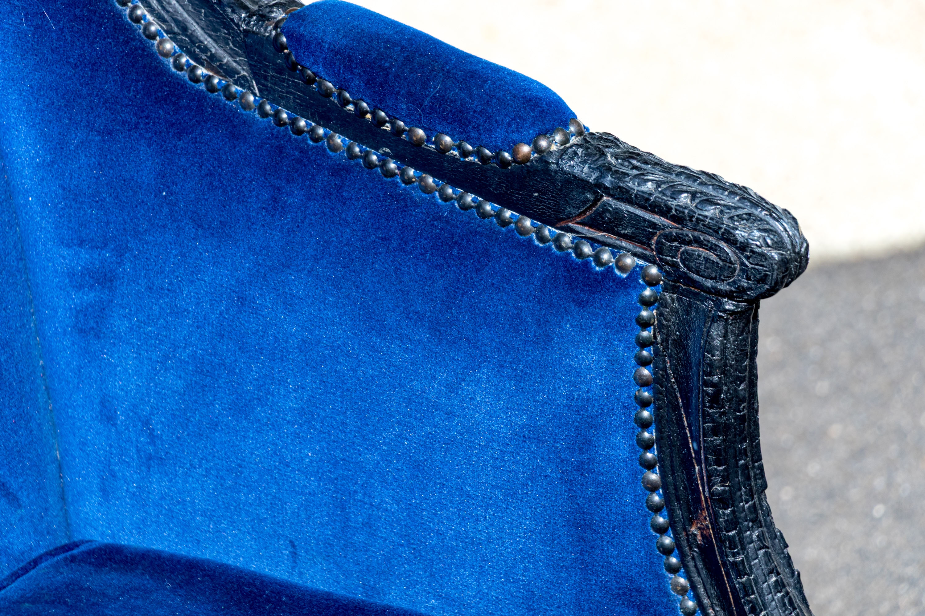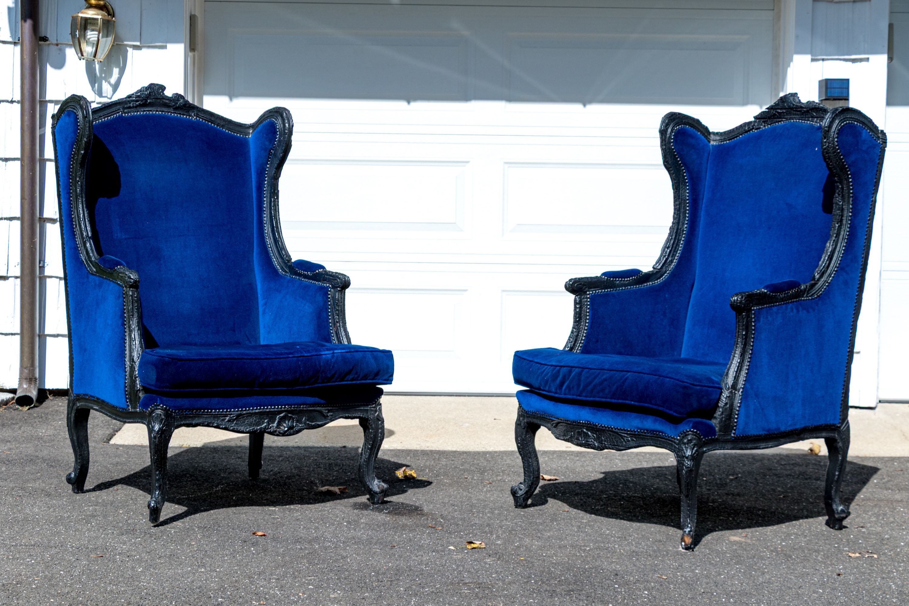 Standing on cabriole legs with exposed carved and ebonized finished frames with royal blue fabric upholstery to the seat, arm pads, wings on the interior and exterior and the reverse. The seats with loose upholstered seat cushions with piped trim.