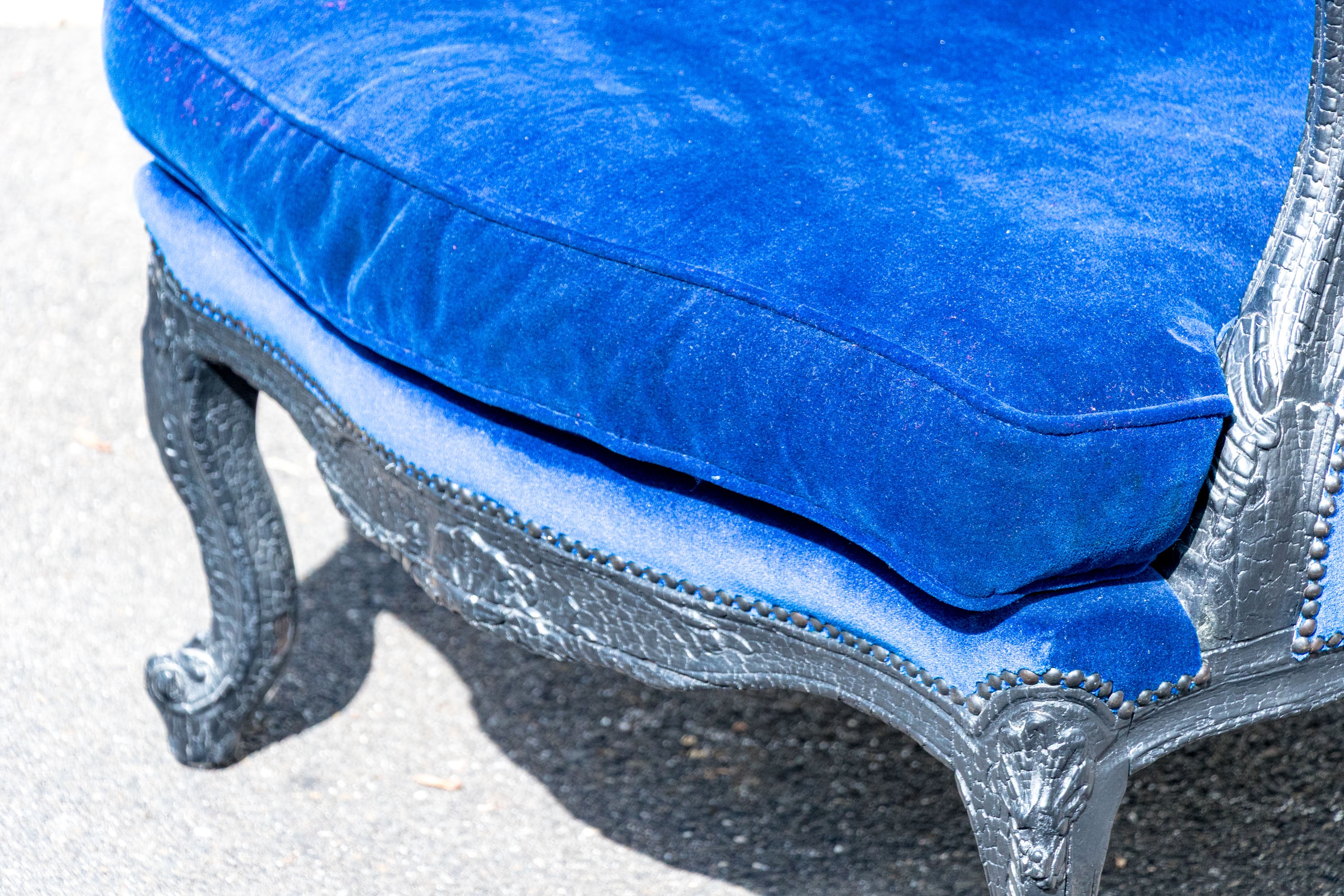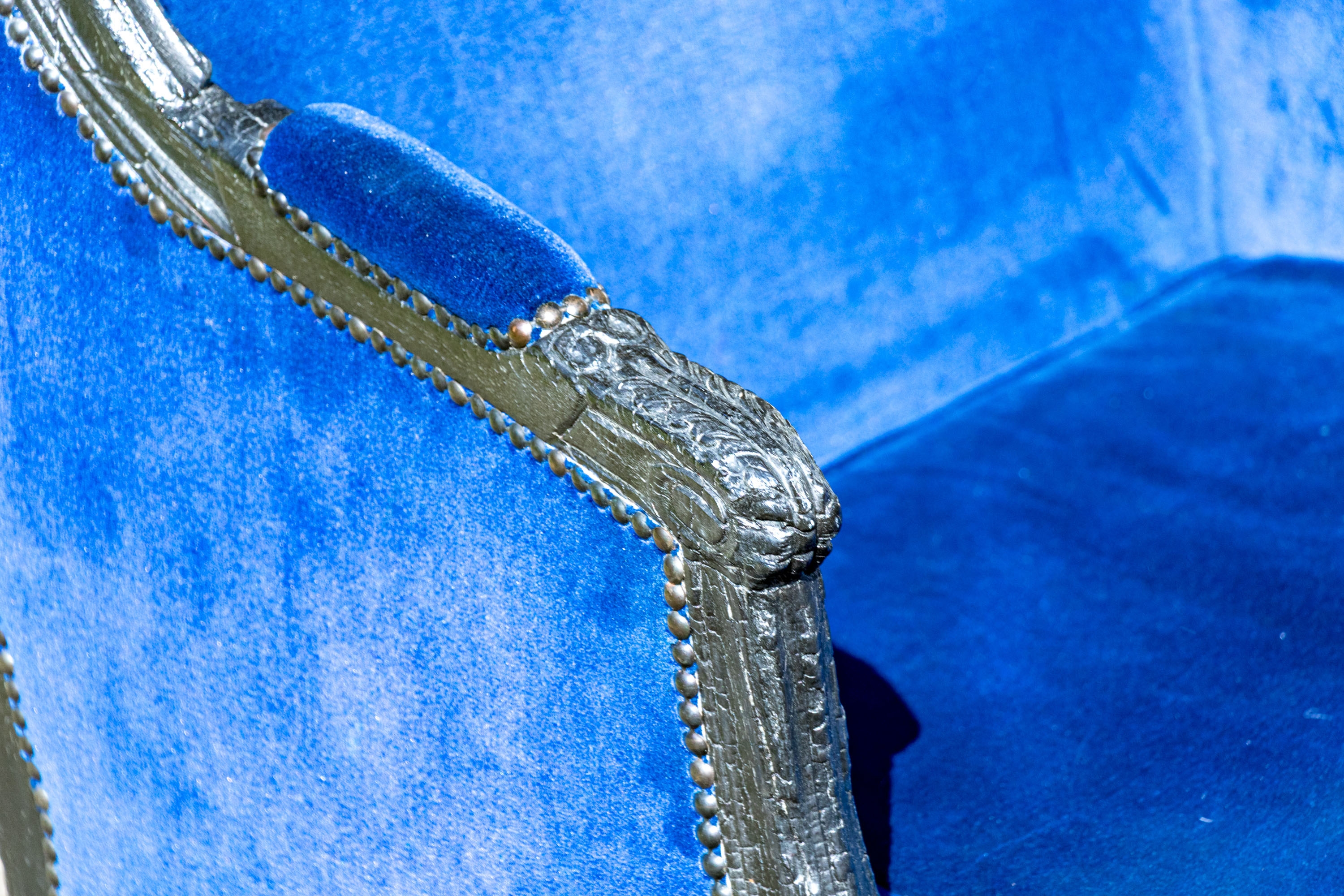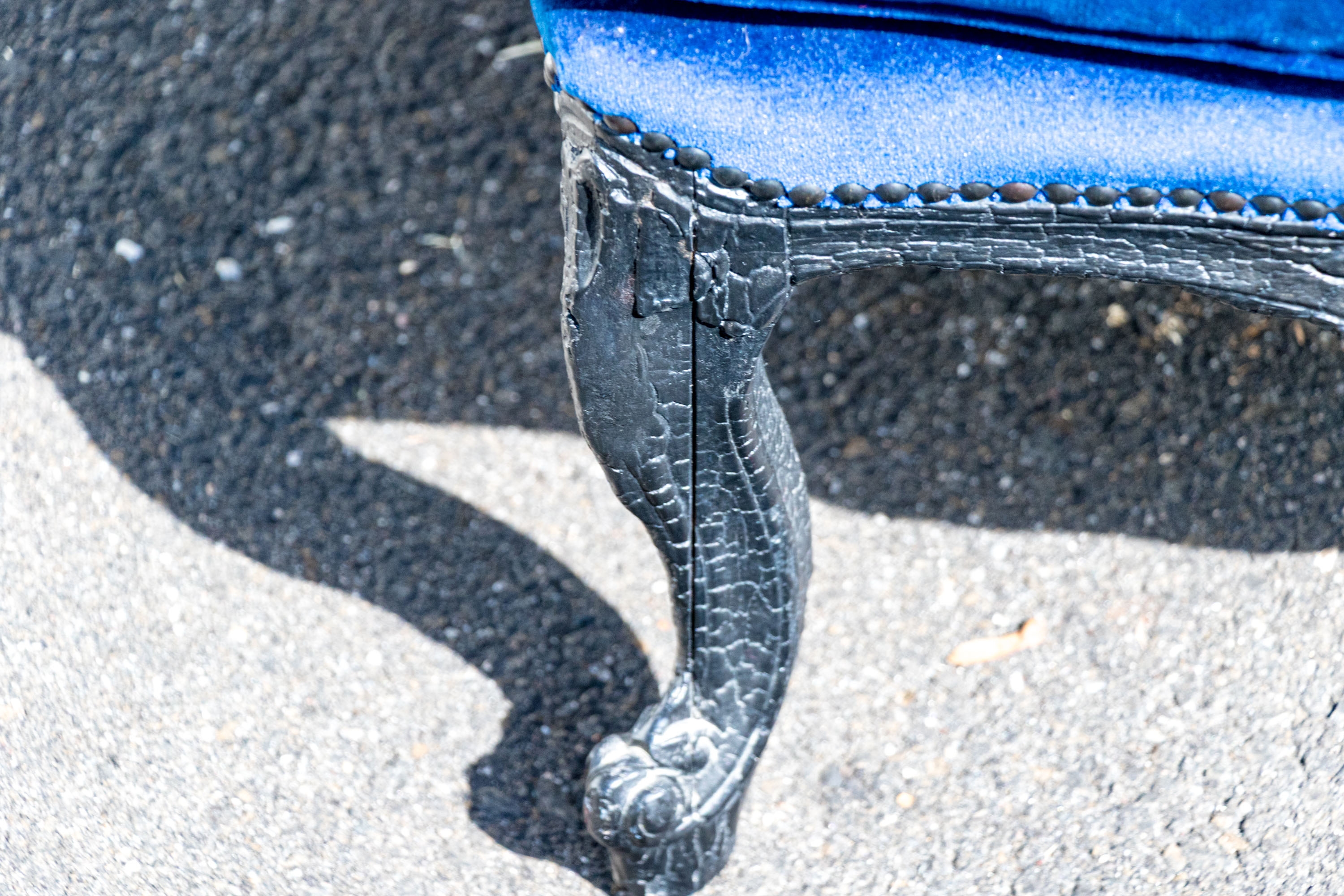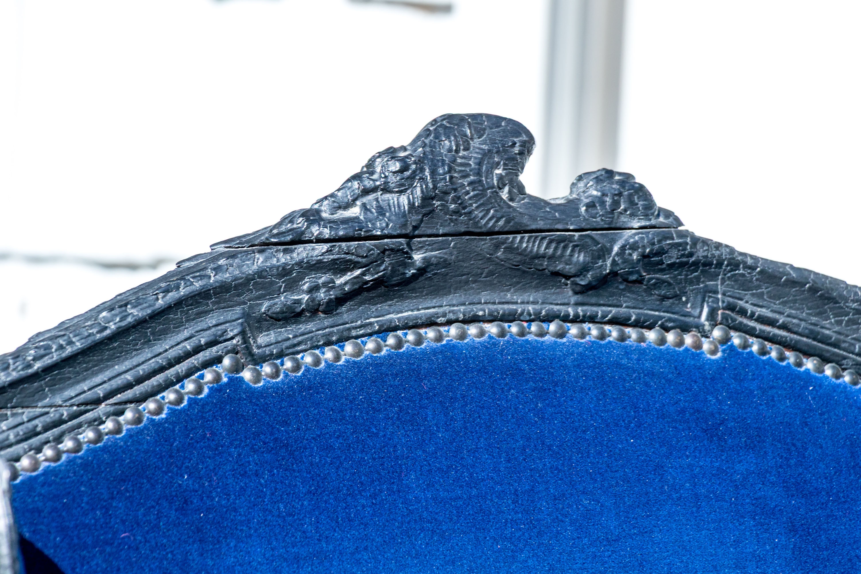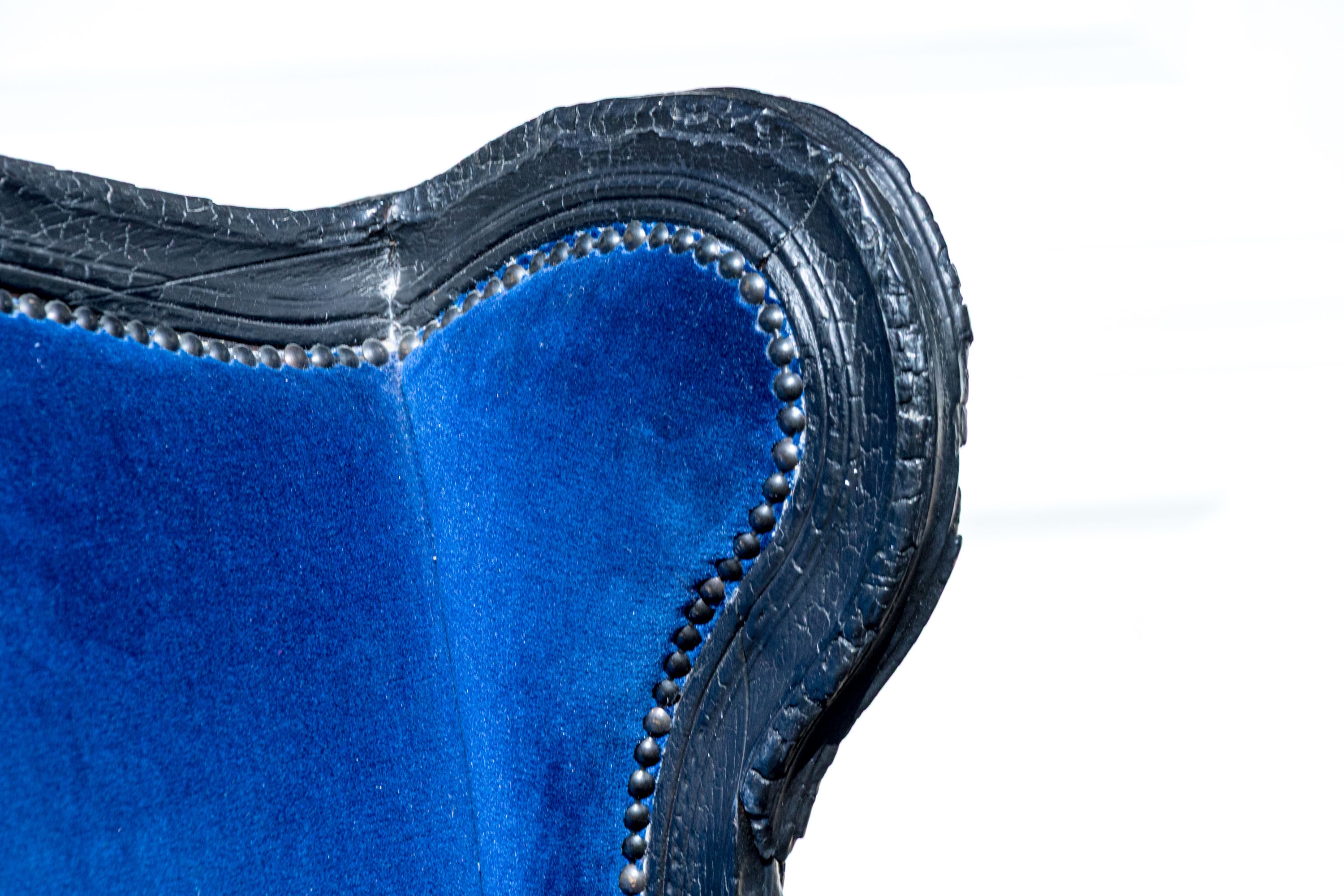 Standing on cabriole legs with exposed carved and ebonized finished frames with royal blue fabric upholstery to the seat, arm pads, wings on the interior and exterior and the reverse. The seats with loose upholstered seat cushions with piped trim.