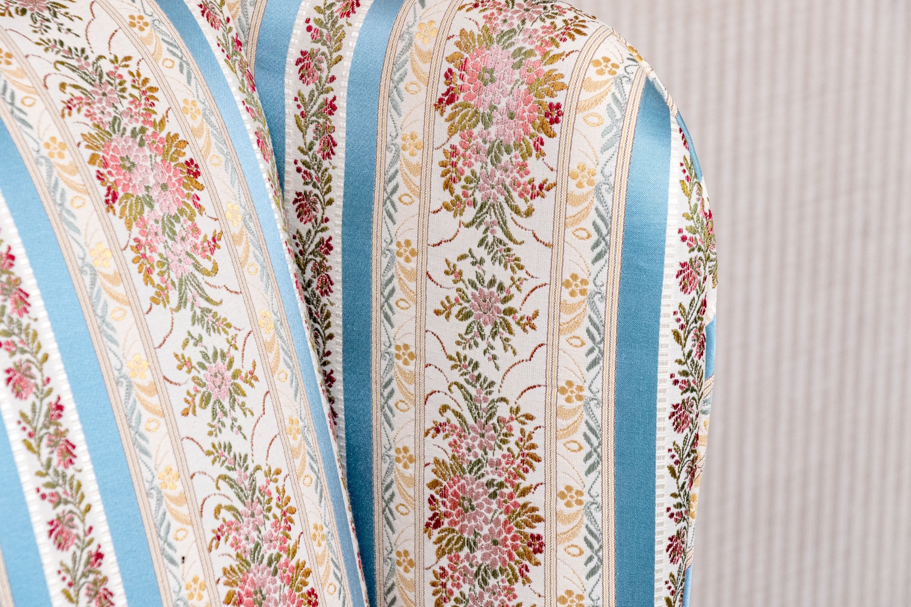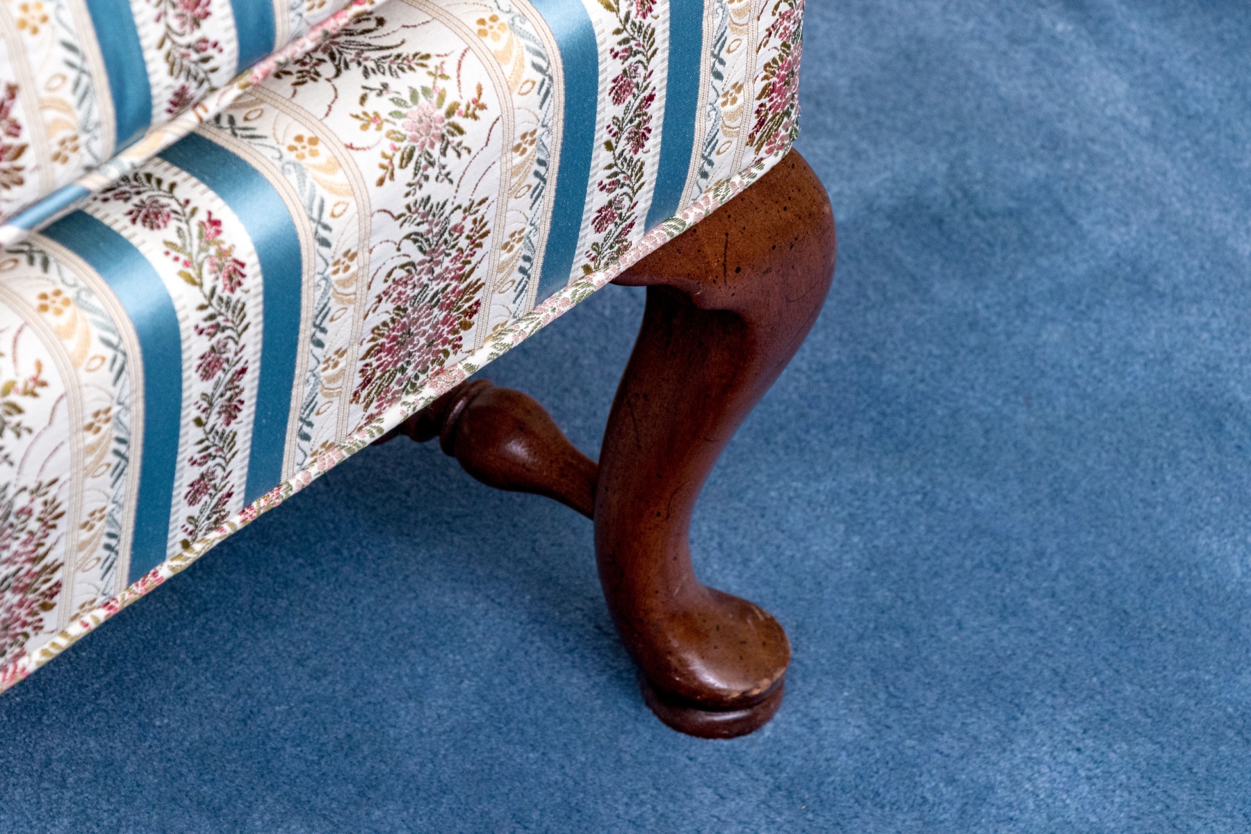 A wonderful pair of wingback armchairs with classic Queen Anne charm, custom upholstered with silk and brocade floral motifs. Each chair is raised on cabriole legs and slipper form feet with squared saber form back legs with turned stretcher supports. The chairs with loose upholstered seat cushions with piped trim.