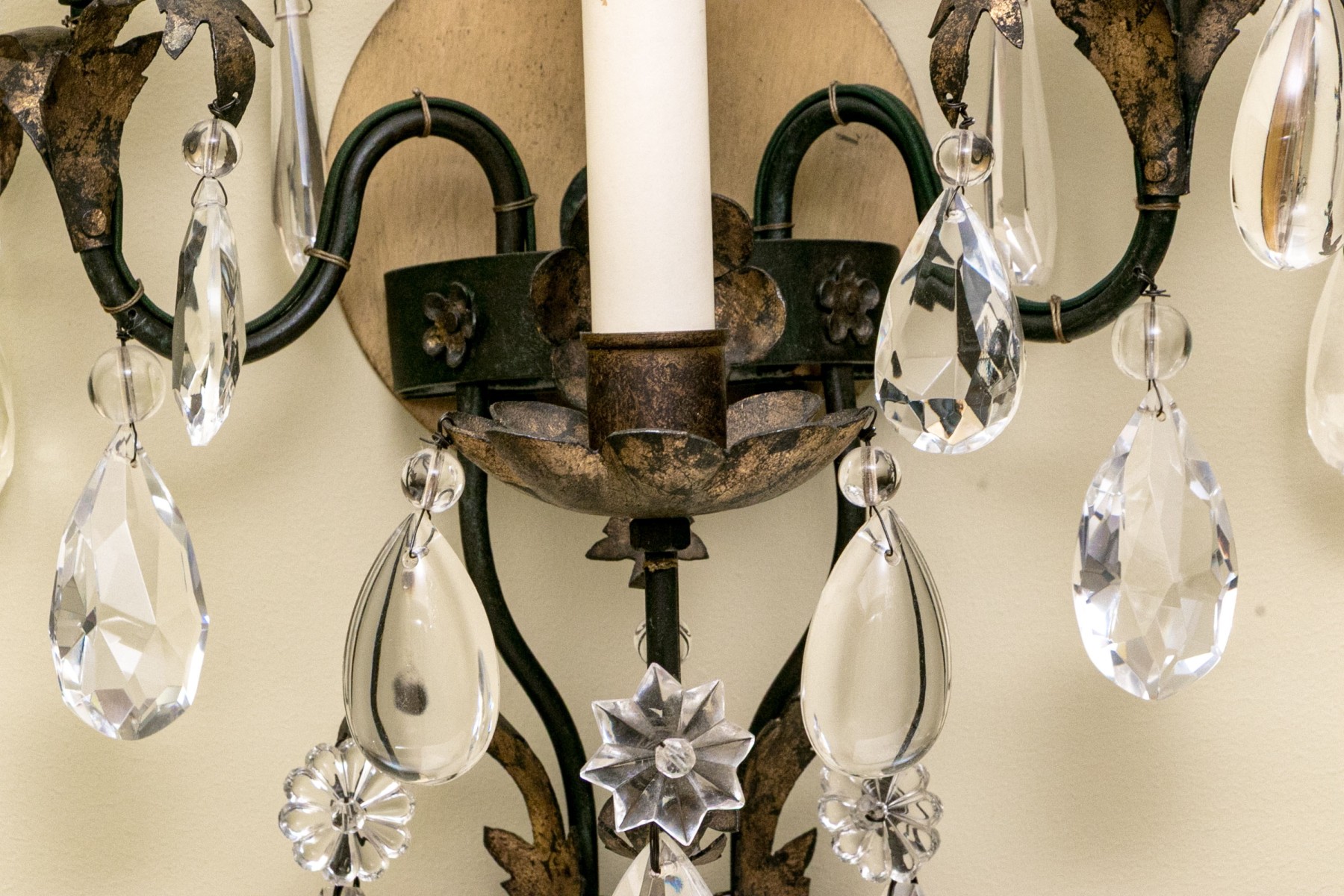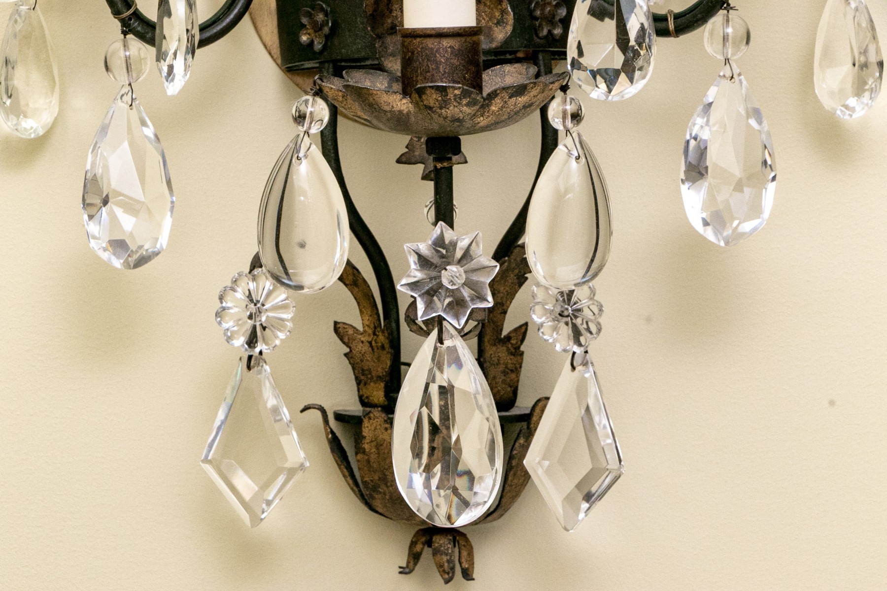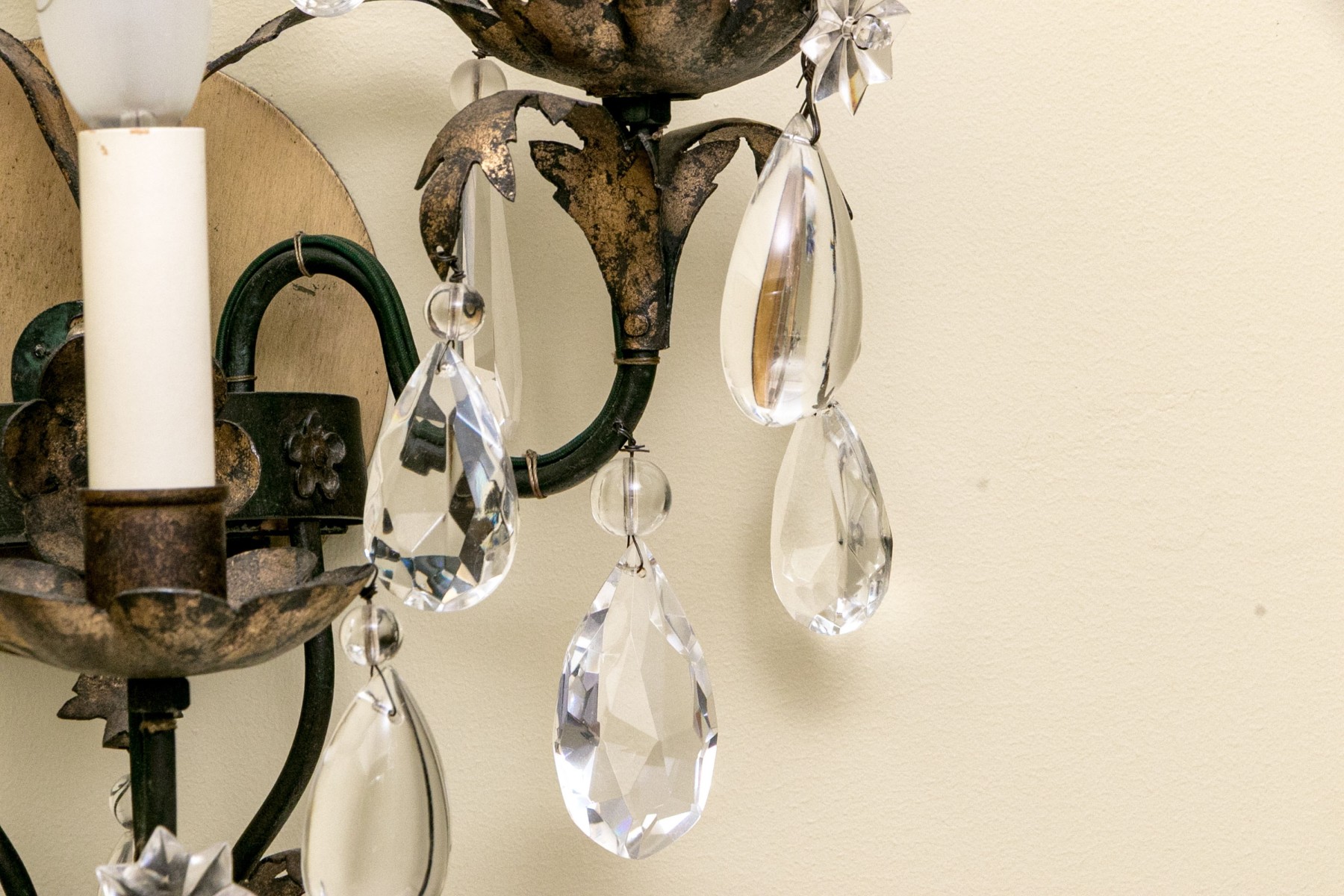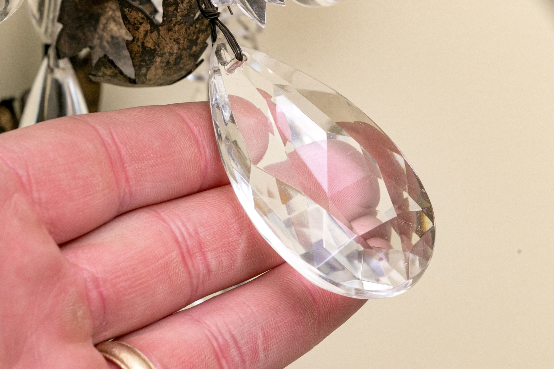 With three lights on floriform wax drip cups with cur crystal and teardrop crystal pendants.