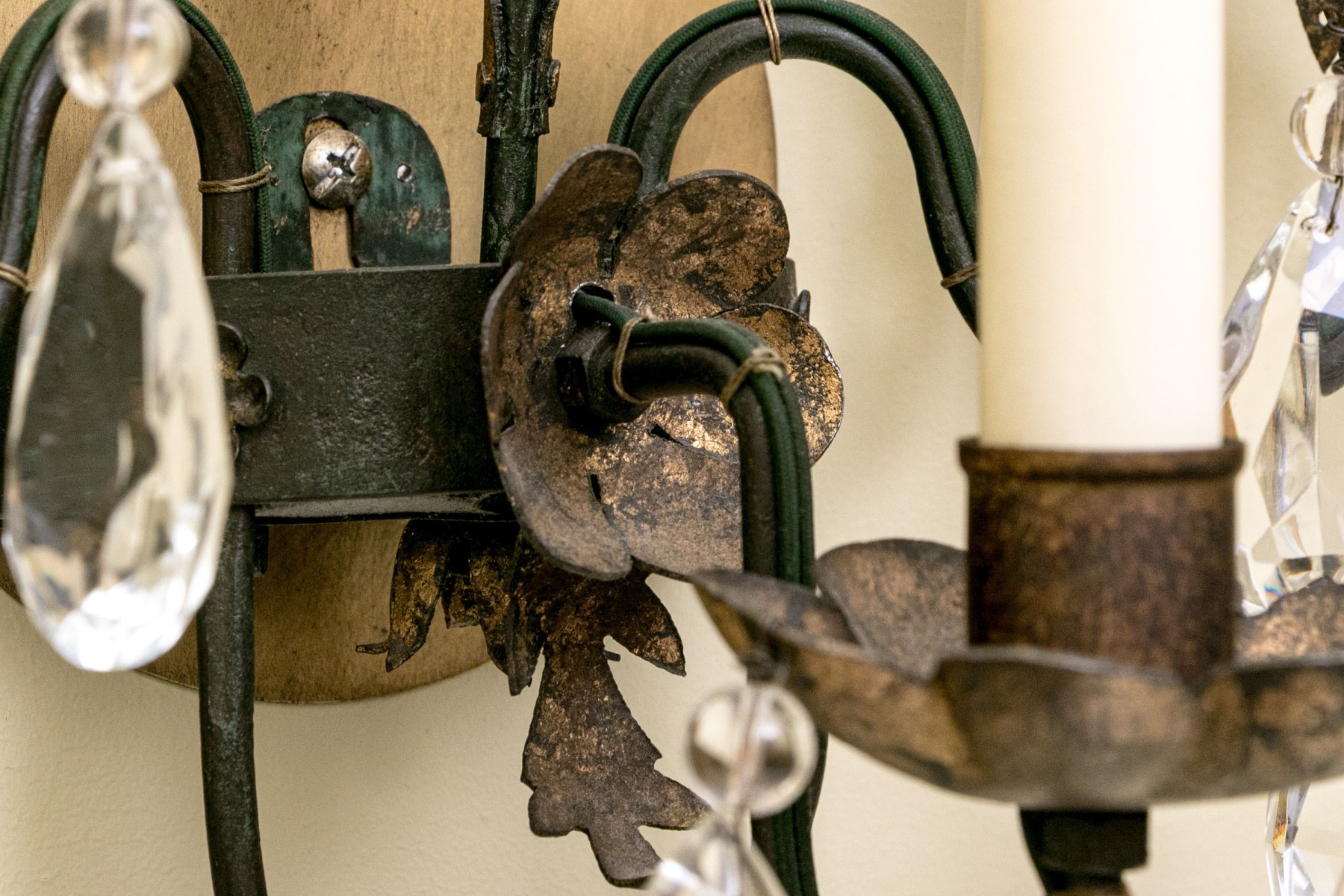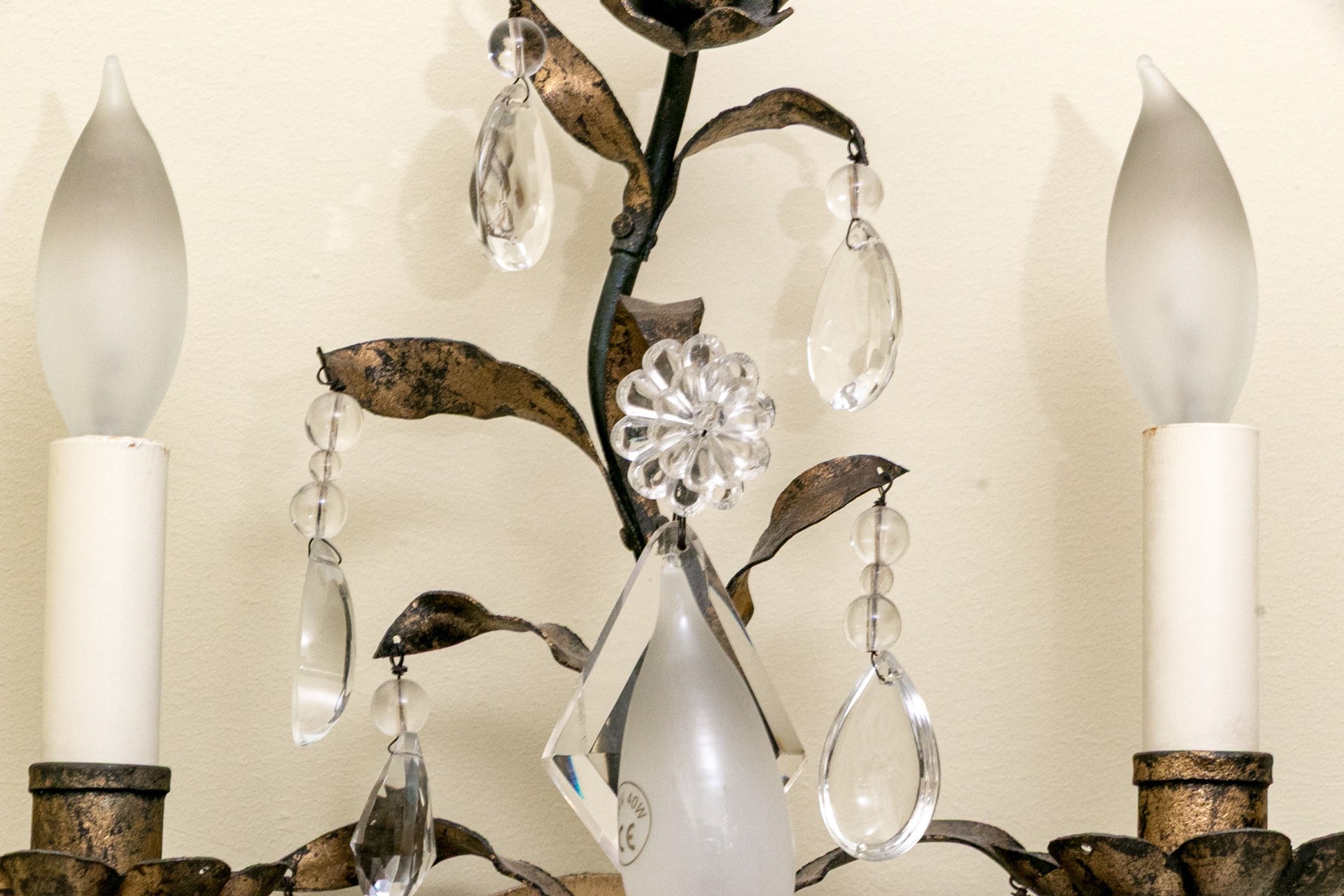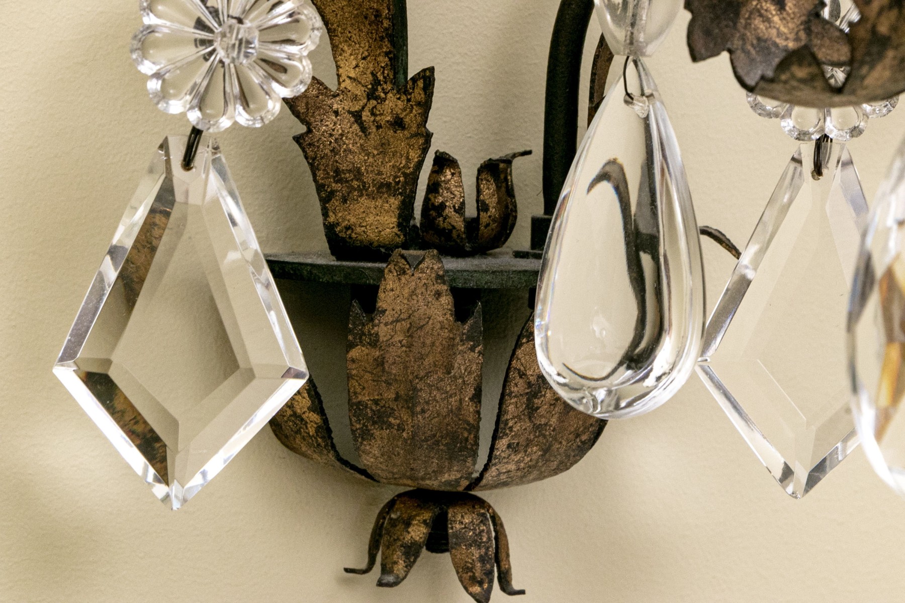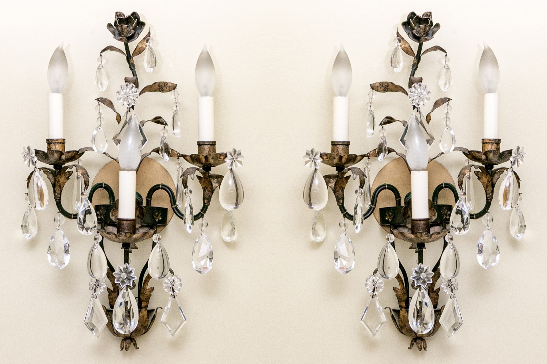 With three lights on floriform wax drip cups with cur crystal and teardrop crystal pendants.