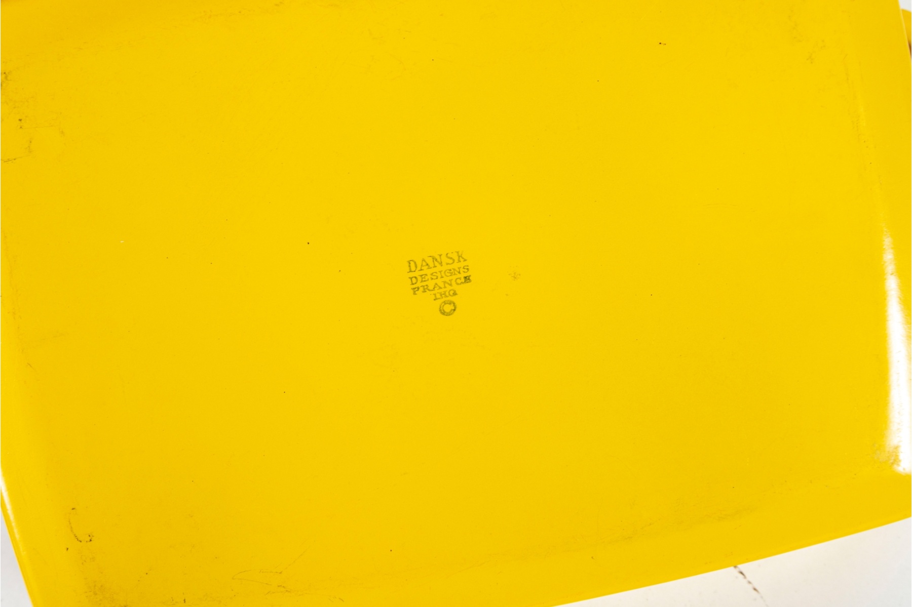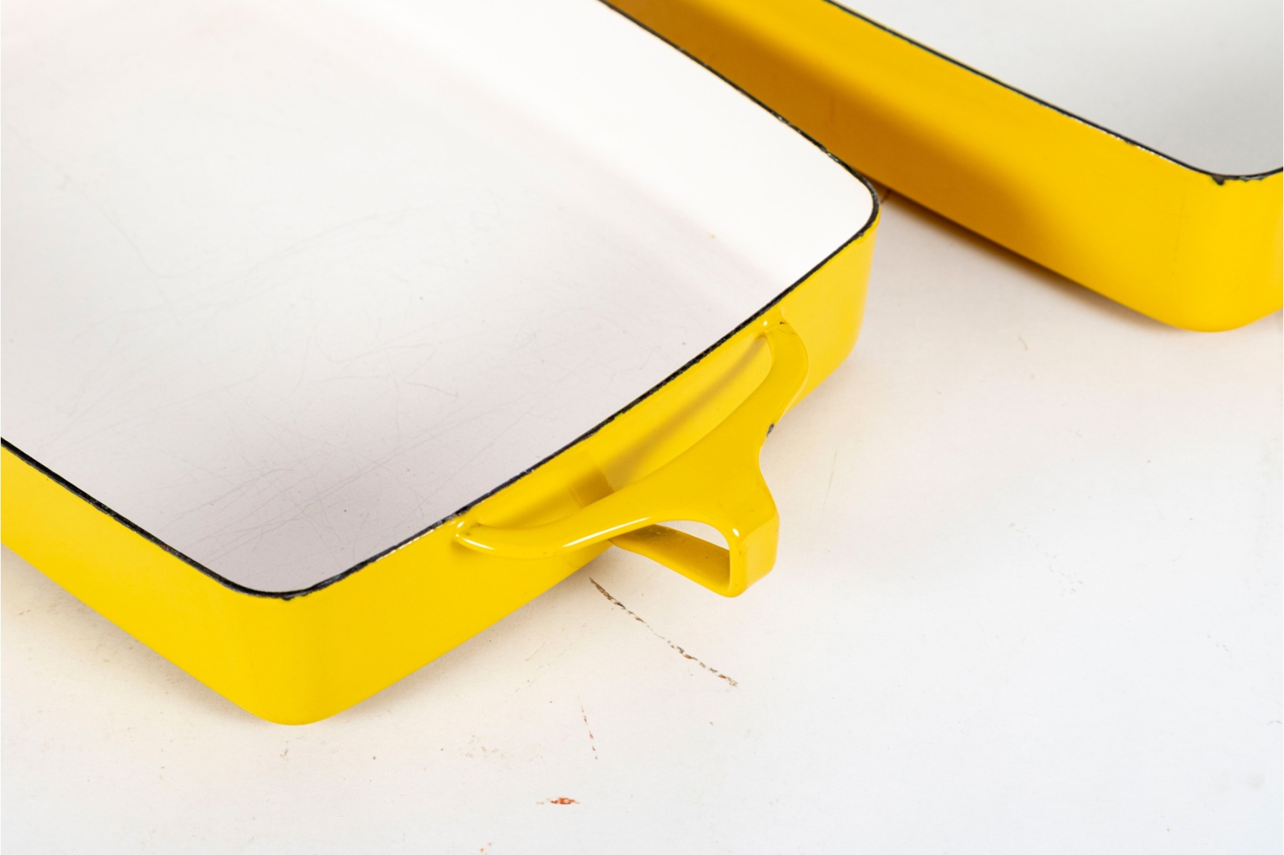 Pair of vintage Dansk France enamel-coated cast iron baking dishes in bright yellow, each with signature sculptural handles and white interiors. Classic Scandinavian modern design blending utility with bold color.