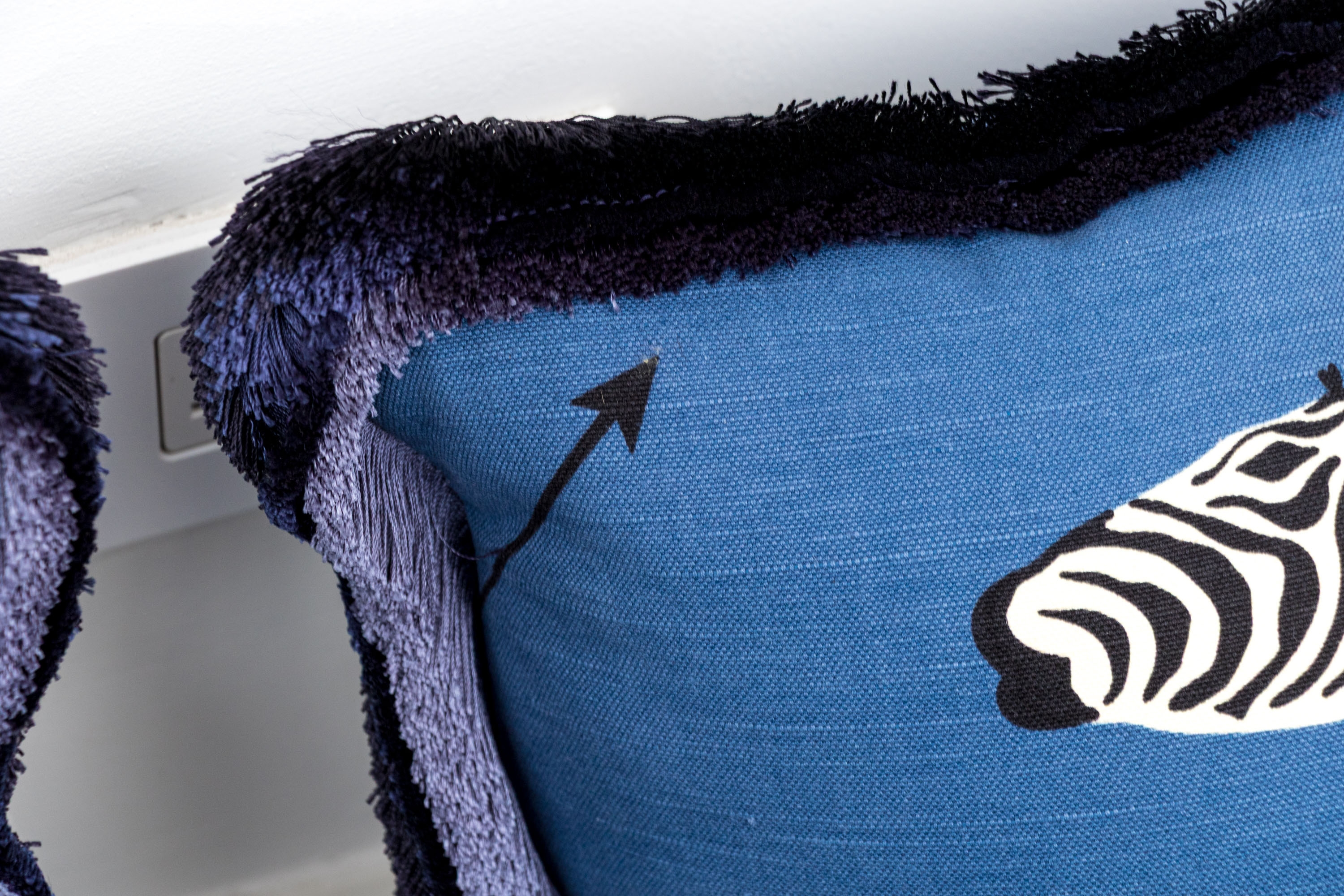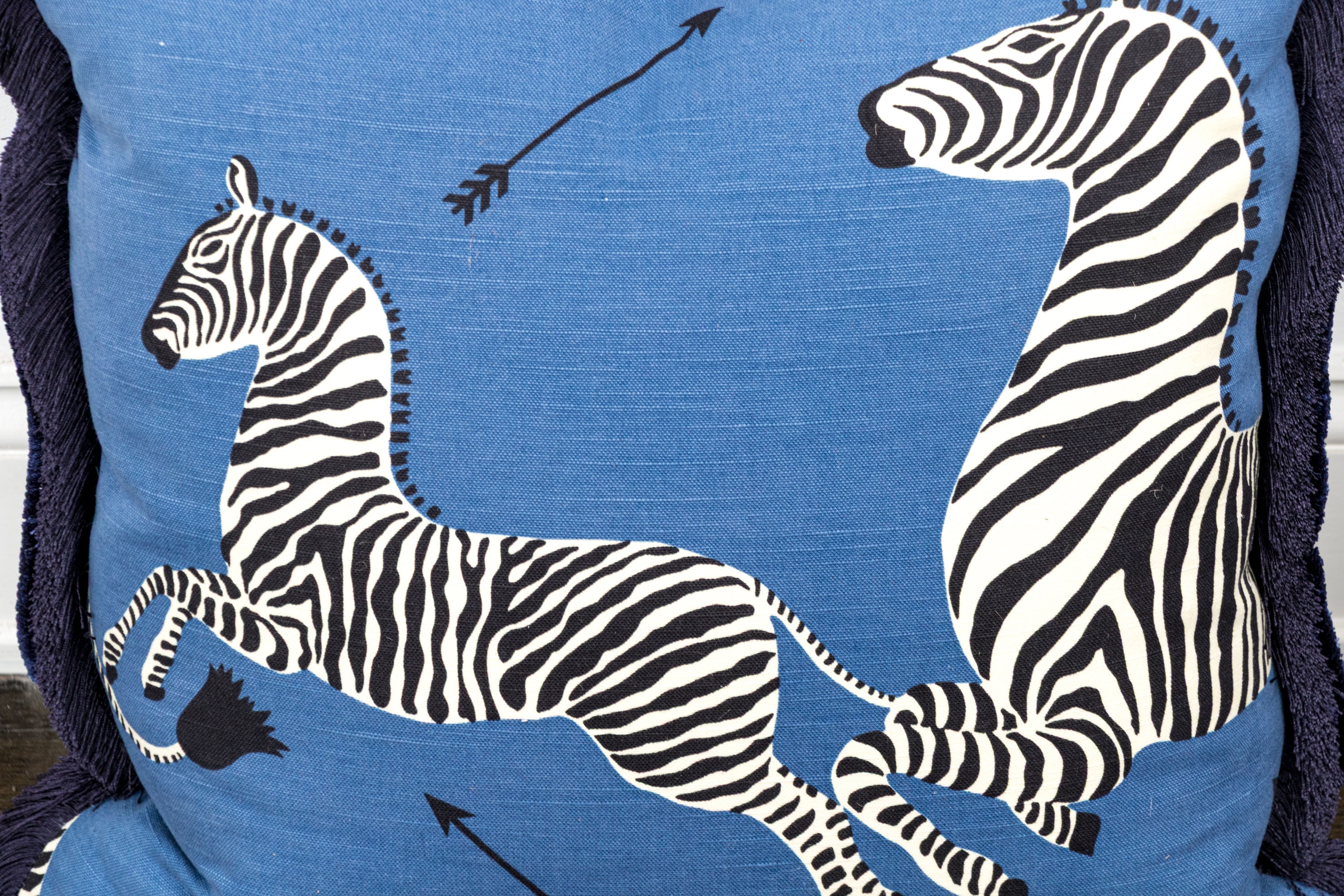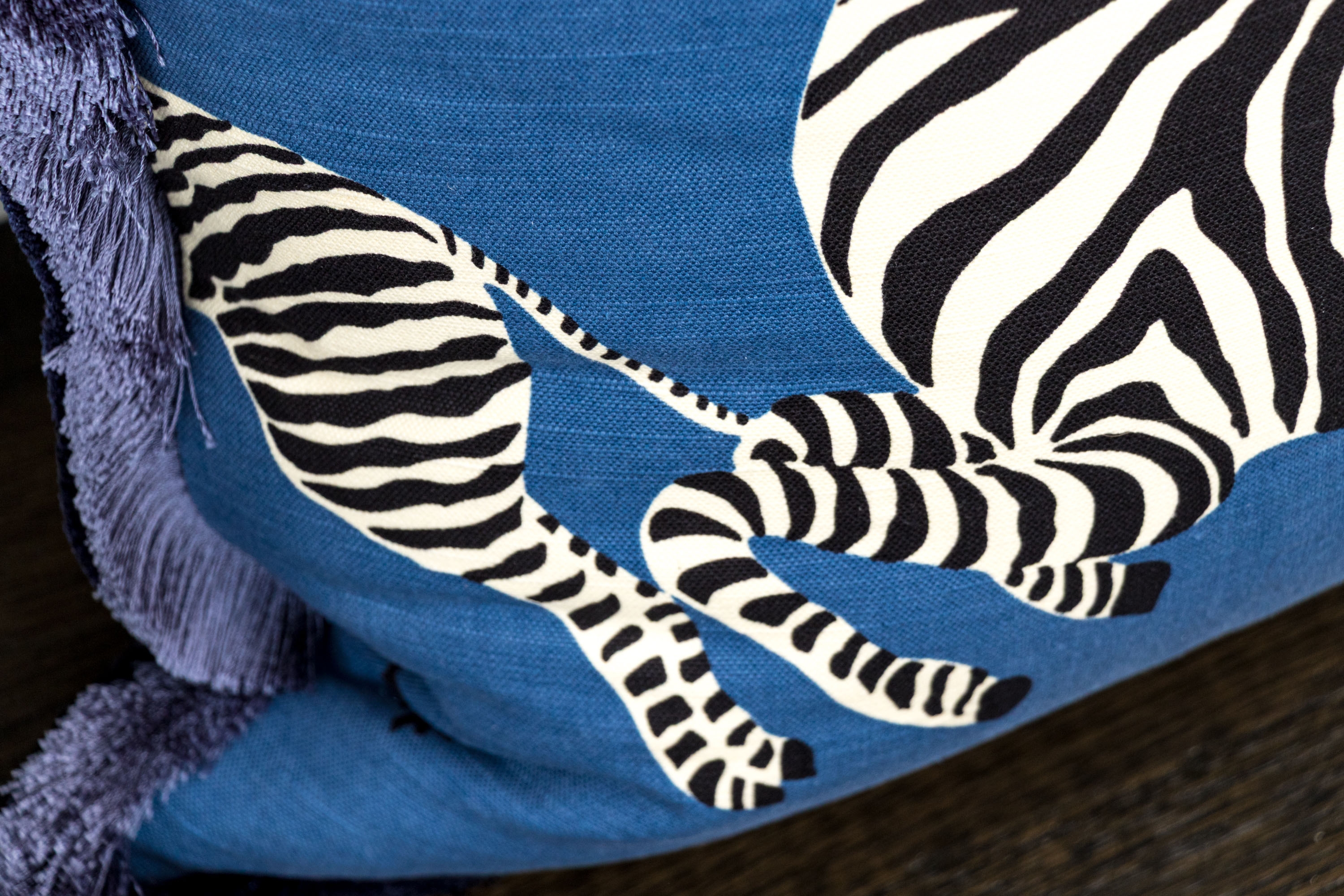 Blue ground upholstery with zebras running on both sides with black fringe around all four corners.