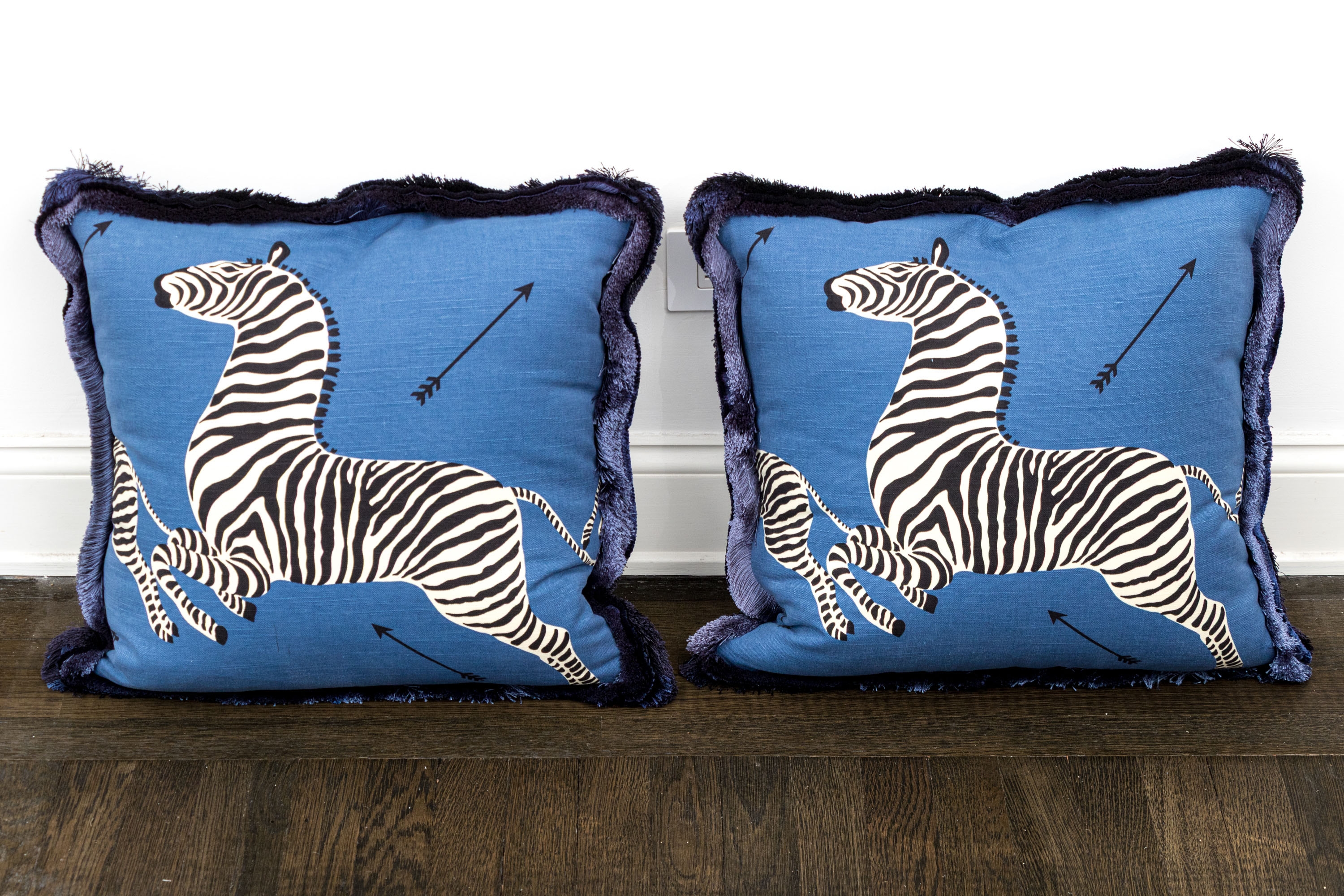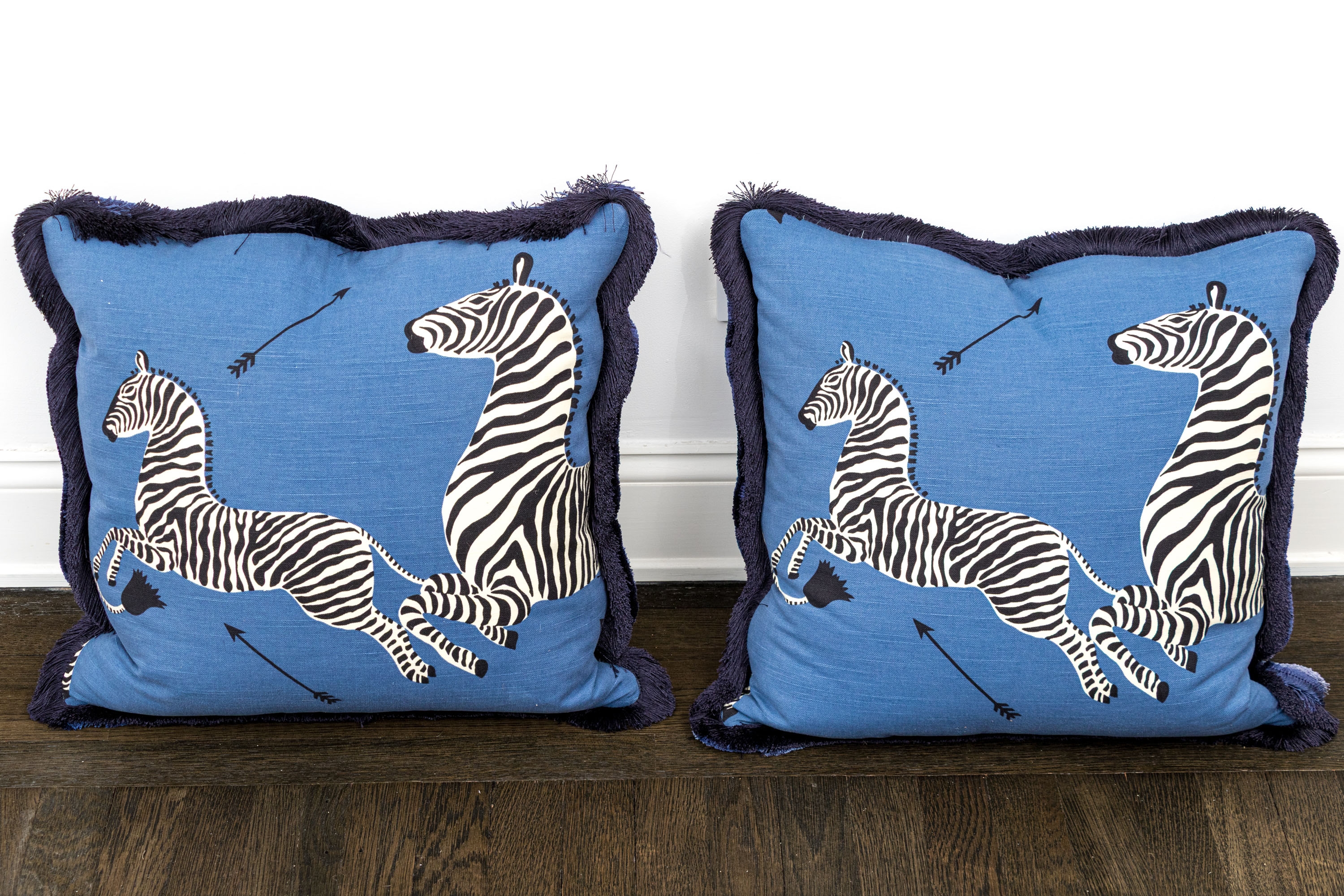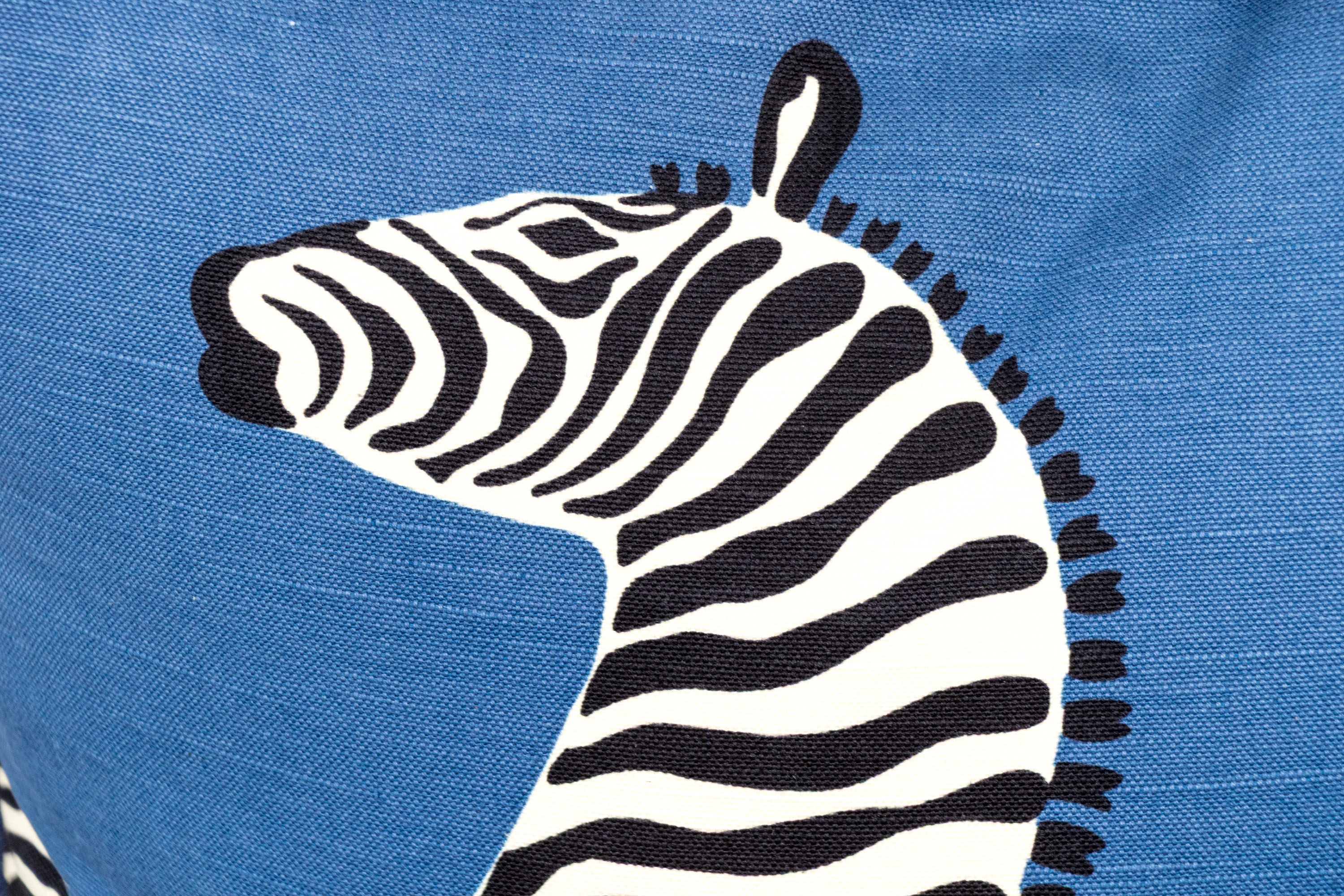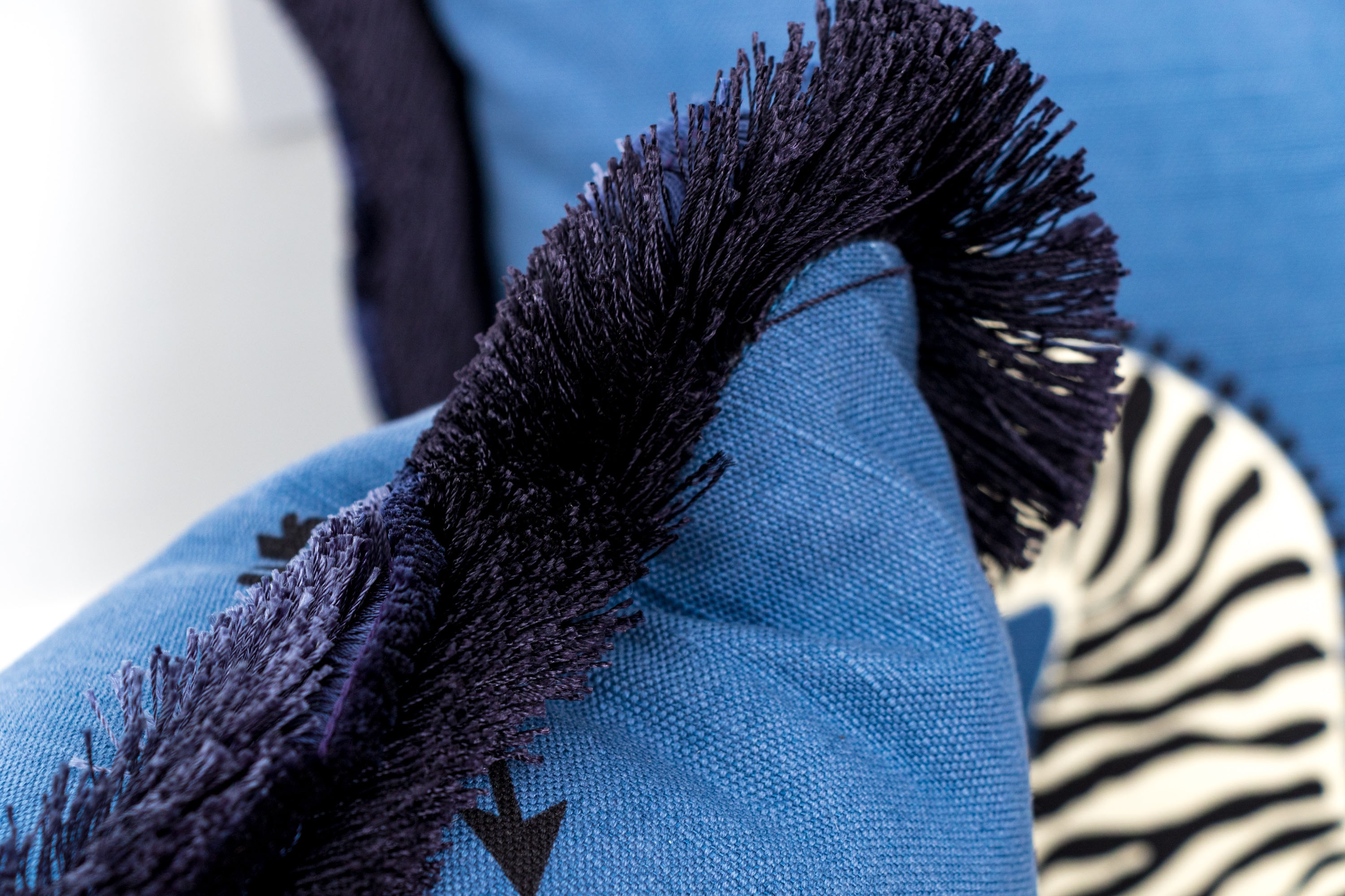 Blue ground upholstery with zebras running on both sides with black fringe around all four corners.