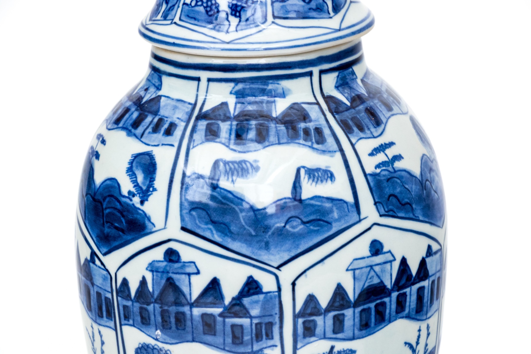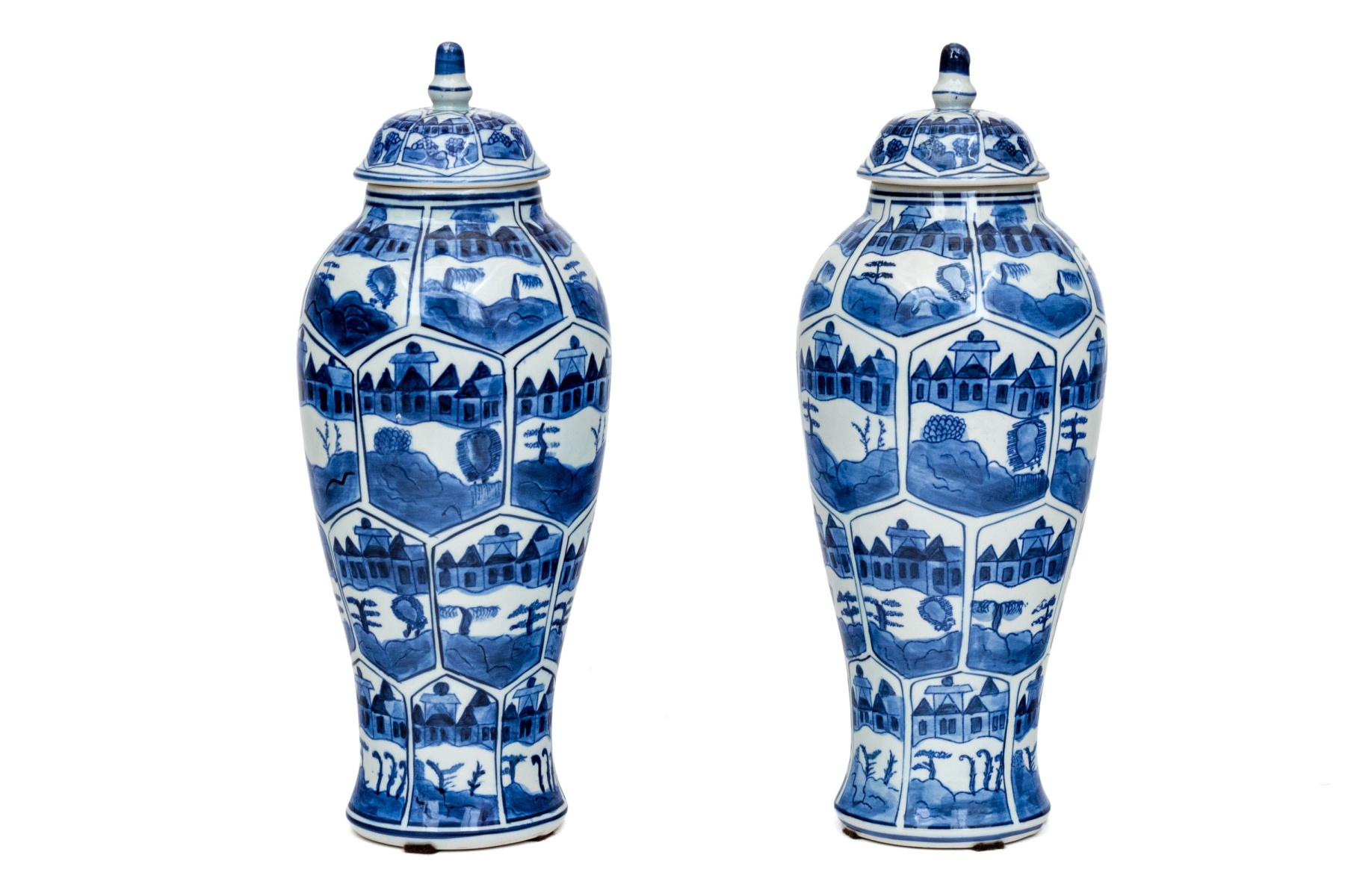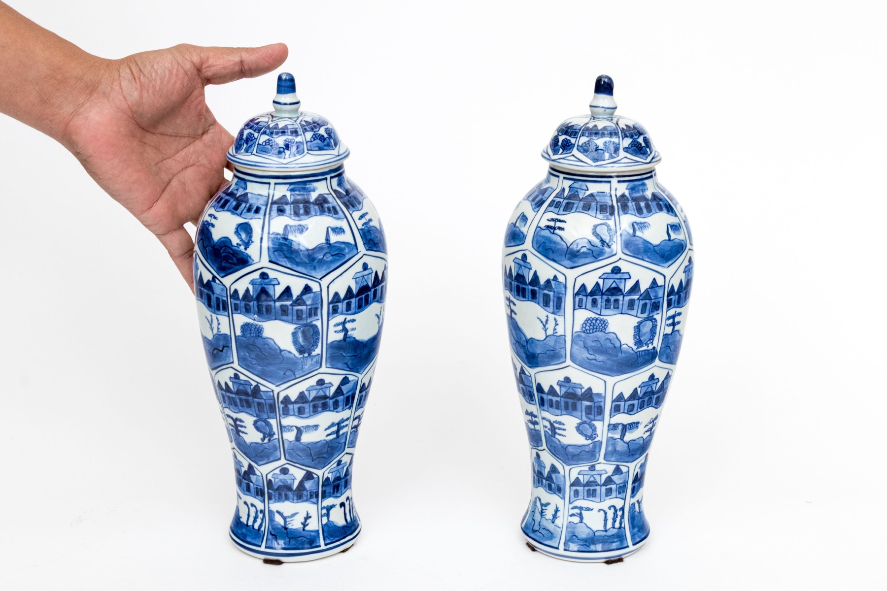 A fabulous pair of highly decorative blue and white porcelain jars showcasing tall finials on domed lids surmounted elongated baluster forms detailed with hexagonal scenes of buildings and natural landscapes creating a honeycomb grid.