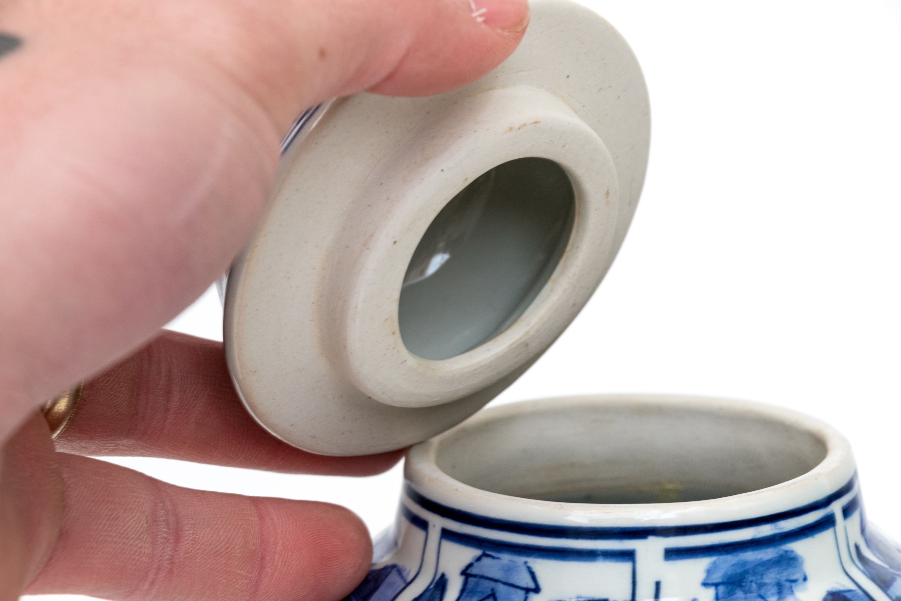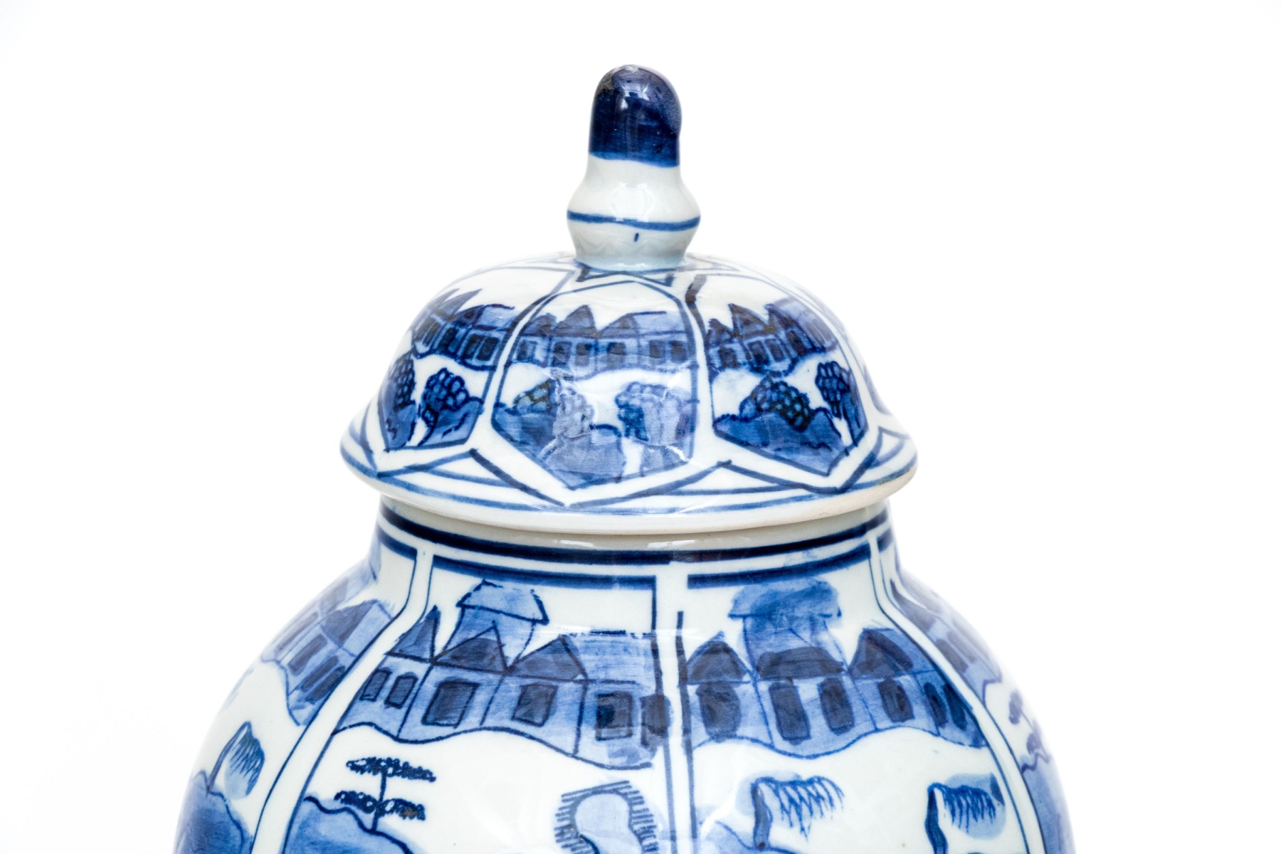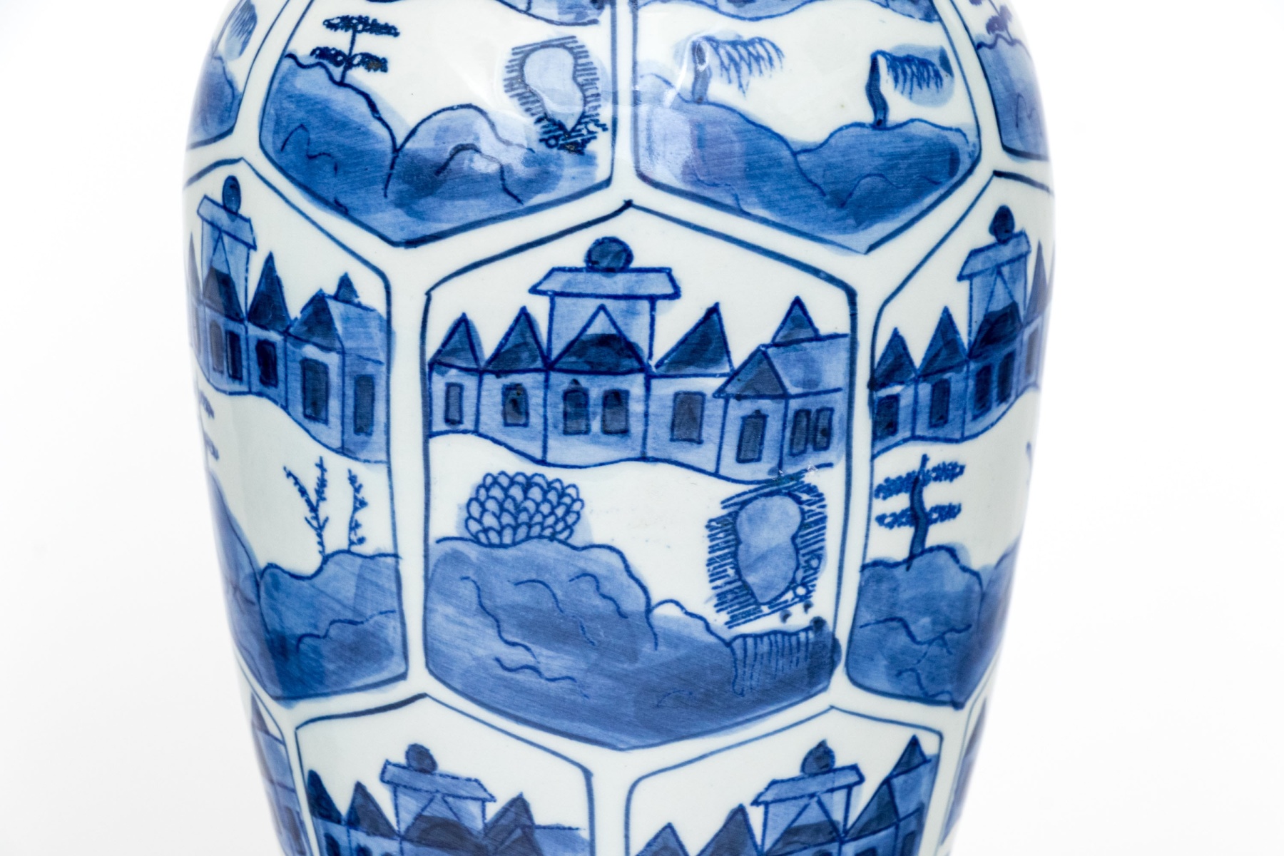 A fabulous pair of highly decorative blue and white porcelain jars showcasing tall finials on domed lids surmounted elongated baluster forms detailed with hexagonal scenes of buildings and natural landscapes creating a honeycomb grid.